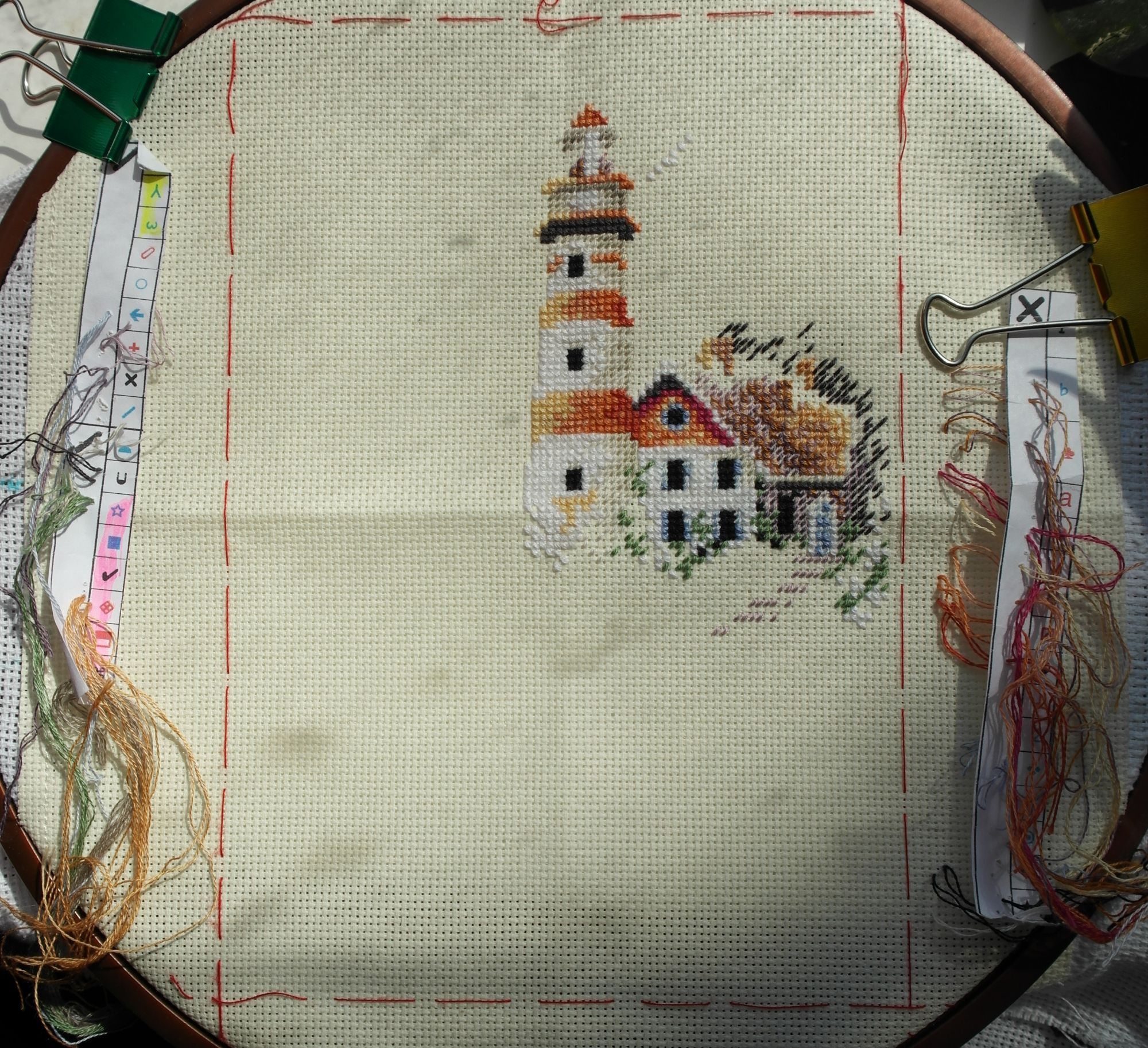 22 августа 2016 Привет всем Сегодня я хочу показать вам свой законченный процесс. Это мой первый мини-голд от Дима. Ну что сказать о впечатлениях, я в восторге, при чем в диком. Это любовь с первого взгляда, причем в весь Дим..теперь сижу и локти кусаю, чего я пару лет назад его не полюбила, когда цены были в 3 раза ниже.. Мне понравилось все: и нитки, и схема,это идеальная схема для меня, цветная-символьная. Единственно они конечно с органайзером перемудрили, их номера ниток вместо значков на органайзере это конечно ужас, но я нашла легкое решение, ниже покажу. Очень качественная проработка схемы, на вышивке с ладошку столько мелких, проработанных деталей. А эти бленды..мечта..я не понимаю, почему многие бленды не любят..мне нравятся именно как у Дима, когда сочетаются контрастные нитки - коричневая + фиолетовая.. Вышился набор очень легко, на одном дыхании за 29 дней. Вышивала я в апреле-мае в подарок племяннику на примету, собственно поэтому процесс и не показывала своевременно, есть у меня свои фишки при вышивке на примету. Желание сбылось, маяк подарен, и вот наконец я его и вам донесла. Я понимаю, что это 143 вышитый маяк на форуме, но для меня он единственный. А еще я влюбилась в большой Димовский маяк, обязательно его вышью со временем. Вот собственно и процесс: Dimensions 06883 Маяк на рассвете (Полуденный маяк, Beacon at Daybreak), 13х18, аида 18, счетный крест и детали: А вот так я организовала свой процесс. Я наклеила на органайзер значки, сразу все и крестики и полукрестики и бек. и пользовалась усовершенствованным методом Марсанны, сбоку вышивки были 2 полоски бумаги со значками справа крест, слева полукрест. Это дало возможность в ключ не смотреть. Бленды видны, т. к. их символ в ключе шире остальных, крест в этой работе только в 2 нити. Полукресты правда в 1,2 и 3, но и это легко решаемо. Те, что в одну нить, я выделила желтым маркером, а в 3 - розовым, в 2 остались не закрашенными. И это значительно облегчило процесс вышивки, и вправду говорят, что все гениальное просто) Всем пока, побегу-ка я спать) Nadinka-Blondinka, magik, Фро-J и 3 других сказали спасибо Поделиться сообщением Ссылка на сообщение
