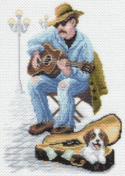 Волк был пиксельным, не хватало четкости, к тому же в наборе была канва 11 каунта, цвета сильно отличались от первью, на носу и в глазах у моего волка были бордовые пятна, так что выкинула. Гитарист тоже не отличался четкостью, детали сюжета были размыты, цвета не плавно переходили из одного в другой, а смотрелись пятнами, хотя вышивала по ключу, крестики на рыхлой канве были кривые и перетянутые, тоже выкинула.. В обоих вышивках мне отчаянно не хватало бэка.