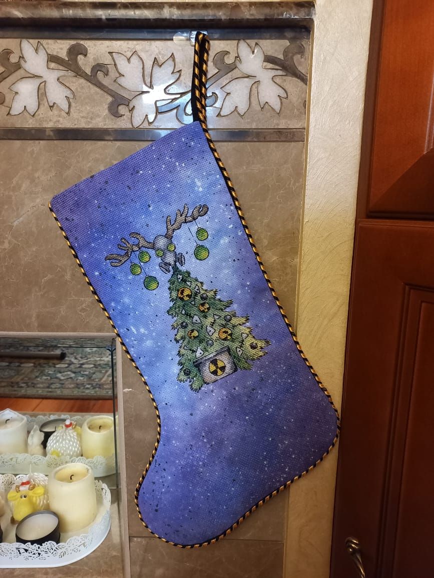 Подарок мужу атомщику на НГ. Канва окрашена специально для этой работы. Должна изображать радиоактивное свечение взорвавшегося реактора и разлетающиеся из него пепел и мусор.