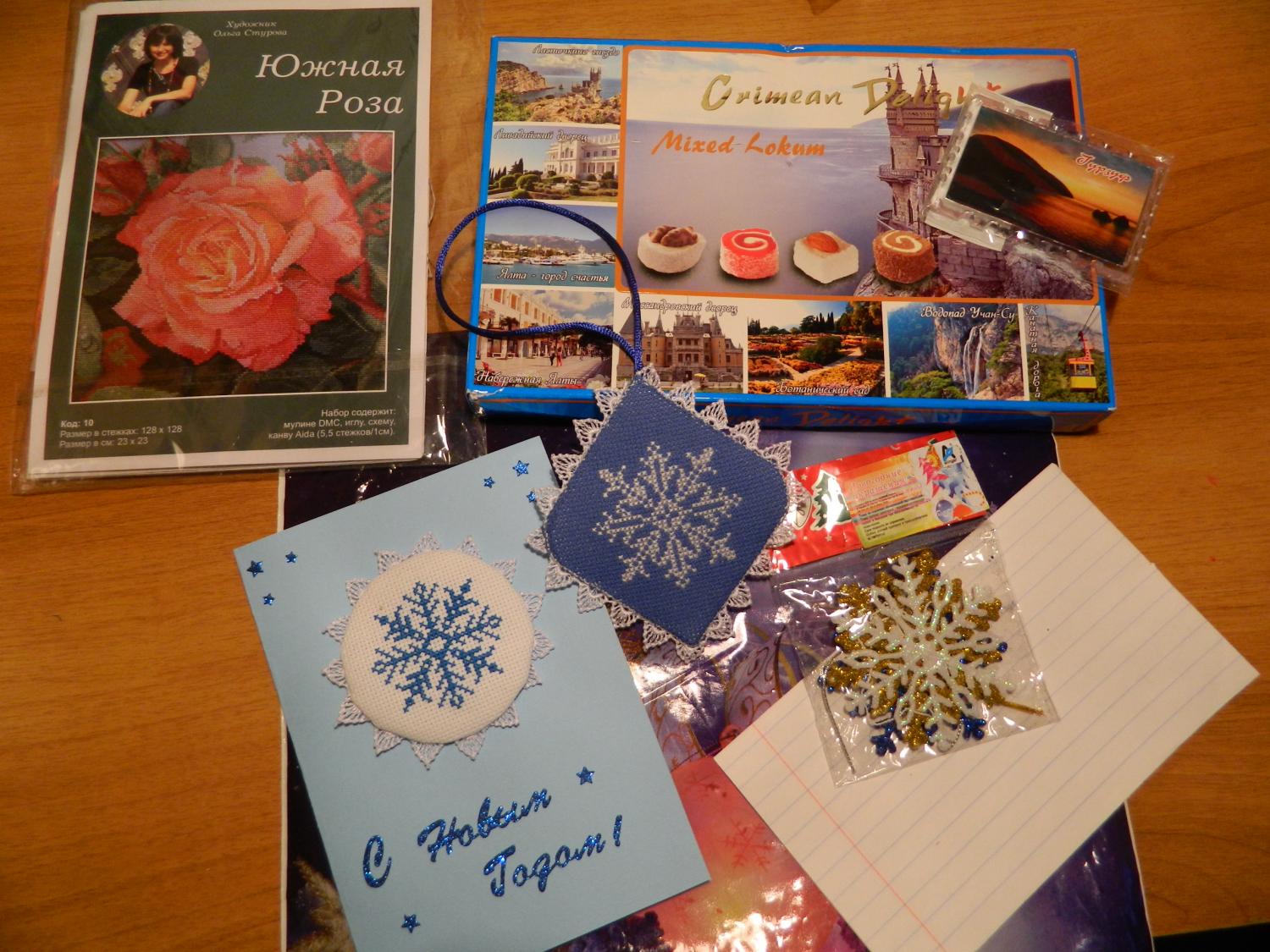 20 декабря 2014 Ну и теперь я отчитываюсь. Преодалев штурмующее море,сортировки и дожди,ко мне прилетел привет из солнечного Крыма от ГалиныС. Сказать,что удивлена-нет.Чуйка подсказала мне еще в момент раздачи адресов,что Галочкины поделочки будут жить именно у меня)А вот ,собственно,и они: Просто волшебная открыточка: Чудненький, преаккуратнейший пинкип: Душевные пожелания,загадочный крымский лукум(заныкан подале,откроем в новогоднюю ночь),"Крымская роза"... Галочка,сказать,что я счастлива-ничего не сказать.Я просто безумно люблю тебя,солнце наше)Спасибо тебе за душевные Дед Морозовские подарочки. Они очень греют душу и обязательно займут почетное место на моей елочке. А кто следующий? Mama_Egora, musya, Snezhka и 15 других сказали спасибо Поделиться сообщением Ссылка на сообщение