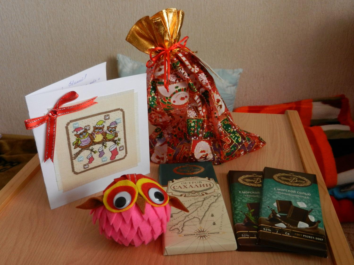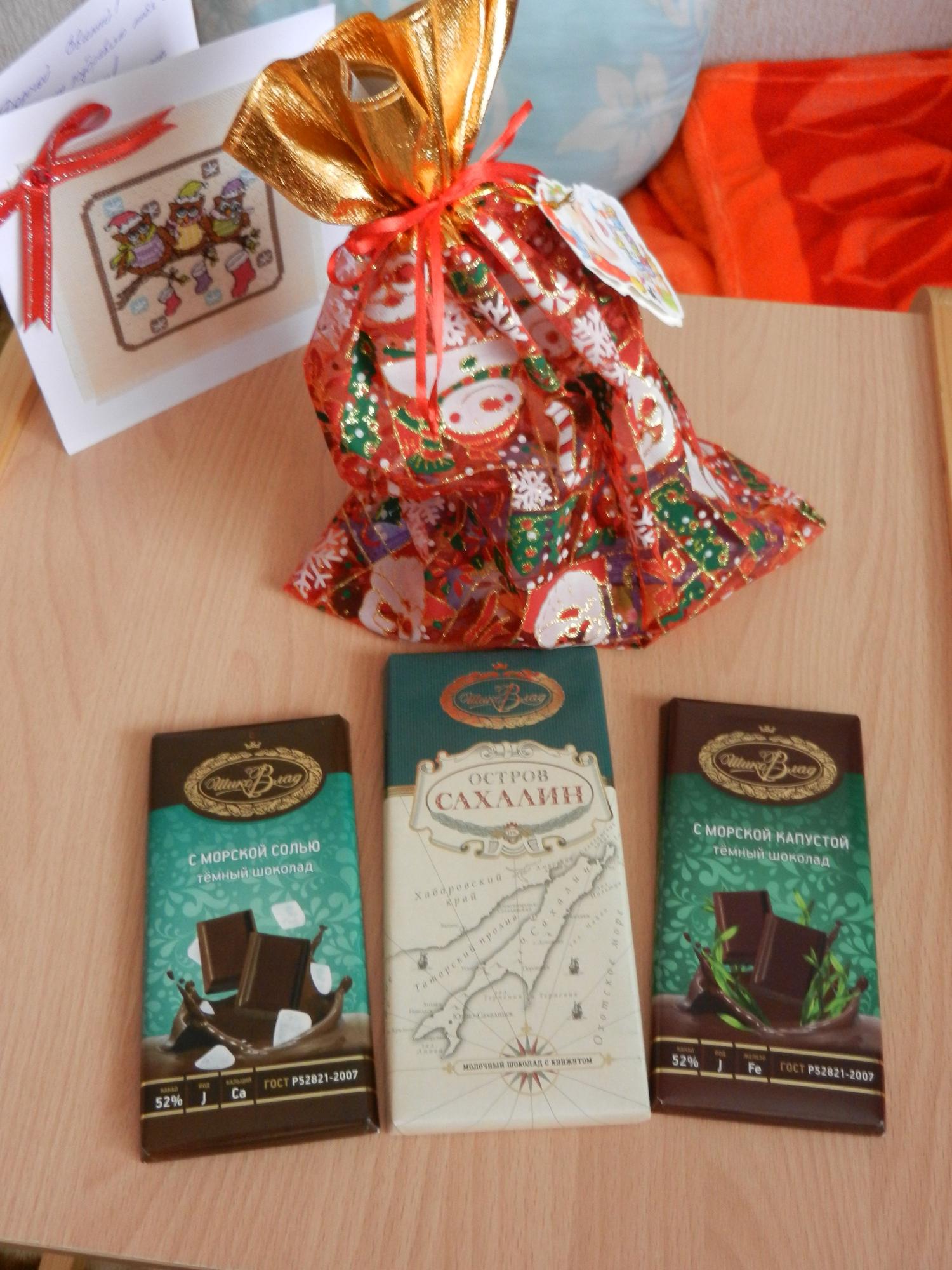 20 декабря 2014 Итак... В заветной коробочке оказался совино-дальневосточный сюрприз! Наконец-то и я попробую небезызвестный нашему форуму эксклюзивный чудный шоколад с морской солью и с морской капустой! Ням-ням Все сокровище в целом: Абалденная, просто ювелирная открыточка с милыми совятами и теплыми пожеланиями Еще один милейший совеныш уже поселился на елке. Такой смешной и радостный Мелкой не отдам, а то у нас сейчас стадия "отрывательно-отколупывательная", а это чревато... Ну и, конечно, сладости - вышеупомянутые эксклюзивные шоколадки, шоколад Остров Сахалин (знаково для нашей семьи - расскажу ниже) и мешочек с конфетами. Собственно, совеныш тоже в мешочке прятался - наверное, конфеты по дороге ел Леночка, спасибо тебе за радость, которая примчалась в наш дом через всю страну, чтоб подарить праздничное настроение и приблизить Новый Год! И от мужа отдельная благодарность! А теперь про Сахалин. В прошлом году, в декабре месяце, за несколько дней до моего дня рождения (!), мужа по работе услали в первую в его жизни (!) командировку, естественно самолетом (тоже впервые!). Собственно, как раз на Сахалин. А до этого мы не расставались дольше, чем на сутки в связи с моей работой. Так что командировка по многим параметрам памятная. Поэтому шоколадка Остров Сахалин не только вкусная, но и знаковая! elis, Marina_19, musya и 17 других сказали спасибо Поделиться сообщением Ссылка на сообщение