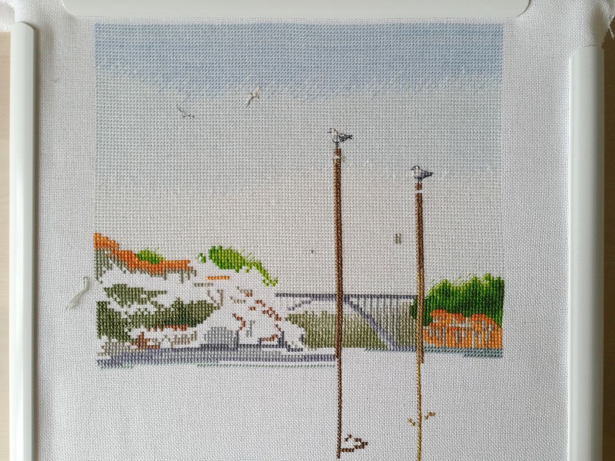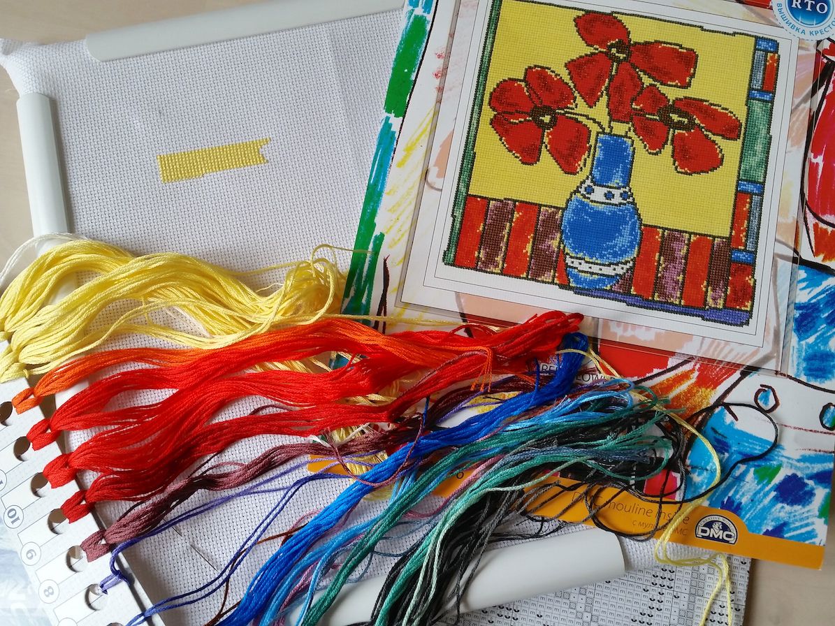 11 сентября 2016 Всем привет! Ну что ж, сегодня воскресенье, а значит пора и о вышивальных успехах рассказать. Если честно, то их совсем немного, каждый процесс, что попадал на этой неделе ко мне в руки, немного не готов к отчету. Поэтому сегодня будут небольшие продвижения, болтовня и новые, едва начатые процессы! 1. Река Дору Планировала на неделе закончить береговую линию слева от моста и старательно шла к этой цели... до ДР. А потом события и эмоции поломали мой решительный настрой на планомерную работу, поэтому что есть, то есть... 2. Бисерные березки от Магии канвы Они у меня как-то не очень шли. Раздражало даже не однообразие, не кривизна отдельных бисеринок и даже не скорость, а то что кайфа не было... Я и со станка снимала, и так примерялась, и эдак... И вот приехала Оля, которая, надеюсь, скоро похвастается своим шикарным львом уже в оформлении (ой, уже показала, пока я отчет сочиняла!) , и "в лицах" объяснила мне, как же она его шила... На следующий же день я решительно сняла березки со станка и попыталась еще раз - и о чудо! я наконец нашла удобную позу и технику и дело пошло!!!! Возможно бисеринки ложатся и не так ровно, но их кривизна какая-то равномерная и так не бесит. А главное я начала получать удовольствие от процесса, от него снова не хочется отрываться, да и уставать я стала значительно меньше. Ура форуму и встречам воочию! Итак, небольшое продвижение: 3. Новый процесс номер раз: РТО, М476, Красные цветы Утром в ДР мне очень сильно захотелось сделать что-нибудь совсем неправильное. И этим неправильным стал внеплановый новый процесс. Единственное, я все же не стала бросаться в омут с головой и выбрала относительно небольшой наборчик с цветотерапийным эффектом, рассчитывая сделать его новым дорожным процессом. Не знаю будет ли он дорожным в дальнейшем, потому как на пяльцах вышивать не хочу, а маленьких снапов нет, но один раз в автобусе он уже прокатился Результат перед вами (на отдельную фотографию опять же не навышивалось): 4. Ну и новый процесс номер два: Goblenset, 1004, В горах Вы, я уверена, и не сомневались, что я его начну. И я в целом, тоже. Вопрос был только в том - когда, ибо мне нужно было созреть, перестать его бояться и отважится на новую очень долгокраснеющую гаечку при том, что остальное дошить тоже хочется. Это произошло вчера ночью и как-то само собой после очередного отчета МарСанны и ее гобелена. Не задумываясь ни о чем (в том числе и о снапах!), я взяла в руки "тряпочку", отрезала нитку и стала шить... И как это ни странно, начав его, я успокоилась, мысли пришли в порядок и впервые после всего круговорота эмоций я смогла вернуться к текущим процессам и первоначальным планам. А пока плюс одна красная гаечка: Очень нравятся нитки - такие мягкие, будто бы немного объемные (хотя сдается мне, что это лишь иллюзия), сами собой ложатся как надо. Нравится, что не надо "идти во второй проход" как в крестике, но при этом выглядит ровнее полукреста. Пока идет не очень быстро, потому как приходится еще думать, куда вводить иглу, особенно в местах стыковки цветов и смене ряда. Но в небе мешанины мало, так что шью пока на руках, в один прокол и не особо напрягая извилины мыслями о будущем. (думаю, это фото в процесс добавлять совсем необязательно) Женя утром сказал только две фразы: "А, наконец-то, начала!" и "Ну и мелкота!" Ну а для меня потом оказалось очень сложно перейти на 