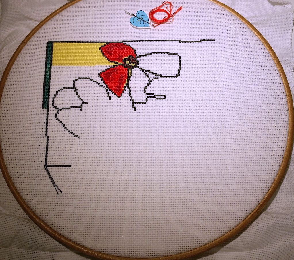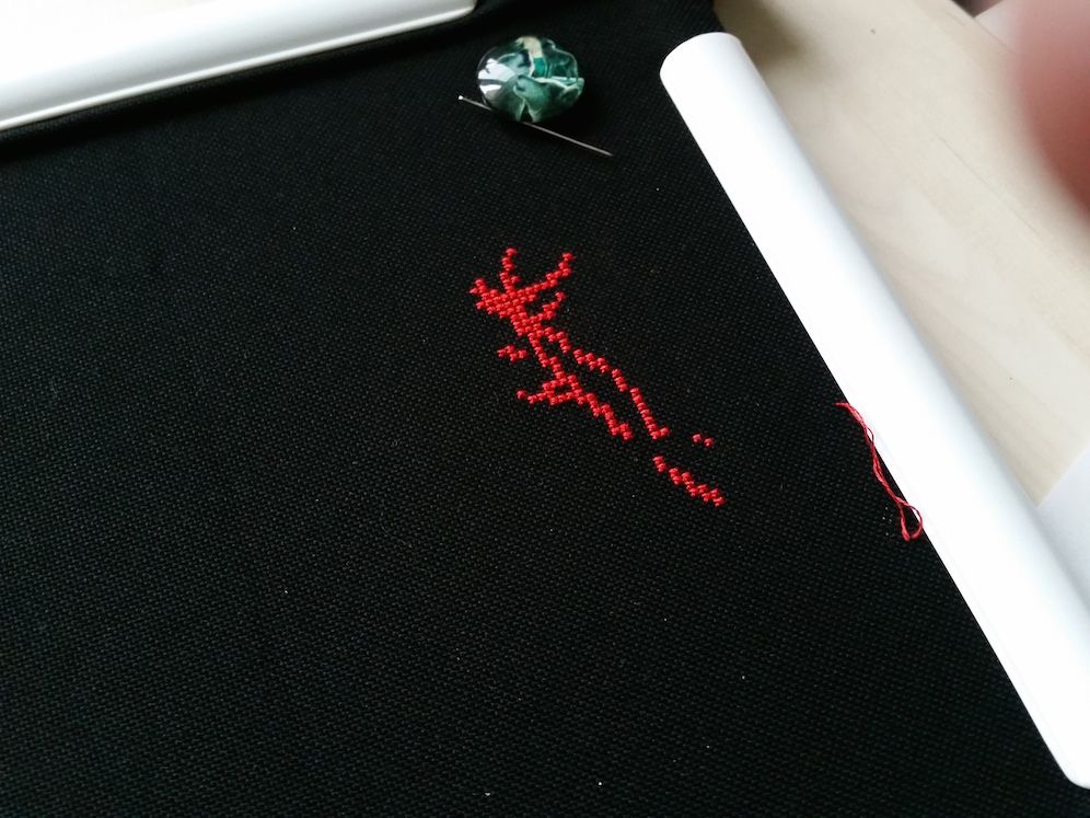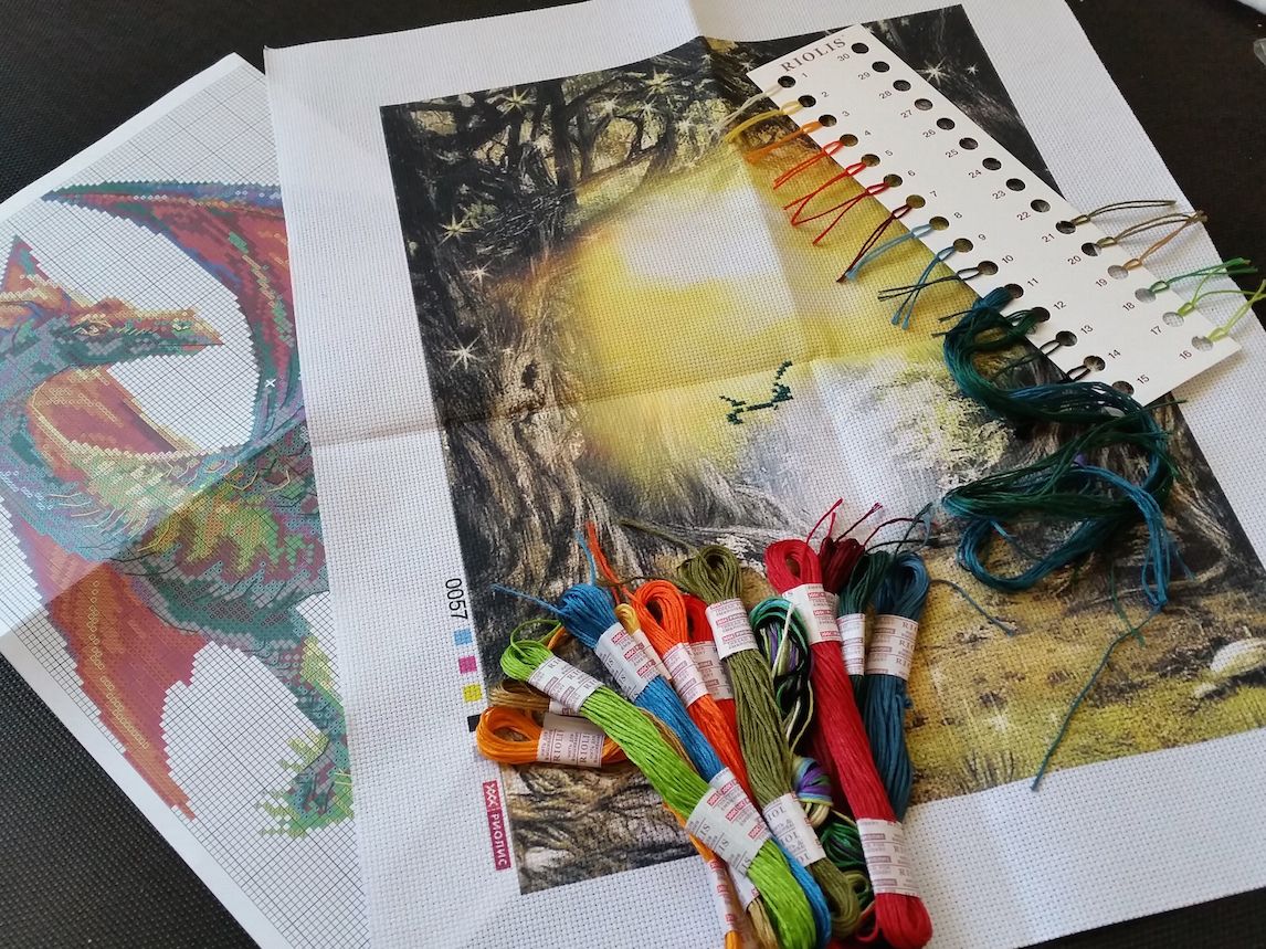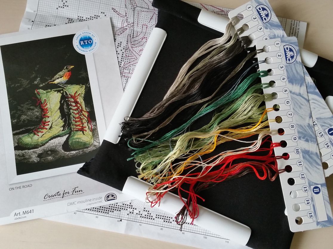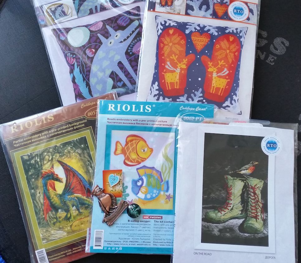 2 октября 2016 Всем ночной привет! Постепенно отхожу от эмоций от встречи и выставки и уже можно попробовать и отчет написать. Отчет сегодня будет совершенно... ну в омут с головой, короче Но начну я все же с уже известных вам процессов. 1. Река Дору Те, кто был на встрече, ничего нового не увидят, но с точки зрения остальных прибавления имеются: Оснастка практически готова (точнее ее крестиковая часть), дальше будет сама лодка и ее содержимое. Ну и река, конечно. Люблю эту работу бесконечно! 2. Красные цветы от РТО: тоже немного подросли. Какой же кайфовый процесс. Кто еще не знает Ольгу Сотникову очень рекомендую к вышиванию ее дизайны! Ну а дальше буду краснеть... Сильно краснеть... и делиться эмоциями взахлеб! Итак новые процессы. Много новых процессов! Новый процесс 1: Лисичка-вегетарианец по схеме Полины Тарусовой Эту схему я покупала сразу с прицелом на то, что вышью ее себе на футболке. И вот наконец нашлась подходящая футболка и соответствующее настроение. Схема разработана по рисунку Марии Ступак, порядка 60*60 крестиков, нитки DMC, футболка+водорастворимая канва Bestex Она клееевая! И совсем несложная. И яркая. И вообще..наконец-то у меня тоже будет футболка с вышивкой!! Дальше была Формула рукоделия... Представляю вам содержимое моей сумки по возвращении домой Дракон - ну вы все и так понимаете...Настя. Правда в этом случае Женя ее с удовольствием поддержал, а я немного подумала лишь для отвода глаз Подушки РТО: одна уютная, другая классная и забавная. К ней в пару будет еще лисенок (на выставке к тому времени закончился). Рыбки - набор для Насти, она давно хотела повышивать бисером "как мама" . Ну а Ботики...ботинки это с первого взгляда и в самое сердце! Отшив не разочаровал ни капельки. Сомнений не было никаких! Ну и немного "сладостей": магнит Чижик-Пыжик - сувенир от девочек из Питера, два магнита для игл: один подарок от Иришки Дафны, другой куплен на выставке. Все уже пристроено и работает по-назначению: Чижик-Пыжик радует на холодильнике (мы же жили в 50 метрах от него во время нашей поездки!), магниты для игл расползлись по процессам, а наборы.... наборы начаты! Все до одного! Три еще вчера, сразу по возвращении со встречи (после одиннадцати вечера!): спать от эмоций все равно не могла, а нетерпение при этом зашкаливало. А четвертый сегодня утром и то лишь потому, что решила шить на равномерке и вчера ее постирала. На мокрой решила все же не шить Настя от меня решила тоже не отставать: с самого утра начала свой набор. А когда я сказала, что мы можем и гаечку ей сделать на форуме, если она его не бросит, то тут иголку было не отнять Поэтому... ...Новый процесс 2: Риолис, РТ0062, Рыбки - вышивка бисером по ткани с нанесенным рисунком. Когда я увидела среди новинок эту серию наборов, то сразу решила, что это может сработать и заинтересовать Настю, которая давно просит помочь мне с бисерным процессом. Боюсь сглазить, но кажется, я угадала: она сегодня с самого утра взялась за вышивку и уже на 4й бисеринке справилась самостоятельно. Причем нитки из набора мы забраковали (белое хлопковое мулине) и взяли ту же нить, которой я березки шью. Итак, подготовка и результат одного дня работы почти шестилетки, которая впервые в жизни вышивала бисером: Кстати принт качественный, значки по цвету близки к цвету бисера и безошибочно идентифицируются ребенком. Бисер непрозрачный, яркий и ка