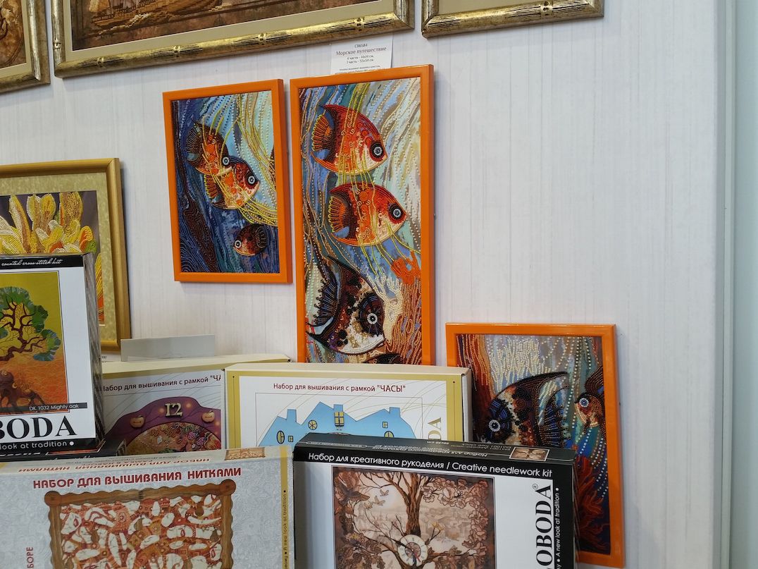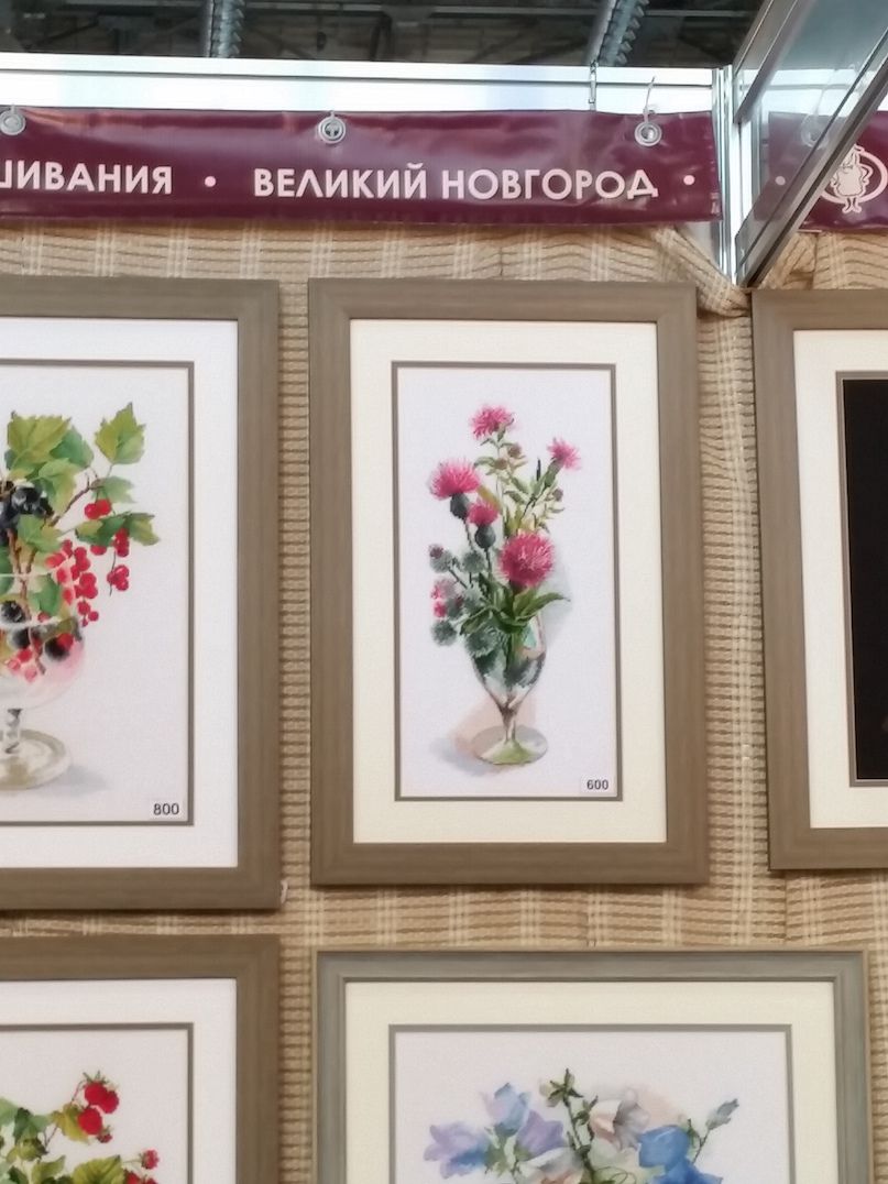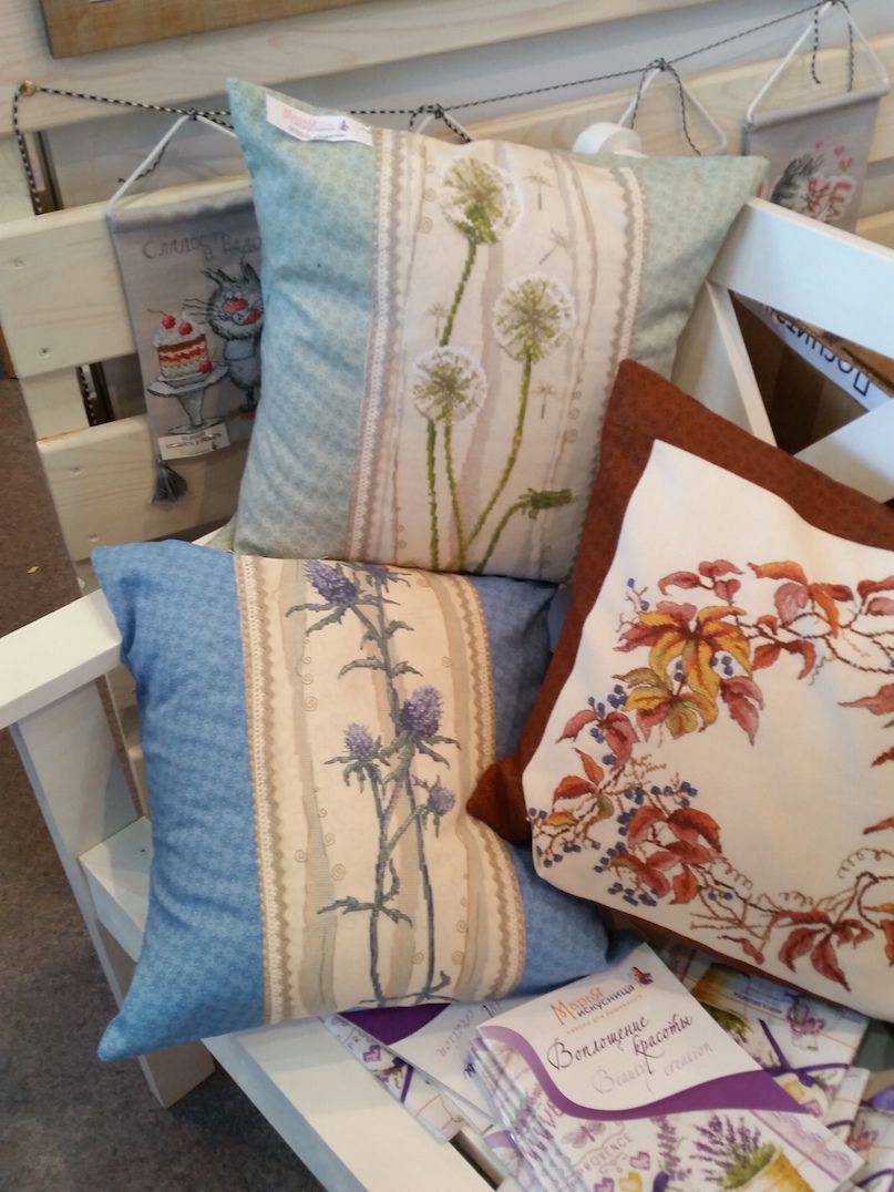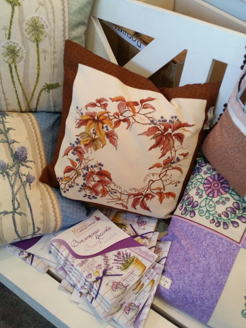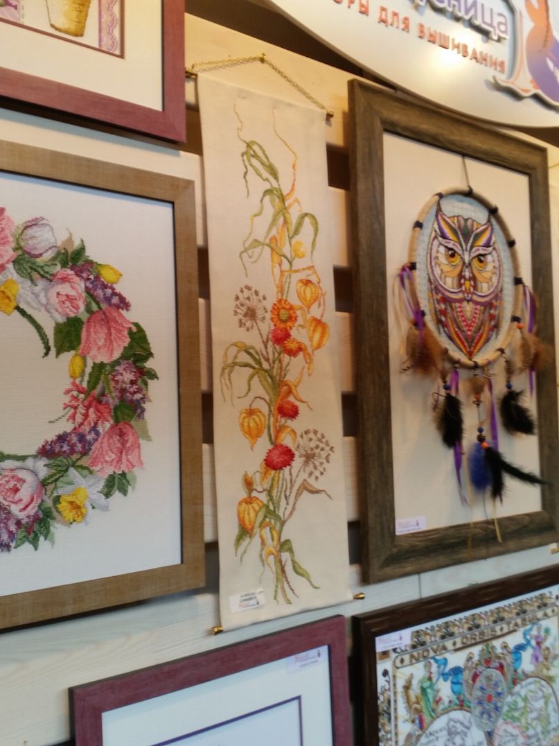 2 октября 2016 Ну и про выставку. Понравилось! Хотя были и некоторые разочарования, на которые я правда быстро махнула рукой, ибо положительных эмоций намного больше. Вы, вероятно, пересмотрели кучу фотографий, поэтому комментировать буду по-минимуму. И фото не претендуют на полноценный обзор, эта подборка - история моего путешествия по выставке и моих впечатлений. Сразу возле входа Нова Слобода. Все рассмотрели (были мы с Асей Каори, Олей Путешественницей, которая вскоре исчезла, зато к нам присоединилась Света Krelina), обсудили (впечатление очень положительное, особенно от городских пейзажей и шовчиковой ботаники), я в очередной раз убедилась, что их часы мне не по вкусу, и тут мы увидели их...рыбок, вышитых бисером по принту: К нашему сожалению, они оказались триптихом, а триптих никому из нас был не нужен. "А может купить на двоих/троих?" - пошутили мы и пошли дальше. В самом конце наша шутка стала реальностью: мы действительно купили этих рыб на троих: Ася, Оля и я, - причем части разделились сами собой по предпочтениям. Моя - та, что на втором фото. Ну а пока набор уехал в НН, где Асе предстоит работа над самой большое частью триптиха. Дальше был РТО: маяки замечательные, Русалка классная - не исключено, что когда-нибудь она появится в моих процессах, яркий и невероятно сильный по восприятию букет, вышитый к тому же на классной коричневой канве, местами очень в тему оставленной незашитой - такая эффектная игра объемов и фактур получилась. Кардинал невнятный на большинстве фотографий вживую очень объемный, живой и привлекательный. Не мое, правда, но эффект "фото-реальность" впечатлил. Чашки понравились. Может потому, что я давно знала, что фон там напечатанный. В принципе диссонанса не возникло, сочетание вышитой и напечатанной части вполне себе привлекательное. У Овна красивые пейзажи, но меня впечатлило опять же несоответствие моих представлений с реальностью касательно вот этого сюжета:. Он, оказывается, очень миниатюрный и за счет этого очень изящный. С трудом уговорила себя прислушаться к голосу разума, который после покупок на стенде РТО завопил с новой силой МИ: мало отшивов!!! Нет даже тех, что на весенней выставке считались совсем новинками (например, серия шиповник-плющ-анемоны и некоторые венки), а посмотреть хотелось. Это ладно я, которая весной тоже была, а как же тем, кто едет из других городов? Они-то справедливо выбирают осеннюю выставку... Венок с чертополохом не понравился вообще. Скучно. Зато подушки из серии физалис-чертополох-одуванчик классные. А еще классные подушки с кошками (анонс) и с осенним венком. Панна: понравился осенний пейзаж (не панелька), шовчиковые миниатюрки с комнатными цветами (они и правда очень маленькие и оттого мне показались такими классными - даже купить захотелось. Хорошо, что не продавались). Оформление серии стимпанк от Айвара Пожарского вживую мне понравилось больше, чем на фото, хотя сюжеты вообще не мои. А вот растительные дизайны несколько разочаровали. Орхидея, которая была моим фаворитом по фото и рассматривалась в качестве подарка воспитательнице, вообще ни о чем. Карта классная - если есть желание и уверенность в своих силах - берите! (а я процесс посмотрю с удовольствием ) И пара фотографий с одного из стендов дизайнеров. То, что захотелось сфотографировать, чтобы не забыть. А вообще красивых работ