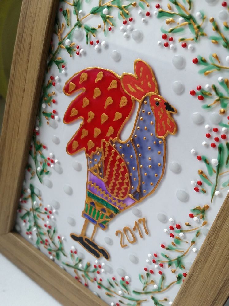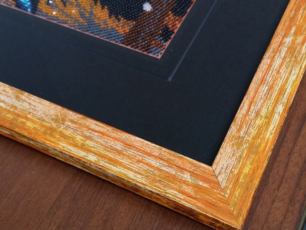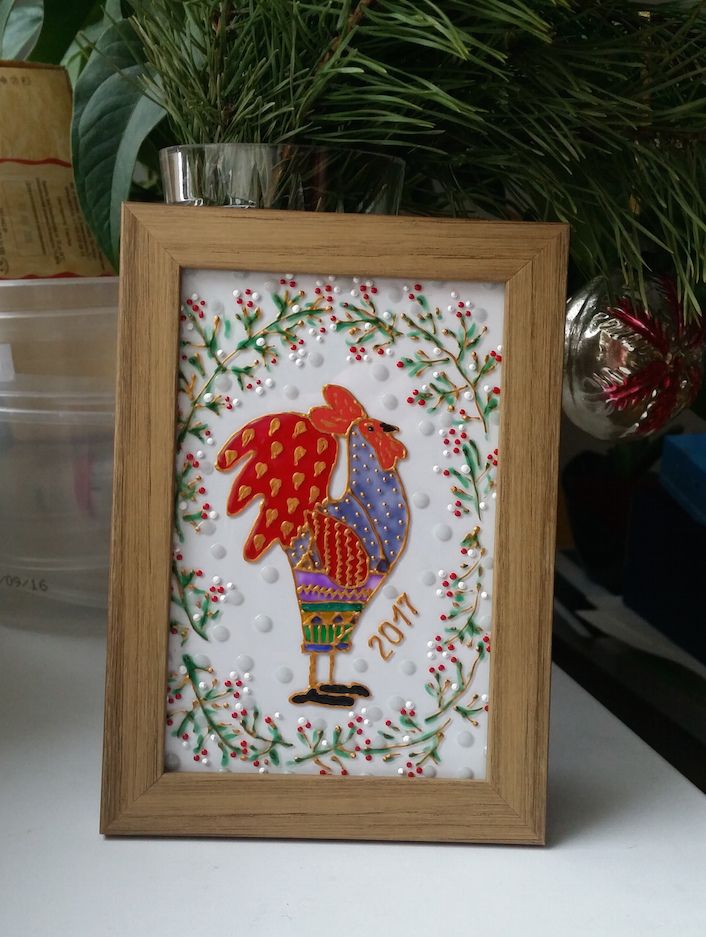 1 января 2017 Всем-всем-всем! Рада приветствовать вас в этот январский вечер! Так уж сложилось, что воскресенье нынче выпало на 1е января, а это отличный повод поздравить всех с наступившим уже праздником вовремя! Поздравляю вас с Новым годом! Пусть он будет интересным, полным приятных открытий и обойдется без потрясений, по крайней мере неприятных. Желаю вам удовольствия от хобби, новых процессов, пополнения закромов и красивых оформлений! А еще богатырского здоровья и удачи во всех-всех ваших делах и начинаниях! Что же будет в первом отчете года? А будут оформленные работы!! Итак, поехали! "Ежик туфли примерял" от РТО Я уже рассказывала, какие ассоциации вызывает у меня этот сюжет, поэтому повторяться не буду (кто забыл, можно краткую версию прочитать в нашей Галерее). Соответственно и оформления хотелось такого, чтобы передать это настроение, чтобы работа излучала тихую радость и ощущение домашнего праздника. Не хотелось - излишней яркости и "праздничности" в классическом понимании. Поэтому красные багеты были отвергнуты, хотя и теоретически подходили (слишком активные), а красный поддержан лишь срезом верхнего паспарту. Дорисовка... я ее представляла изначально совсем не такой, но то что вышло меня покорило и вписалось в мою идею идеально. Ну и багет... потертый (конечно же! ), но суть даже не в этом. Эти потертости на светлых участках едва поблескивают (что на фото, увы, не передать) при попадании света. Я бы даже сказала мерцают. А потому оформление выглядит праздничным и при этом таким деликатным и трогательным. Работа будто бы на самом деле излучает какой-то внутренний свет и при взгляде на нее хочется затаить дыхание, чтобы ненароком не спугнуть чудо... Котята от Butterfly, вышивка бисером, круговая техника. Эти товарищи были вышиты в январе уже прошлого года, но желание отвезти их в багетку возникло только к его концу. Видимо пришло их время, потому что то, что получилось, вызывает у меня настоящий восторг! Двойное черное паспарту: нижнее с оранжевым срезом, верхнее с черным срезом и черной же канавкой. Черный цвет здесь глубокий и равномерный, но совершенно не мрачный. Интересный момент с нижним паспарту: его оранжевый срез - практически вынужденная мера! Если приложить паспарту с белым срезом, то кажется, что окно просто напросто велико и по бокам проглядывает белая ткань основы, та, что за границей поля для вышивки. Оранжевый срез стал поистине находкой и удачно совпал с основной тональностью вышивки. Ну и еще один эффект: паспарту погасило лишний "сопливый" блеск бисера и сгладило зернистую круговую структуру вышивки. Не знаю, как так получилось, но выглядит действительно здорово (я же и сама отнюдь не оголтелый, а очень избирательный фанат бисера, а раньше и вообще чуть ли не с алмазкой его ровняла и носом крутила). Ну и багет. Опять же не передать всей его прелести на фото, потому что цвет его умеренно яркий и немного переливается в зависимости от освещения и угла зрения. Причем ровно настолько, чтобы поддержать прелесть бисера и уравновесить строгость черного паспарту с цветной вышивкой. Суммарный эффект настолько превзошел все мои ожидания, что работу буквально не хочется выпускать из рук и на ум приходит только одно: "Моя прееееееелесть!" А еще из багетки мы не ушли без подарка! Ирина подарила Настюше очень симпатичного петушка, нарисо