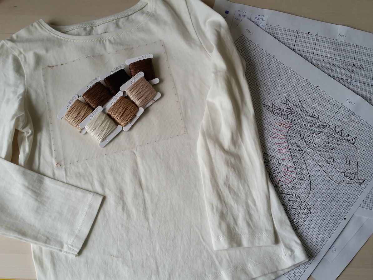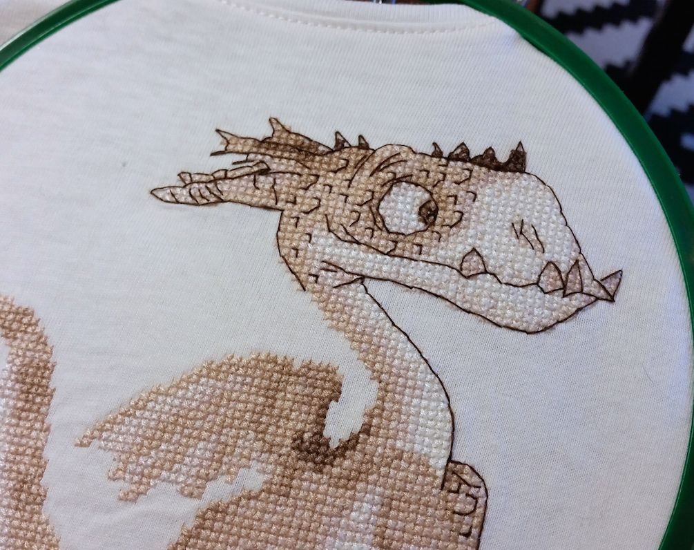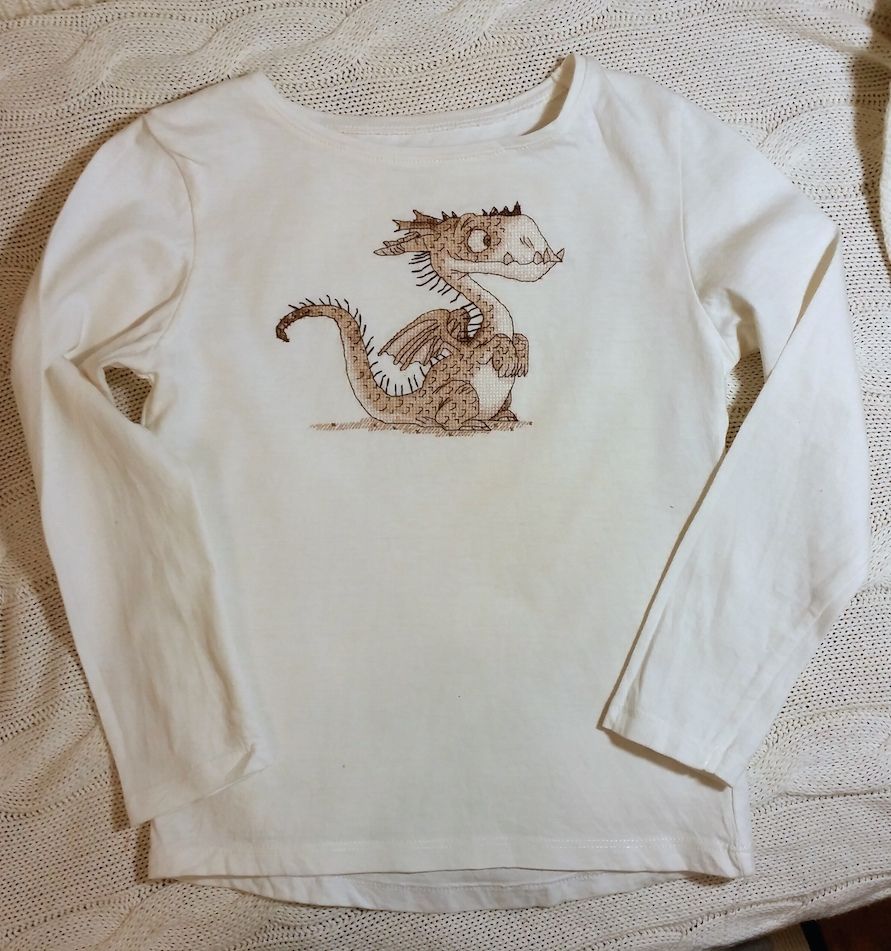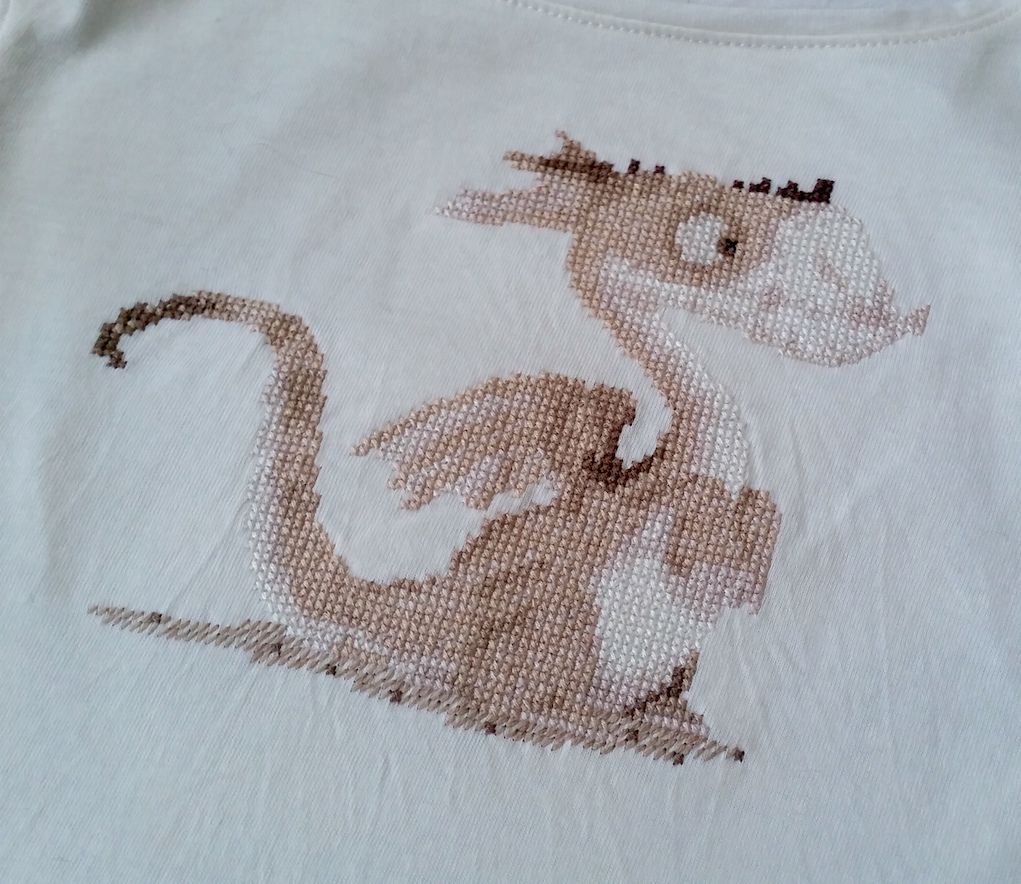 8 января 2017 Привет, я снова запрыгиваю в последний вагон уходящего поезда пытаюсь успеть с воскресным отчетом в последний час воскресенья. Но сегодня тому есть причины - день был посвящен завершению... Но обо всем по порядку. Итак, новый год начался. А я же себе одно обещание давала - с началом 2017 достать едва надкусанных гобелен, подаренный мне на ДР. Точнее разрешить себе самой его наконец пошить И пусть в новогоднюю ночь на вышивание меня не хватило, но 1го января уже ничего не могло помешать мне! Итак, Гобленсет, "В горах" было и стало: Затягивает и заманивает. И впечатляет. А еще не устаю поражаться соотношению площадей вышитой части на канве и размеру аналогичного закрашенного куска в схеме. (не для гаечки) Далее процесс - долг (в первую очередь перед ребенком), начатый еще в прошлом году, хотя вы его еще и не видели. Зато сегодня могу показать его уже завершенным. Екатерина Мешкова, "Дракоша сидит" К чему стремимся: Основа - трикотажная футболка и водорастворимая канва Bestex, нитки (здесь внимание!) ПНК им.Кирова подбором по живой карте Про схемы Кати Мешковой и тем более этих дракош (у меня это третий) повторяться не буду: все классно, удобно, нравится. Но именно этот процесс ко всему прочему был двойным экспериментом, вот об этом подробнее. 1. Впервые попробовала нитки ПНК им.Кирова (новые, в 10и метровых мотках). Качество - в принципе на высоте, хотя и отличается на ощупь от моих любимых ДМЦ. Кировские более мягкие, чуть менее блескучие, напомнили мне анкоровские. Но если с анкоровскими у меня стойкая личная неприязнь, то эти проблем и отрицательных эмоций не вызвали. Ну кроме "не дмц!!" И да, канва же растворяется в очень горячей воде - нитки ни капли не пострадали! Теперь о соответствии. Не знаю как другие цвета, но дракошинская палитра (номера 838-842, а также 543, 3865) переводятся отвратительно. Там правда и в таблице производителя звездочка стоит, что соответствия полного нет, но и те, что без звездочки - не то. Чуть серее или чуть зеленоватее, или розовее. И главное отклонение не в одну сторону, а как попало. Т.е. сойдясь в одном дизайне, сочетаться они не будут. Пришлось подбирать некоторые цвета, вооружившись живой картой дмц и опытом по отшиву предыдущих дракош. Итог...Итог, тем не менее, хорош. Поэтому ПНК однозначно зеленый свет, но желательно, чтобы в схеме был ключ в ПНК. Перевод по таблице очень опасен. 2. Как то в теме Светы svetles обсуждалась идея попробовать вышивать на трикотаже без использования водорастворимой канвы, поставив фломастером точки, обозначающие места прокола иглой. По своему опыту я знала, что технически могут возникнуть определенные сложности. Но тут у меня самой возникла трудность: канва на дракошу не умещалась в пяльца, а если попытаться запихать ее под пяльца, то она просто ломается. Прикинув, какой кусочек не умещается и убедившись, что маленький, я решилась на эксперимент. Обрезала часть канвы и поставила те самые точки (напомню, с обратной стороны у меня приутюжен плотный отрывной флизелин. Без него даже не пытайтесь это повторить на трикотаже!) Фото не для гаечки! Результат мне не понравился. Все равно криво, крестики пляшут. Это я тут переделывала несколько раз (что на трикотаже в принципе нежелательно), и то крестики справа намного ровнее тех, что без канвы. А главное перетягиваются дырочки трикотажа, что выглядит неаккуратно и