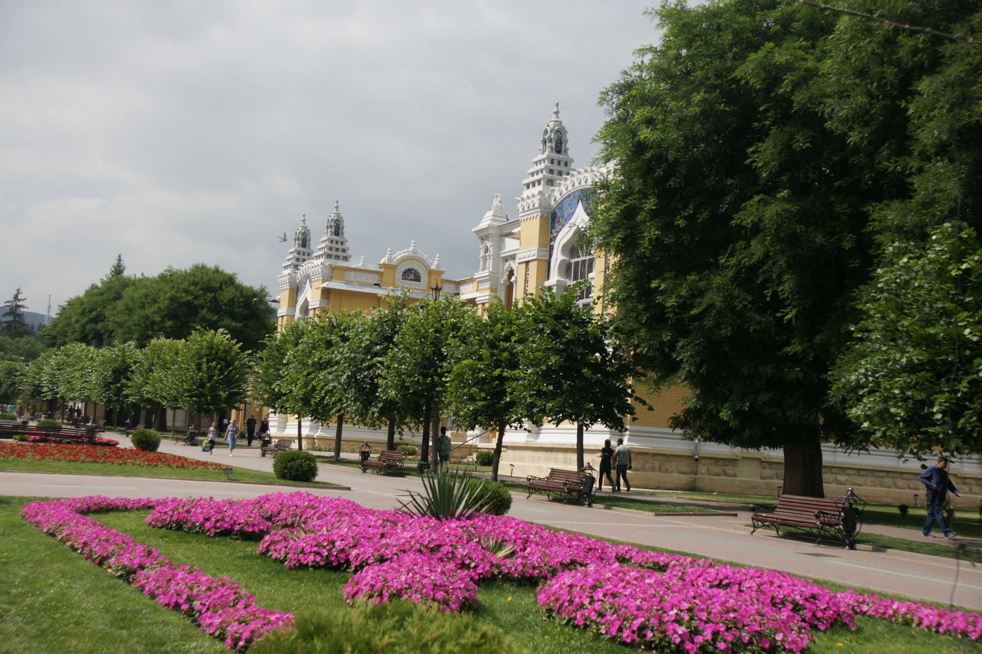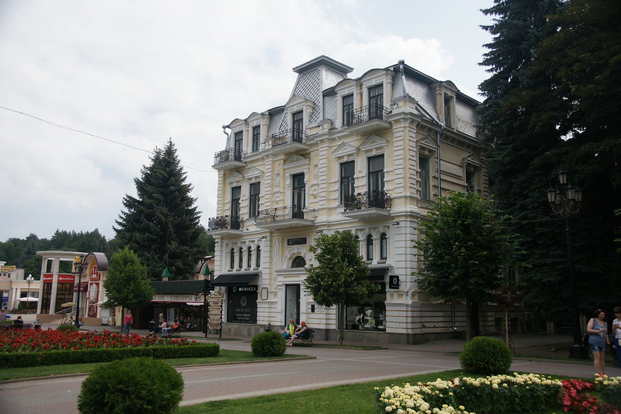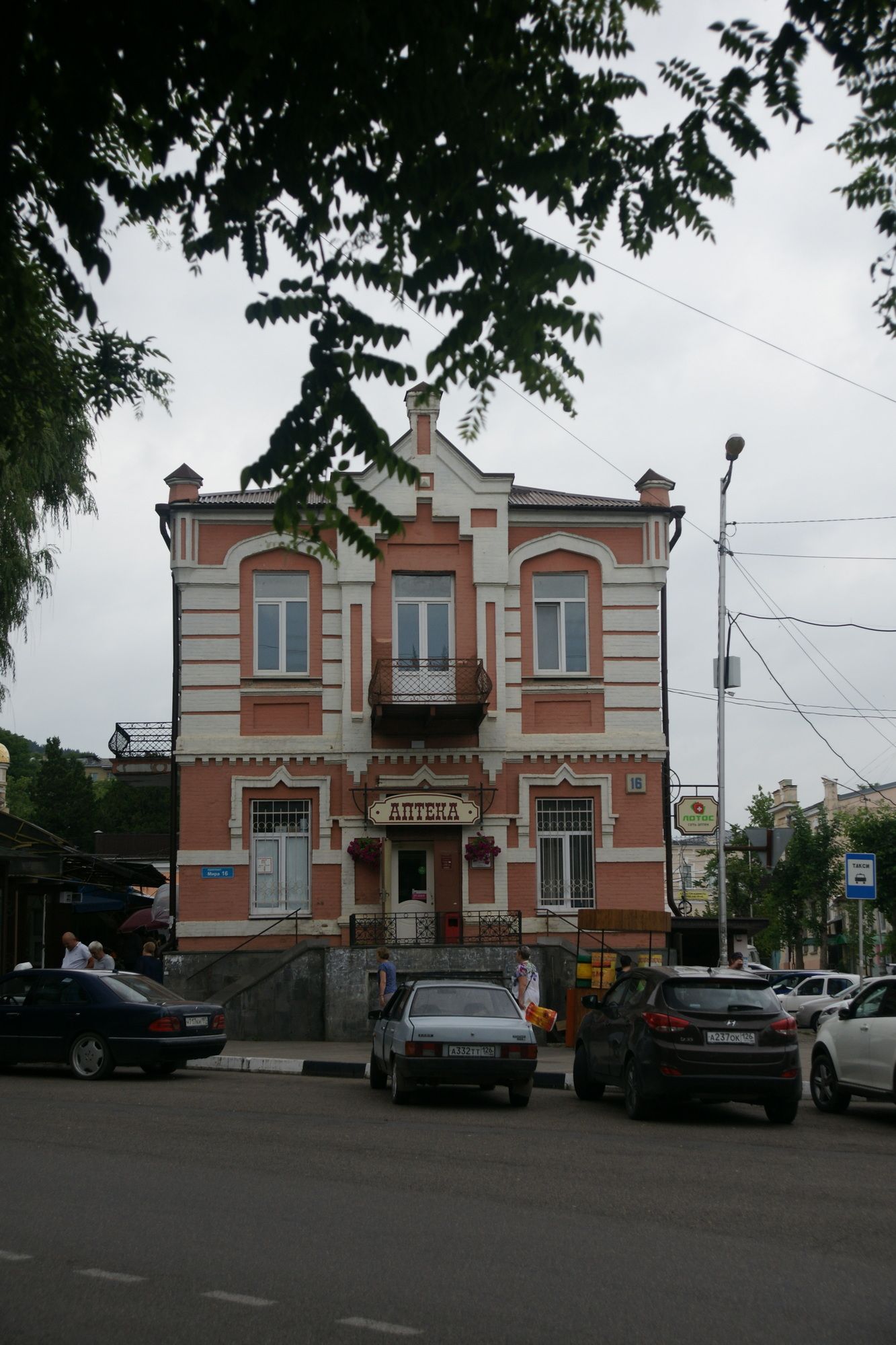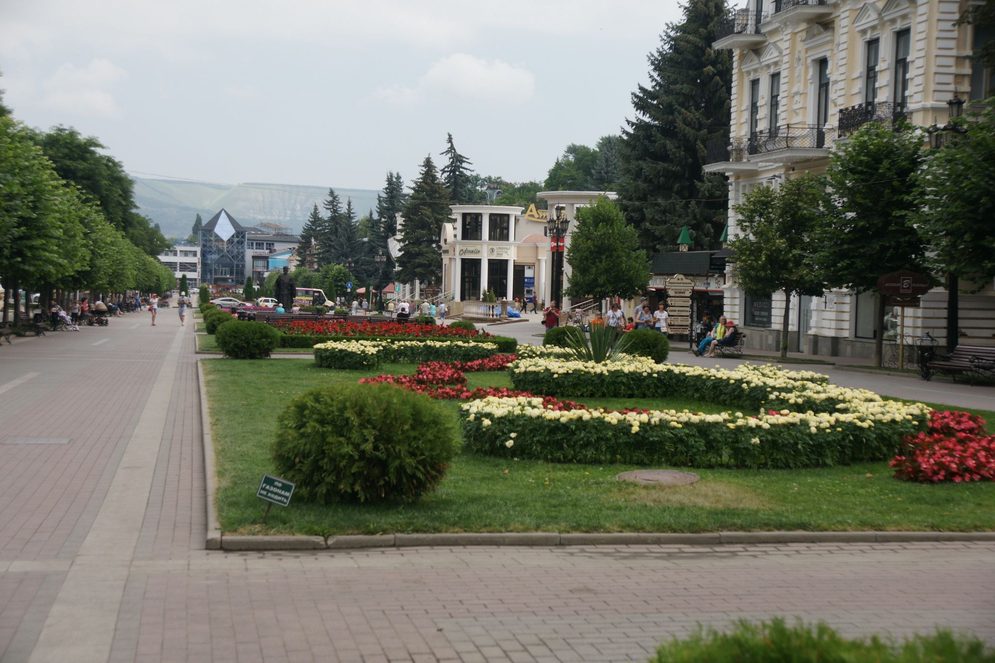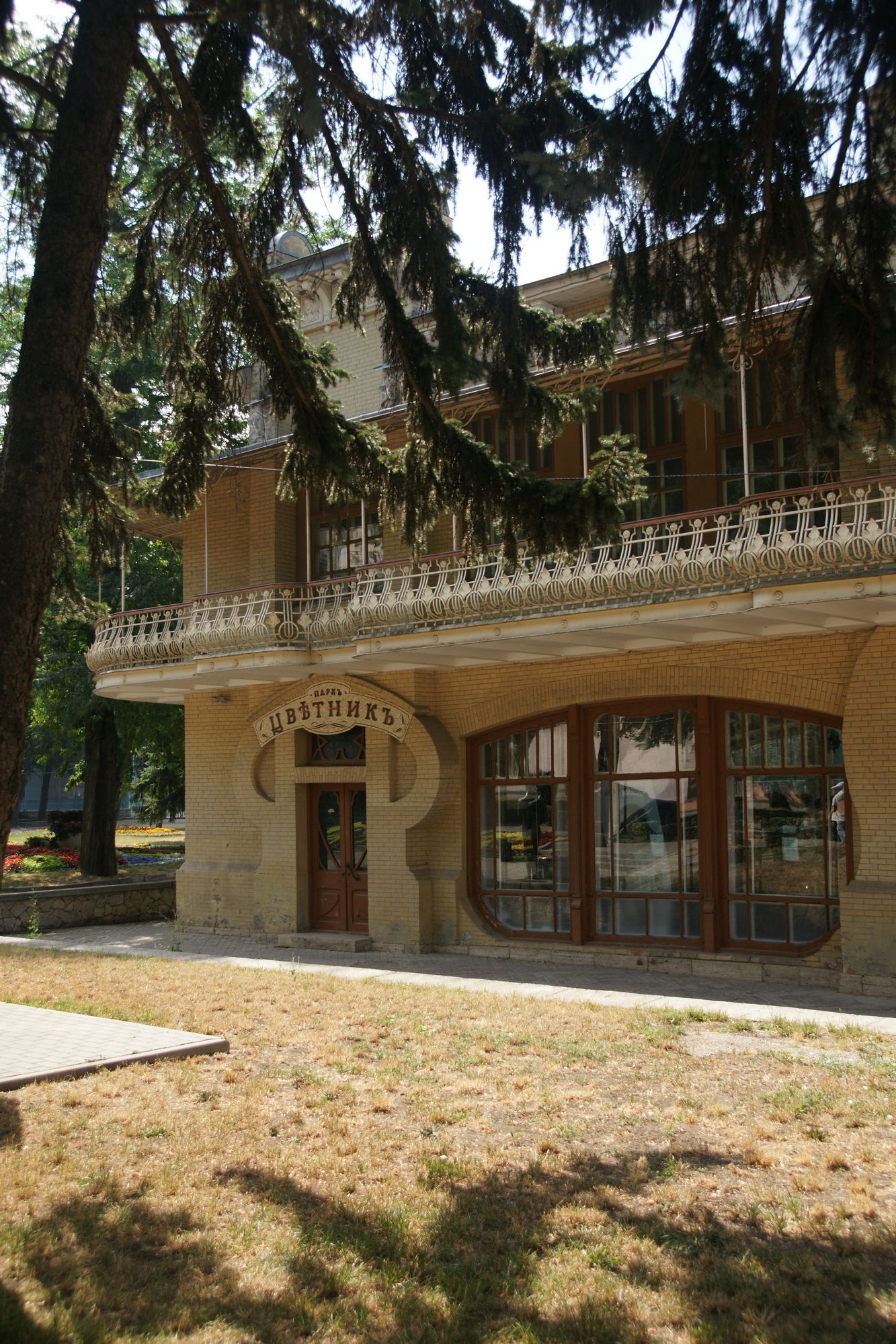 24 июля 2018 Прошу прощения за то, что немного пропала, обещав продолжение рассказа. У меня случился швейный запой: в смысле тот, что из ткани и за швейной машинкой. Это старший деть как-то неожиданно выросла из своих одежек: пришлось срочно обеспечивать новыми штанами, толстовкой и т.д. Ну а вообще-то давно пора отпускные рассказы завершать. А то уже и вышивальный отчет написать не терпится: я ж сегодня кораблики из багетки забрала!... Но фотосессия будет завтра, а сегодня я снова возвращаюсь в Кисловодск.... Конечно же, курортный парк и минеральная вода - это еще не весь Кисловодск, хотя и значительная его часть в плане нашего отпуска. Город очень интересный. И хотя относительно молодой (крепость на месте будущего города была основана только в 1803г), но у него есть свое лицо и своя история. Помимо повсеместного упоминания Лермонтова и "Героя нашего времени" (что здесь, кстати, не так нарочито подается, как в Пятигорске), город гордится многими известными жителями и гостями. Здесь сплелись культуры и судьбы горцев, терского казачества, России царской и России советской, здесь оставили след многие творческие и влиятельные люди своего времени. Здесь не преминула "расписаться" и революция, и война. Здесь почти каждый дом в исторической части готов рассказывать свою историю и историю своих хозяев заинтересованному слушателю. В этом смысле постоянно радуюсь, что под рукой у меня была такая книга, которая смогла помочь окунуться в атмосферу города-курорта-здравницы. А именно в этой ипостаси Кисловодск и развивался практически все 200 с лишним лет своей истории. Главной курортной улицей сейчас является Курортный бульвар. Когда-то давно он (а точнее его часть) носил название Тополевой аллеи, т.к. 1847-48гг здесь были высажены тополя по приказу графа Воронцова, тогдашнего наместника Кавказа. К концу XIXв. аллею замостили. А в 1918 тополя сильно пострадали - жители топили ими дома, чтобы не замерзнуть. Сейчас это пешеходная улица, где сосредоточены многие лечебные учреждения, архитектурные достопримечательности, кафе и туристические магазины. При этом нет ощущения хаоса и сильной суеты. Неон не бьет по глазам и мозгу отовсюду. И хотя часть вывесок все же слегка ярковата, но большинство из них единообразны и стилизованы в соответствии с общей стилистикой курортного города и променада. Вывески такого стиля мы встречали по всему городу, хотя и в меньшей концентрации. Мы этот факт оценили. Упирается бульвар как раз в Нарзанную галерею, про которую я уже упоминала. А рядом с ней фонтан "Лягушки", который просто нереально красив в обрамлении красных цветов, зелени и благодаря ярчайшему голубому дну чаши бассейна. С товарищем с последнего фото мы здоровались каждый день ровно на этом месте: в отверстии в стене здания Нарзанных ванн Не буду рассказывать подробно про каждое строение. Любознательных отсылаю к книге и гуглу. Прокомментирую только некоторые моменты. Здесь лечебное учреждение - это не мрачное безжизненное здание. Если вы видите белоснежный особняк с красивыми балкончиками, то он вполне может оказаться, к примеру, курортной поликлиникой. Причем старейшие учреждения не переехали в чей-то старинный особняк или доходный дом, а изначально строились такими. Многие дома на Курортном бульваре и примыкающей к ней пешеходной же улице Карла Маркса - это бывшие леч