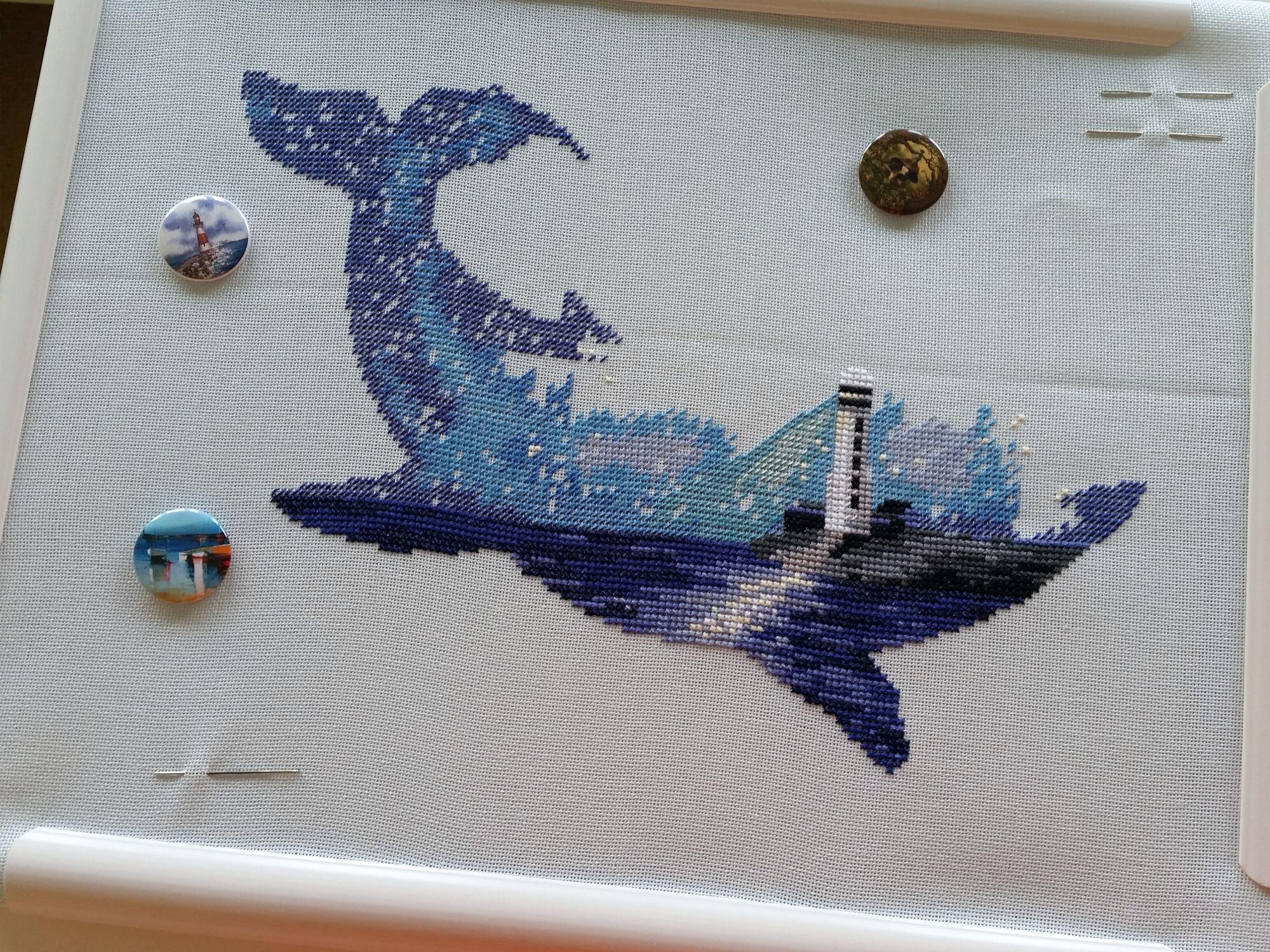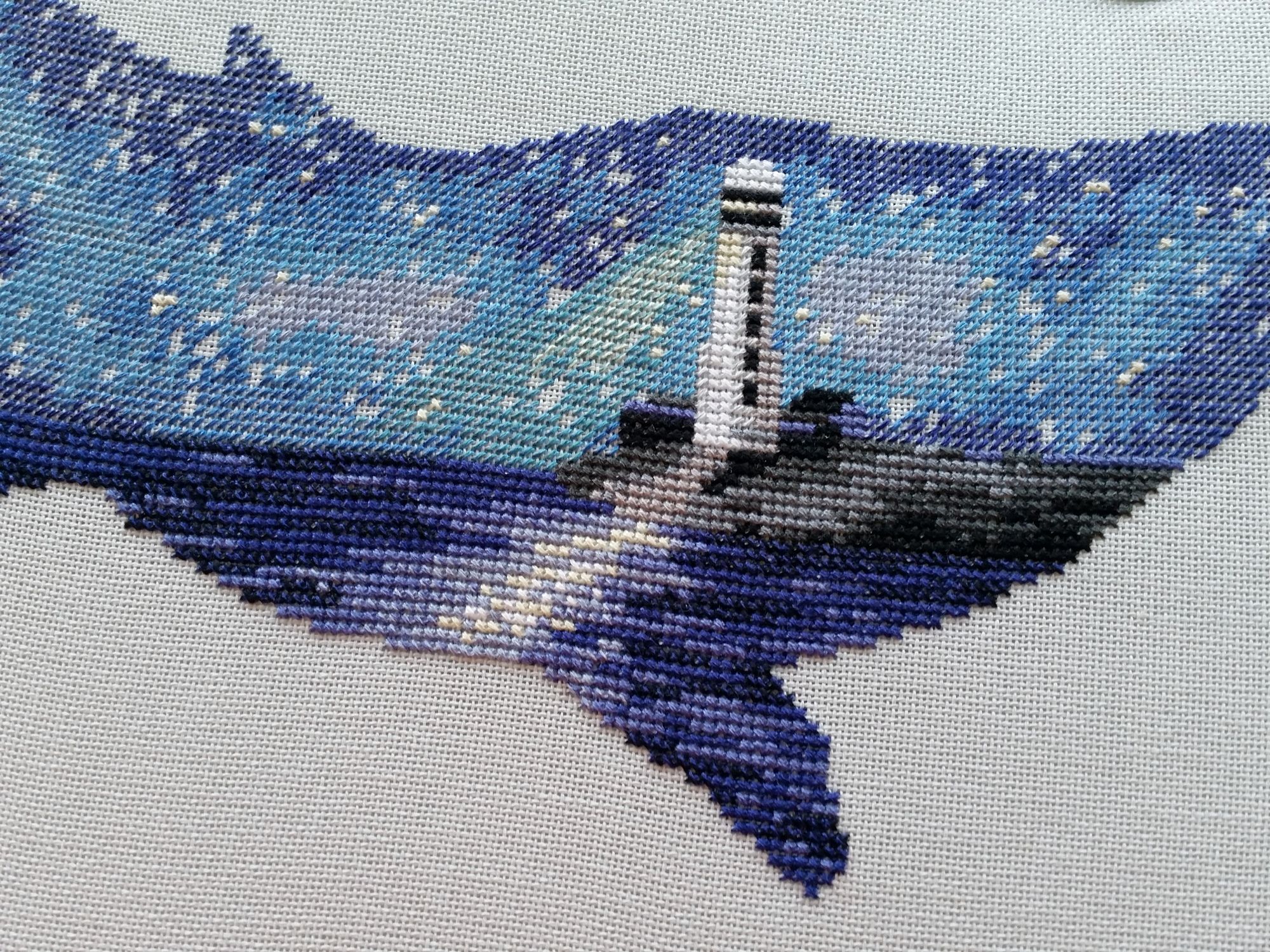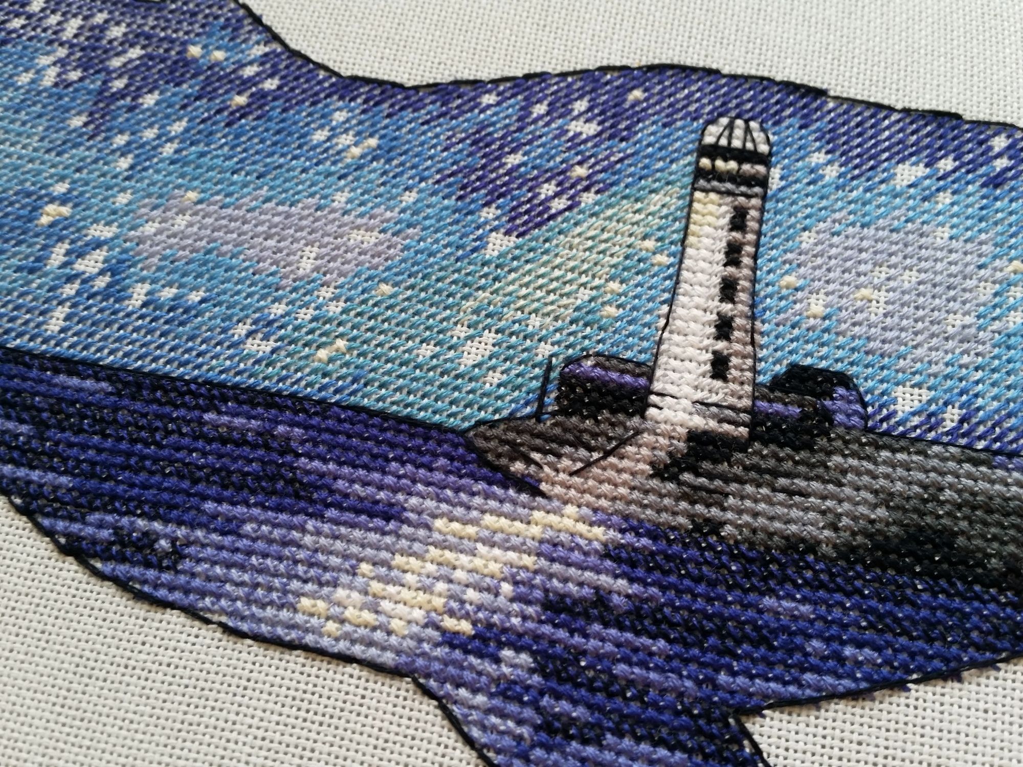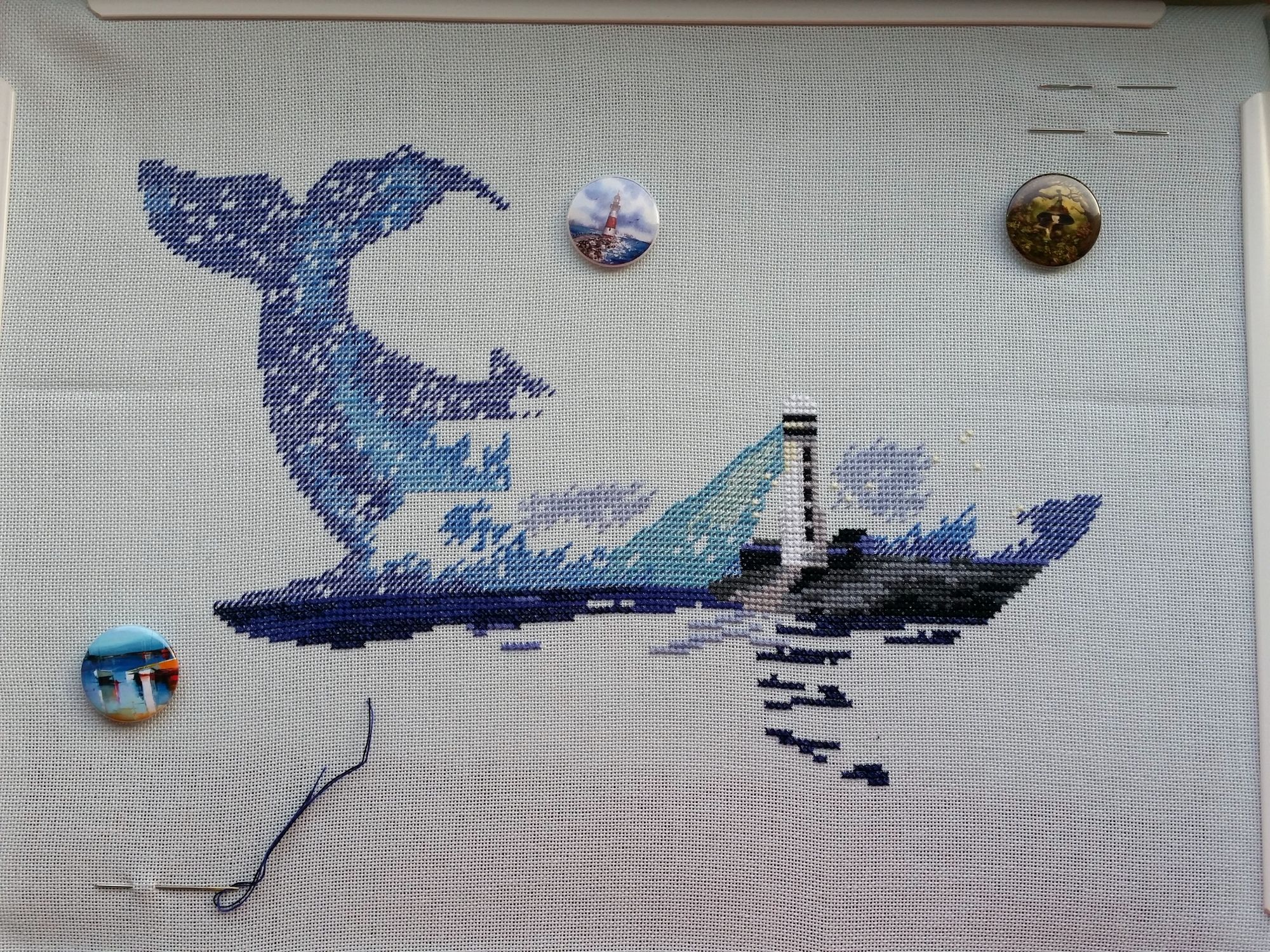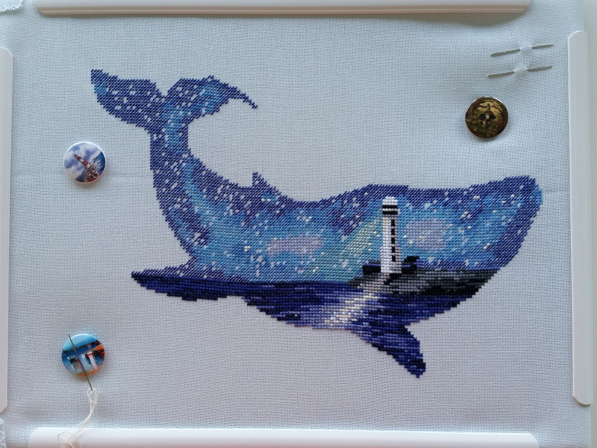 15 сентября 2018 Всем здравствуйте! Я сегодня очень долго фотографии разбирала. Причем вышивальные фотографии. И, если честно, разобрала не все. Так что сегодня будет первая часть марлезонского балета отчета. Про сроки второй ничего обещать не буду, но скажу, что в нее войдут результаты посещения багетки, так что забегайте на досуге. Итак, сначала я, пожалуй, немного объяснений. Ну чтоб вы на меня не обижались за молчание. И чтоб лучше понять состав нынешнего отчета. Кому только про вышивку, смело пропускайте этот текст. Скрытый текст Собственно все это время мы с Настей пропадали в больнице. Плановая операция. Очень непростая, но долгожданная: очередь по квоте ждали больше года. Так что, несмотря на все очевидные "бонусы" такого времяпрепровождения, событие скорее хорошее (и да, Маша, именно это я имела ввиду, когда про главное событие года говорила ). Просто порадуйтесь за нас, а грустить и сожалеть не будем. Впереди у нас очень долгий, сложный и полный серьезных ограничений период реабилитации, а позади 17 дней больничного плена. Выписали нас только 10го в понедельник, и день рождения я "праздновала" в больнице. Так что ваши поздравления собственно и были всем "отмечанием". А потому еще раз за них вам спасибо! Ну а вышивка.... еще раз убедилась, что вышивка - лучшее успокоительное средство. А еще отличный способ скоротать время в ограниченном пространстве при куче свободного времени и узком наборе "обязательных ежедневных событий". Поэтому да, вышивка сегодня будет в большом количестве. Только специфическая. Нервноуспокоительная. Единственный процесс из текущих, что удалось продвинуть до отъезда, это Кленовый лист. Успела закончить крестики и едва начать бэк. Бэка много, многоцветный и в разное число нитей. Но счетный. А значит просто надо найти время и спокойно его сделать. Правда после выписки со временем пока беда, но впереди же ФР и встреча, на которую хочется привезти его уже завершенным, а это отличный мотивирующий фактор, так что... А пока вот так. Очень красиво. Ну и поехали дальше. Процессы больничные Еще в первой половине лета Наташа @Nata_Struchkowa решила разыграть конфетку: набор от Овна с китом и маяком. Сначала я прошла мимо. А потом что-то щелкнуло в голове: именно его я хочу взять в больницу. Если выиграю, то так тому и быть. Кит, маяк...понятно, что в приметы я не особо верю, но в той ситуации, когда от тебя мало что зависит, это отличный способ сублимации. И я нажала "спасибо". И выиграла. И в первый же день пребывания взаперти сделала первые крестики. Точнее полукрестики. Ну а по приезду домой оставалось лишь постирать, погладить и сфотографировать готовую работу Овен. 1039. "Мир животных.Кит". Прежде фото одно лишь замечание: основу(в наборе была белая аида 16го каунта) я заменила на светло-голубую равномерку (Brittney ice blue 28 каунт). Ну потому что изначально не видела этого кита на белом фоне. Были опасения, что из-за увеличения каунта может не хватить ниток. Но ниток осталось очень много. Столько, что не удивилась, если бы еще на один отшив хватило. Нитки... ну однозначно не самые любимые, но приемлемые. Катышки были, но легко убирались. Теперь только фото... Очень нравится. Очень. Сначала немного напрягали темные цвета, которых тут большинство, но когда последние полукрестики были сделаны, паззл сложился. Свет маяка, луч света на воде и в ночном небе, силуэт мо