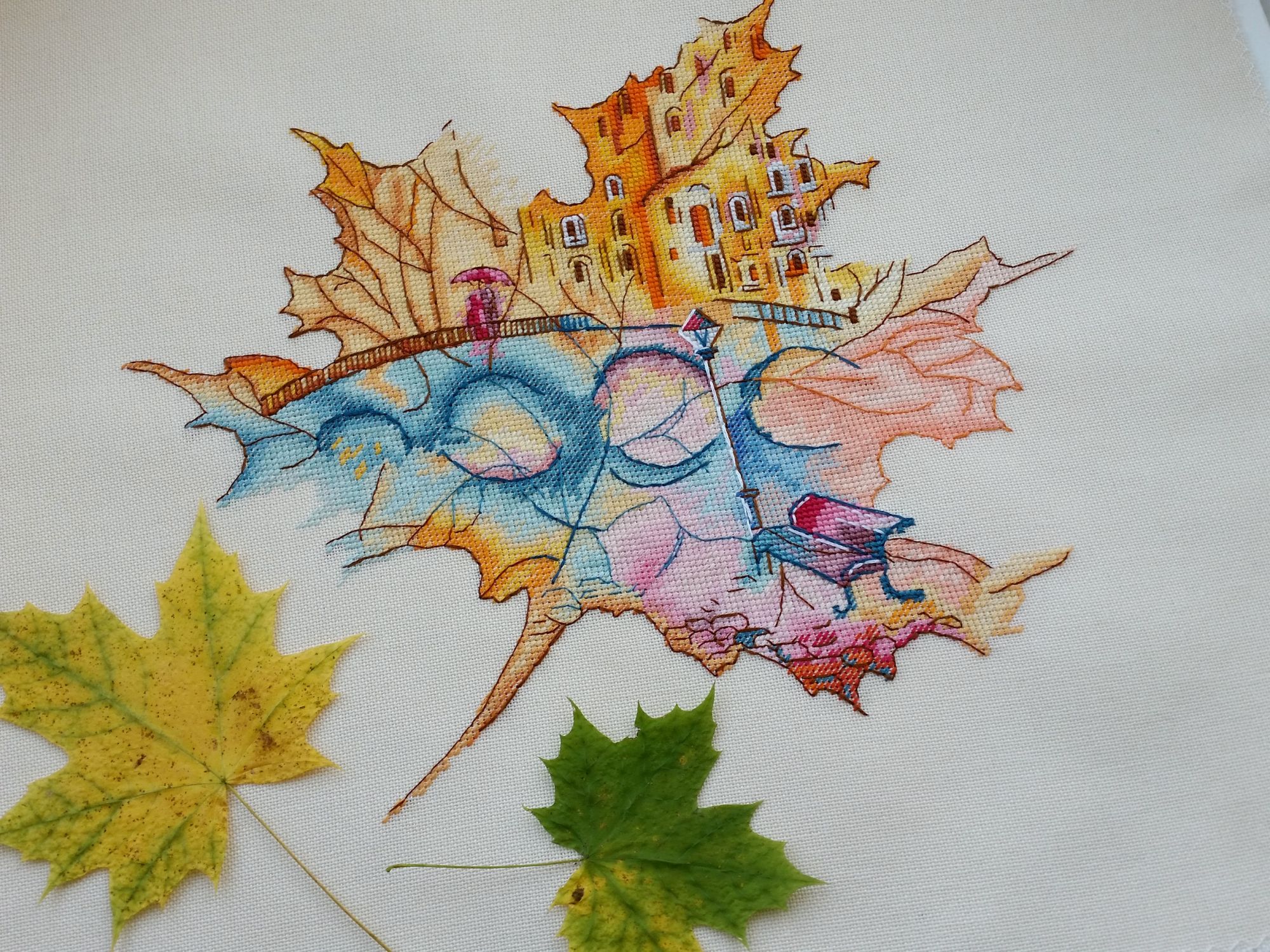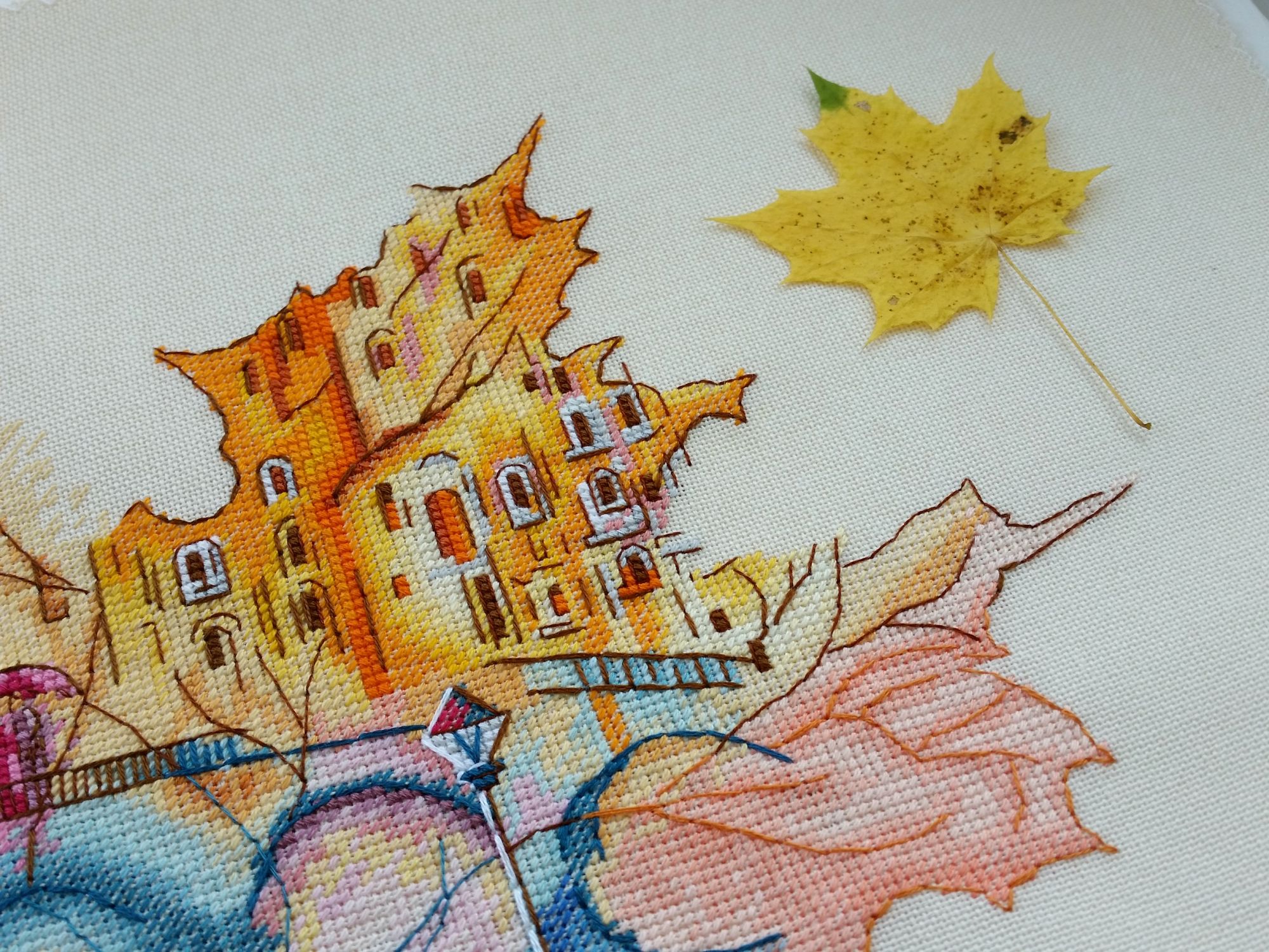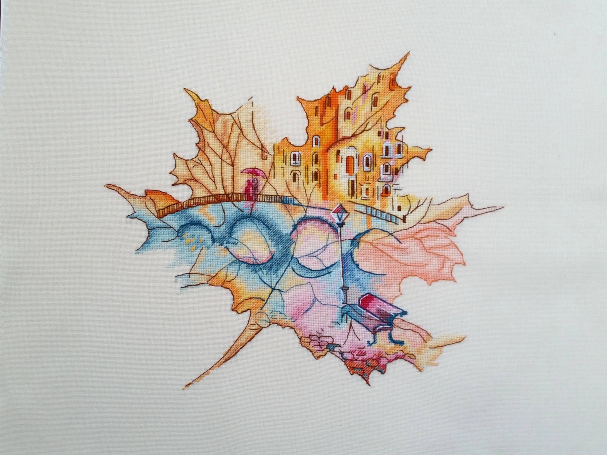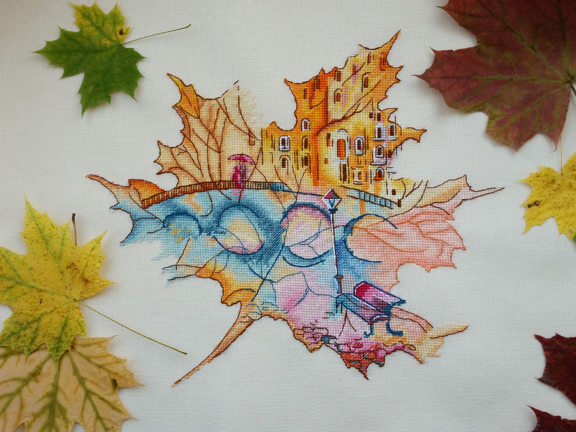 14 октября 2018 Всем здравствуйте! Вот и пришла пора вышивального отчета. Хотя уже давно осень и, казалось бы, самое время вышивать, укутавшись в плед, но погода диктует свои условия, восхищая нас изумительной синевой осеннего неба, богатым золотом листвы и теплым и ласковым ветерком, несущим такие сладостные осенние ароматы влажной опавшей листвы и травы... Осень, ты в этом году балуешь нас совершенно... Вот посмотрите, в начале недели утро было таким: А сегодня мы, наслаждаясь солнышком и осенним лесом, сняв шапки, с азартом запускали самолетики.... Вышивается сейчас мало и урывками. Но т.к. не отчитывалась я по вышивке давно, то показать есть что. Во-первых, давно уже пора позеленить гайку с Кленовым листом. Девочки, побывавшие на послеформульной встрече уже рассмотрели его в готовом виде, а сюда я все никак его не донесу. Яна Минасян, Кленовый лист - долгожданный финиш! Если вы помните, то последний раз я показывала его, когда только начала делать бэк. Бэка было немало, он был разноцветный, но при этом счетный и совсем несложный. Основной задачей было за него сесть, не думая о том, сколько же его осталось. В какой-то момент оказалось, что осталось его совсем немного и доделался он сам собой. Результат...он прекрасен! Прекрасен так же, как нынешняя осень. Не случайно я его все время солнышком называла - вот именно такое он для меня осеннее солнышко: теплое, ласковое и уютное. Больше всего меня в дизайне поразило сочетание цветов: желтый, оранжевый, синий, розовый, они все соприкасаются между собой, но так естественно перетекают один в другой, так гармонично взаимодействуют... магия, не иначе! А еще, когда в пятницу перед формулой мы гуляли с девочками по Москве, то на глаза попалась картина, живо напомнившая мне мой лист... Панна, Воздушные шары. Шары подрастают понемногу. Этим процессом я пытаюсь приманить вышиванца, ибо цвета там невероятные. Сначала к бездонной голубизне добавились закатные облака и небо заиграло жизнью, стало манить и притягивать. Чтобы этот эффект закрепить, я, отойдя от первоначального плана вышить сначала все небо, взялась за сами шары. Цветов в них немало и дело было веселое. Но при этом совсем не противное. Я в каком-то азарте добавляла цвет за цветом, желая поскорее завершить и посмотреть. Вот в самом деле, кайфовый процесс. Очень вдохновляющий и позитивный. А еще обратите внимание, как подаренный Иришкой @Дафна магнитик идеально подходит к процессу! Любуюсь каждый раз, как в руки беру! Дальше только Дивная вишня... Дивная вишня, Красное вино, ВВ-125 Этот набор я привезла с Формулы и как-то он сам прыгнул в руки, едва я оказалась дома. И хоть в принципе алкоголь, даже самый аристократичный, не моя тема в вышивке, но здесь привлекло две вещи исключительно эстетического свойства: невероятно сочные и какие-то магнетические цвета и удивительное совершенство силуэта и линий. И раз уж он так манил меня, то я решила поддаться страсти и поселить на своем холодильнике еще один рукодельный магнит. Процесс был молниеносным и очень приятным. Результат - он шикарный! Десяток крестиков и вот виноград, вот такая искусная винная этикетка, совершенно натуральное горлышко и такой настоящий бокал... Снимаю шляпу перед работой дизайнеров. Ну и "фото в интерьере" - цвета здесь немного теряются, зато размерчик хорошо виден (фото не для гаечки) Дивная вишня. П