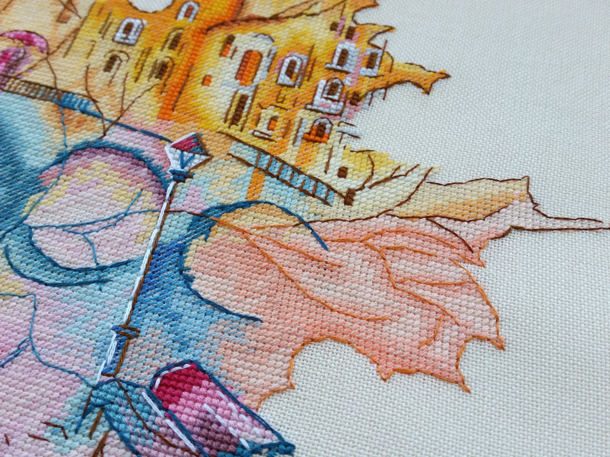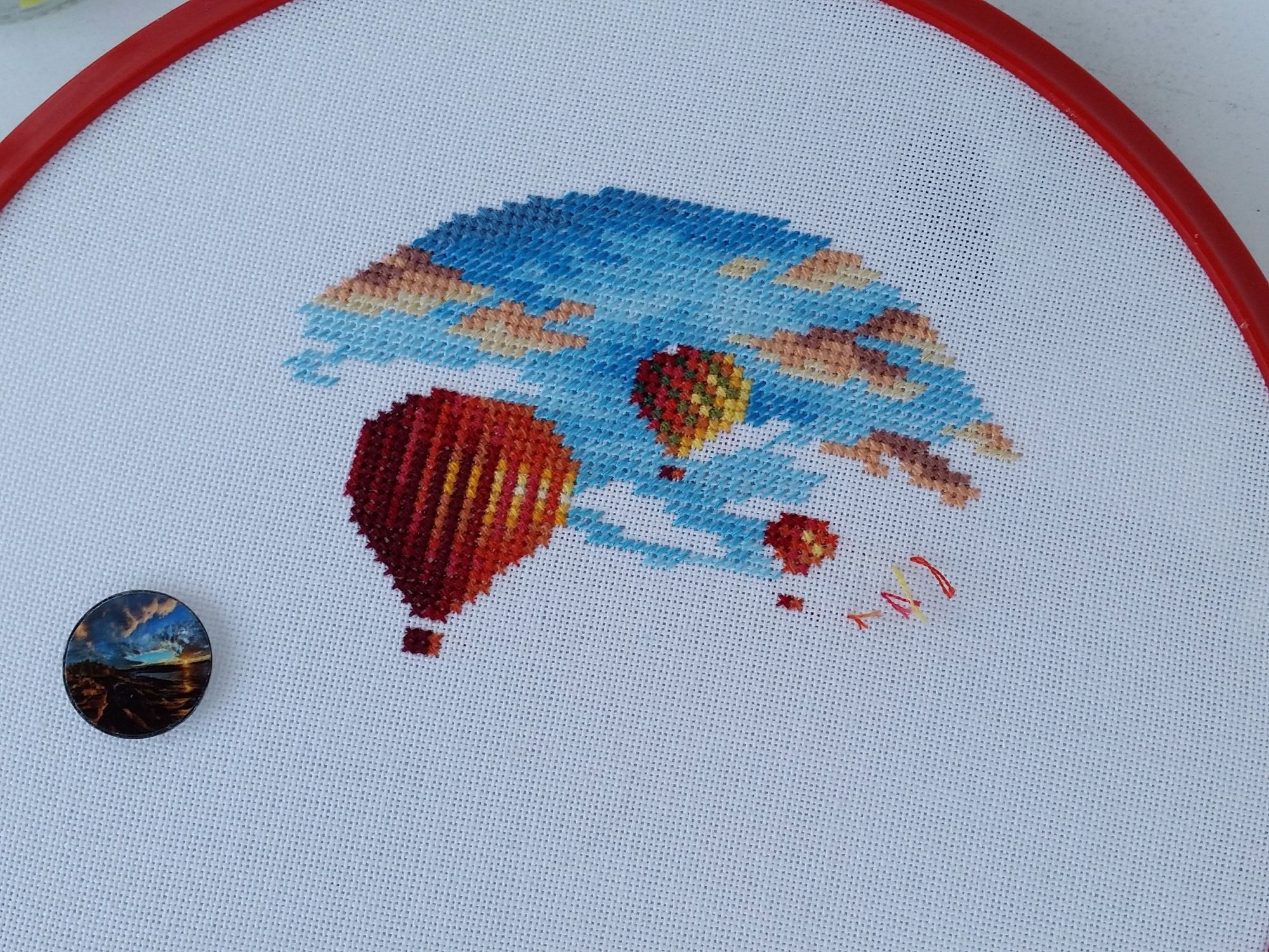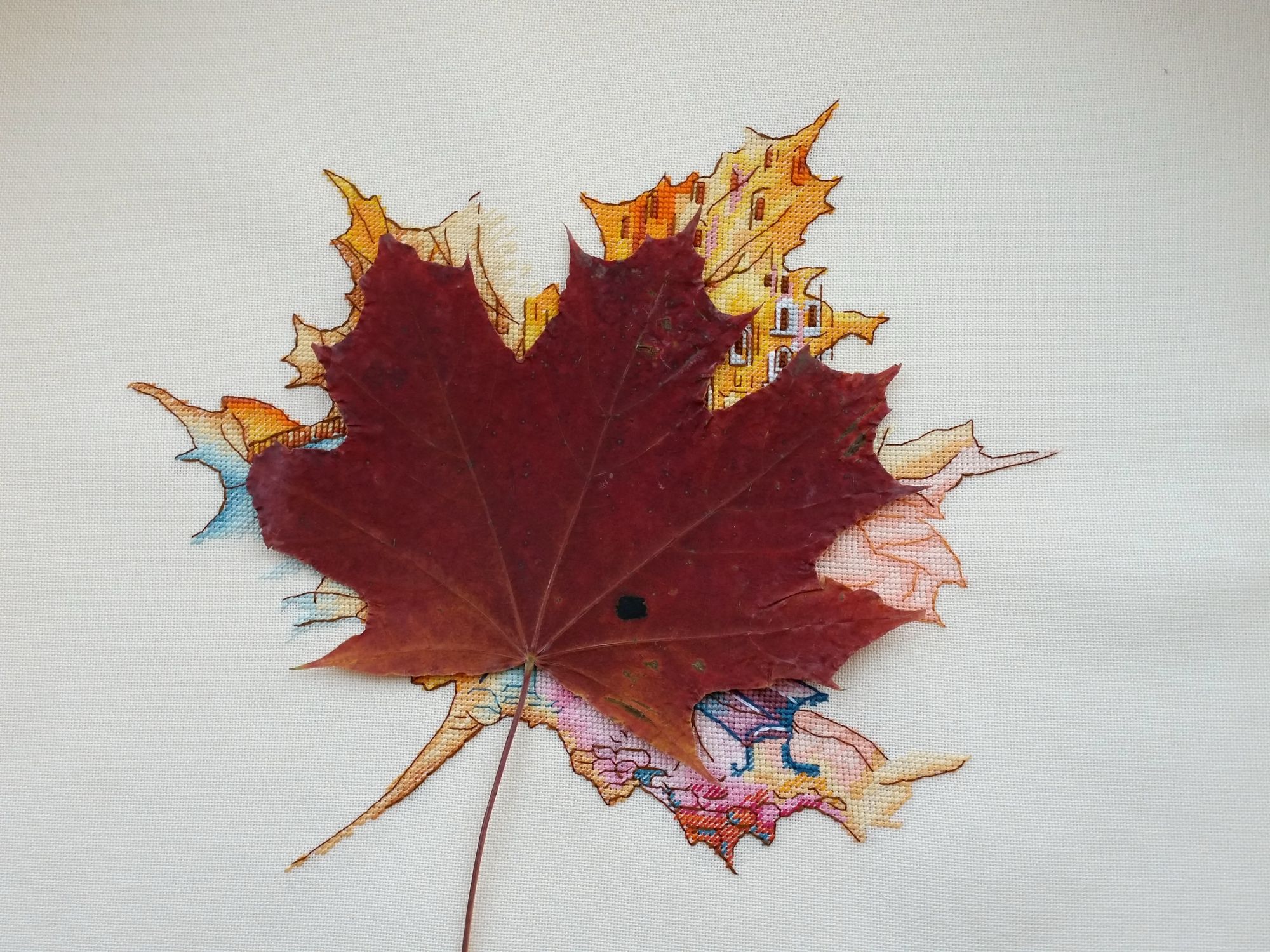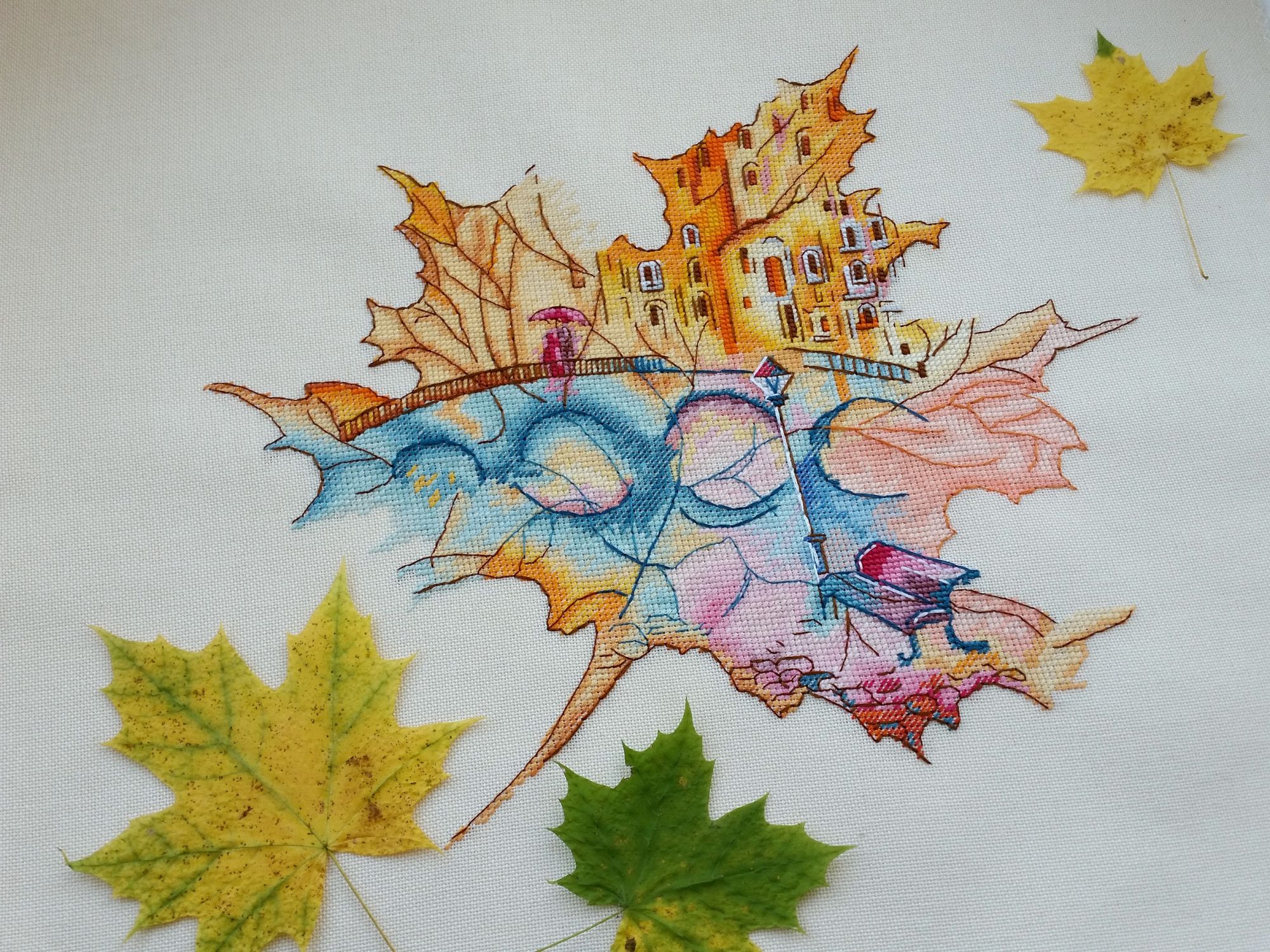 14 октября 2018 Всем здравствуйте! Вот и пришла пора вышивального отчета. Хотя уже давно осень и, казалось бы, самое время вышивать, укутавшись в плед, но погода диктует свои условия, восхищая нас изумительной синевой осеннего неба, богатым золотом листвы и теплым и ласковым ветерком, несущим такие сладостные осенние ароматы влажной опавшей листвы и травы... Осень, ты в этом году балуешь нас совершенно... Вот посмотрите, в начале недели утро было таким: А сегодня мы, наслаждаясь солнышком и осенним лесом, сняв шапки, с азартом запускали самолетики.... Вышивается сейчас мало и урывками. Но т.к. не отчитывалась я по вышивке давно, то показать есть что. Во-первых, давно уже пора позеленить гайку с Кленовым листом. Девочки, побывавшие на послеформульной встрече уже рассмотрели его в готовом виде, а сюда я все никак его не донесу. Яна Минасян, Кленовый лист - долгожданный финиш! Если вы помните, то последний раз я показывала его, когда только начала делать бэк. Бэка было немало, он был разноцветный, но при этом счетный и совсем несложный. Основной задачей было за него сесть, не думая о том, сколько же его осталось. В какой-то момент оказалось, что осталось его совсем немного и доделался он сам собой. Результат...он прекрасен! Прекрасен так же, как нынешняя осень. Не случайно я его все время солнышком называла - вот именно такое он для меня осеннее солнышко: теплое, ласковое и уютное. Больше всего меня в дизайне поразило сочетание цветов: желтый, оранжевый, синий, розовый, они все соприкасаются между собой, но так естественно перетекают один в другой, так гармонично взаимодействуют... магия, не иначе! А еще, когда в пятницу перед формулой мы гуляли с девочками по Москве, то на глаза попалась картина, живо напомнившая мне мой лист... Панна, Воздушные шары. Шары подрастают понемногу. Этим процессом я пытаюсь приманить вышиванца, ибо цвета там невероятные. Сначала к бездонной голубизне добавились закатные облака и небо заиграло жизнью, стало манить и притягивать. Чтобы этот эффект закрепить, я, отойдя от первоначального плана вышить сначала все небо, взялась за сами шары. Цветов в них немало и дело было веселое. Но при этом совсем не противное. Я в каком-то азарте добавляла цвет за цветом, желая поскорее завершить и посмотреть. Вот в самом деле, кайфовый процесс. Очень вдохновляющий и позитивный. А еще обратите внимание, как подаренный Иришкой @Дафна магнитик идеально подходит к процессу! Любуюсь каждый раз, как в руки беру! Дальше только Дивная вишня... Дивная вишня, Красное вино, ВВ-125 Этот набор я привезла с Формулы и как-то он сам прыгнул в руки, едва я оказалась дома. И хоть в принципе алкоголь, даже самый аристократичный, не моя тема в вышивке, но здесь привлекло две вещи исключительно эстетического свойства: невероятно сочные и какие-то магнетические цвета и удивительное совершенство силуэта и линий. И раз уж он так манил меня, то я решила поддаться страсти и поселить на своем холодильнике еще один рукодельный магнит. Процесс был молниеносным и очень приятным. Результат - он шикарный! Десяток крестиков и вот виноград, вот такая искусная винная этикетка, совершенно натуральное горлышко и такой настоящий бокал... Снимаю шляпу перед работой дизайнеров. Ну и "фото в интерьере" - цвета здесь немного теряются, зато размерчик хорошо виден (фото не для гаечки) Дивная вишня. П