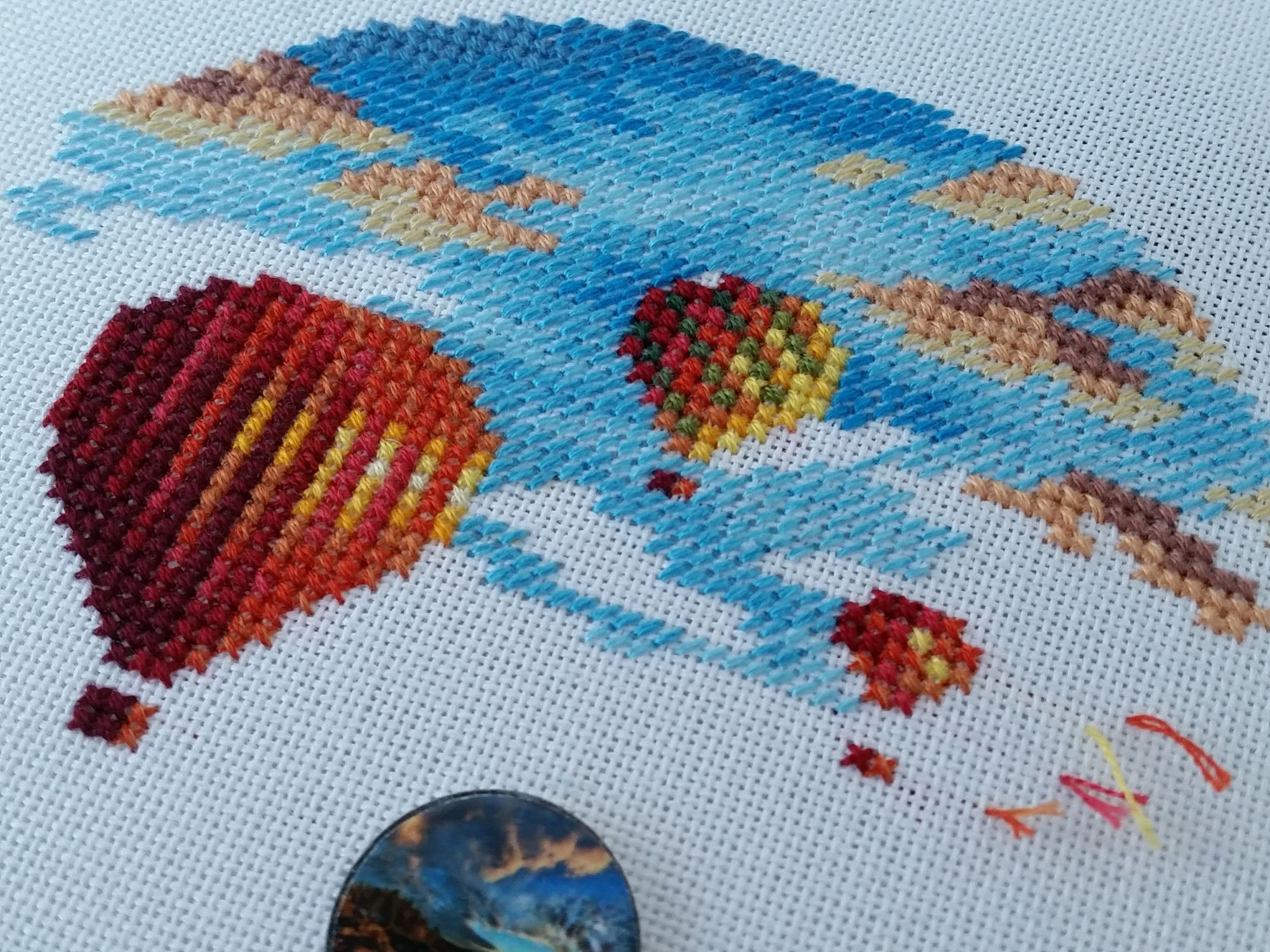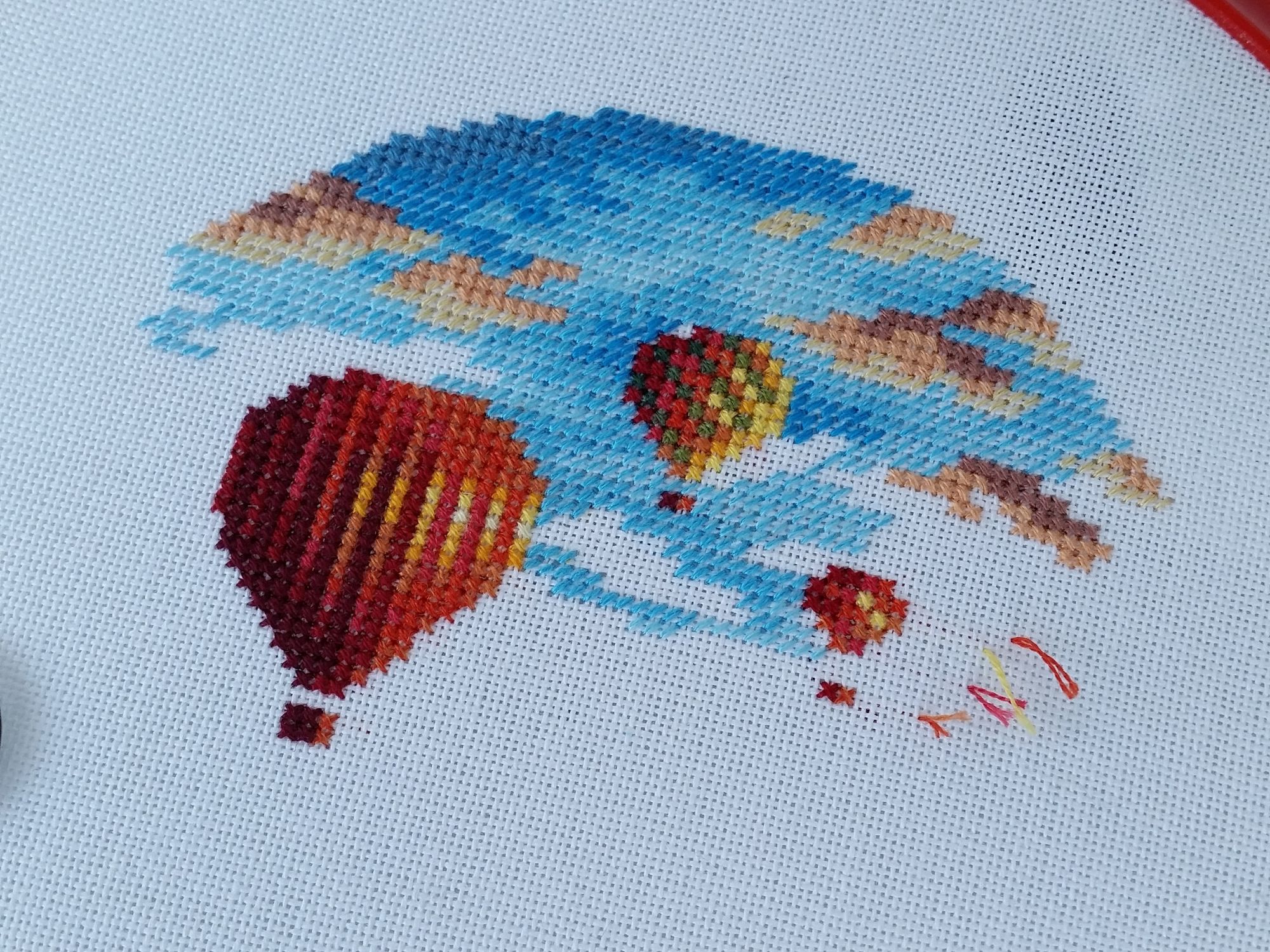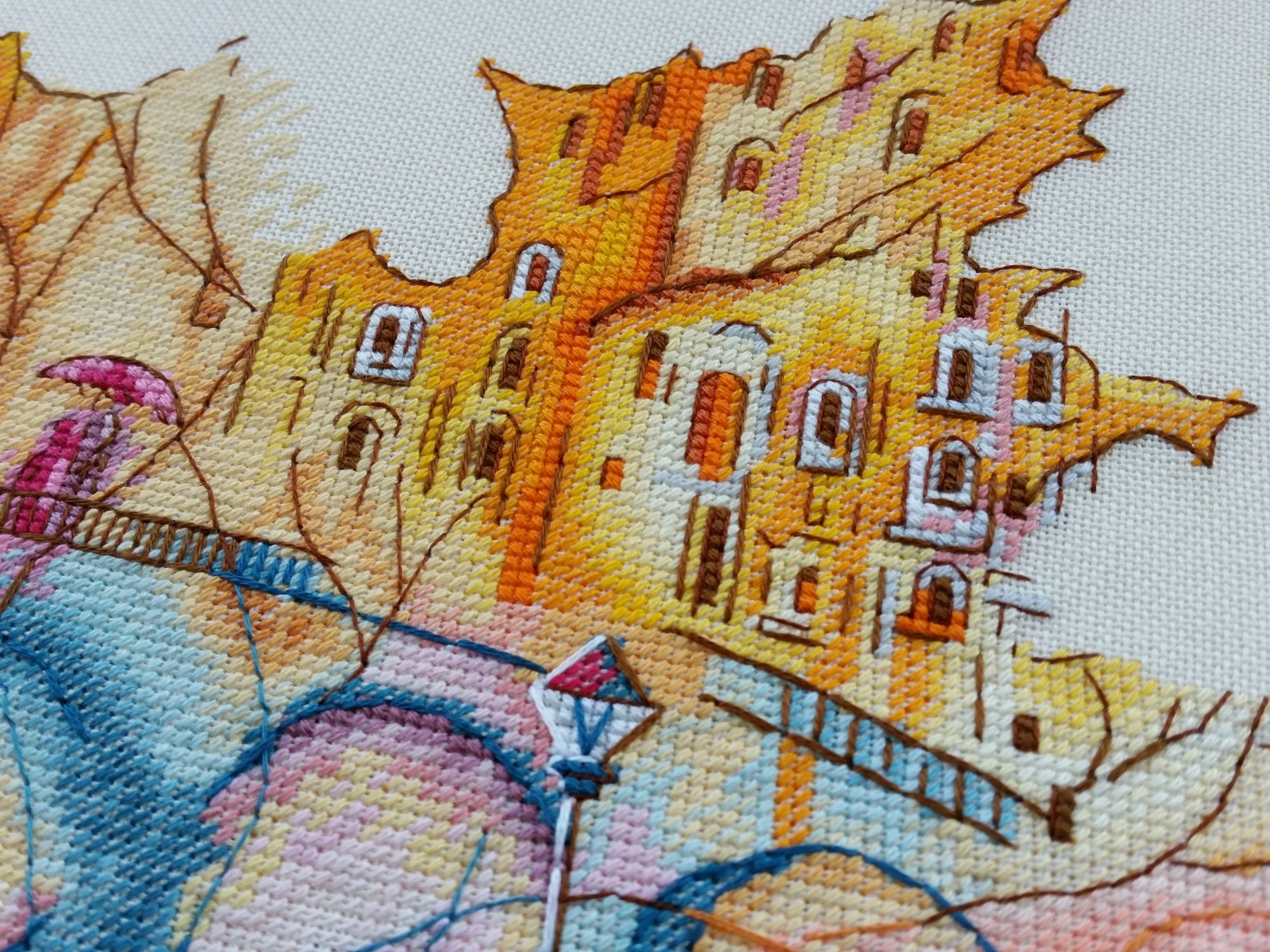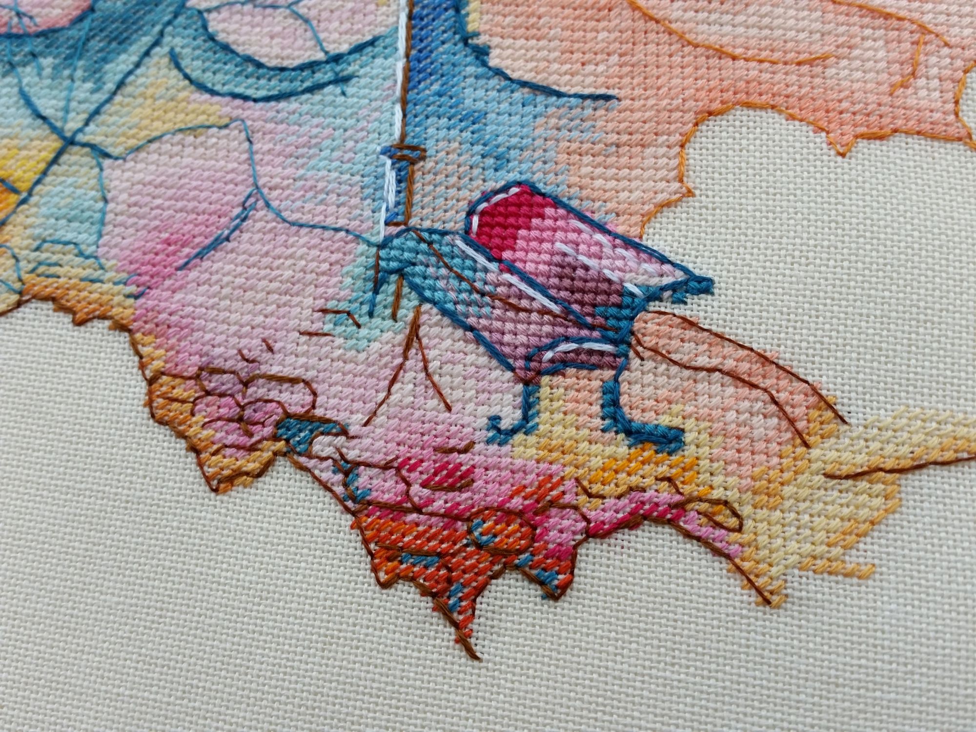14 октября 2018 Всем здравствуйте! Вот и пришла пора вышивального отчета. Хотя уже давно осень и, казалось бы, самое время вышивать, укутавшись в плед, но погода диктует свои условия, восхищая нас изумительной синевой осеннего неба, богатым золотом листвы и теплым и ласковым ветерком, несущим такие сладостные осенние ароматы влажной опавшей листвы и травы... Осень, ты в этом году балуешь нас совершенно... Вот посмотрите, в начале недели утро было таким: А сегодня мы, наслаждаясь солнышком и осенним лесом, сняв шапки, с азартом запускали самолетики.... Вышивается сейчас мало и урывками. Но т.к. не отчитывалась я по вышивке давно, то показать есть что. Во-первых, давно уже пора позеленить гайку с Кленовым листом. Девочки, побывавшие на послеформульной встрече уже рассмотрели его в готовом виде, а сюда я все никак его не донесу. Яна Минасян, Кленовый лист - долгожданный финиш! Если вы помните, то последний раз я показывала его, когда только начала делать бэк. Бэка было немало, он был разноцветный, но при этом счетный и совсем несложный. Основной задачей было за него сесть, не думая о том, сколько же его осталось. В какой-то момент оказалось, что осталось его совсем немного и доделался он сам собой. Результат...он прекрасен! Прекрасен так же, как нынешняя осень. Не случайно я его все время солнышком называла - вот именно такое он для меня осеннее солнышко: теплое, ласковое и уютное. Больше всего меня в дизайне поразило сочетание цветов: желтый, оранжевый, синий, розовый, они все соприкасаются между собой, но так естественно перетекают один в другой, так гармонично взаимодействуют... магия, не иначе! А еще, когда в пятницу перед формулой мы гуляли с девочками по Москве, то на глаза попалась картина, живо напомнившая мне мой лист... Панна, Воздушные шары. Шары подрастают понемногу. Этим процессом я пытаюсь приманить вышиванца, ибо цвета там невероятные. Сначала к бездонной голубизне добавились закатные облака и небо заиграло жизнью, стало манить и притягивать. Чтобы этот эффект закрепить, я, отойдя от первоначального плана вышить сначала все небо, взялась за сами шары. Цветов в них немало и дело было веселое. Но при этом совсем не противное. Я в каком-то азарте добавляла цвет за цветом, желая поскорее завершить и посмотреть. Вот в самом деле, кайфовый процесс. Очень вдохновляющий и позитивный. А еще обратите внимание, как подаренный Иришкой @Дафна магнитик идеально подходит к процессу! Любуюсь каждый раз, как в руки беру! Дальше только Дивная вишня... Дивная вишня, Красное вино, ВВ-125 Этот набор я привезла с Формулы и как-то он сам прыгнул в руки, едва я оказалась дома. И хоть в принципе алкоголь, даже самый аристократичный, не моя тема в вышивке, но здесь привлекло две вещи исключительно эстетического свойства: невероятно сочные и какие-то магнетические цвета и удивительное совершенство силуэта и линий. И раз уж он так манил меня, то я решила поддаться страсти и поселить на своем холодильнике еще один рукодельный магнит. Процесс был молниеносным и очень приятным. Результат - он шикарный! Десяток крестиков и вот виноград, вот такая искусная винная этикетка, совершенно натуральное горлышко и такой настоящий бокал... Снимаю шляпу перед работой дизайнеров. Ну и "фото в интерьере" - цвета здесь немного теряются, зато размерчик хорошо виден (фото не для гаечки) Дивная вишня. П
