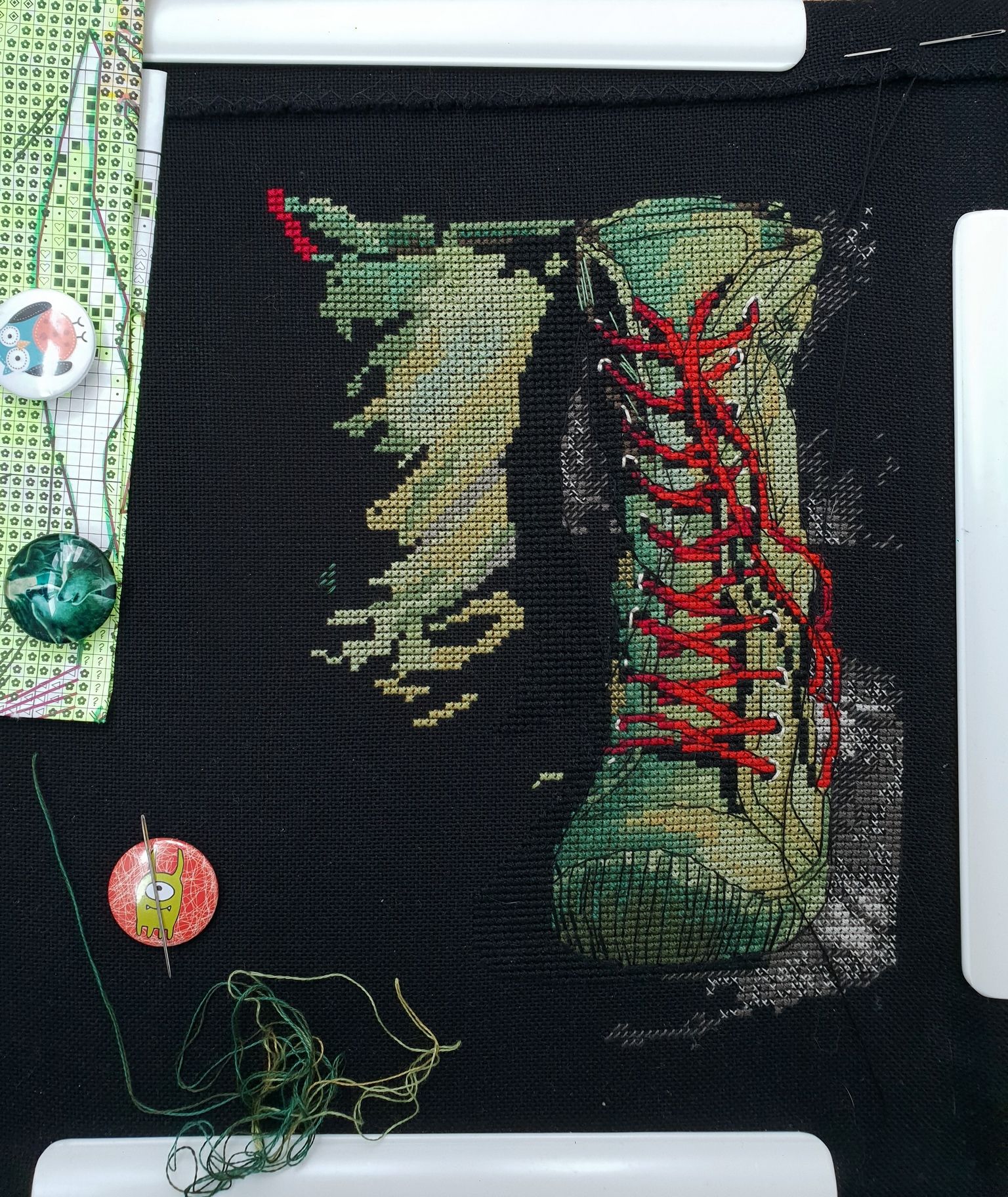 21 октября 2018 Всем здравствуйте! Сегодня к нам пришла настоящая осень, та что примерно соответствует календарю. На улице стало холодно, а под пледом уютно. Вот он, самый вышивальный сезон начинается. А тем временем я уже успела поболеть. Всю неделю. Так грустно болеть, когда на улице солнышко. И даже повышивать это нисколько не помогает, вот в чем засада. Так что отчет сегодня меньше, чем хотелось бы, но пора возвращаться к привычному графику. И да, сегодня без Дивной вишни! Панна. Шары. Добавился кусочек неба вокруг шаров. По плану было дойти до горизонта, но увы Цвета невероятные. Панне респект за разработку такого уровня и настроения. было: и стало: Ботинки, РТО. Я тут обещала кое-кому за них взяться. Взялась. Пока лежала и болела. И плохая это была идея. Ошиблась два раза в одном и том же месте, ошиблась так, что пороть было обязательно (хотя я в этом смысле далеко не перфекционист). И только с третьего раза вышила правильно. Так что второе голенище подросло, но еще пока не оформилось окончательно. Каждый раз как беру в руки, удивляюсь, почему у меня этот процесс больше лежит, чем шьется. Он действительно кайфовый. И в крестиковой части не особенно сложный. Было: и стало: Идем дальше. В начале недели забрала из ПВЗ заказ от Совиного леса. Еще на выставке я решила, что обязательно разживусь их наборчиком. Так что практически сразу после, я сделала заказ на оф.сайте. Но в послеформульной суматохе его забыли отправить. И все же ругать их не буду, ошибку без вопросов признали, искренне извинились и предложили в качестве моральной компенсации любую схему на выбор. Так что вместо одного их дизайна у меня оказалось сразу два, оба очень желанные. Так что хомяк доволен чрезвычайно). Набор распотрошила, все рассмотрела, все очень красивое, но рассказывать и показывать буду позже. Потому что... ... А потому что в руки прыгнул совсем другой примитив. Если честно, то странно, что только сейчас Renato Parolin, Fleurs et Fruits 10, hiver (Цветы и фрукты 10, Зима) 95*95 крестиков, 7 оттенков ниток, белоснежный Эдинбург,36. Будет: есть сейчас: Так прикольно шьется. Чувствую, что это будет достойным продолжением моего школьного увлечения по разрисовыванию полей тетрадок разными орнаментами Кстати на льне 36го каунта шью впервые. Не сказать, что сложно, но понимаю, что это, вероятно, мой предел мелкости. Глаза напрягаются ощутимо. На сегодня все. На радостях, что болезнь отступает и дает возможность порукоделить, пойду новый процесс начну. Еле сдержалась до отчета. Иначе бы не факт, что до него руки дошли. Всем пока и уютных рукодельных вечеров! Главное, не болейте! PrimaN, Путешественница, Marteire и 41 других сказали спасибо Поделиться сообщением Ссылка на сообщение