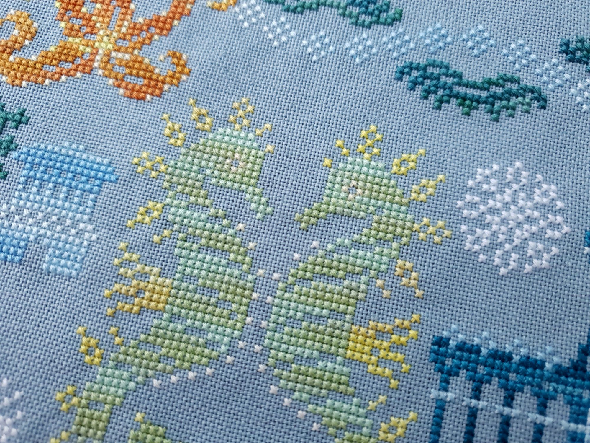 20 января 2019 Доброй ночи! Кое-как я все же начала разгребать завалы фотографий с вышивкой и не только. Новогодние каникулы прошли совершенно незаметно, а за ними пробежали и еще почти две недели. И вот мой первый отчет 2019 года. В нем будет завершение, продолжения и начинание, - т.е. все составляющие жизни приличной вышивальщицы. Хочется поверить в примету и надеяться, что и вышивальный год будет насыщен всеми этими событиями. Итак, начну по порядку. 1. Совиный лес. Атлантида. Морские коньки - финиш! Первый финиш этого года для меня любопытен и вызвал целую гамму эмоций. Нитки - да...ну неплохие нитки, но и не лучшие. Ручное крашение? Ну..имеет место быть и интересно, но не для любого процесса (флажки я решила шить обычными). Результат - симпатичный. Очень! Процесс напоминал аппликацию. Или кройку. Когда ты элемент за элементом размещаешь на канве/бумаге/ткани, чтобы собрать гармоничную картинку и уместиться в заданную геометрическую фигуру. Мне нравится и это поэлементное вырастание рисунка, и геометрия, присутствующая в большинстве фрагментов, и то, как сделаны сами эти фрагменты. Морская звезда в этом кусочке словно венец или ключ, собирающий композицию воедино. А вот коньки неоднозначны. Быть может я бы все же поярче цвет взяла. Хотя вживую они и смотрятся лучше, чем на фото. А еще эти коньки в процессе их отшива очень долго были похожи на лысых гуманоидов, так что процесс еще и веселым был Вывод по новому производителю - однозначное да! При этом вопрос ниток буду каждый раз решать индивидуально. ПС. Их же новогодние флажки начала. Нравится, но показывать пока нечего. На следующей неделе, если все сложится, будет подробный доклад на эту тему в соответствующей теме. 2.Милл Хилл, Краб. Вышиваю от случая к случаю и с удивлением обнаружила, что с последнего показа прибавилось прилично. А на фотографии даже клешни краба разглядела. Это вдохновляет. Тем более нитки здесь такие классные, что уже просто работа с ними лучше любого релаксанта. Да еще и крестики на бумаге сами собой красивыми выходят - все же у МХ однозначно есть свои плюсы было: и стало: 3.РТО, Светлая зима. Шла речь про то, чтобы этот процесс в январе вышивать...ну пока так и есть. Эмоции...вот даже и не знаю. Красиво, как и всегда у РТО. Но что-то много премудростей что ли на такой размер. А может просто погода за окном хмурая последнее время и не самая яркая гамма дизайна не вызывает радужных эмоций, отсюда и мое брюзжание... Ну то, что не самая простая работа - это точно. Хотя бы потому что в ней много невышиваемого пространства среди вышиваемого и стандартного отдыха "на заполнение" или "в этом ряду до конца" нет, все приходится считать. Но хорошо. Жду завершения с нетерпением. 4. Евдокия Николаева (punochka), Ягоды и птицы - новый процесс! Однажды в чат хорошая девочка Лена @Rezavy принесла весть про доселе неизвестного мне дизайнера, который работает в стиле примитива и имеет в своем портфолио немало чрезвычайно интересных и самобытных схем. Естественно, последствия не заставили себя ждать. Ася уже завершила один процесс от Евдокии, а мне замечательную схему Снегурочка Лена подарила перед самым НГ (Лена, еще раз спасибо!!). Я честно дотерпела до конца года, стараясь подтянуть кое-какие хвосты, ну а 1го января с наслаждением сделала первые крестики. Ну а потом не первые, а потом уже и.... ну в общем сморите: Это то, ч