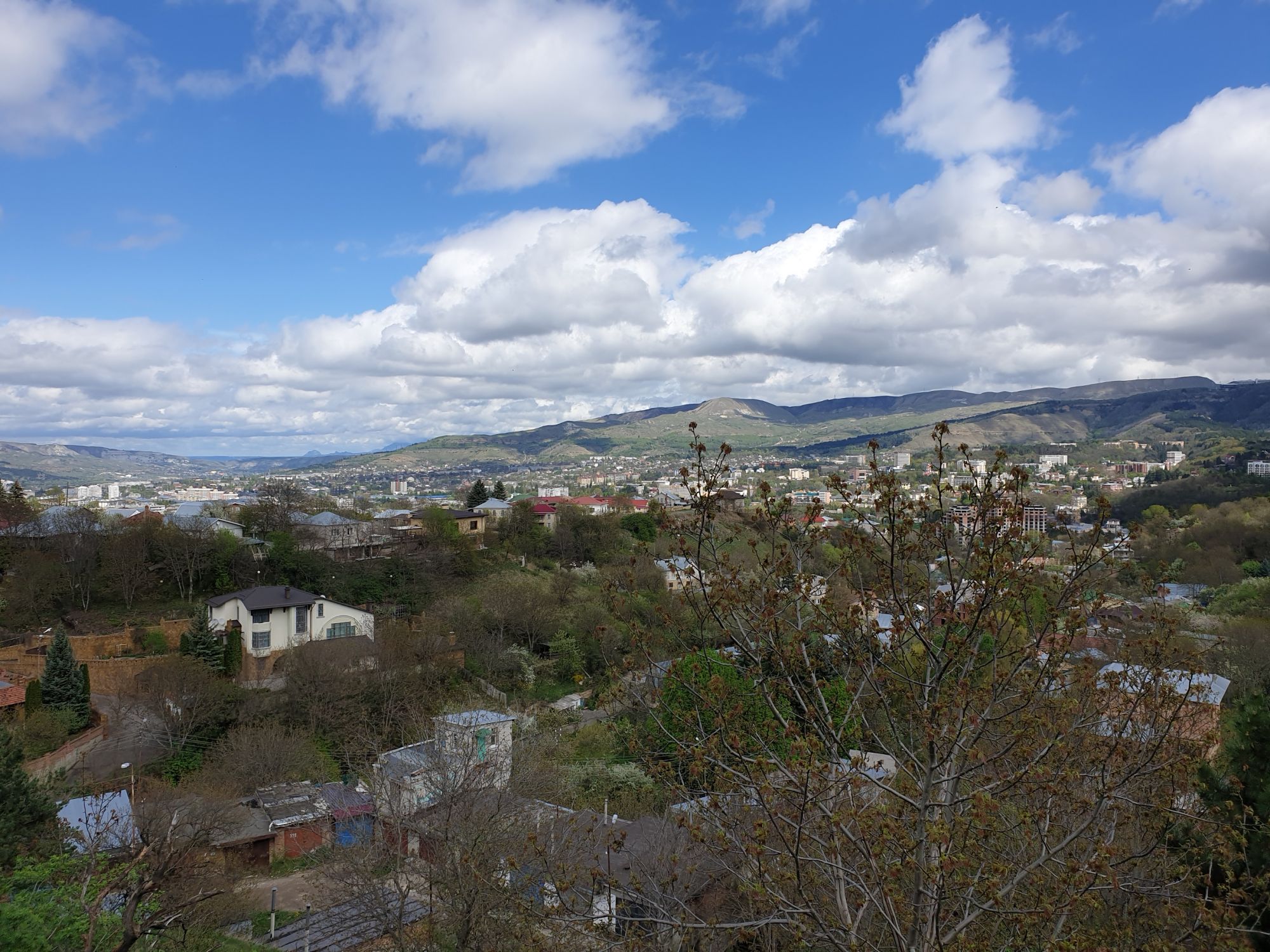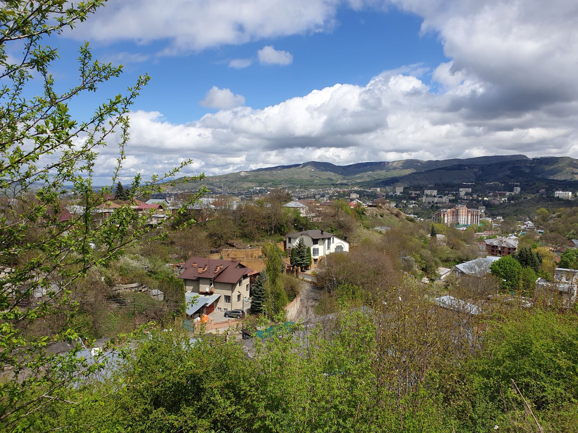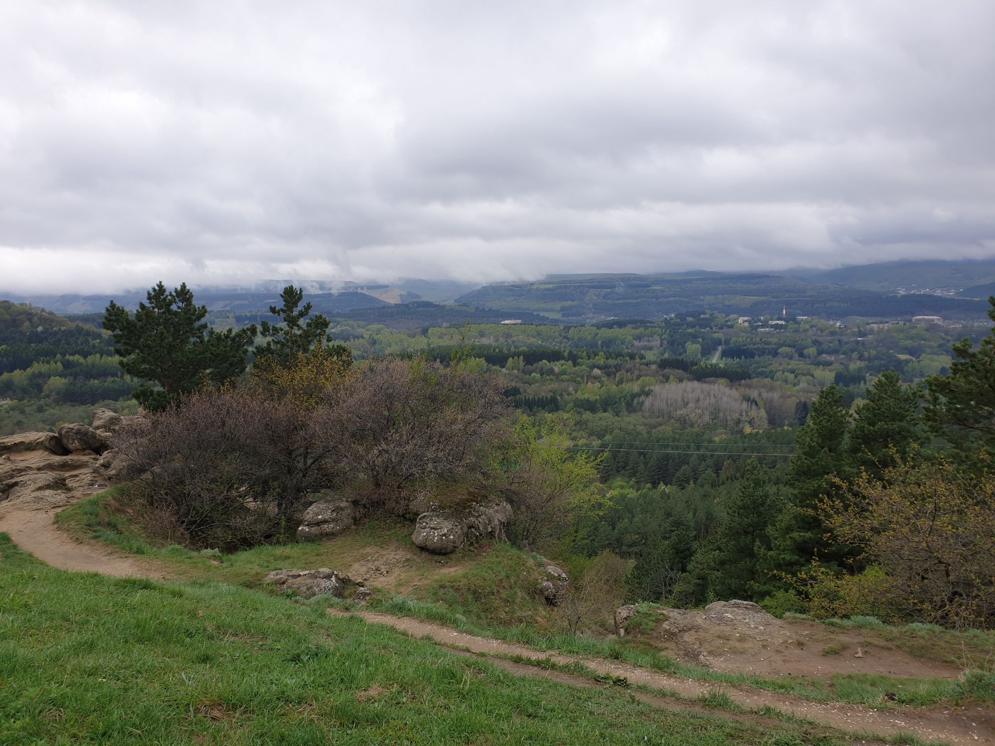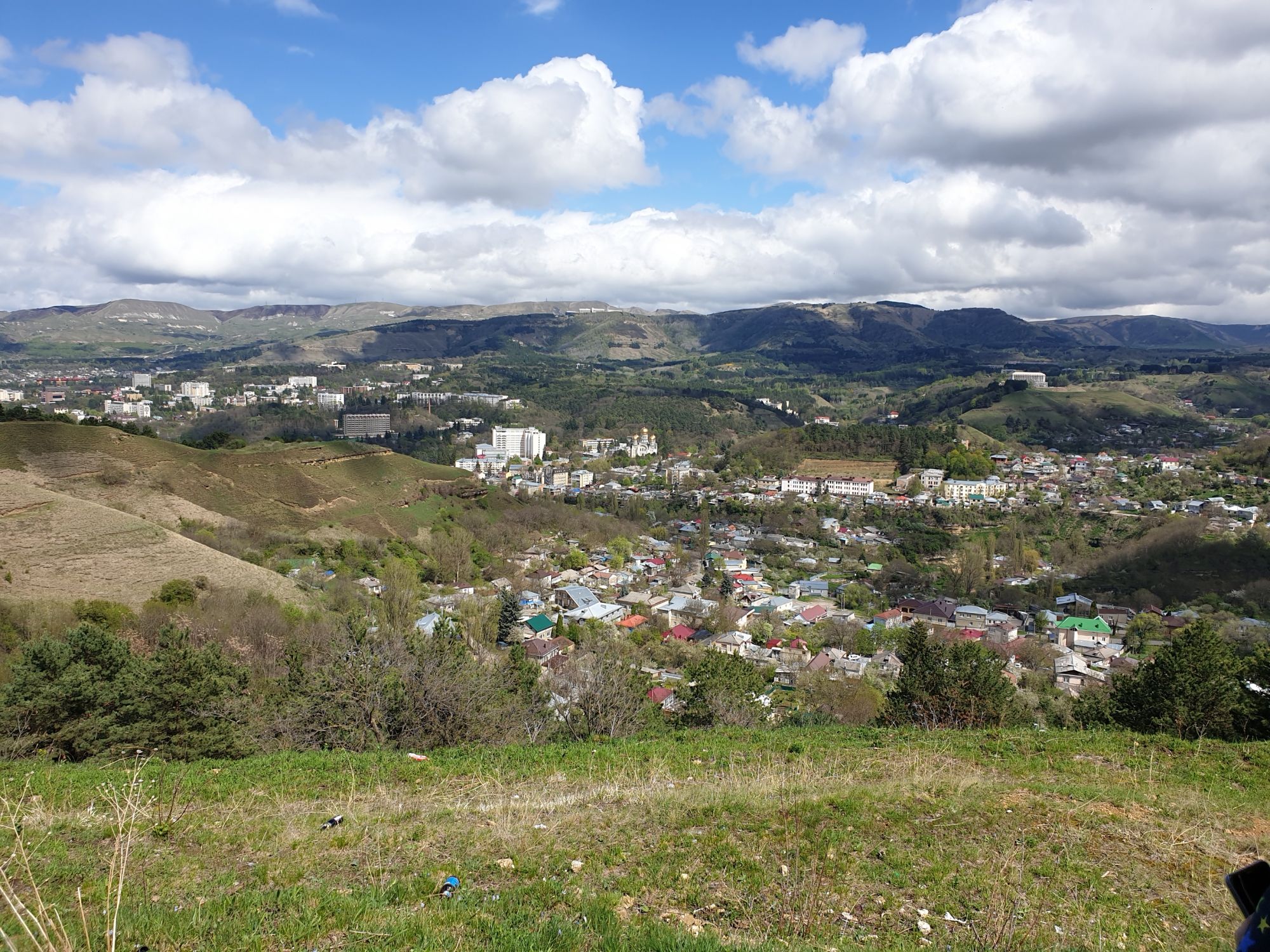 27 мая 2019 Вообще говоря, глядя на прогноз погоды перед поездкой, меня посещало некоторое смутное беспокойство. Большинство дней +9, +12, +14 градусов и дождь. Но во-первых, я помнила, что климат там намного мягче и температуры ощущаются совсем иначе, а во-вторых, это же долгожданный Кисловодск! Ну просто вместо крема от загара я положила в чемодан теплой одежды и зонты.. Второе моя печаль была связана с тем, что я была уверена, что пропущу большую часть цветения вишни, яблони, весенних цветов.... ведь там же юг, должно было все закончиться, а у нас только-только начинало и к возвращению пик был бы явно пройден. Каково же было мое удивление, когда я попала в настоящий сад из цветущих деревьев и трав. Оказалось, что там из-за особенностей высоты и климата все цветет примерно в те же сроки, что и у нас. Причем на разных склонах чуть сдвинуто по времени. Поэтому насладиться я смогла по полной программе. И если из прошлой поездки я привезла в качестве воспоминаний запах цветущей липы, то сейчас.... яблоня, вишня, черемуха и еще куча не особенно знакомых мне ароматов, но таких весенних и дарящих наслаждение. А под конец еще и сирень с каштанами зацвели. Цветочную подборку я показывала вот здесь, в отчете с места действия, так сказать Ну а что касается погоды... все действительно оказалось не так страшно. Благодаря тому, что город защищен со всех сторон горами и ветра почти нет, температуры воспринимаются по-другому. Гулять одно удовольствие. И даже плюсы есть: жарой не прибивает, народу меньше, тучи создают весьма причудливые картины (то будто горы дымятся, то неведомая облачная лапа протянулась к горе за чем-то явно принадлежащем ей, то вдруг посветлевшее вдали небо делит открывающиеся просторы на свет и тьму ), реки более полноводны и завораживающе бурлят средь камней, а плачущий водопад на туристической тропе очень даже плакал, в отличие от нашей летней поездки. В один из дней прогноз погоды был примерно тем же, но природа решила порадовать нас солнцем пораньше. И в итоге, начавшись как прогулка по городу к той самой Армянской церкви из предыдущего сообщения, день стал весьма запоминающимся, т.к. ноги вынесли нас прямиком к Березовскому ущелью. Ущелье это не совсем характерно для окрестностей Кисловодска. Большая часть их здесь относительно широки, а это узкое и с отвесными склонами. Если вам на фото ниже где-то покажется, что стена искусственная, то это не так. Всё самые настоящие горные породы и обрывы, над которыми поработали лишь ветер и вода. На пути к ущелью: И вот мы уже здесь. Броды, перекаты, отвесные стены гор, небольшие полянки, "горные коровы" (как выяснилось далее, самые обычные обитатели всех местных ущелий), а здесь еще и скалолазы (две или три скальных стены очищены и пробиты маршруты) и... внимание!.. канатоходцы! Да-да, здесь натянуты канаты в одной из боковых расщелин, где тренируется немало народу (есть на паре фоток ниже). А самые продвинутые пытаются перейти ущелье поперек у скалы, называемой Наковальня (вот та, огромная и похожая на замок). Высота огромная. Смотреть на это и страшно и крайне интересно одновременно Это было впечатляющая и незабываемая прогулка. Там бы еще идти и идти, но уж больно поздно мы туда забрели. Солнце стало клониться к горизонту и нам пришлось повернуть обратно. А на следующий день нас ждало весьма ожидаемое нами событие -