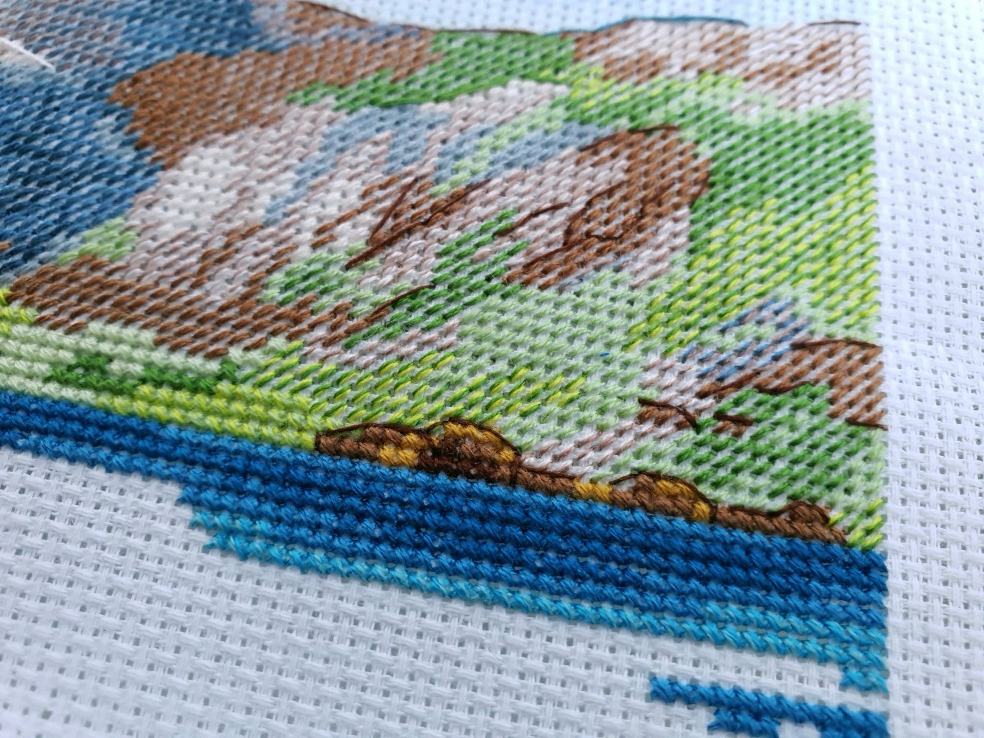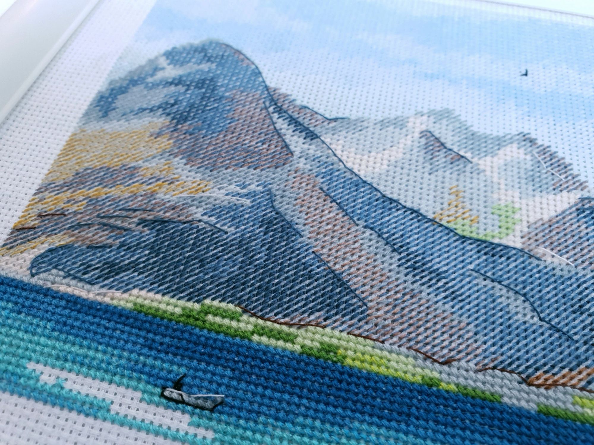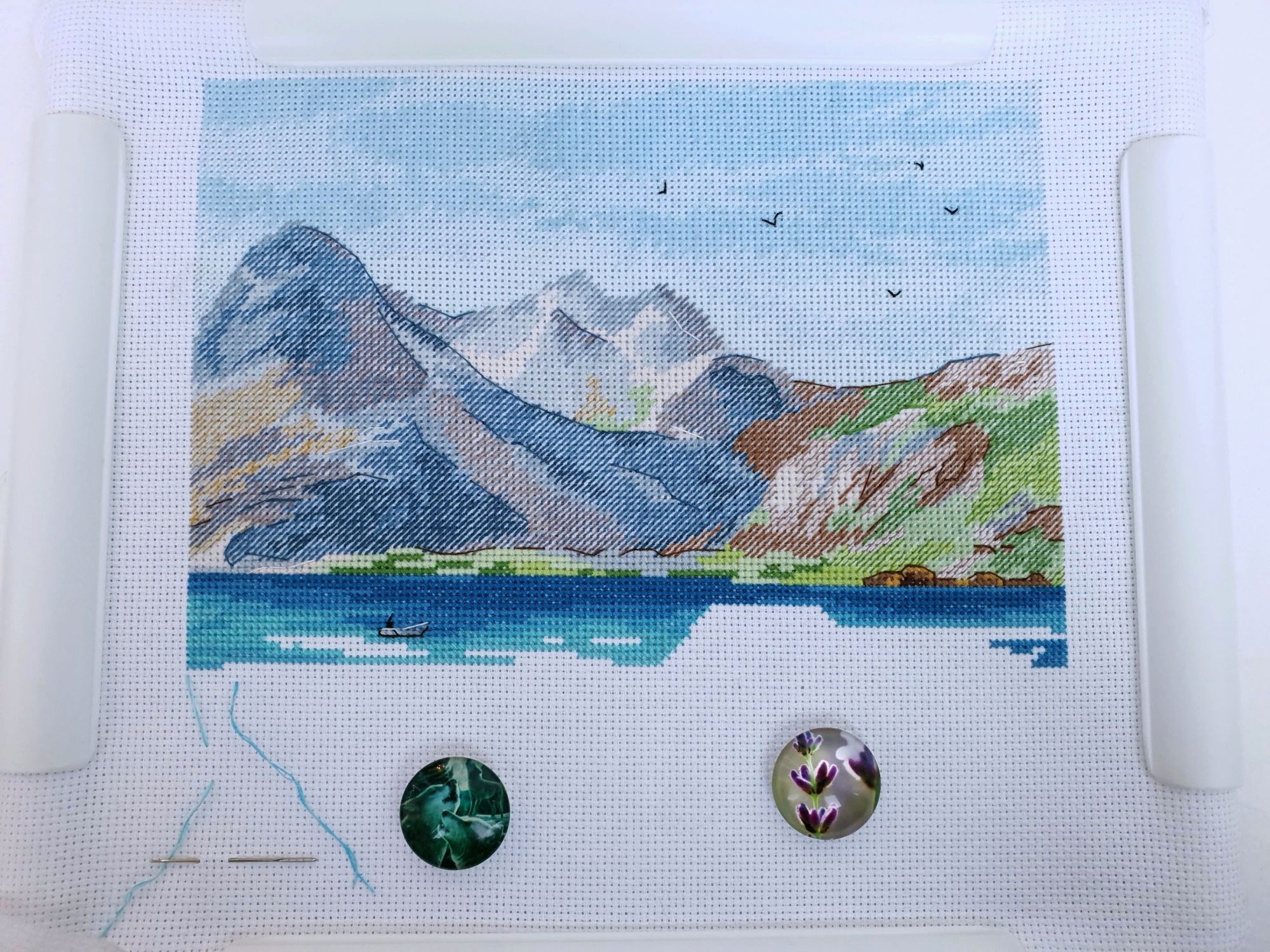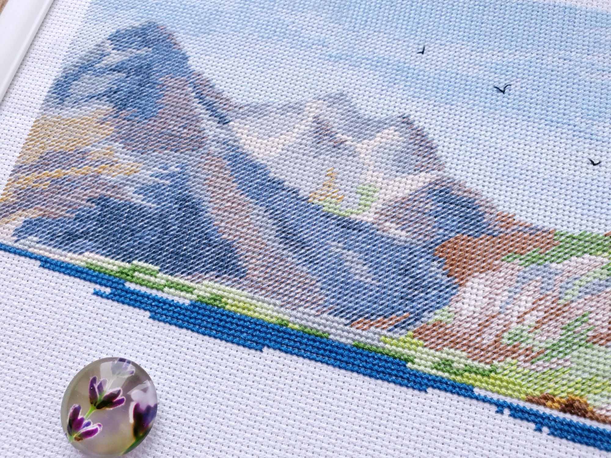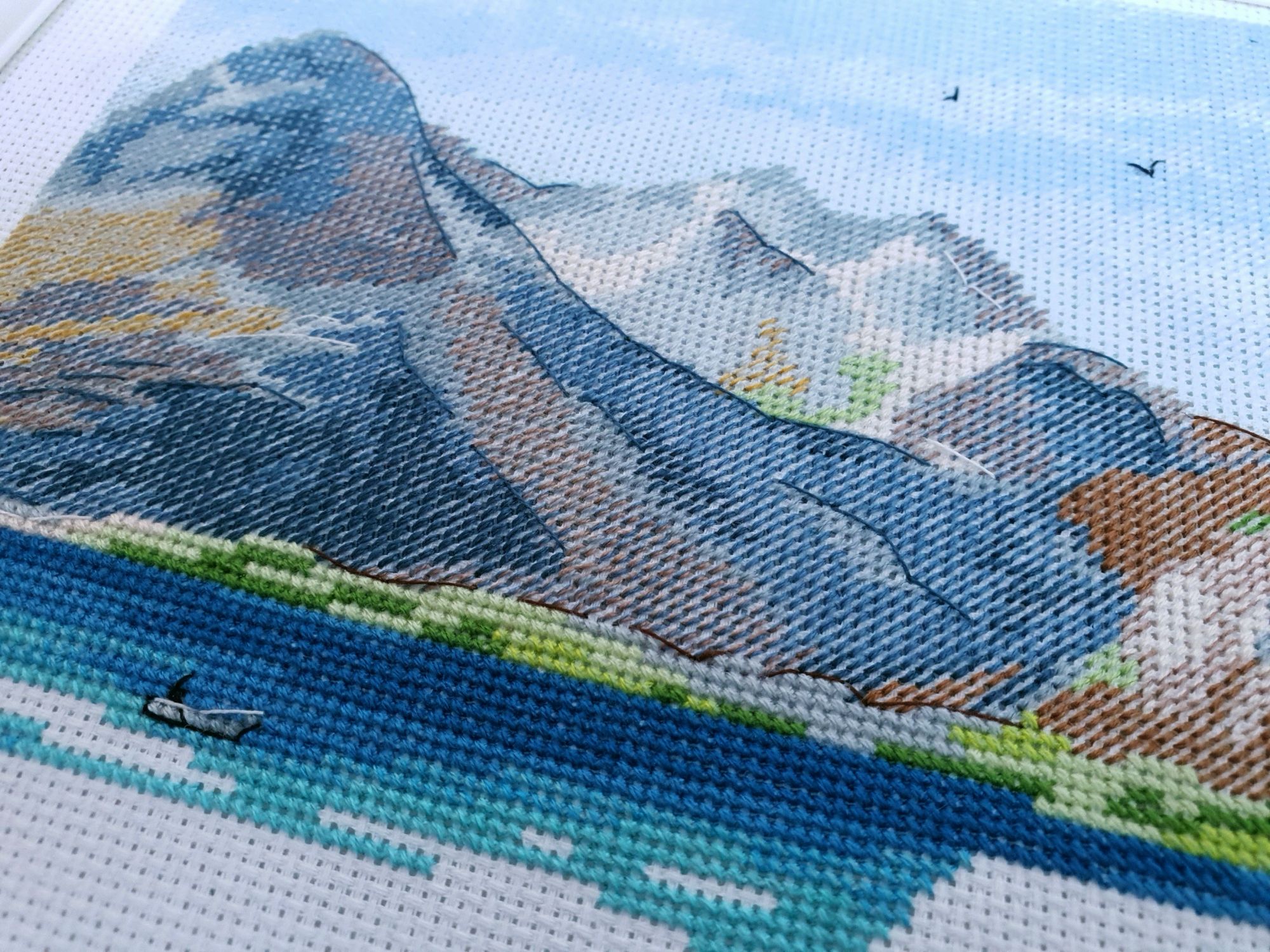 10 января 2020 Вот и пролетели каникулы как один миг. Кажется, что только вчера мы наряжали елку, а уже середина января. И отчет сегодня намечается длинным, потому как и про каникулы, и про обещания, и даже про продолжения.... Итак, здравствуйте! Первый отчет 2020го! Каникулы наши оказались немного ленивыми, т.к. Лешка с садовского утренника 27го числа принес какую-то не особо приятную заразу и так или иначе мы все это время были не очень здоровы. То по очереди, то вместе, то сильнее, то слабее, но все же две вылазки в поисках снега совершить смогли. Новый год же, как же без снега?! Вылазка первая. 30го декабря мы отправились на восток, целью нашей был Владимир. И если сначала снега не наблюдалось (зато наблюдалось большое количество красивых видов, ради которых я, собственно, и ехала), то потом и снег пошел. Набегались, накатались, новогоднего настроения поймали и 31го утром укатили с ним в обнимку домой Вторую вылазку мы предприняли уже ближе к концу каникул и сгоняли на пару дней к маме в гости, чуть больше 600 км на восток (или даже ю-в) и вот он, снеееег! Большинство фотографий сделано по пути до места назначения. А уж какую волшебную обратную дорогу подарила нам природа при участии яндекс-навигатора, что рекомендовал нам свернуть с основной трассы во избежании заторов! Чудный розовый закат, причудливо раскрасивший облака, волшебные все в хрустале деревья, белые поля и заснеженный лес. Вот оно, главное сокровище, привозимое из путешествий: эти волшебные картины, чудесные мгновения, которые никогда больше не повторятся, и второе,третье, .. седьмое дыхание и жажда жизни... и новых путешествий Жаль только, что чувствовала я себя неважно, а потому останавливаться для фотографирования не стали. Так что верьте на слово Про вышивку. Обещала я вам фееричный отчет с начинаниями. Но кто ж мог предположить, что случатся они, Лофотены овновские?! Они не только приковали к себе мое внимание, но и чудесным образом спровоцировали прибавления в нескольких других ранее начатых процессах. Поэтому сначала о них. Овен, Лофотенские острова - продолжение Они... они порой бесили, потому что кировские нитки, знаменитые своими катышками вкупе с грязноватыми оттенками гор создавали ощущение неопрятности вышитого полотна. К счастью, горы закончились вовремя, не успев отвратить меня от процесса. А дальше очень красивые и чистые оттенки воды, где эти самые катышки уже так не раздражают. А вчера я еще и горы отбэкала. Отбекала и закрыла схемой, чтоб дальше воду шить. А потом муж попросил показать, что получается. Я сняла схему, отодвинула от глаз и... прослезилась! Настолько сильное впечатление производит вот эта вот половинка работы! Она создана для меня, мне захотелось непременно и сейчас же оказаться там, на склонах вон тех гор, у кромки воды, постоять вон на тех камушках.... Муж же, немного помолчав, сказал: "Вот это точно надо будет оформить!" И через мгновение: "и поехать туда..." Не знаю уж туда или не туда, но в горы очень хочется. И пока не появился красный домик, по которому так легко узнаются норвежские фьорды, это вообще могут быть любые горы. Точнее я то знаю, куда я очень хочу в этом году, но пока буду молчать и мечтать планировать .... и с бэком: Инна Пешкова, Гиацинт - продолжение Почему-то подумалось мне, что совсем скоро у Марины @Маняша распустятся гиацинты. Ан нет, не угадала, у нее нар