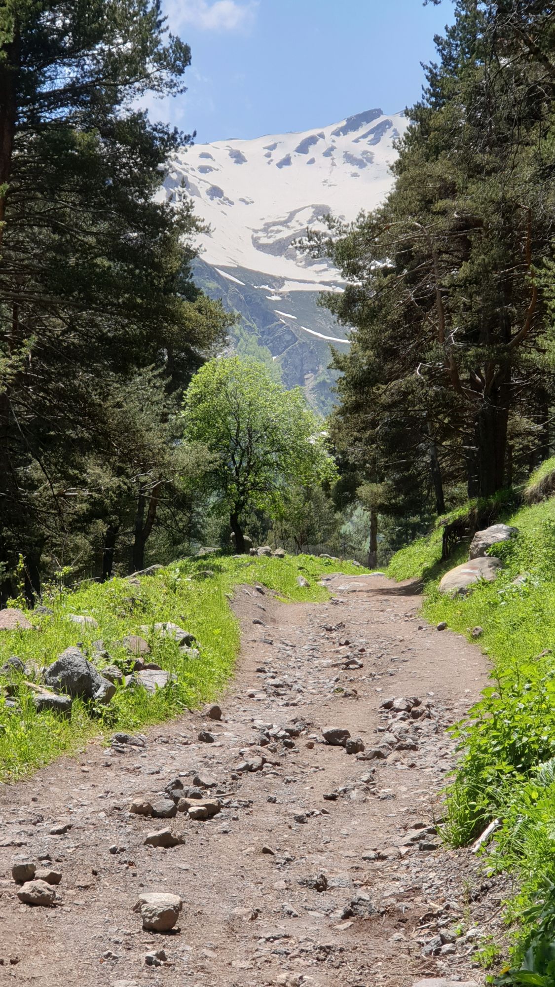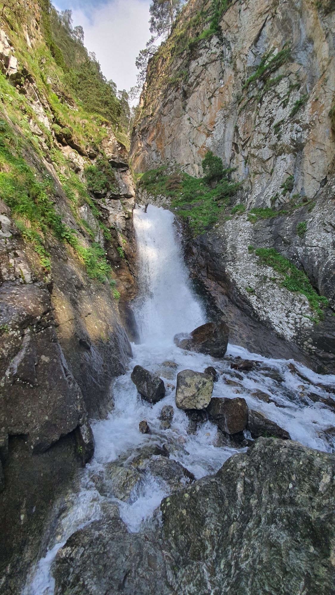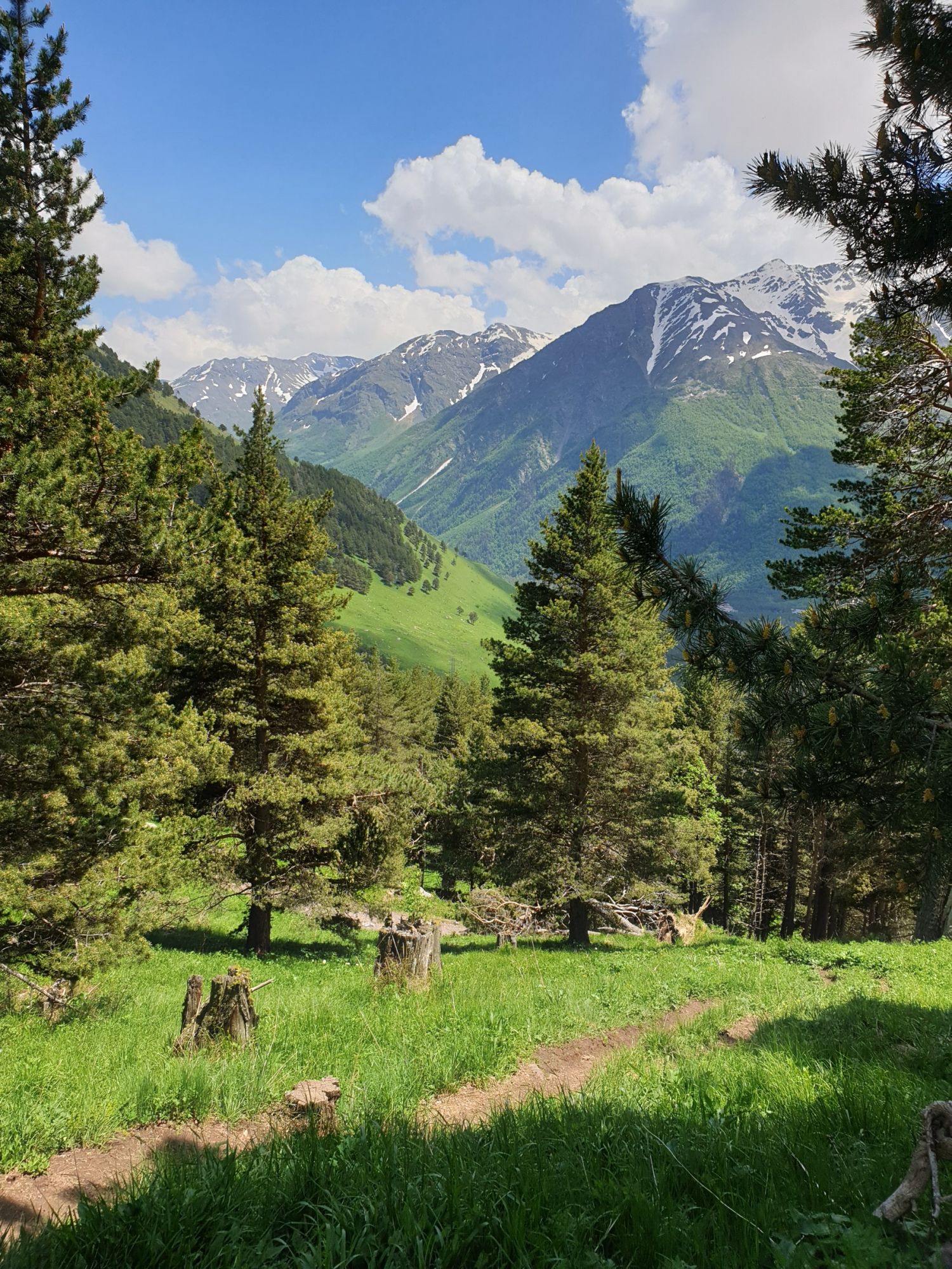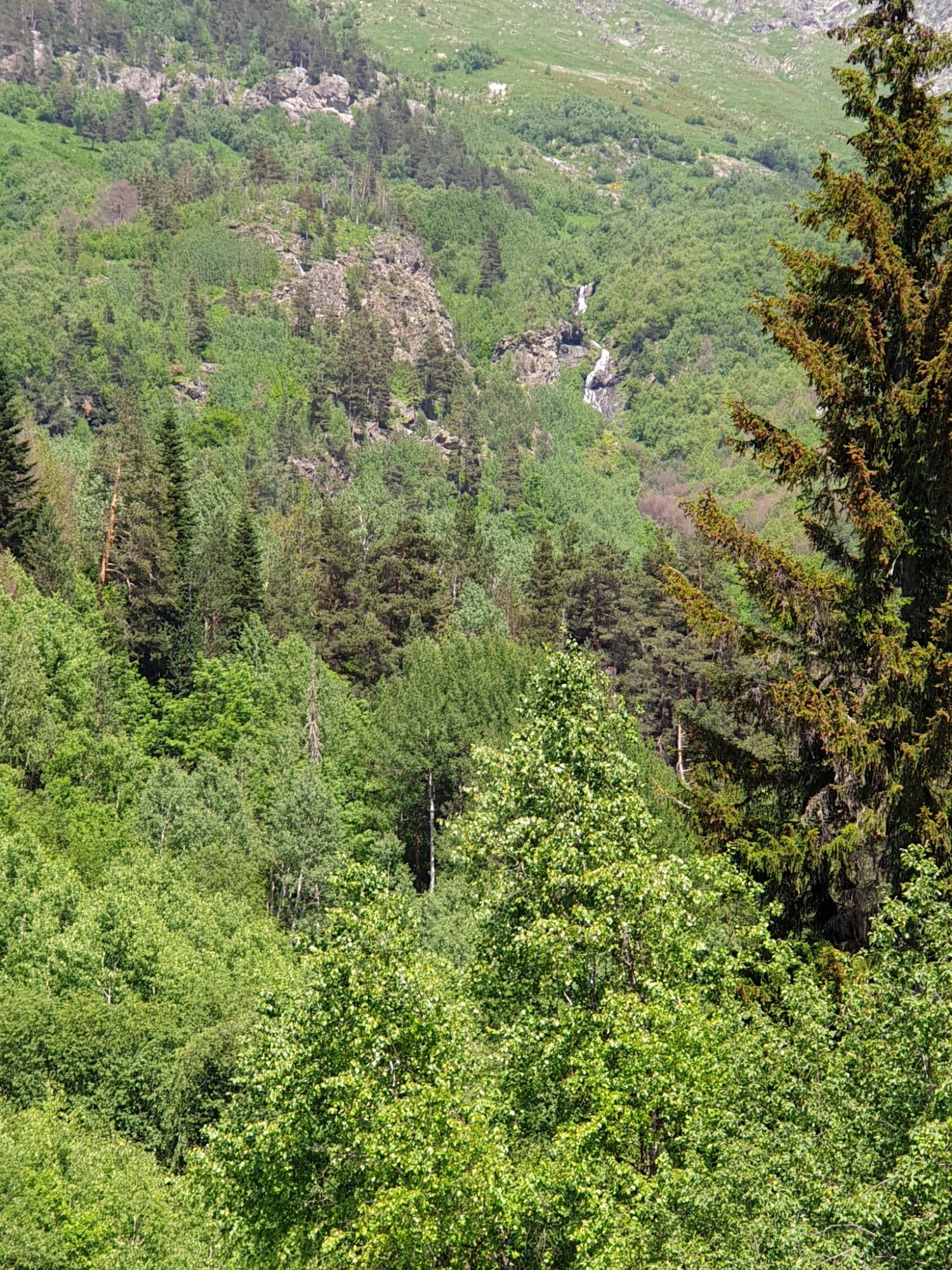 1 июля 2021 Доброе утро! А я продолжаю. Теперь пойдет немного медленнее, т.к. для каждого следующего сообщения приходится выбирать вменяемое количество фотографий из нескольких сотен. Но, надеюсь, оно того стоит. К концу первой недели отпуска прогноз погоды по соседним Кабардино-Балкарской и Карачаево-Черкесской Республикам перестал изобиловать ливневыми дождями и штормовыми предупреждениями и мы поспешили этим воспользоваться. Первым пунктом назначения стал Терскол. Тот самый, что на склоне Эльбруса и где известный горнолыжный курорт, а значит подъемники. Правда вот насчет того, что мы хотим подниматься на подъемниках мы сомневались: от местных гидов шли сообщения, что горнолыжный сезон продлен до конца июня, температура там не выше 5 градусов, а снега столько, что кроссовки промокают через 2 минуты. И мы ехали в сомнениях. Тем более, что подъемнику у нас была очень заманчивая альтернатива. Забегая вперед, скажу, что до поляны Азау, откуда начинается канатка, мы так и не доехали. Но сначала дорога до Терскола по Баксанскому ущелью. Тут мы впервые увидели так близко заснеженные горы, а высота перевалила за 2 тысячи над уровнем моря (Кисловодск находится на высоте в среднем где-то 600-900м нум, парковые тропки до 1400м нум на вершине г.Большое седло), а Пятигорск и того ниже, средняя 500м нум, если правильно помню). В центре Терскола оставили машину и пошли к КПП одного из туристических маршрутов по Приэльбрусскому нац.парку. Путь наш лежал к водопаду Девичьи косы, (как он называется на оф.карте маршрута) или Чыранбаши-су (как он подписан на Яндекс-картах). Про этот маршрут в сентябре прошлого года рассказывала Юля @Juliay и с тех пор я очень хотела тут побывать. Опять же согласно оф.карте маршрута длина его составляет что-то порядка 6 км в одну сторону с перепадом высот 500м, сам водопад находится на уровне 2800м над уровнем моря. Итого, впереди нас ждали несколько км непрерывного подъема на приличной высоте. Но в целом, если не пытаться бежать, то все проходится нормально. Тем более вокруг такие виды, что дух захватывает, а рука тянется к фотоаппарату на каждом шагу. Здесь аромат сосен и робкие нежные лесные цветы постепенно сменяются альпийскими лугами, где буйным цветом цветет все, что можно от лютиков, до кое-где еще встречающейся сон-травы (в Крыму она, например, отцветает в апреле). Внизу еле видной отсюда ниткой течет Баксан, а с возвышающихся по ту сторону реки вершин Чегета бегут многочисленные ручьи и водопадики и видны тающие сошедшие зимой лавины. Зелень изумительна, природа восхищает и удивляет, а погода к нам весьма благосклонна несмотря на прогноз. В какой-то момент Женя увидел вдалеке внизу среди деревьев оленя. Их там оказалось несколько. И пока мы доставали что-то увеличительное, они с невероятной скоростью проскакали по склону вверх, пересекли нашу дорогу и унеслись еще выше в горы. "А мы то тут ползем как черепахи", - только и подумали мы И вот, за очередным поворотом показался он, водопад! Я видела фотографии, но с водопадами так всегда - живьем они совершенно другие, их невозможно представить, если никогда не был, если не видел этих высот и не ощущал этой мощи. Особенно теперь, когда в регионе заметно потеплело и на вершинах стал очень активно таять снег, а горные реки стали весьма полноводными. Здесь поток разбивается на множество относитель
