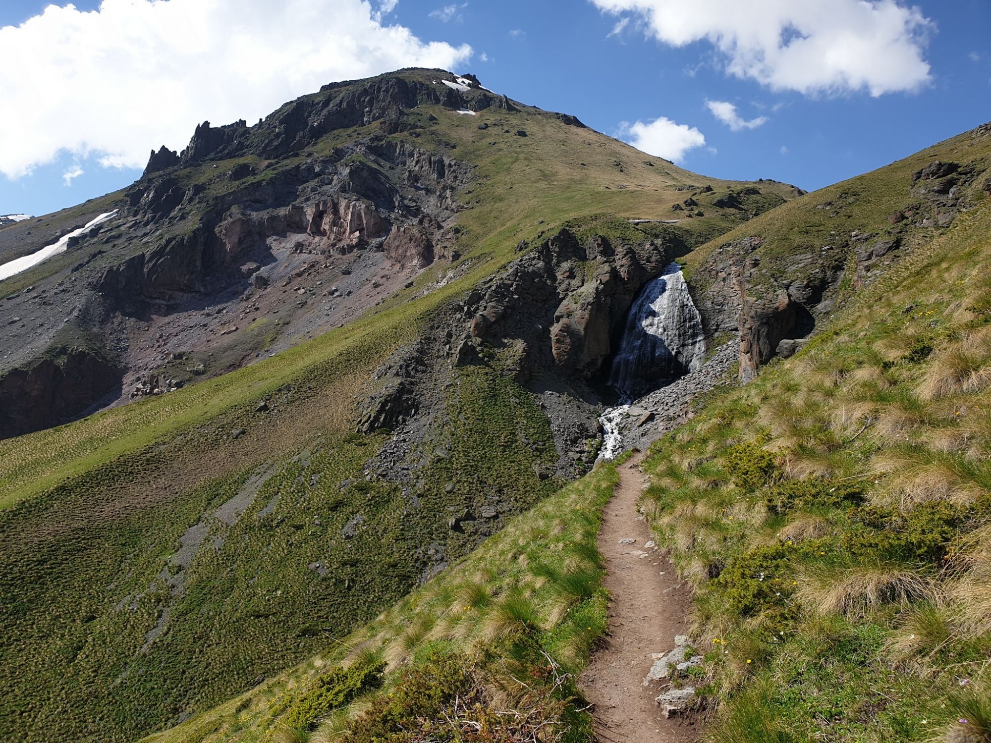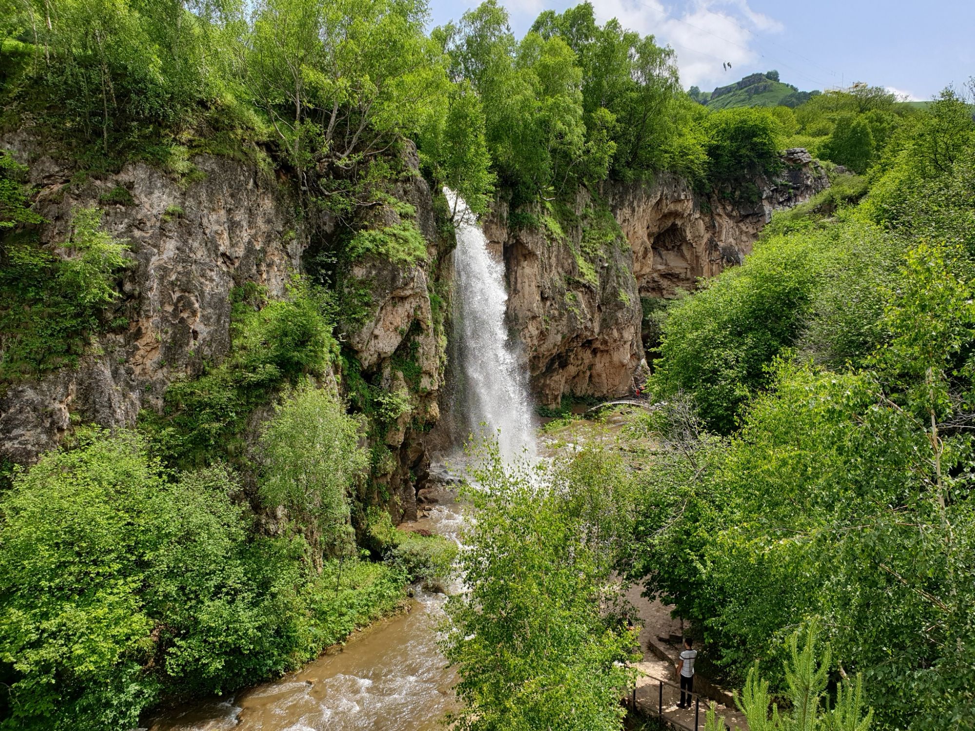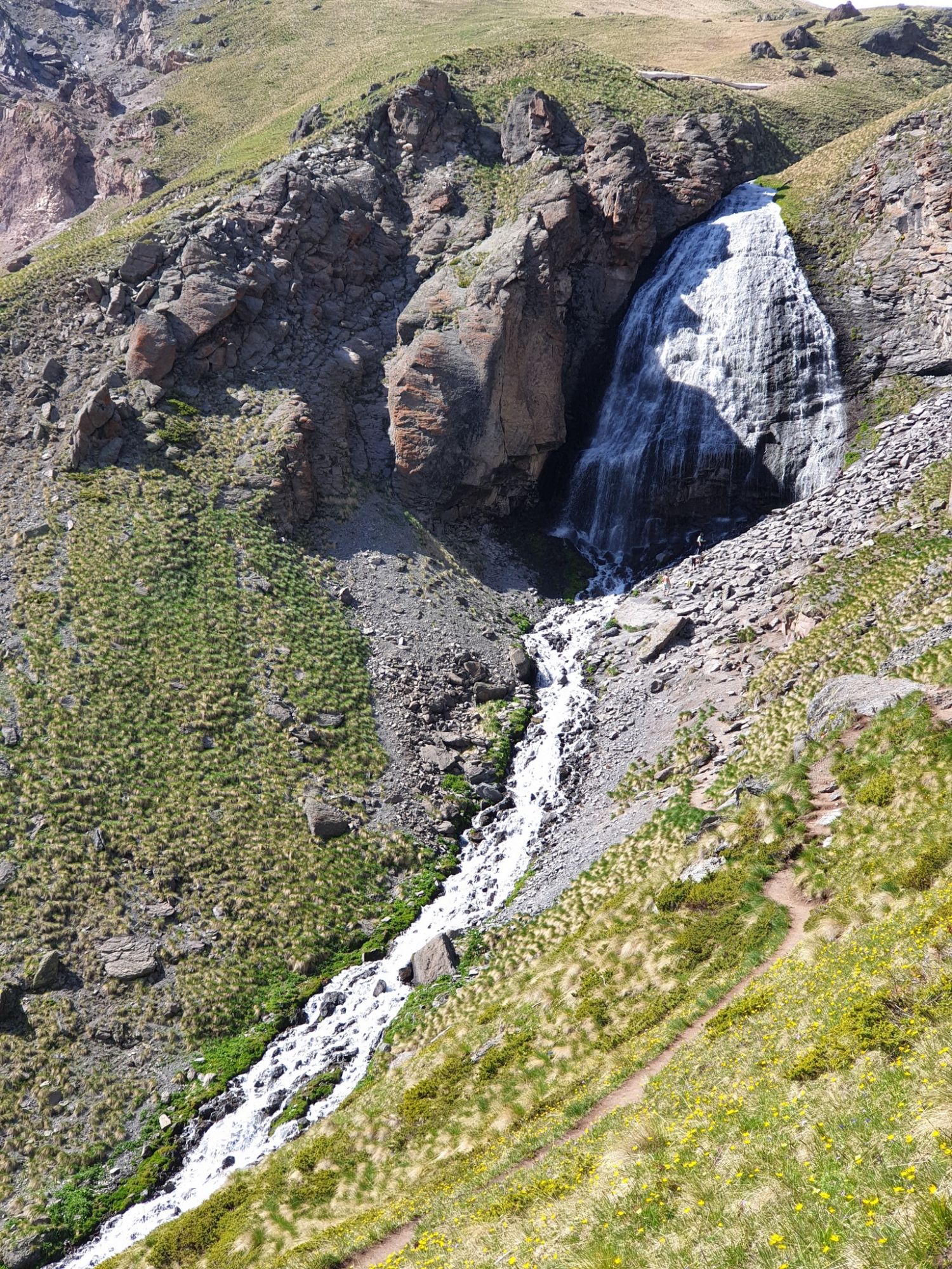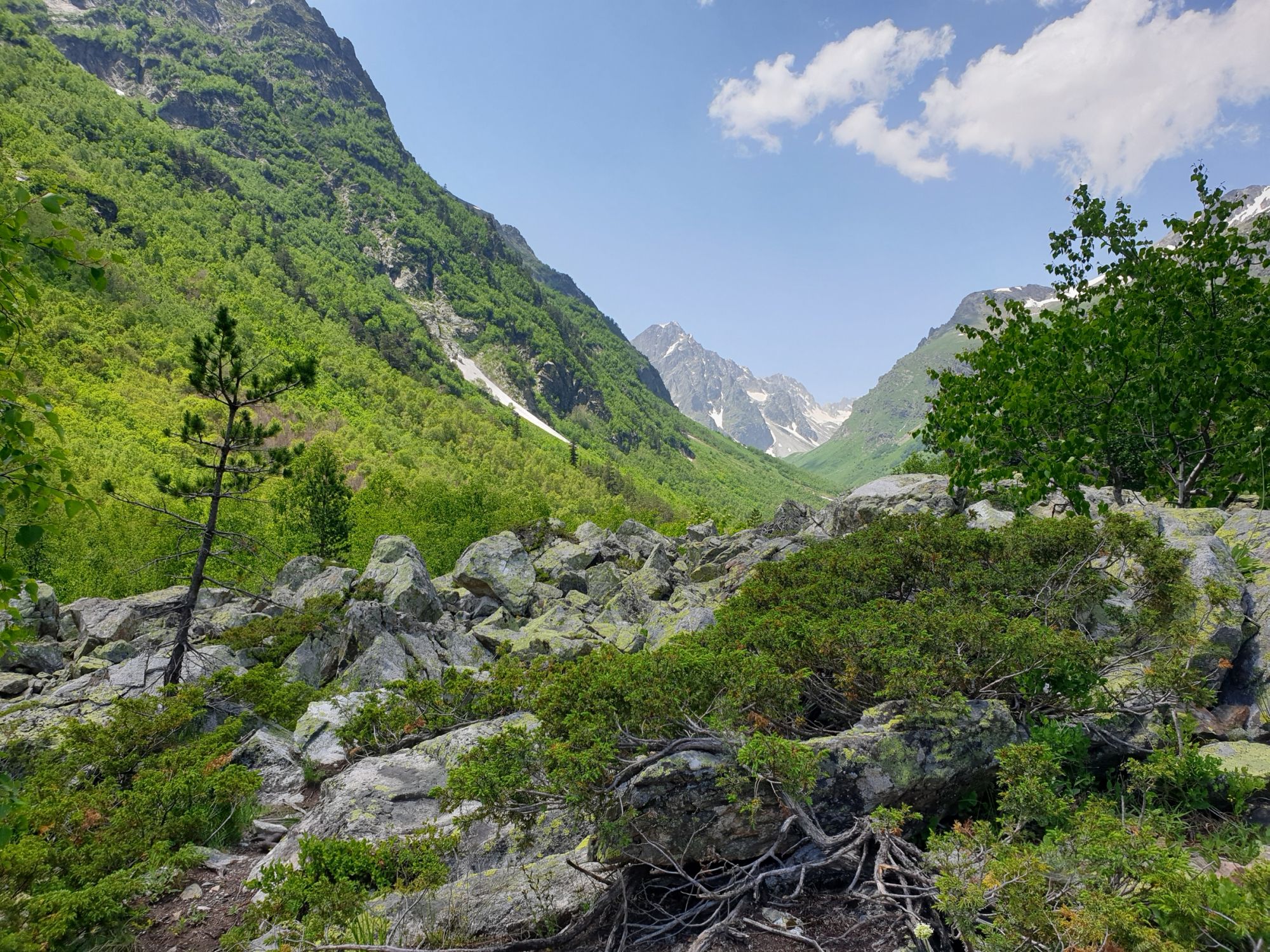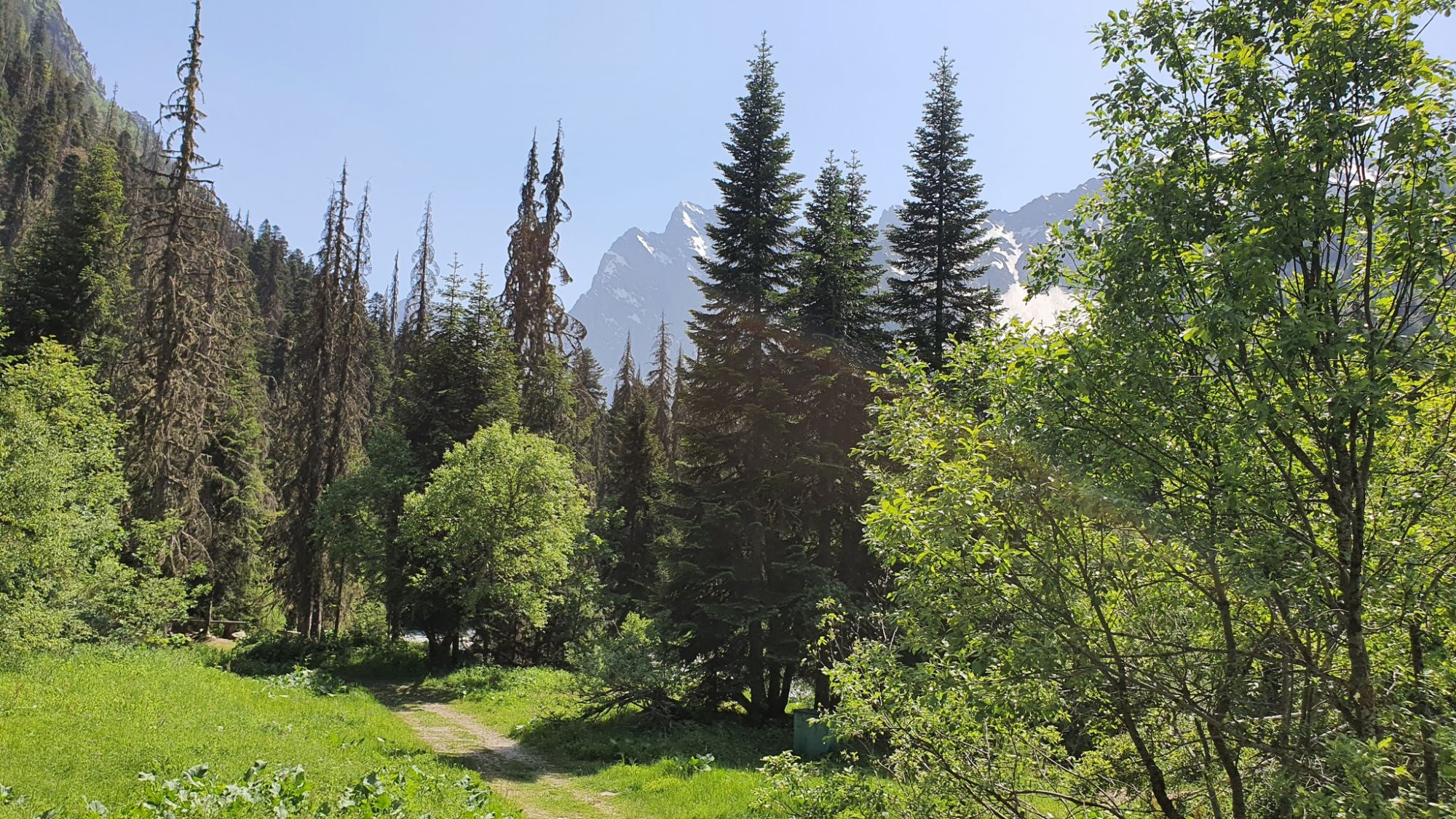 1 июля 2021 Доброе утро! А я продолжаю. Теперь пойдет немного медленнее, т.к. для каждого следующего сообщения приходится выбирать вменяемое количество фотографий из нескольких сотен. Но, надеюсь, оно того стоит. К концу первой недели отпуска прогноз погоды по соседним Кабардино-Балкарской и Карачаево-Черкесской Республикам перестал изобиловать ливневыми дождями и штормовыми предупреждениями и мы поспешили этим воспользоваться. Первым пунктом назначения стал Терскол. Тот самый, что на склоне Эльбруса и где известный горнолыжный курорт, а значит подъемники. Правда вот насчет того, что мы хотим подниматься на подъемниках мы сомневались: от местных гидов шли сообщения, что горнолыжный сезон продлен до конца июня, температура там не выше 5 градусов, а снега столько, что кроссовки промокают через 2 минуты. И мы ехали в сомнениях. Тем более, что подъемнику у нас была очень заманчивая альтернатива. Забегая вперед, скажу, что до поляны Азау, откуда начинается канатка, мы так и не доехали. Но сначала дорога до Терскола по Баксанскому ущелью. Тут мы впервые увидели так близко заснеженные горы, а высота перевалила за 2 тысячи над уровнем моря (Кисловодск находится на высоте в среднем где-то 600-900м нум, парковые тропки до 1400м нум на вершине г.Большое седло), а Пятигорск и того ниже, средняя 500м нум, если правильно помню). В центре Терскола оставили машину и пошли к КПП одного из туристических маршрутов по Приэльбрусскому нац.парку. Путь наш лежал к водопаду Девичьи косы, (как он называется на оф.карте маршрута) или Чыранбаши-су (как он подписан на Яндекс-картах). Про этот маршрут в сентябре прошлого года рассказывала Юля @Juliay и с тех пор я очень хотела тут побывать. Опять же согласно оф.карте маршрута длина его составляет что-то порядка 6 км в одну сторону с перепадом высот 500м, сам водопад находится на уровне 2800м над уровнем моря. Итого, впереди нас ждали несколько км непрерывного подъема на приличной высоте. Но в целом, если не пытаться бежать, то все проходится нормально. Тем более вокруг такие виды, что дух захватывает, а рука тянется к фотоаппарату на каждом шагу. Здесь аромат сосен и робкие нежные лесные цветы постепенно сменяются альпийскими лугами, где буйным цветом цветет все, что можно от лютиков, до кое-где еще встречающейся сон-травы (в Крыму она, например, отцветает в апреле). Внизу еле видной отсюда ниткой течет Баксан, а с возвышающихся по ту сторону реки вершин Чегета бегут многочисленные ручьи и водопадики и видны тающие сошедшие зимой лавины. Зелень изумительна, природа восхищает и удивляет, а погода к нам весьма благосклонна несмотря на прогноз. В какой-то момент Женя увидел вдалеке внизу среди деревьев оленя. Их там оказалось несколько. И пока мы доставали что-то увеличительное, они с невероятной скоростью проскакали по склону вверх, пересекли нашу дорогу и унеслись еще выше в горы. "А мы то тут ползем как черепахи", - только и подумали мы И вот, за очередным поворотом показался он, водопад! Я видела фотографии, но с водопадами так всегда - живьем они совершенно другие, их невозможно представить, если никогда не был, если не видел этих высот и не ощущал этой мощи. Особенно теперь, когда в регионе заметно потеплело и на вершинах стал очень активно таять снег, а горные реки стали весьма полноводными. Здесь поток разбивается на множество относитель