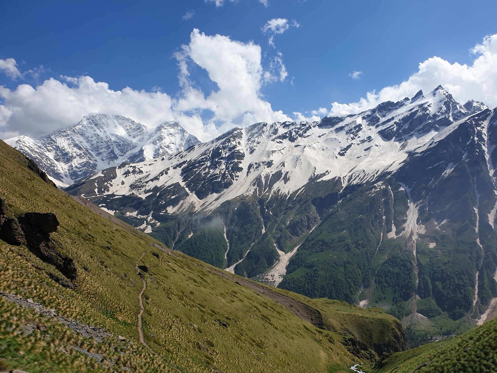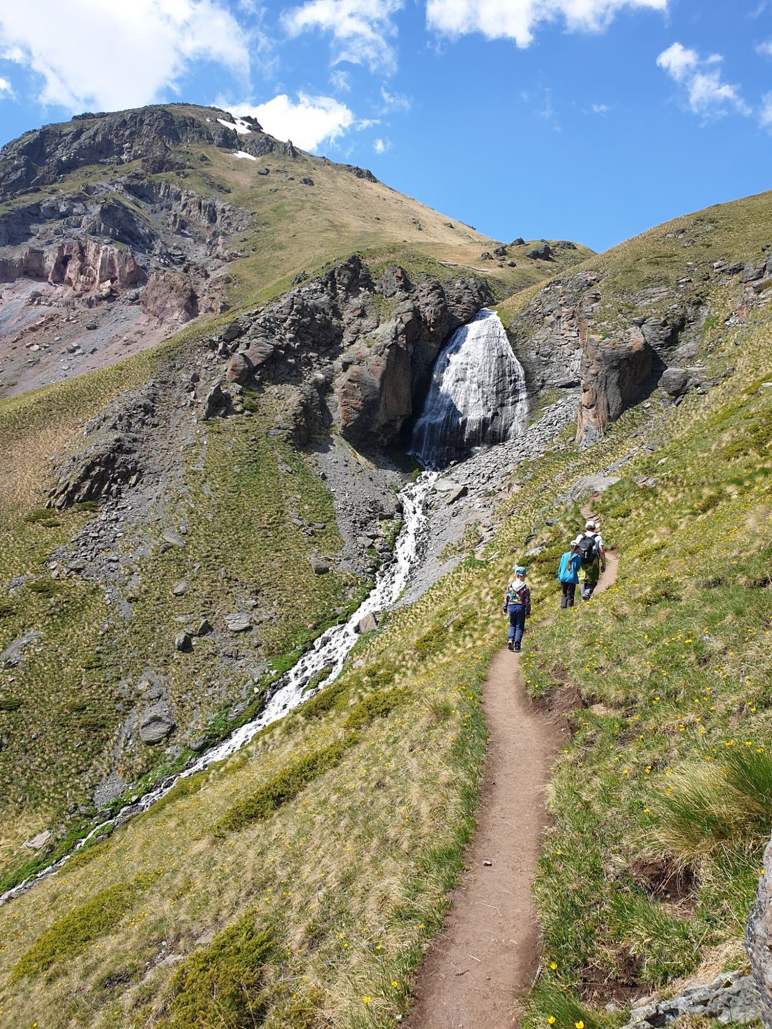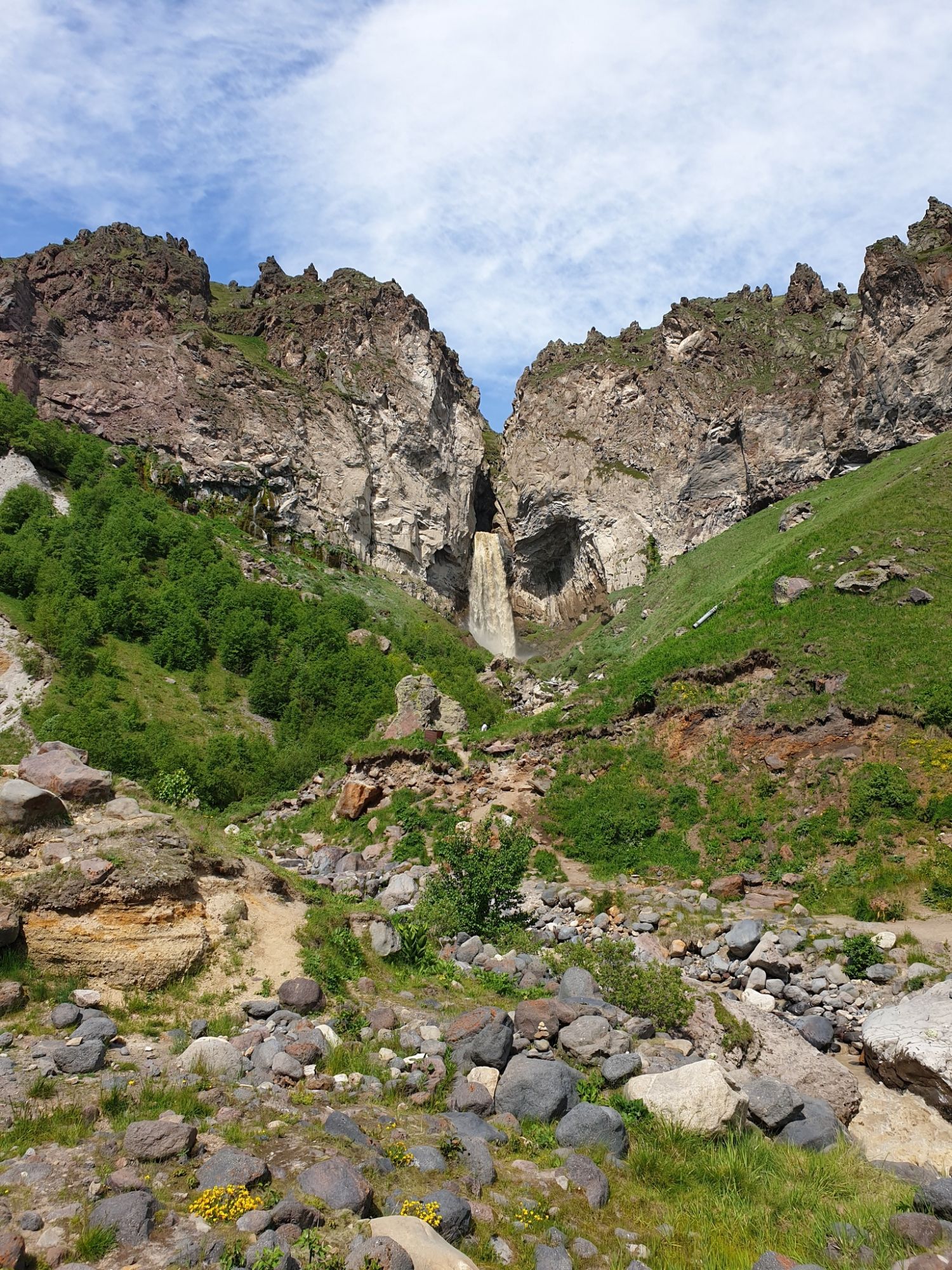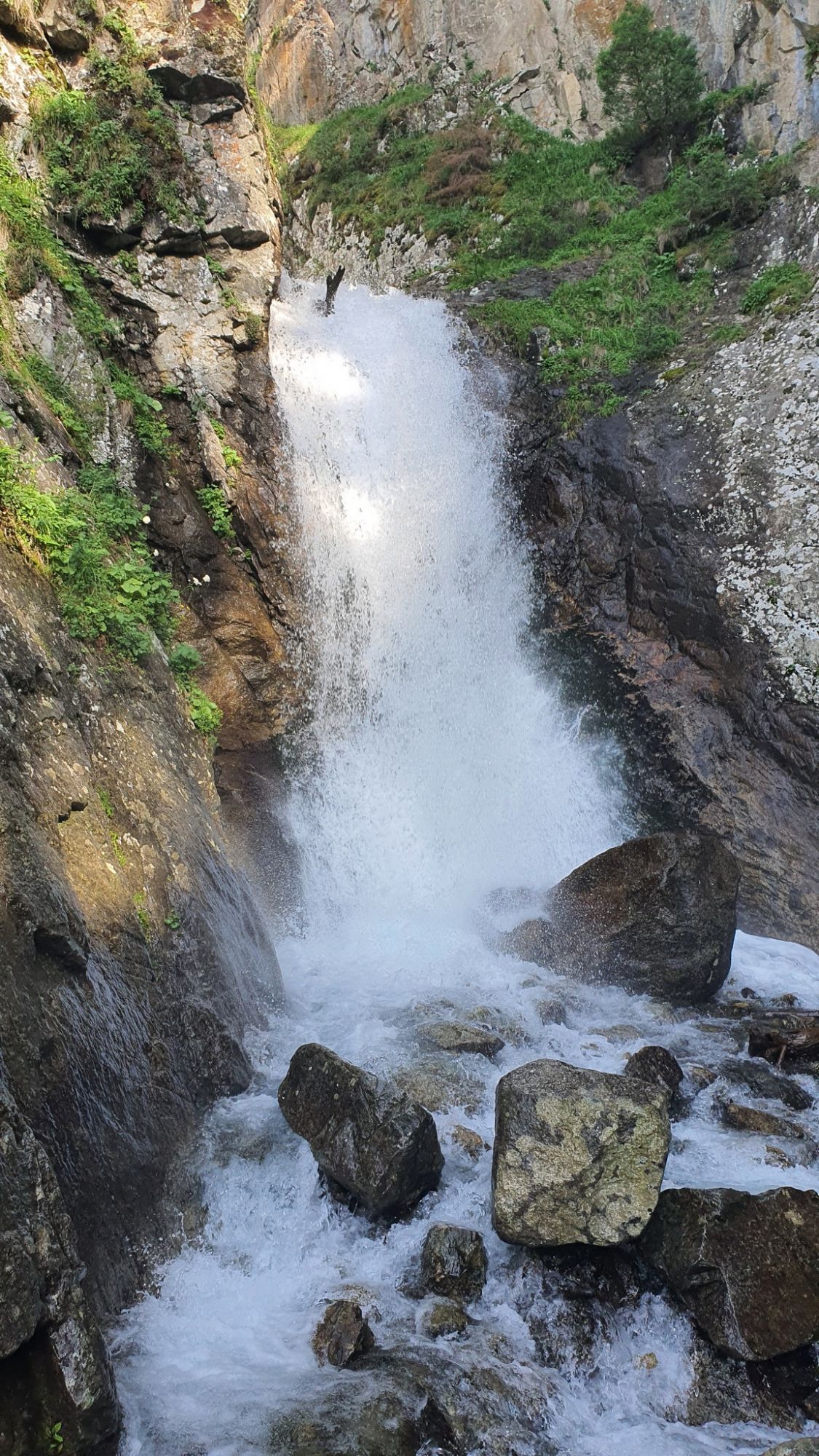 1 июля 2021 Доброе утро! А я продолжаю. Теперь пойдет немного медленнее, т.к. для каждого следующего сообщения приходится выбирать вменяемое количество фотографий из нескольких сотен. Но, надеюсь, оно того стоит. К концу первой недели отпуска прогноз погоды по соседним Кабардино-Балкарской и Карачаево-Черкесской Республикам перестал изобиловать ливневыми дождями и штормовыми предупреждениями и мы поспешили этим воспользоваться. Первым пунктом назначения стал Терскол. Тот самый, что на склоне Эльбруса и где известный горнолыжный курорт, а значит подъемники. Правда вот насчет того, что мы хотим подниматься на подъемниках мы сомневались: от местных гидов шли сообщения, что горнолыжный сезон продлен до конца июня, температура там не выше 5 градусов, а снега столько, что кроссовки промокают через 2 минуты. И мы ехали в сомнениях. Тем более, что подъемнику у нас была очень заманчивая альтернатива. Забегая вперед, скажу, что до поляны Азау, откуда начинается канатка, мы так и не доехали. Но сначала дорога до Терскола по Баксанскому ущелью. Тут мы впервые увидели так близко заснеженные горы, а высота перевалила за 2 тысячи над уровнем моря (Кисловодск находится на высоте в среднем где-то 600-900м нум, парковые тропки до 1400м нум на вершине г.Большое седло), а Пятигорск и того ниже, средняя 500м нум, если правильно помню). В центре Терскола оставили машину и пошли к КПП одного из туристических маршрутов по Приэльбрусскому нац.парку. Путь наш лежал к водопаду Девичьи косы, (как он называется на оф.карте маршрута) или Чыранбаши-су (как он подписан на Яндекс-картах). Про этот маршрут в сентябре прошлого года рассказывала Юля @Juliay и с тех пор я очень хотела тут побывать. Опять же согласно оф.карте маршрута длина его составляет что-то порядка 6 км в одну сторону с перепадом высот 500м, сам водопад находится на уровне 2800м над уровнем моря. Итого, впереди нас ждали несколько км непрерывного подъема на приличной высоте. Но в целом, если не пытаться бежать, то все проходится нормально. Тем более вокруг такие виды, что дух захватывает, а рука тянется к фотоаппарату на каждом шагу. Здесь аромат сосен и робкие нежные лесные цветы постепенно сменяются альпийскими лугами, где буйным цветом цветет все, что можно от лютиков, до кое-где еще встречающейся сон-травы (в Крыму она, например, отцветает в апреле). Внизу еле видной отсюда ниткой течет Баксан, а с возвышающихся по ту сторону реки вершин Чегета бегут многочисленные ручьи и водопадики и видны тающие сошедшие зимой лавины. Зелень изумительна, природа восхищает и удивляет, а погода к нам весьма благосклонна несмотря на прогноз. В какой-то момент Женя увидел вдалеке внизу среди деревьев оленя. Их там оказалось несколько. И пока мы доставали что-то увеличительное, они с невероятной скоростью проскакали по склону вверх, пересекли нашу дорогу и унеслись еще выше в горы. "А мы то тут ползем как черепахи", - только и подумали мы И вот, за очередным поворотом показался он, водопад! Я видела фотографии, но с водопадами так всегда - живьем они совершенно другие, их невозможно представить, если никогда не был, если не видел этих высот и не ощущал этой мощи. Особенно теперь, когда в регионе заметно потеплело и на вершинах стал очень активно таять снег, а горные реки стали весьма полноводными. Здесь поток разбивается на множество относитель