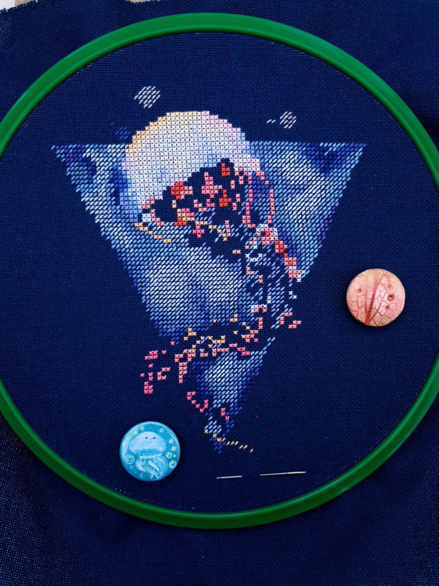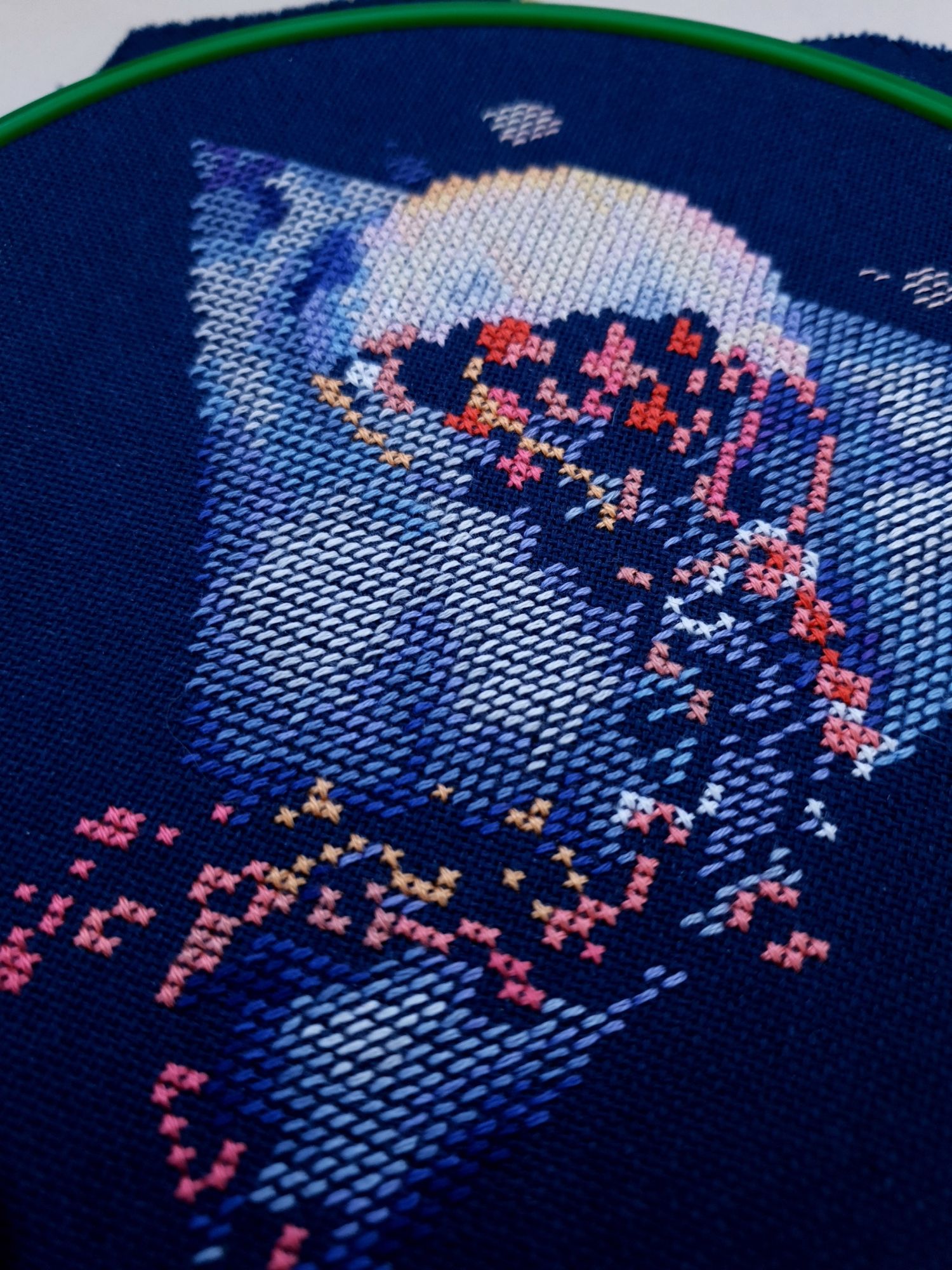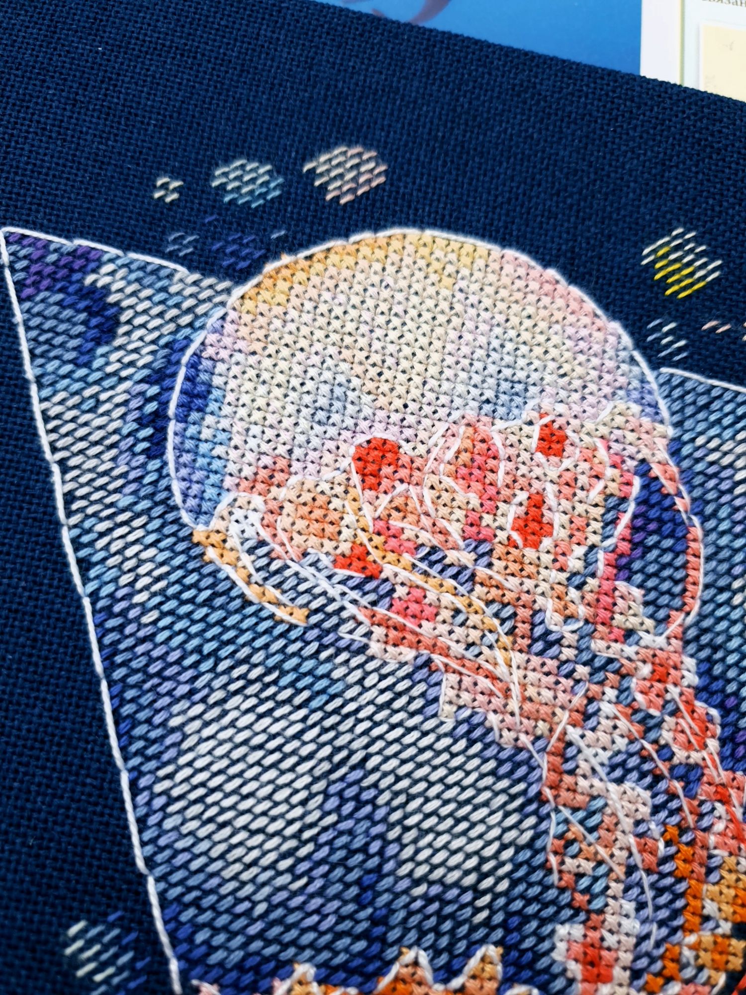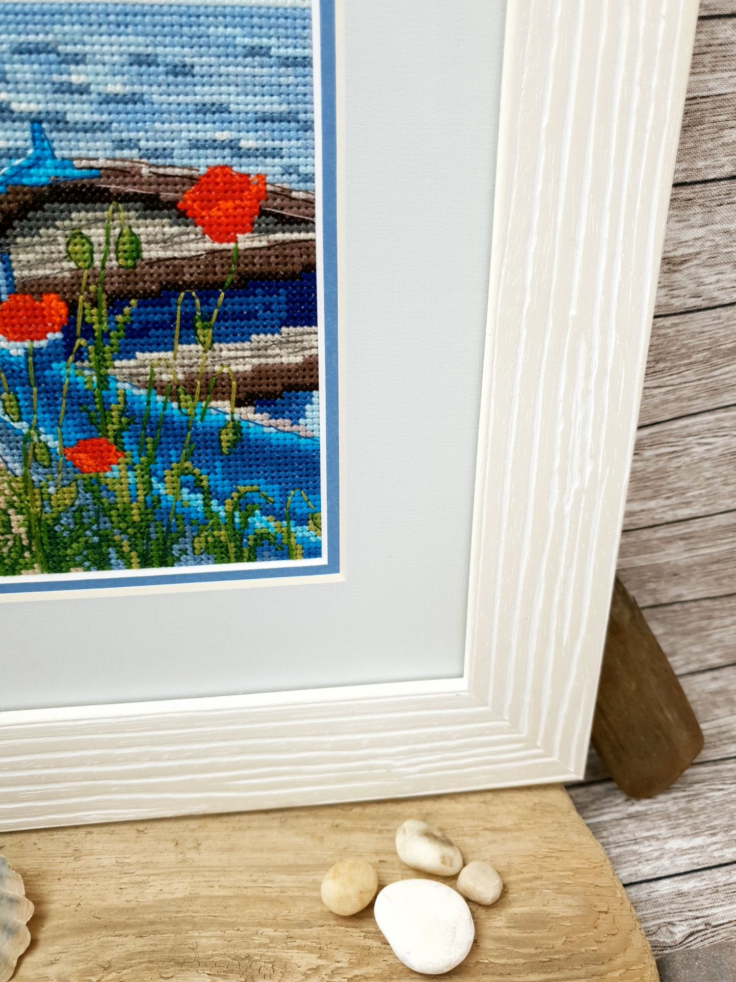 29 марта 2022 Привет! Вот уже пару дней хожу с думой, что показать в этом отчете. То ли вывести в люди и задокументировать много начатых в разное время процессов, то ли еще их взаперти подержать и немного подтянуть статистику в гаечке. В общем, я пока так и не нашла для себя ответ на этот вопрос, буду решать по ходу написания отчета А начну с того, ради чего этот отчет и затевался. Во-первых, я сфотографировала часть оформленных работ. Точнее две. Те, что привычно оформились в "Багет Идея" у Ирины Михно. Посыл был один - легкость и весенне-летнее настроение. Светлое оформление и стиль "деревяшка" - это для меня уже практически само собой Изабель Вотье, Песчанка. Из книги "Загадочный океан Изабель Вотье" Она прелестна. И сразу вспоминается отлив на Белом море в прошлом году... Деревяшка-реквизит на фото, кстати, оттуда И РТО, Лодка с маками из серии "Со вкусом соли...". Вышита в прошлом году. В оформленном виде чистый восторг - из рук выпускать не хочется. И если вам вдруг показалось, что багет одинаковый, то вам не показалось. Почти)) Ширина все же разная. И да, это не специально задумано, так получилось Дальше к процессам. В продолжение отчета предыдущего финиш! Анастасия Еремеева (Кравцова, Овечкины забавы). Изящный дуэт. Медуза - финиш! По процессу - все же ранние работы Анастасии (а медуза из довольно ранних) требуют изрядного терпения из-за частой смены цветов и небольших групп крестиков одним цветом. Но я очень рада, что наконец дошла до финиша - медуза прекрасна, она завораживает. Хотя и не очень поддается фотографированию из-за контраста ниток и основы. И мой изящный дуэт вместе. Когда фотографировала, все пыталась выбрать, кто из них мне нравится больше. Не смогла. В паре они дополняют и подчеркивают друг друга. А теперь поехали по новеньким. Посмотрим, на сколько меня хватит RTO M881 Где цветёт Иван-чай (этот) - новый процесс! Он не шел у меня из головы с самого анонса и осенней выставки. И муж на НГ мне его подарил. К тому моменту я его мысленно, мне кажется, уже вышивала не первый день, а потому и начало фактическое откладывать было как-то неправильно))) Собственно первая фотография сделана в первых числах января)) А вообще этот набор напоминает мне детство. Деревня, ночной выезд на рыбалку, и на рассвете ты уже в тишине и одиночестве сидишь на берегу озера, наблюдая за поплавком. Над озером стелется летний предрассветный туман, тишину изредка нарушает крик птицы или плеск рыбки в камышах, а небо постепенно светлеет и меняет свои оттенки, меняя заодно цвета и оттенки окружающего пейзажа. Это ощущение одновременно мимолетности и гармонии рассветного часа, это уверенное движение жизни, за которым ты можешь лишь наблюдать, завершающееся появлением солнечного диска над горизонтом, - я пронесла его через всю жизнь и оно во много определило меня. И пусть кто-то (да, Ася @Каори?), говорит, что таких красок не бывает, для меня бывают. Как минимум в моей памяти, что в данном случае самое важное. Про процесс пока многого сказать не могу: любимое РТО, любимые dmc и опять же любимый полукрест в небе. Обозначение полукреста теми же символами, что и креста, но на розовом фоне - для меня мега удобно. Уже пару раз воспользовалась - не пришлось доп.обрыв нити делать. В общем, прошу любить и жаловать, очень "мой" процесс. Овен 1453 Норвежское море (этот) - новый процесс! Еще один пейзаж. Тот слу