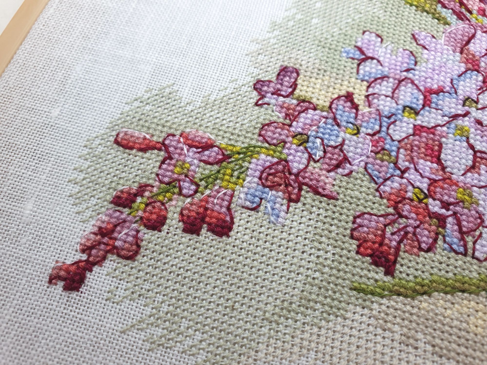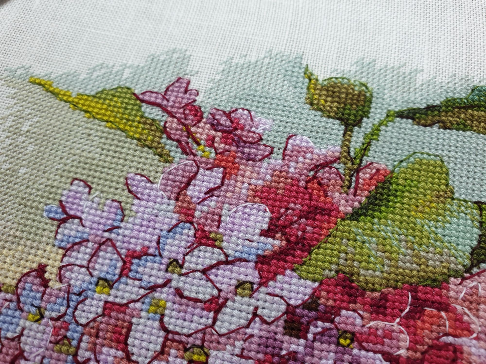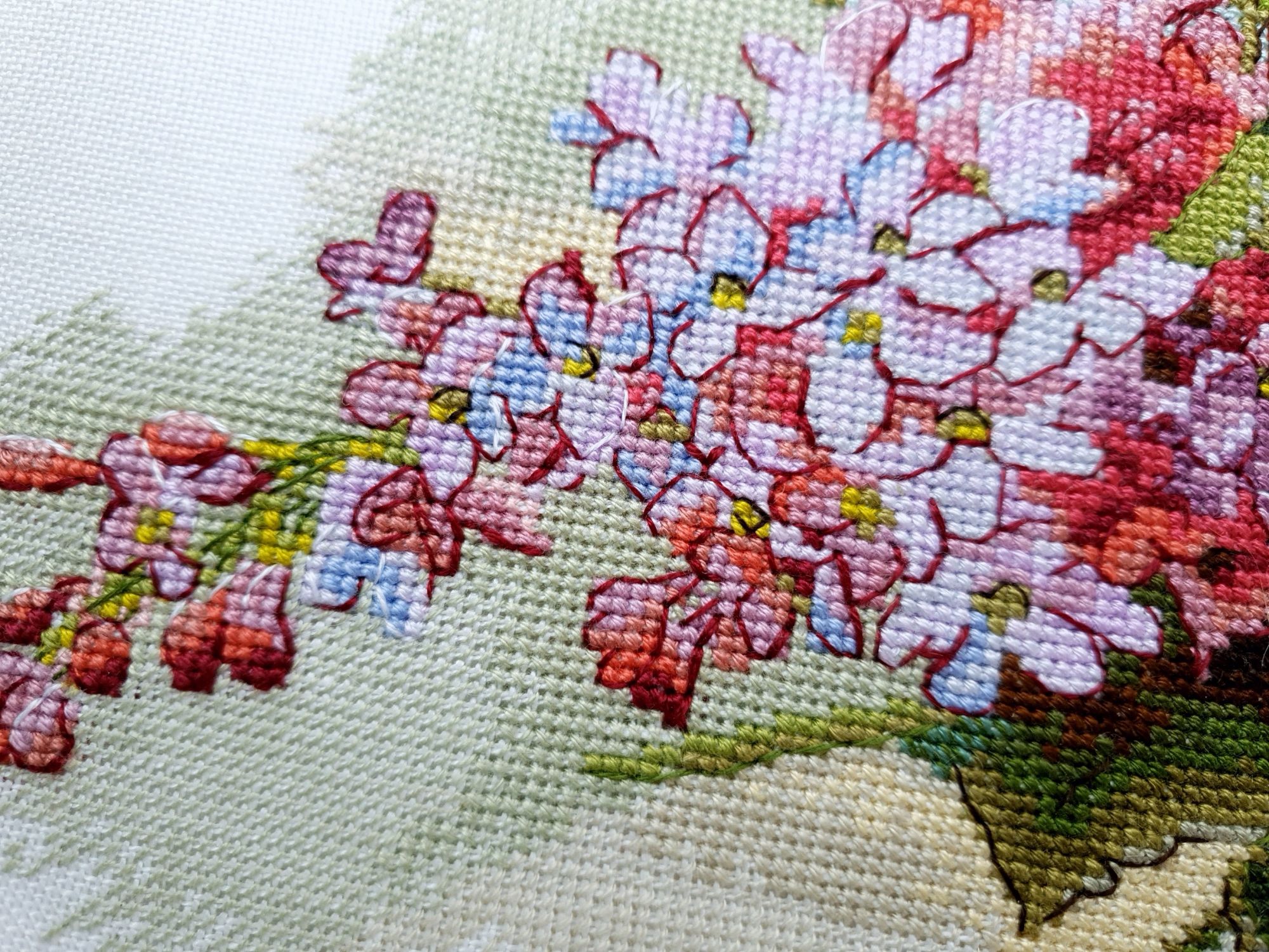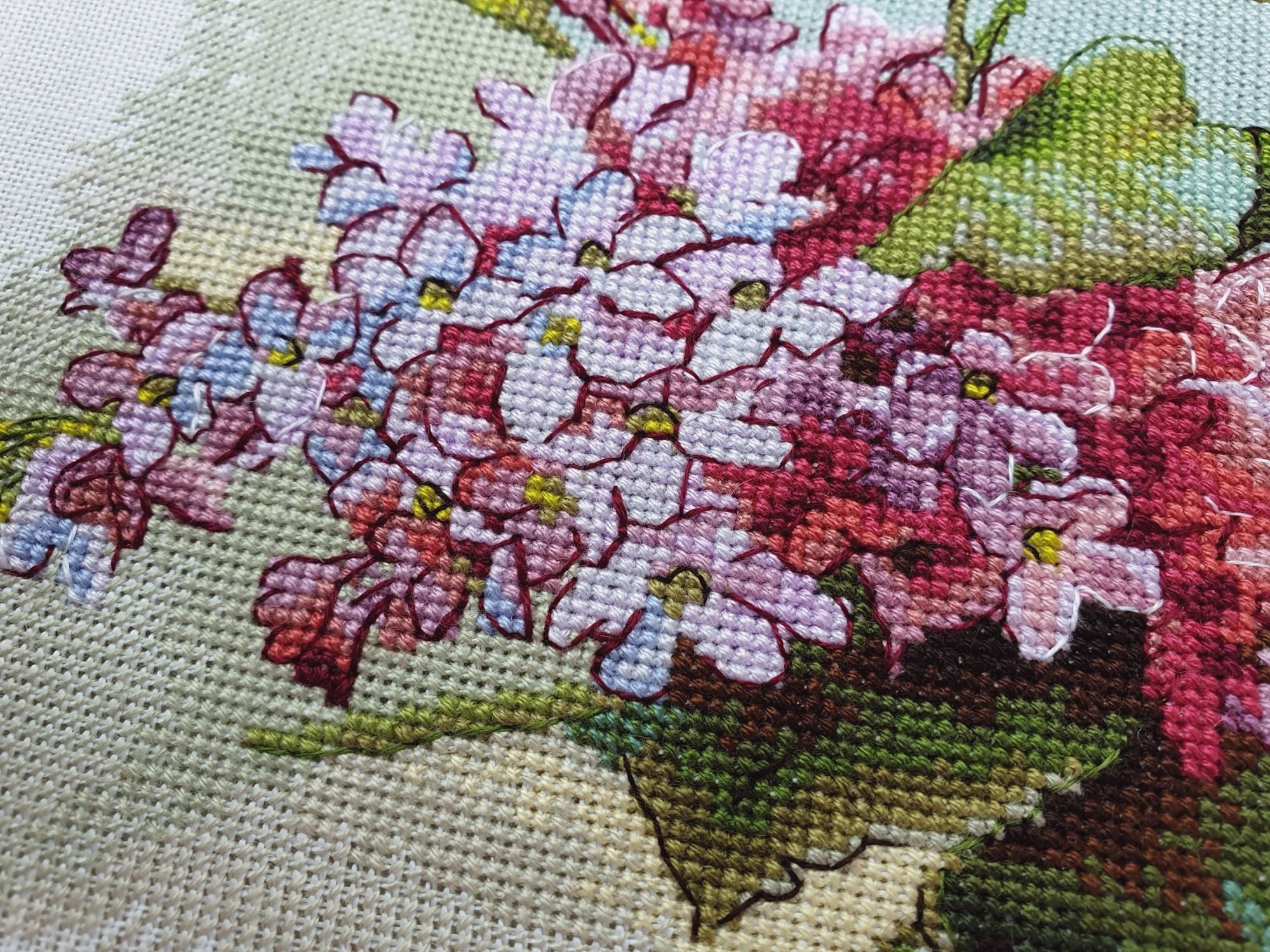 31 мая 2022 Всем привет! Две недели с последнего отчета: ой-ей Но у меня есть оправдание: я упорно шила сирень. И *внимание, спойлер* я ее дошила!!! Но сначала о лирике. А как иначе, если последний день весны уже практически докатился до своего финала? Вот уж поистине в этом году особенная весна. В самых разных смыслах. Если про погоду, то я тут попыталась вспомнить, сколько дней эта весна позволила выйти на улицу без куртки. Пальцев одной руки хватит пересчитать. Но вот она завершается, плохая ли, хорошая ли, и ничего в ней уже не поменять. Ни поступков, ни эмоций, ни погоды. А потому хочется сказать ей спасибо за то, что она была. И мы были с ней. И разбросать по страничкам памяти трогательные зеленые открытки. Местами мокрые, но очень и очень желанные. В этом году как никогда хотелось ловить каждый вздох весенней природы. А теперь про вышивку. Универсальное средство от всех душевных переживаний, особенно, когда у тебя столько процессов и совершенно не проблема начать новый в любой момент Екатерина Тарасова (Rin-Stitch), Герань (эта) - новый процесс и финиш! Видимо иногда звезды сходятся особенным образом. У меня было весьма дурное настроение в тот день, когда я увидела его! И улыбнулась. Ухмыльнулась скорее, конечно. Может даже немного недобро Но главное, что путь выхода к свету вдруг стал ясен))) Схема куплена в тот же час и начата, не откладывая в долгий ящик. Сейчас я зову этого товарища "мой тотем" и горячо его люблю. Даже иногда с собой в кармане таскаю. Это помимо того, что получила массу восторга от процесса. Вот наблюдала подобные эмоции у других при отшиве этой серии, но понять не могла. И даже выбрать себе что-то пыталась, чтоб попробовать на собственной шкуре. Теперь вот попробовала. Понимаю и разделяю, хоть словами вряд ли смогу объяснить)))) Алиса Окнеас, Воронье - финиш! *Татуся, добавь, пожалуйста, фото в гайку, а то ты мне ее в прошлый раз сразу зеленой прикрутила: спасибо за веру в меня и стимул Дошила. Удовольствие невероятное. Хочу еще что-нибудь подобное при случае)) Третий ворон мне особенно нравится, хотя они все прекрасны. О замене орнамента на меланж в луне ни капельки не жалею, выбором основы более чем довольна. Полное удовлетворение от процесса. Пока только с финальной фотосессией идей никаких, но это я рано или поздно исправлю)) Ну и собственно она.... О.Ланкевич, Сирень - финиш! Это был для меня непростой спурт. Не в плане, что процесс сложный, процесс прекрасный и для мелких цветов даже совсем простой. Мне просто сложно так долго шить практически один процесс, причем шить много и каждый день. Зато когда я таки закончила... Оно определенно того стоило! Эта удивительная смесь изящества, легкости, умеренной яркости и совершенной "настоящести", что свойственна цветочным дизайнам Ланкевич, здесь представлена в полном объеме. Я рада, что выбрала лен 36го каунта - оно получилось именно так, как я ее видела в своих мыслях. Правда красивая фотосессия с прототипом впереди - у нас сирень только начала распускаться. А пока просто много фото процесса и деталей. Кстати тут приезжала Ася @Каори, у которой эта сирень тоже вышита и мы их вместе рядом положили и рассматривали. И еще воробьев тоже от Нечаевой. Удивительное дело, как один и тот же дизайн в исполнении разных людей преображается. Вроде бы одинаковые, а вроде бы и совсем разные. В общем, нам наши "воробьи в си