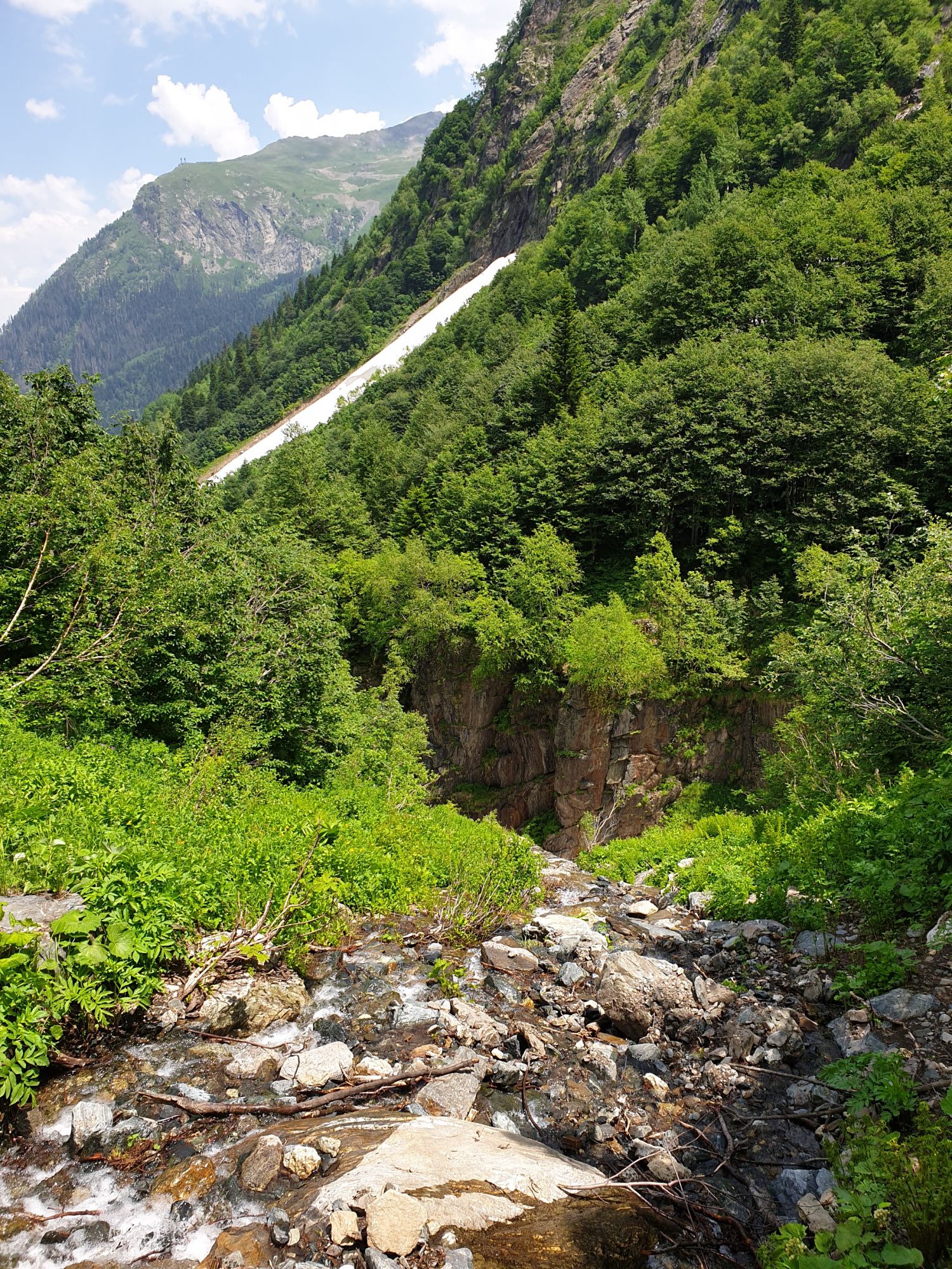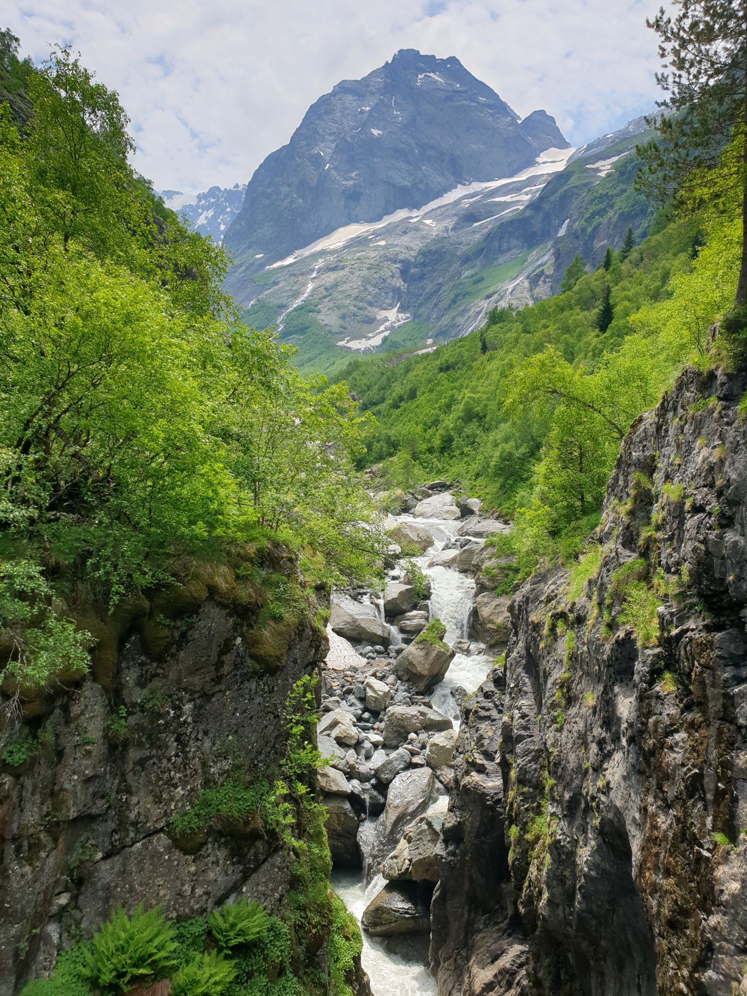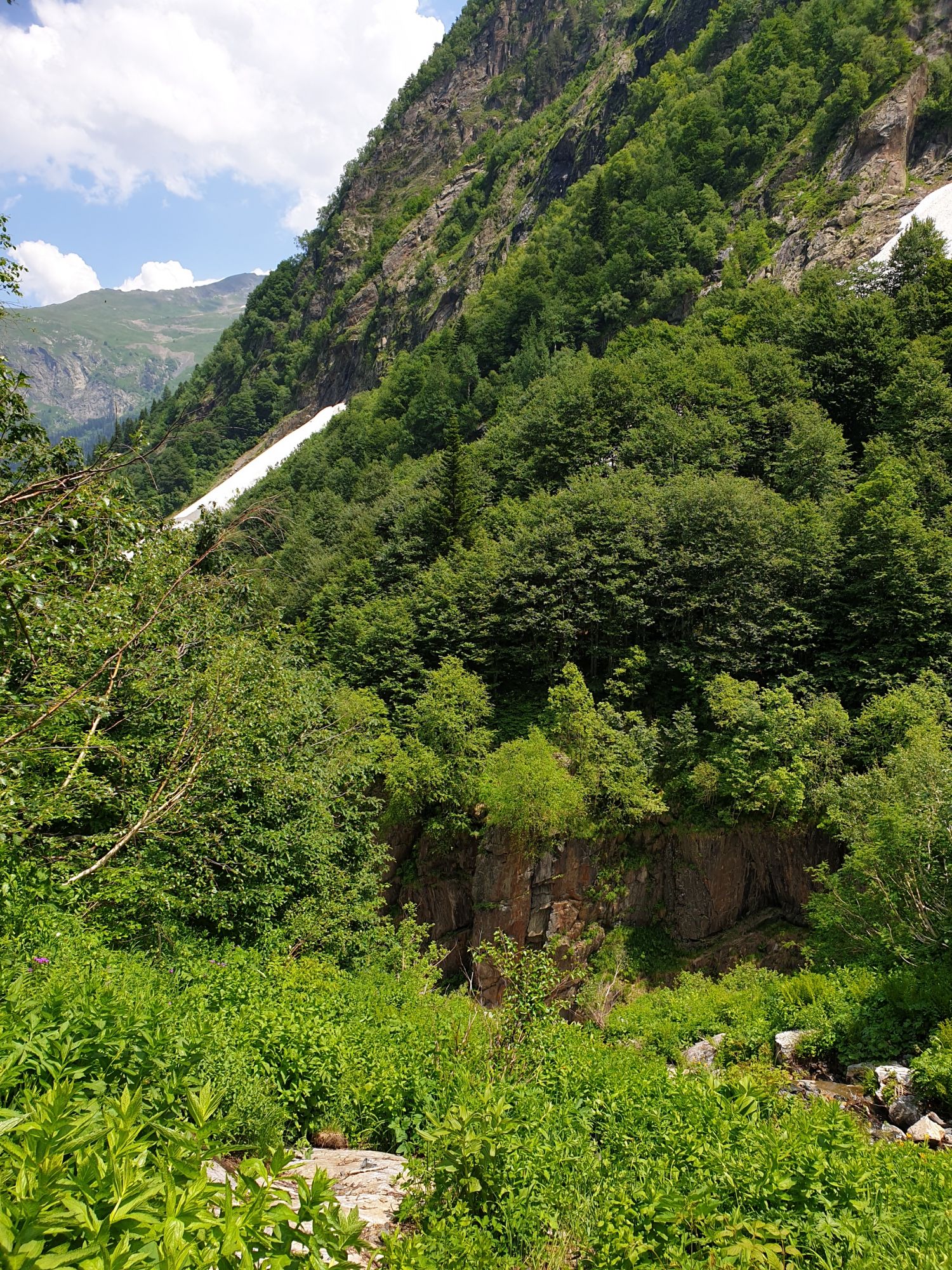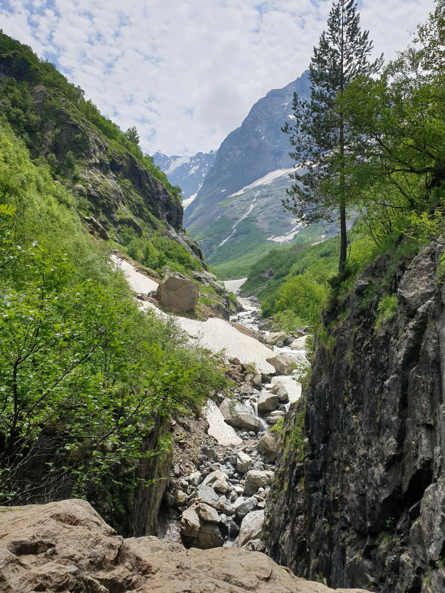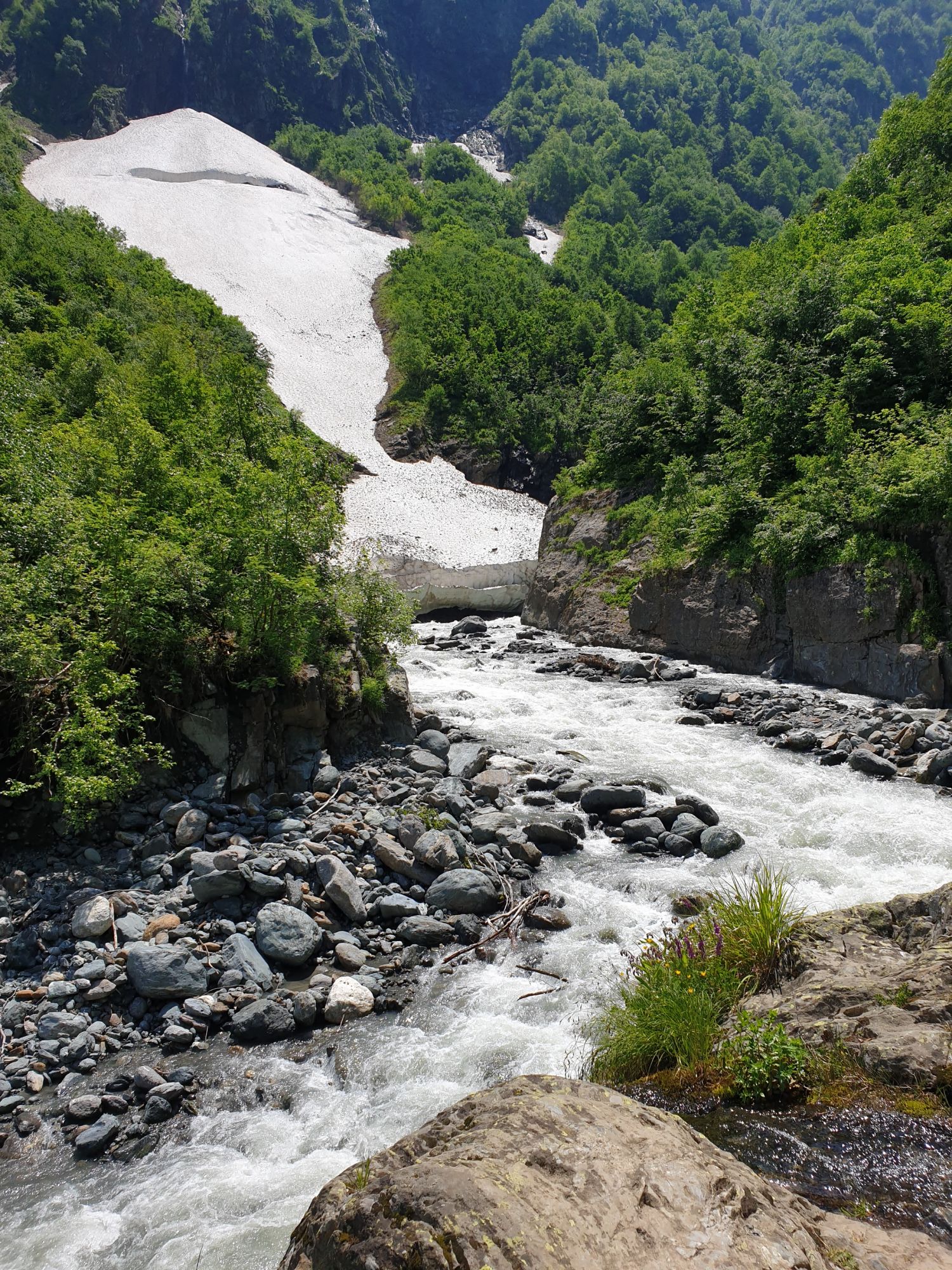 12 июля 2022 Продолжаю. Розы, значит... не отчет об отпуске, а какая-то исповедь получается. И я, вероятно, еще об этом пожалею. Совершенно точно пожалею. Что в очередной раз душу наизнанку. Но уж как есть. Значит так сейчас надо. В этой части про розы не будет. А будет про Домбай и обломы. А еще про равновесие. И про то, что порой судьба лучше нас знает, что нам надо, а чего не надо. На следующий день решено было ехать в Домбай. К высоте пообвыклись, ноги потихоньку пошли, прогноз погоды дает шанс. Правда яндекс говорил, что днем там максимум +9 будет, но +9 по-Домбайски оказались вполне себе жаркими в лесу и даже очень жаркими в поселке среди камня и асфальта. Выехали мы не слишком рано, не так рано как хотелось бы. Потому что вчерашние 20км давали о себе знать. (С чего бы это?). По совету Юли @Juliay через перевал Гум-Баши не поехали. Дорога там, конечно, красивая, но еще и в прошлом году была на минное поле похожа. Воспользовались другой дорогой: тоже немноголюдно, тоже перевал и серпантины, тоже красивые виды, а дорога очень и очень неплохая. И всего плюс 20-30 минут ко времени. А через 2.5 часа впереди замаячили заснеженные горы Тебердинского заповедника и Домбая Из разных вариантов маршрутов по заповеднику мы рассматривали на тот день два, оба к водопадам, но разным. И разной степени сложности. Финальный выбор отдала в руки домочадцев. Они выбрали более сложный. У меня вызывало это некоторые опасения, т.к. я не уверена была в своих силах. А еще читала, что в это время у водопада бывает снежник, по которому не всегда безопасно ходить. Но мои очень уж хотели. "Если что, издали посмотрим", - сказали они. Итак, было решено идти к Суфруджинским водопадам. Предполагаемая длина маршрута порядка 7 км в одну сторону, конечная точка на высоте более 2000м нум, погранзона с оформлением пропусков на кпп заповедника в начале маршрута. Там же, совсем недалеко от точки старта можно заглянуть на Чертову мельницу - любопытное место на реке Аманауз. И вот он, облом первый. Маршрут закрыт! Зимой и весной были сходы лавин и сейчас на маршруте еще куча снежников (это огромные такие снежные языки и скопления, толщиной зачастую больше метра, плотные в холодное время года, но в июне активно начинающие таять, поэтому совсем не безопасные для таких как мы) . Дойти можно только до Чертовой мельницы, дальше погранзона и пропуска в нее сейчас туристам не оформляют. А чертова мельница - это 700 метров всего. Вместо 7ми-то км! И время такое, что на второй маршрут мы уже не успеваем. Ну что ж, идем до Чертовой мельницы. Вы, конечно, понимаете, что я была бы не я, если бы не постаралась поскорее изничтожить свое разочарование и не радовалась бы каждой травинке, каждому ручью и каждому новому сюжету для кадра. Ущелье Аманауз известно как кухня погоды. Здесь часто зарождаются ураганы и метели, здесь часто сходят лавины и сели. В июне с приходом тепла повсюду в горах ледники и снежники начинают активно таять, реки становятся особенно полноводными и бурлящими, на склонах гор десятки безымянных водопадов больших и маленьких, снежные языки спускаются прямо в воду. И цветы... их бесконечно много. И на разной высоте будто разное время года. Вообще подъем в это время в горах сродни путешествию во времени: от лета к ранней весне на подъеме и обратно на спуске. А эти 700м... это между точками на карте. А на деле... перепад высоты на ма