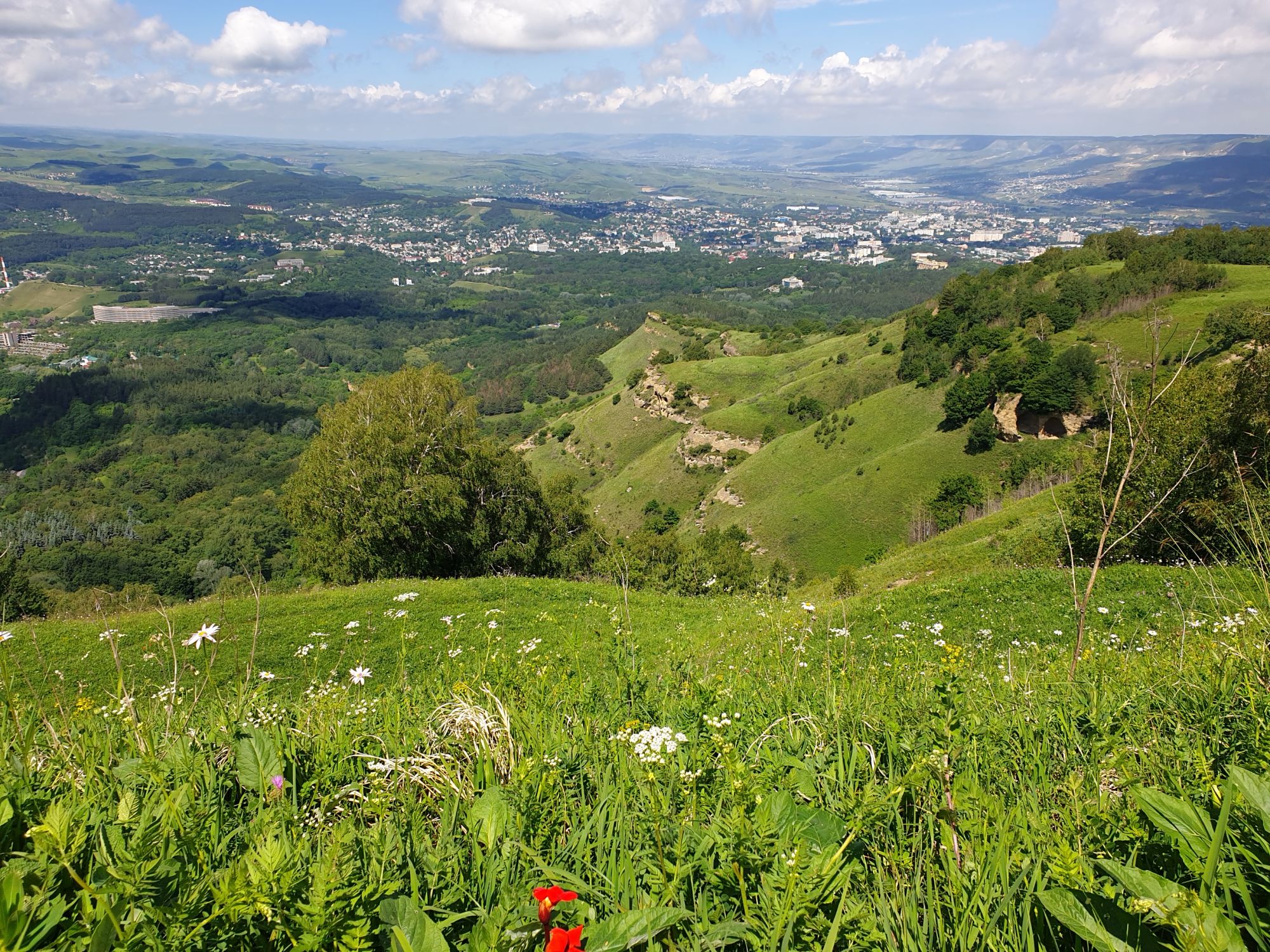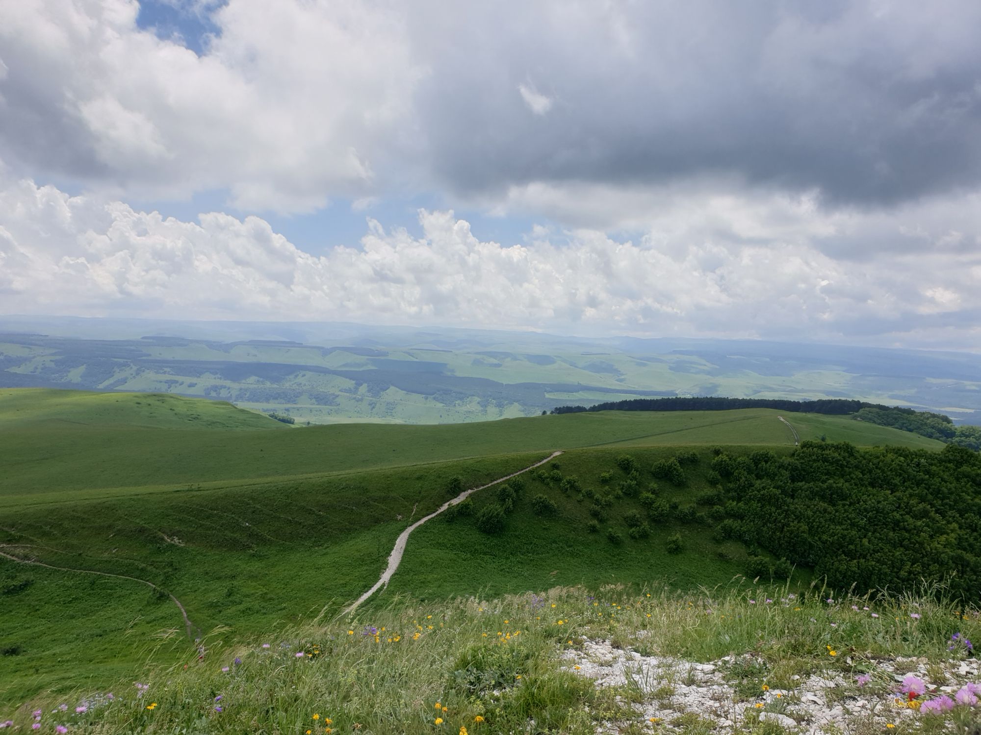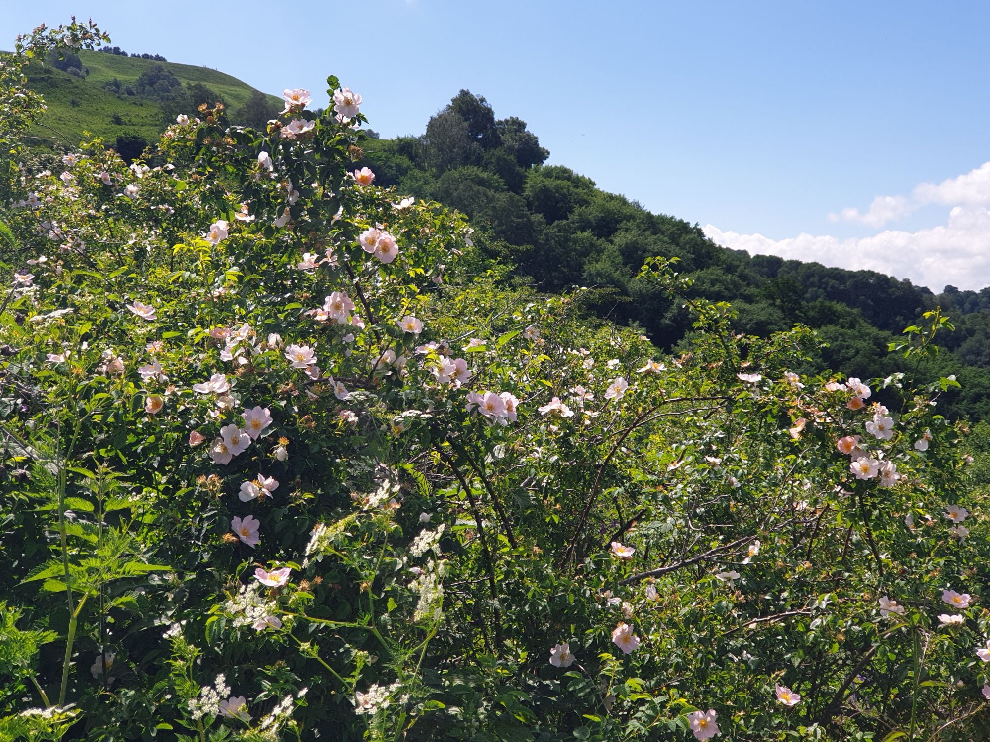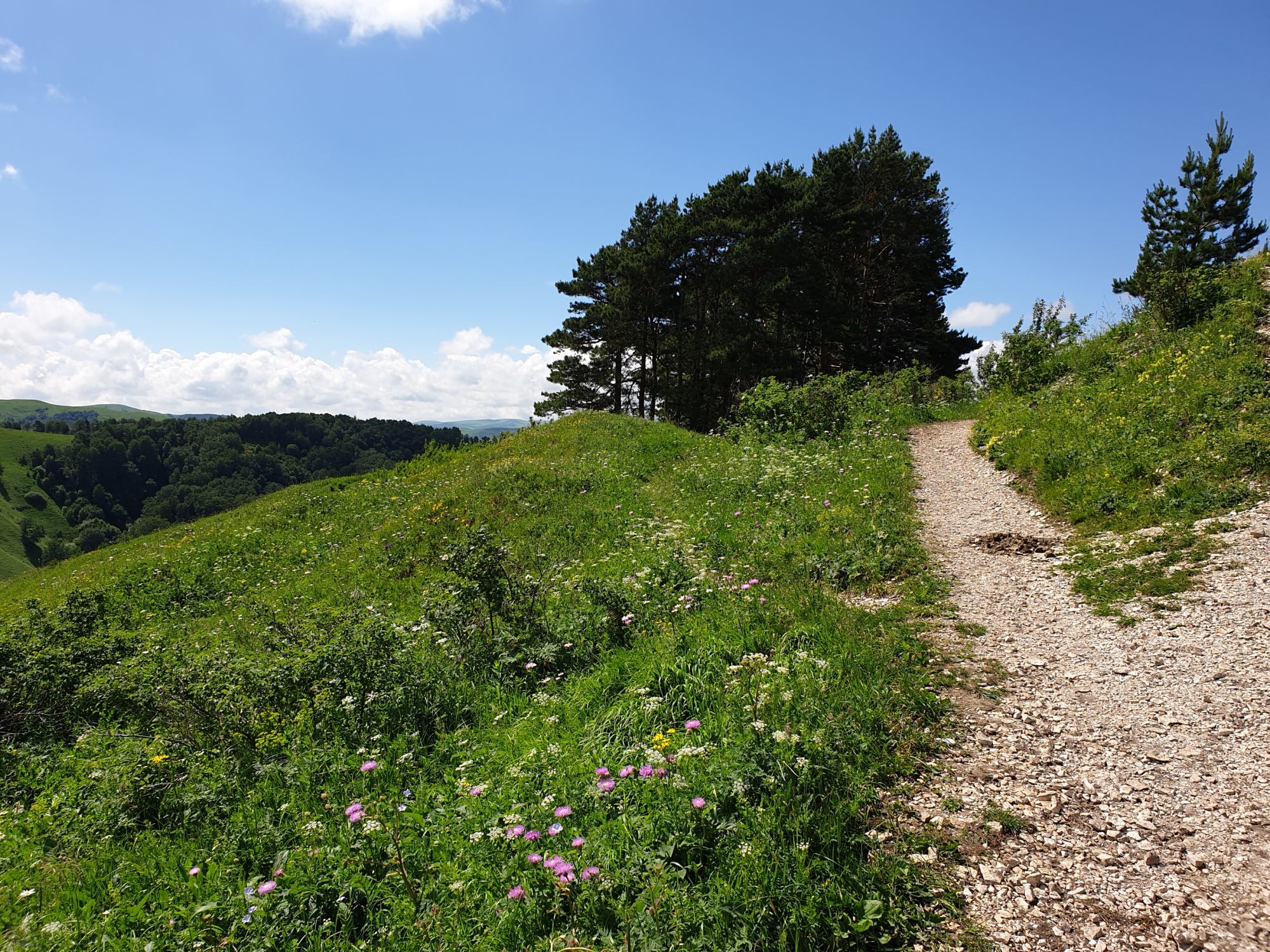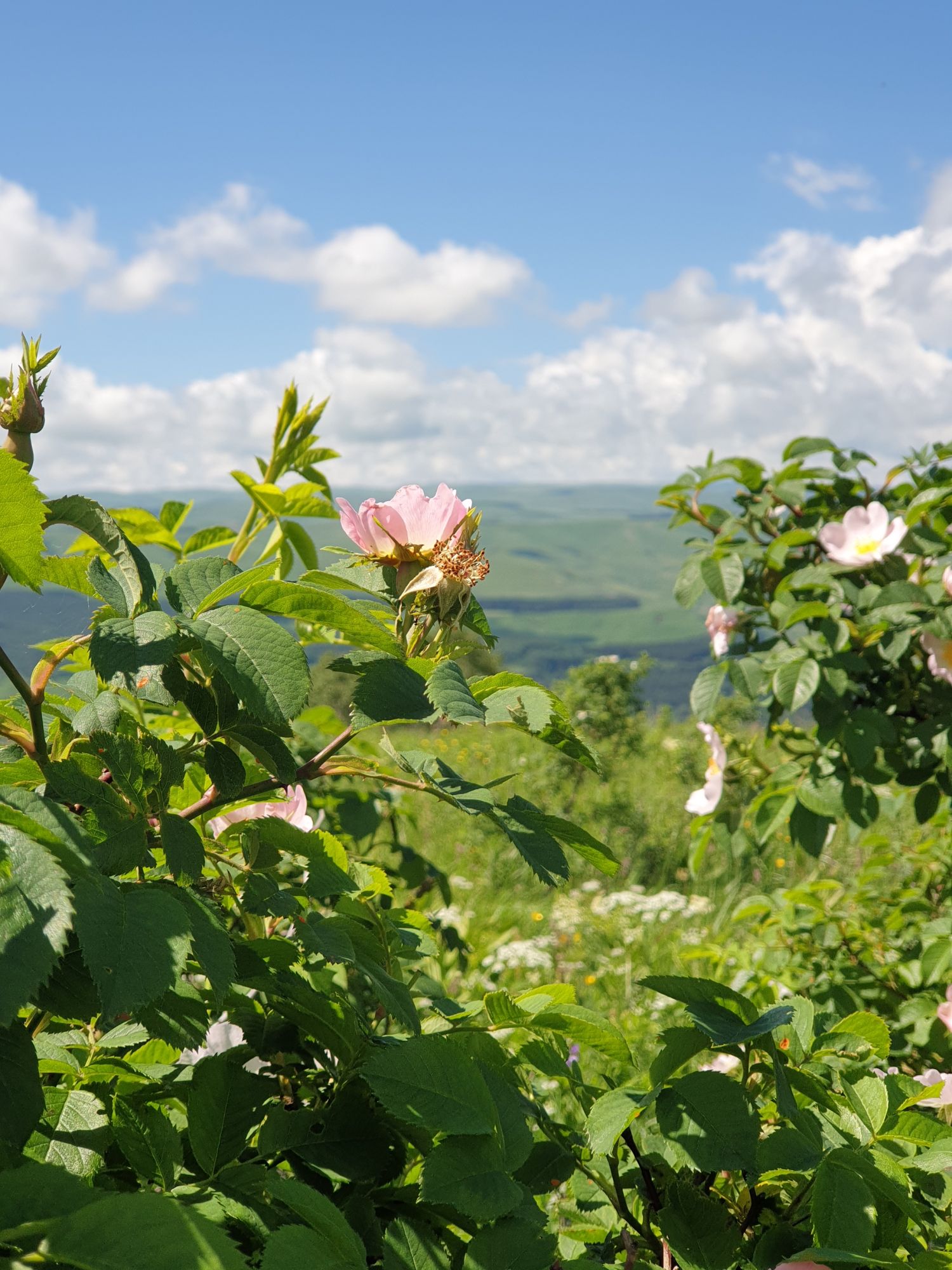 12 июля 2022 Продолжаю про отпуск. В этот раз на нашем пути встало два значимых препятствия. Первое - это дождь. Мы его в принципе не боимся и в курсе, что это время здесь условно называют "сезоном дождей", но в этот раз все было особенно бесперспективно. Увидеть тот же Эльбрус было ну совершенно без шансов: даже в солнечные окна горизонт был плотно затянут этими хорошо взбитыми подушками - облаками. Нам приходилось лавировать между дождями разной степени интенсивности (а ливней было немало) и носить с собой полный комплект экипировки: куртки + дождевики (но это в общем-то самая незначительная трудность). И второе - физическая форма. Карантинные 2020 и 2021 вкупе с не самым активным образом жизни и не желающим уменьшаться возрастом дали о себе знать. Тем более последний год по здоровью выдался у меня сложным. И вот мы наконец там, где дорожек и тропинок бесчисленное количество, равно как и подъемов и спусков разной степени крутизны и продолжительности. Я знала, что будет непросто, но надеялась, что вместе в любимым парком и местным нарзаном мы таки сумеем "включить" мой организм. Первые пару дней было сложно, болели суставы, мышцы, казалось, что я не справлюсь. Километраж в те дни был 12-16 км с максимальной высотой 1100м (средняя высота Кисловодска 700-900 метров нум). В те дни были розы в огромном количестве, много живности от вездесущих белок до редкого зеленого дятла, цветущие кусты чубушника, относящие меня своим ароматом в детство, дорожки и тропинки любимого парка и немножко города. И еще один закрытый "гельштадт": сколько раз смотрела с Каскадной лестницы на "красивый храм вдалеке", ни ни разу не довелось побывать вблизи. Сделано! Хоть и не с первого раза удалось найти к нему проход)) Однажды, гуляя по туристической тропе, я подбила своих на то, чтобы залезть таки в пещеру "хобот", что возвышается над тропой недалеко от ее начала. А то все издалека да издалека: так и не особенно понятно, почему так зовут)) Забрались) Сверху сразу понятно, откуда прозвище. Не знаю, как на фото, а живьем сразу видишь голову слова с хоботом-колонной, что поддерживает свод пещеры)) пещера в конце вот этой тропки-подъема: а вот и хобот) и череда небольших гротов на этом же уступе На третий день я практически полетела. И, о эйфория!, я решила, что готова идти "на пробу" на маршрут посерьезней: к Малому и (хотелось бы) Большому седлу (это 1300 и 1400м с чередой подъемов и спусков). И на 4й день мы пошли туда. И именно в этот день я попала в функциональную яму. Первые км 10 мне каждый шаг давался с трудом, я чуть не плакала внутри, но шла, зная что других способов нет. Медленно, через себя, останавливаясь на самых крутых подъемах чуть ли не через каждые 5 шагов... и упорство таки было вознаграждено. Вторую половину (а в тот день по gps трекеру было порядка 20 км) я шла вполне бодро. А уж внутреннее ликование от "живого организма" было безгранично! И это помимо того, что виды были бесконечно волнующими сердце.. Шиповник! Как же его много здесь на высоте! Кусты разбросаны тут и там и усыпаны нежными, трогательными цветами от белого до нежно-розового. Иногда однотонные, иногда с градиентом цвета цветы на фоне этих бескрайних зеленых просторов волновали до слез. И кто после них рискнет сказать, что не любит розовый цвет? А помимо шиповника все склоны усыпаны цветущими травами. Ромашки (которые нивяник) белые и розовы