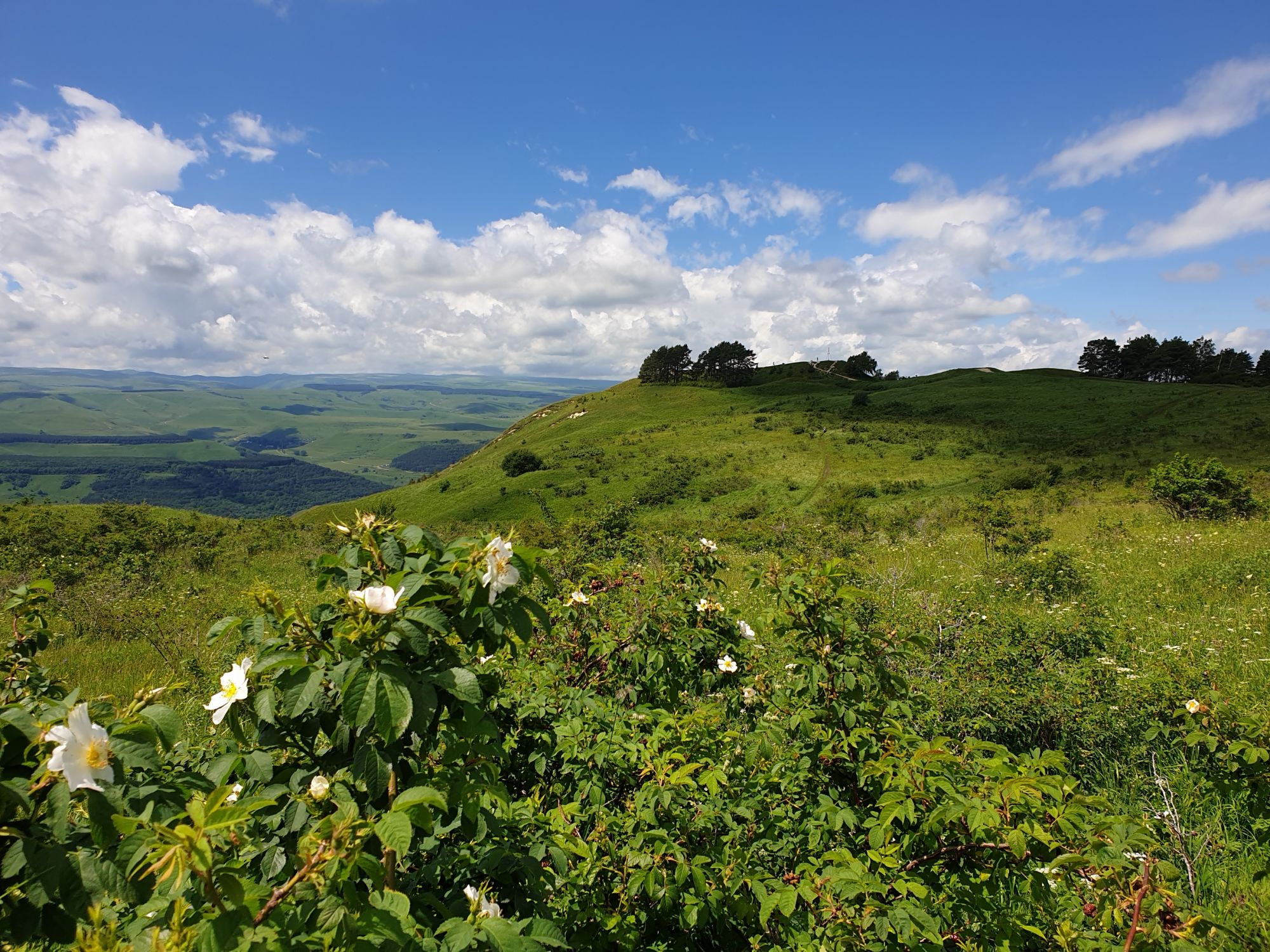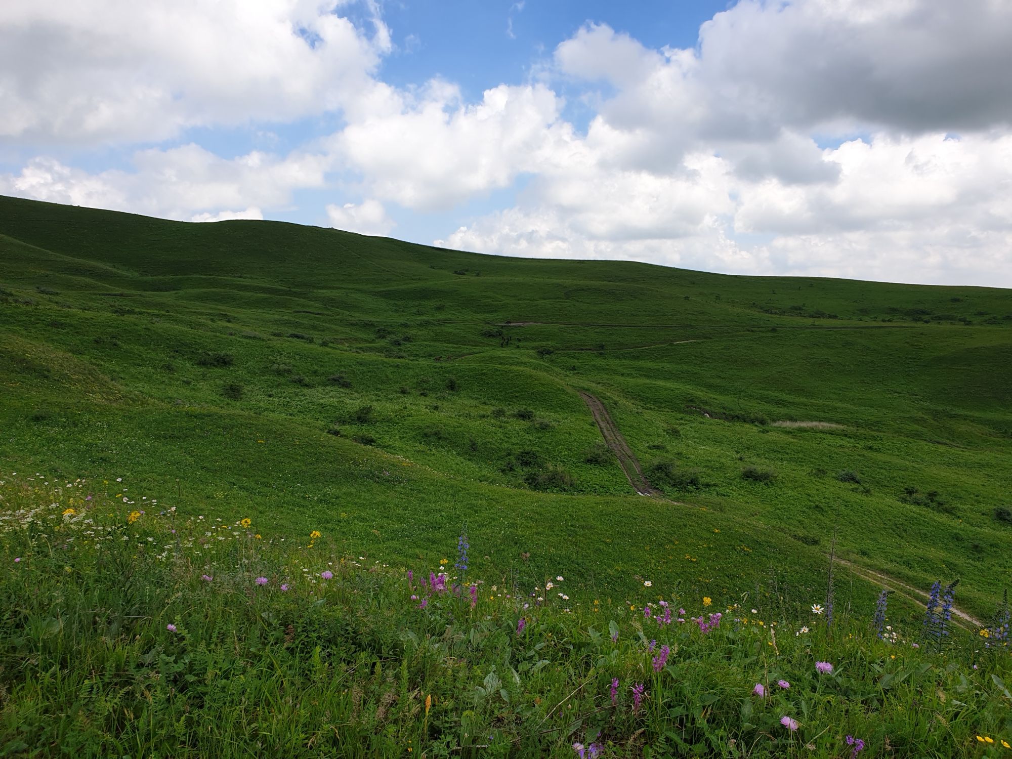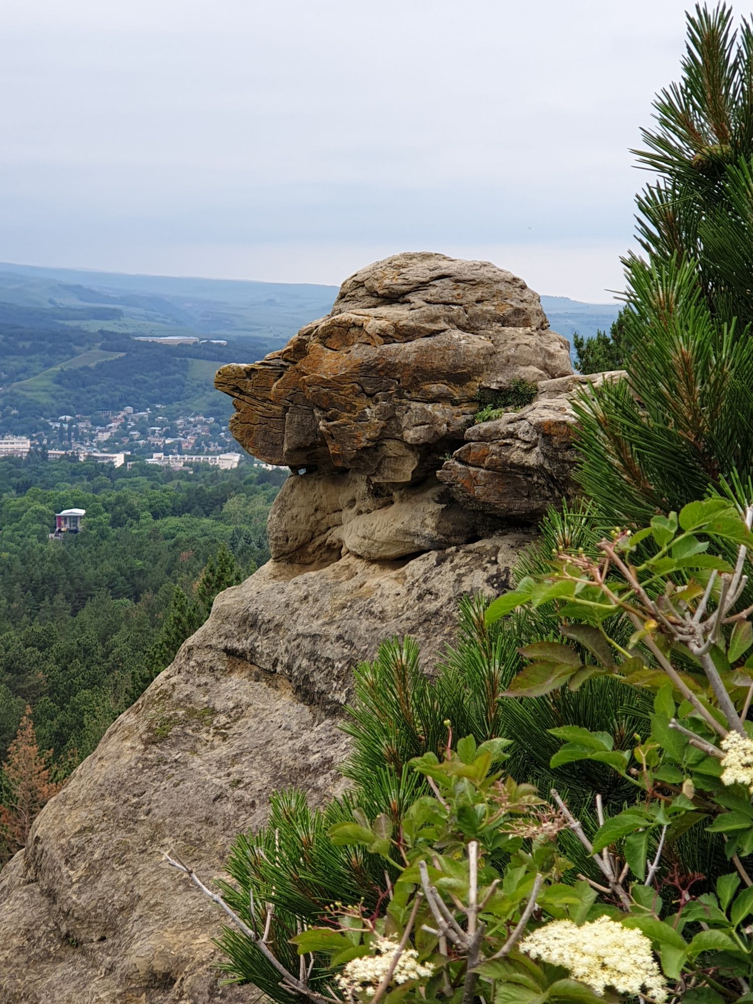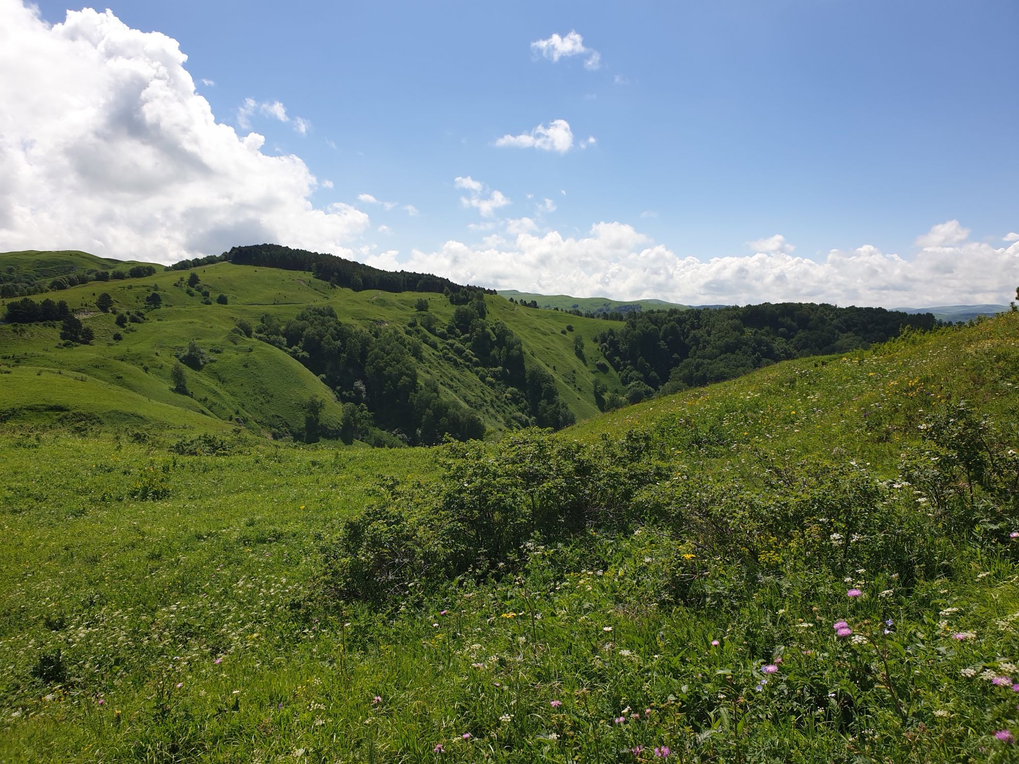 12 июля 2022 Продолжаю про отпуск. В этот раз на нашем пути встало два значимых препятствия. Первое - это дождь. Мы его в принципе не боимся и в курсе, что это время здесь условно называют "сезоном дождей", но в этот раз все было особенно бесперспективно. Увидеть тот же Эльбрус было ну совершенно без шансов: даже в солнечные окна горизонт был плотно затянут этими хорошо взбитыми подушками - облаками. Нам приходилось лавировать между дождями разной степени интенсивности (а ливней было немало) и носить с собой полный комплект экипировки: куртки + дождевики (но это в общем-то самая незначительная трудность). И второе - физическая форма. Карантинные 2020 и 2021 вкупе с не самым активным образом жизни и не желающим уменьшаться возрастом дали о себе знать. Тем более последний год по здоровью выдался у меня сложным. И вот мы наконец там, где дорожек и тропинок бесчисленное количество, равно как и подъемов и спусков разной степени крутизны и продолжительности. Я знала, что будет непросто, но надеялась, что вместе в любимым парком и местным нарзаном мы таки сумеем "включить" мой организм. Первые пару дней было сложно, болели суставы, мышцы, казалось, что я не справлюсь. Километраж в те дни был 12-16 км с максимальной высотой 1100м (средняя высота Кисловодска 700-900 метров нум). В те дни были розы в огромном количестве, много живности от вездесущих белок до редкого зеленого дятла, цветущие кусты чубушника, относящие меня своим ароматом в детство, дорожки и тропинки любимого парка и немножко города. И еще один закрытый "гельштадт": сколько раз смотрела с Каскадной лестницы на "красивый храм вдалеке", ни ни разу не довелось побывать вблизи. Сделано! Хоть и не с первого раза удалось найти к нему проход)) Однажды, гуляя по туристической тропе, я подбила своих на то, чтобы залезть таки в пещеру "хобот", что возвышается над тропой недалеко от ее начала. А то все издалека да издалека: так и не особенно понятно, почему так зовут)) Забрались) Сверху сразу понятно, откуда прозвище. Не знаю, как на фото, а живьем сразу видишь голову слова с хоботом-колонной, что поддерживает свод пещеры)) пещера в конце вот этой тропки-подъема: а вот и хобот) и череда небольших гротов на этом же уступе На третий день я практически полетела. И, о эйфория!, я решила, что готова идти "на пробу" на маршрут посерьезней: к Малому и (хотелось бы) Большому седлу (это 1300 и 1400м с чередой подъемов и спусков). И на 4й день мы пошли туда. И именно в этот день я попала в функциональную яму. Первые км 10 мне каждый шаг давался с трудом, я чуть не плакала внутри, но шла, зная что других способов нет. Медленно, через себя, останавливаясь на самых крутых подъемах чуть ли не через каждые 5 шагов... и упорство таки было вознаграждено. Вторую половину (а в тот день по gps трекеру было порядка 20 км) я шла вполне бодро. А уж внутреннее ликование от "живого организма" было безгранично! И это помимо того, что виды были бесконечно волнующими сердце.. Шиповник! Как же его много здесь на высоте! Кусты разбросаны тут и там и усыпаны нежными, трогательными цветами от белого до нежно-розового. Иногда однотонные, иногда с градиентом цвета цветы на фоне этих бескрайних зеленых просторов волновали до слез. И кто после них рискнет сказать, что не любит розовый цвет? А помимо шиповника все склоны усыпаны цветущими травами. Ромашки (которые нивяник) белые и розовы
