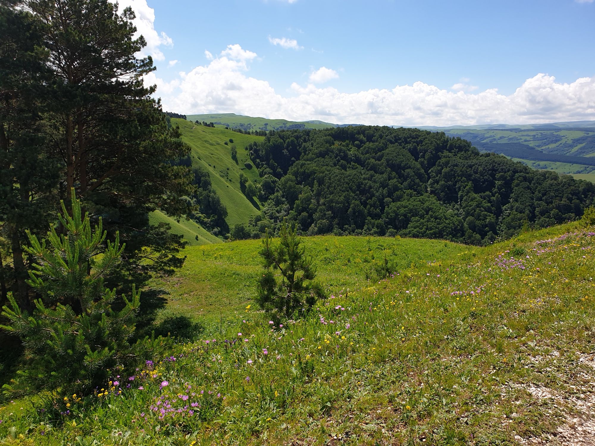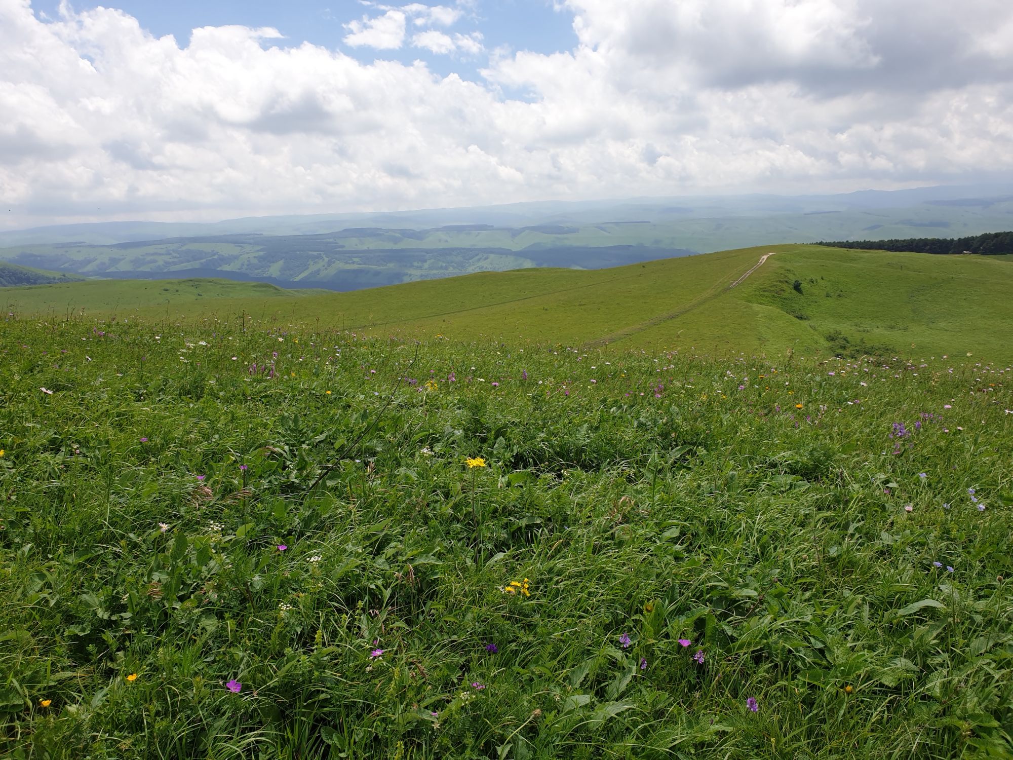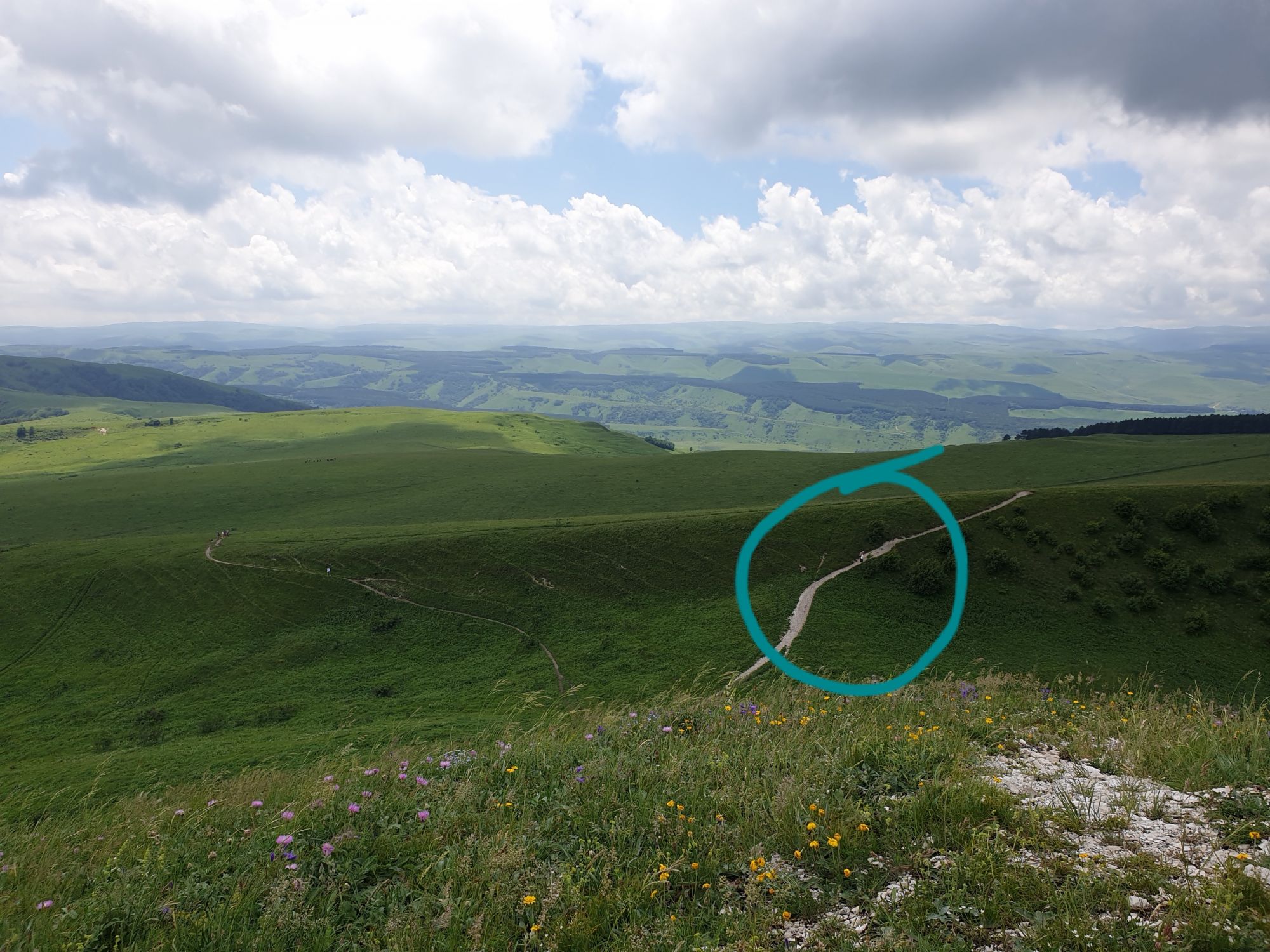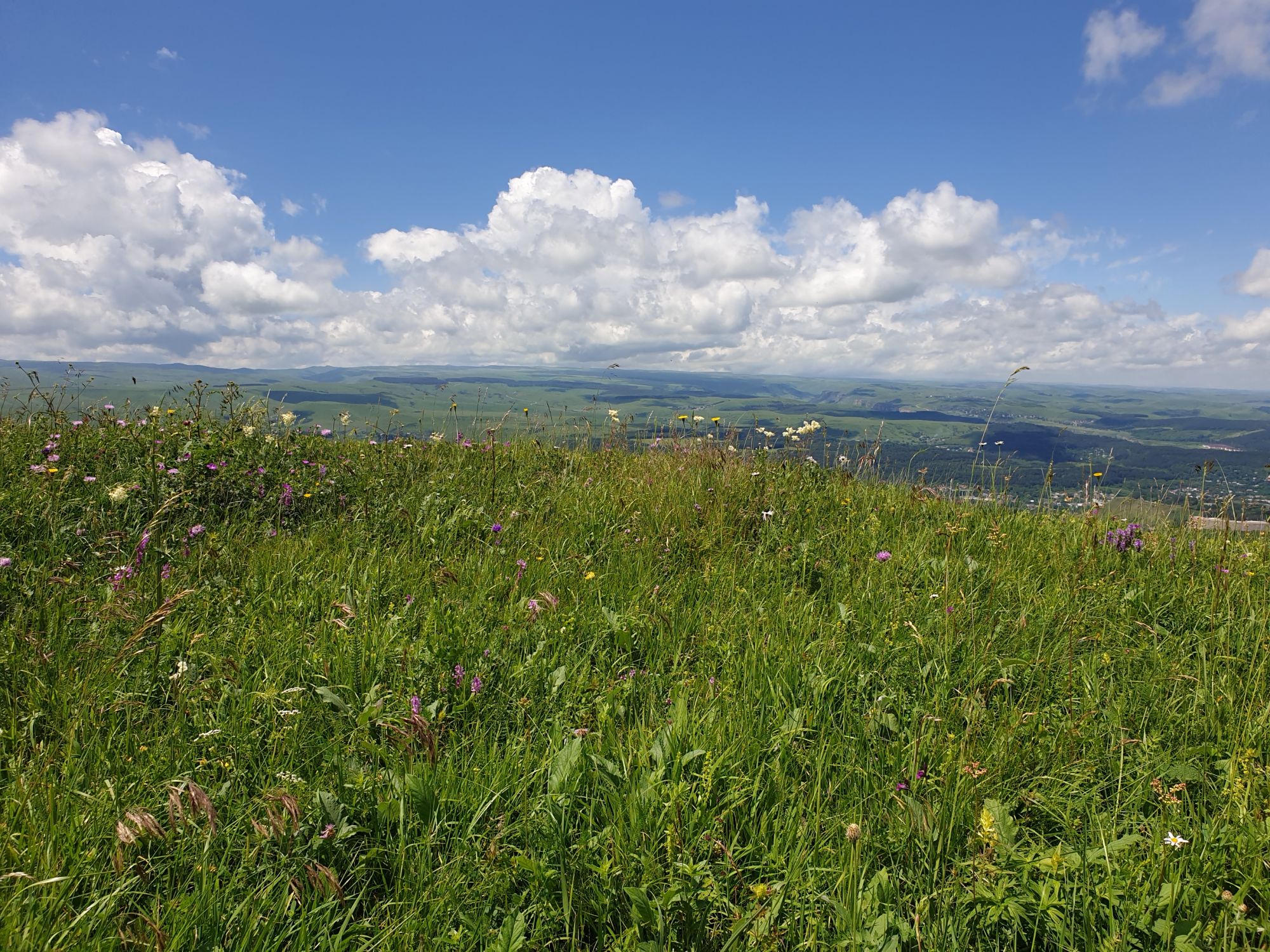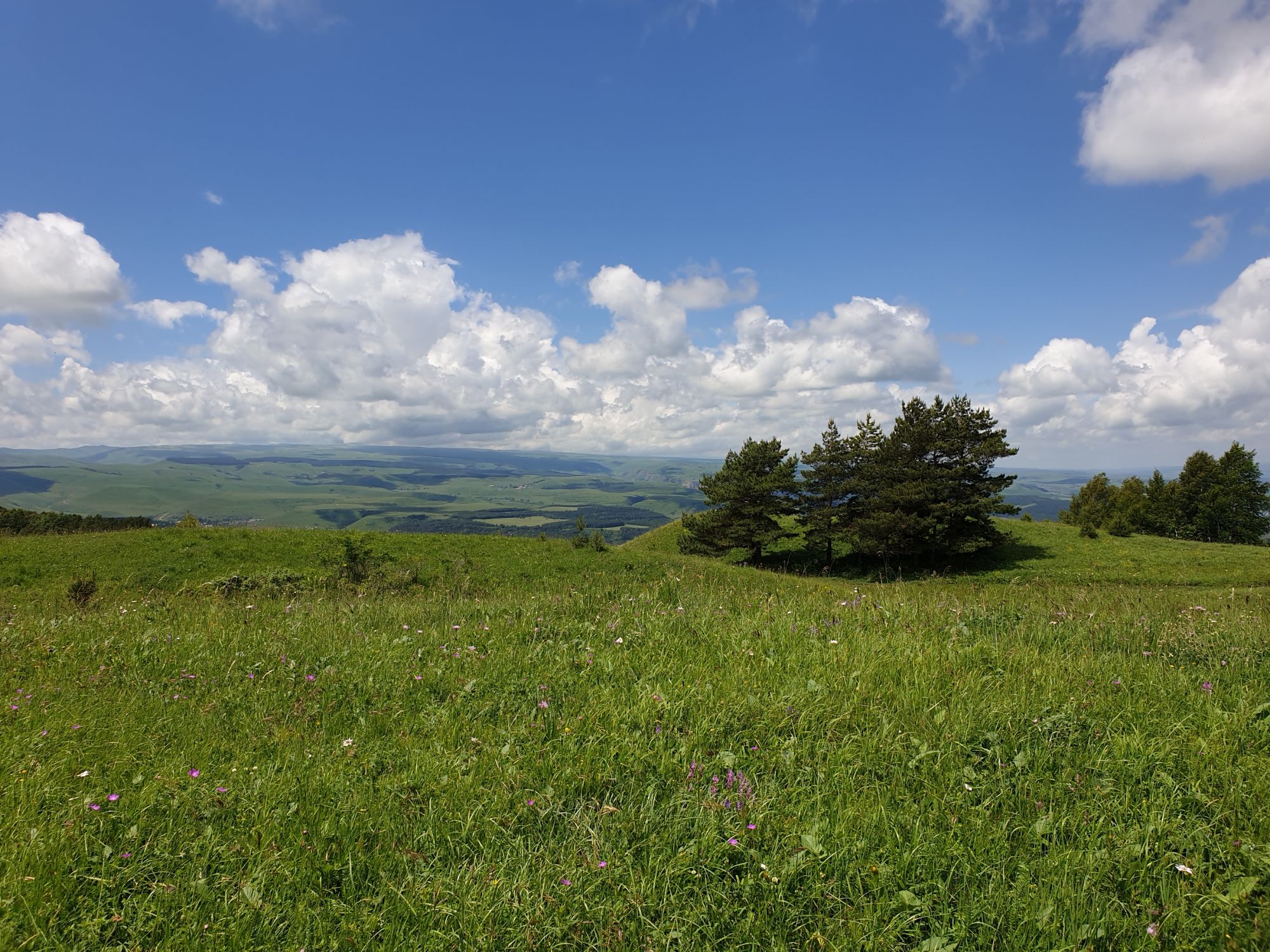 12 июля 2022 Продолжаю про отпуск. В этот раз на нашем пути встало два значимых препятствия. Первое - это дождь. Мы его в принципе не боимся и в курсе, что это время здесь условно называют "сезоном дождей", но в этот раз все было особенно бесперспективно. Увидеть тот же Эльбрус было ну совершенно без шансов: даже в солнечные окна горизонт был плотно затянут этими хорошо взбитыми подушками - облаками. Нам приходилось лавировать между дождями разной степени интенсивности (а ливней было немало) и носить с собой полный комплект экипировки: куртки + дождевики (но это в общем-то самая незначительная трудность). И второе - физическая форма. Карантинные 2020 и 2021 вкупе с не самым активным образом жизни и не желающим уменьшаться возрастом дали о себе знать. Тем более последний год по здоровью выдался у меня сложным. И вот мы наконец там, где дорожек и тропинок бесчисленное количество, равно как и подъемов и спусков разной степени крутизны и продолжительности. Я знала, что будет непросто, но надеялась, что вместе в любимым парком и местным нарзаном мы таки сумеем "включить" мой организм. Первые пару дней было сложно, болели суставы, мышцы, казалось, что я не справлюсь. Километраж в те дни был 12-16 км с максимальной высотой 1100м (средняя высота Кисловодска 700-900 метров нум). В те дни были розы в огромном количестве, много живности от вездесущих белок до редкого зеленого дятла, цветущие кусты чубушника, относящие меня своим ароматом в детство, дорожки и тропинки любимого парка и немножко города. И еще один закрытый "гельштадт": сколько раз смотрела с Каскадной лестницы на "красивый храм вдалеке", ни ни разу не довелось побывать вблизи. Сделано! Хоть и не с первого раза удалось найти к нему проход)) Однажды, гуляя по туристической тропе, я подбила своих на то, чтобы залезть таки в пещеру "хобот", что возвышается над тропой недалеко от ее начала. А то все издалека да издалека: так и не особенно понятно, почему так зовут)) Забрались) Сверху сразу понятно, откуда прозвище. Не знаю, как на фото, а живьем сразу видишь голову слова с хоботом-колонной, что поддерживает свод пещеры)) пещера в конце вот этой тропки-подъема: а вот и хобот) и череда небольших гротов на этом же уступе На третий день я практически полетела. И, о эйфория!, я решила, что готова идти "на пробу" на маршрут посерьезней: к Малому и (хотелось бы) Большому седлу (это 1300 и 1400м с чередой подъемов и спусков). И на 4й день мы пошли туда. И именно в этот день я попала в функциональную яму. Первые км 10 мне каждый шаг давался с трудом, я чуть не плакала внутри, но шла, зная что других способов нет. Медленно, через себя, останавливаясь на самых крутых подъемах чуть ли не через каждые 5 шагов... и упорство таки было вознаграждено. Вторую половину (а в тот день по gps трекеру было порядка 20 км) я шла вполне бодро. А уж внутреннее ликование от "живого организма" было безгранично! И это помимо того, что виды были бесконечно волнующими сердце.. Шиповник! Как же его много здесь на высоте! Кусты разбросаны тут и там и усыпаны нежными, трогательными цветами от белого до нежно-розового. Иногда однотонные, иногда с градиентом цвета цветы на фоне этих бескрайних зеленых просторов волновали до слез. И кто после них рискнет сказать, что не любит розовый цвет? А помимо шиповника все склоны усыпаны цветущими травами. Ромашки (которые нивяник) белые и розовы