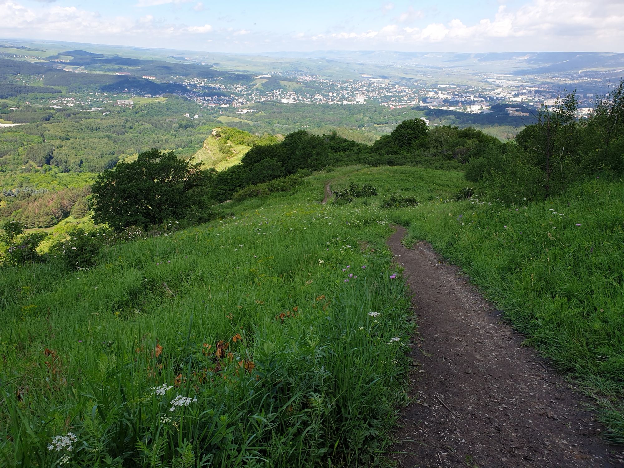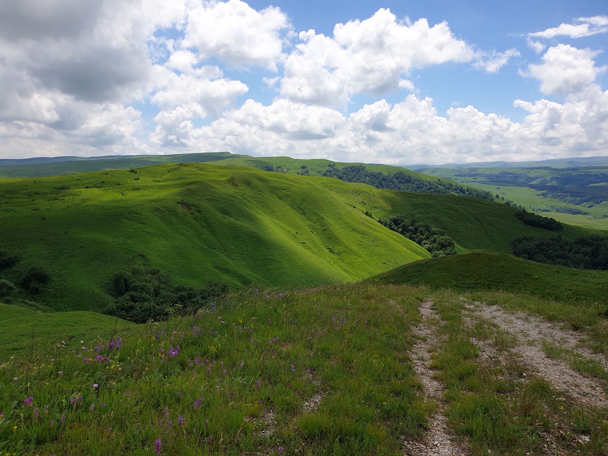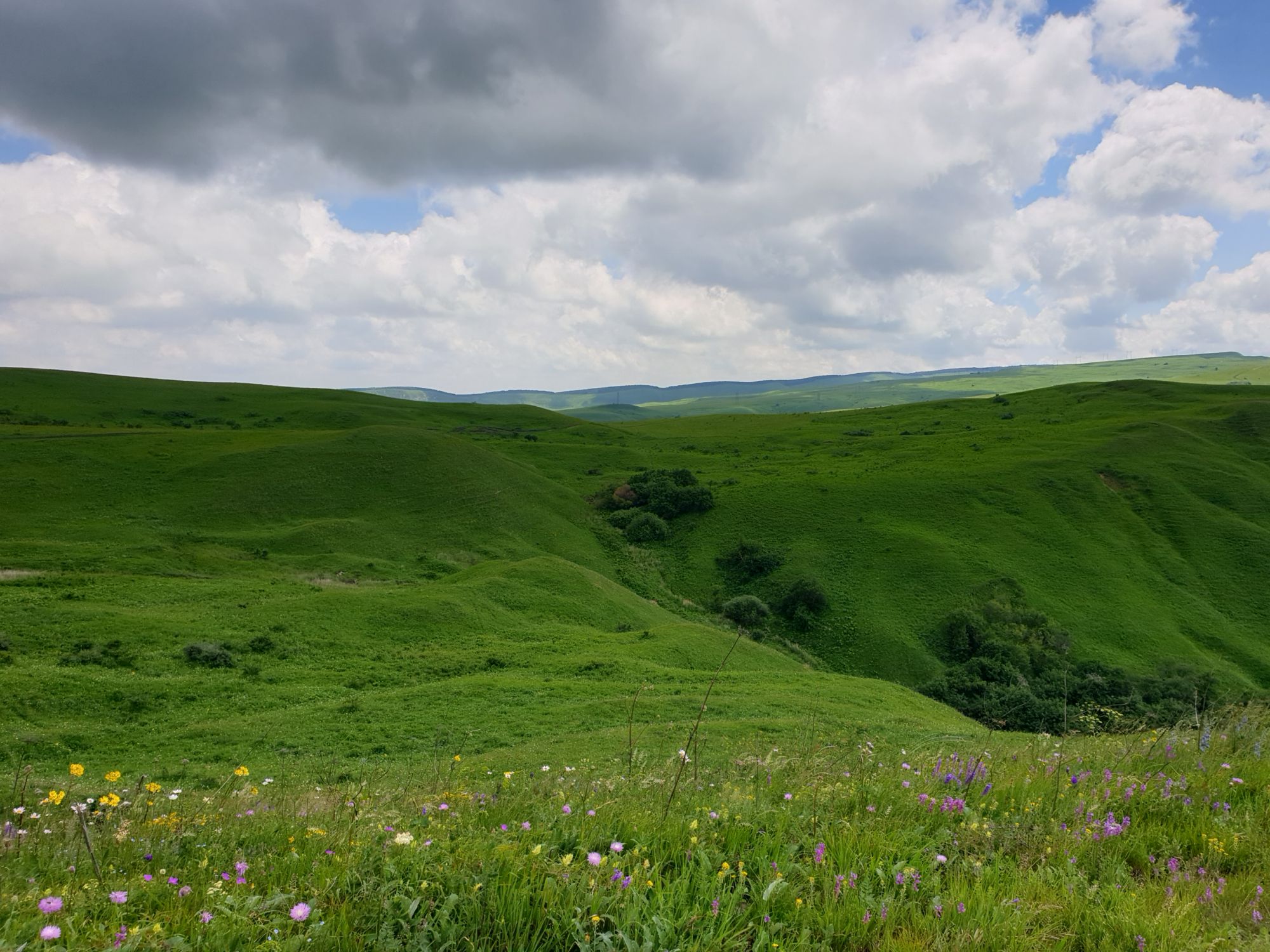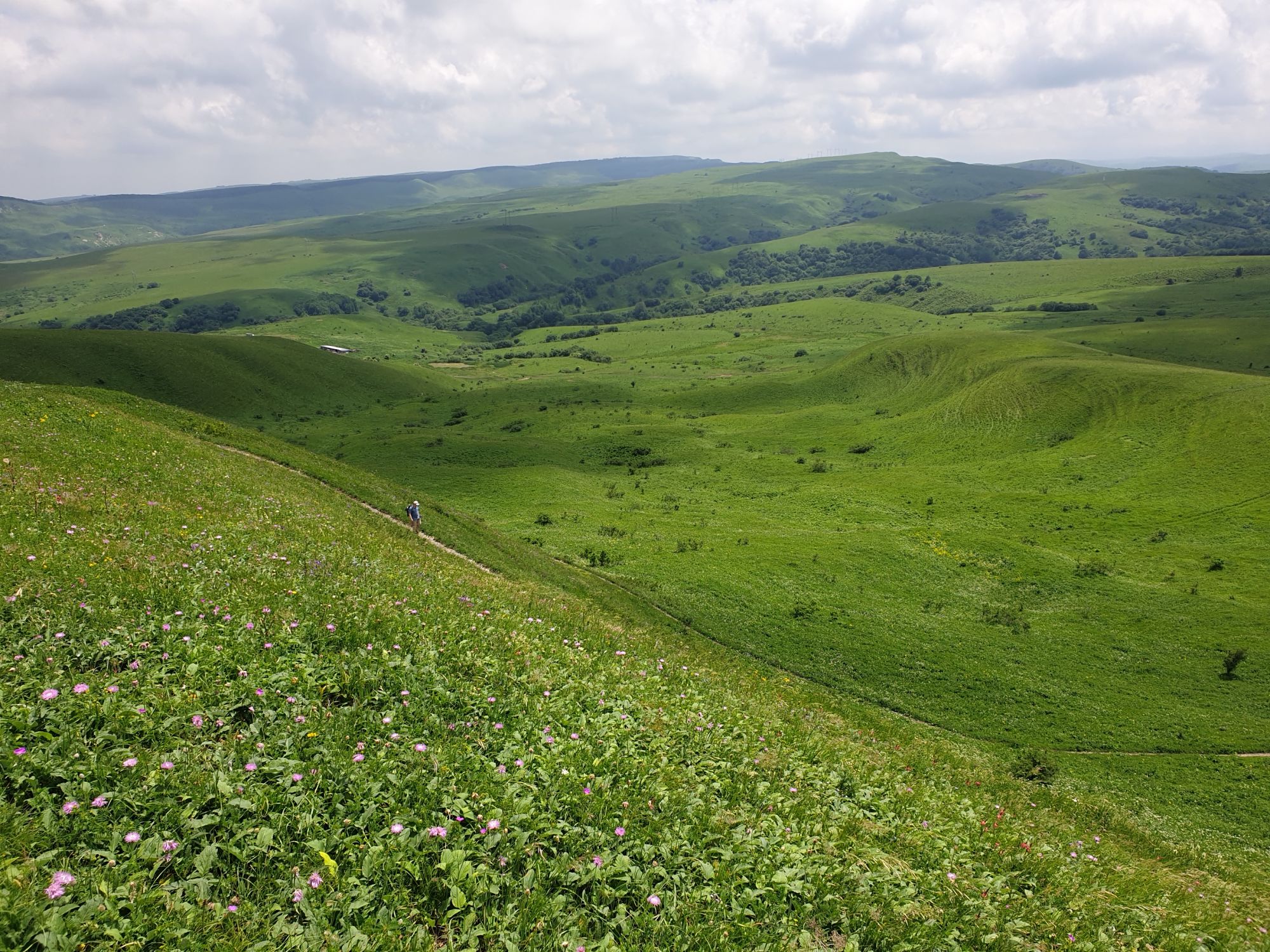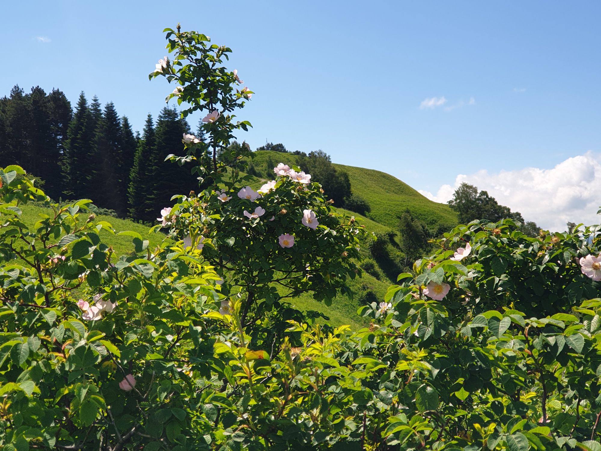 12 июля 2022 Продолжаю про отпуск. В этот раз на нашем пути встало два значимых препятствия. Первое - это дождь. Мы его в принципе не боимся и в курсе, что это время здесь условно называют "сезоном дождей", но в этот раз все было особенно бесперспективно. Увидеть тот же Эльбрус было ну совершенно без шансов: даже в солнечные окна горизонт был плотно затянут этими хорошо взбитыми подушками - облаками. Нам приходилось лавировать между дождями разной степени интенсивности (а ливней было немало) и носить с собой полный комплект экипировки: куртки + дождевики (но это в общем-то самая незначительная трудность). И второе - физическая форма. Карантинные 2020 и 2021 вкупе с не самым активным образом жизни и не желающим уменьшаться возрастом дали о себе знать. Тем более последний год по здоровью выдался у меня сложным. И вот мы наконец там, где дорожек и тропинок бесчисленное количество, равно как и подъемов и спусков разной степени крутизны и продолжительности. Я знала, что будет непросто, но надеялась, что вместе в любимым парком и местным нарзаном мы таки сумеем "включить" мой организм. Первые пару дней было сложно, болели суставы, мышцы, казалось, что я не справлюсь. Километраж в те дни был 12-16 км с максимальной высотой 1100м (средняя высота Кисловодска 700-900 метров нум). В те дни были розы в огромном количестве, много живности от вездесущих белок до редкого зеленого дятла, цветущие кусты чубушника, относящие меня своим ароматом в детство, дорожки и тропинки любимого парка и немножко города. И еще один закрытый "гельштадт": сколько раз смотрела с Каскадной лестницы на "красивый храм вдалеке", ни ни разу не довелось побывать вблизи. Сделано! Хоть и не с первого раза удалось найти к нему проход)) Однажды, гуляя по туристической тропе, я подбила своих на то, чтобы залезть таки в пещеру "хобот", что возвышается над тропой недалеко от ее начала. А то все издалека да издалека: так и не особенно понятно, почему так зовут)) Забрались) Сверху сразу понятно, откуда прозвище. Не знаю, как на фото, а живьем сразу видишь голову слова с хоботом-колонной, что поддерживает свод пещеры)) пещера в конце вот этой тропки-подъема: а вот и хобот) и череда небольших гротов на этом же уступе На третий день я практически полетела. И, о эйфория!, я решила, что готова идти "на пробу" на маршрут посерьезней: к Малому и (хотелось бы) Большому седлу (это 1300 и 1400м с чередой подъемов и спусков). И на 4й день мы пошли туда. И именно в этот день я попала в функциональную яму. Первые км 10 мне каждый шаг давался с трудом, я чуть не плакала внутри, но шла, зная что других способов нет. Медленно, через себя, останавливаясь на самых крутых подъемах чуть ли не через каждые 5 шагов... и упорство таки было вознаграждено. Вторую половину (а в тот день по gps трекеру было порядка 20 км) я шла вполне бодро. А уж внутреннее ликование от "живого организма" было безгранично! И это помимо того, что виды были бесконечно волнующими сердце.. Шиповник! Как же его много здесь на высоте! Кусты разбросаны тут и там и усыпаны нежными, трогательными цветами от белого до нежно-розового. Иногда однотонные, иногда с градиентом цвета цветы на фоне этих бескрайних зеленых просторов волновали до слез. И кто после них рискнет сказать, что не любит розовый цвет? А помимо шиповника все склоны усыпаны цветущими травами. Ромашки (которые нивяник) белые и розовы