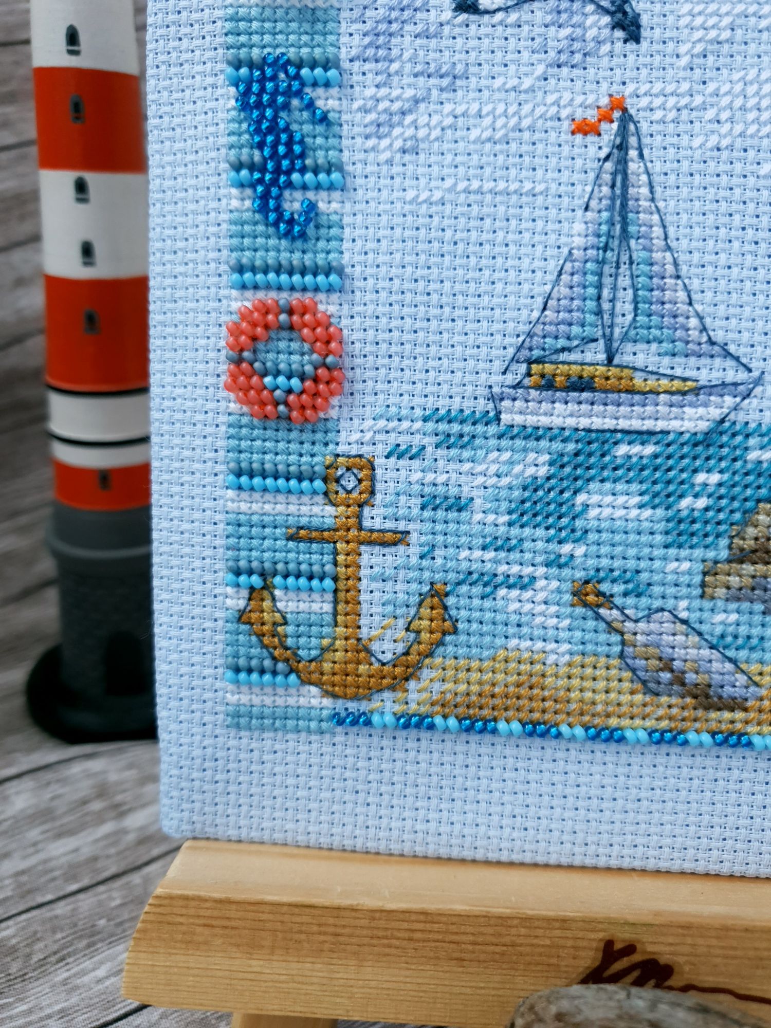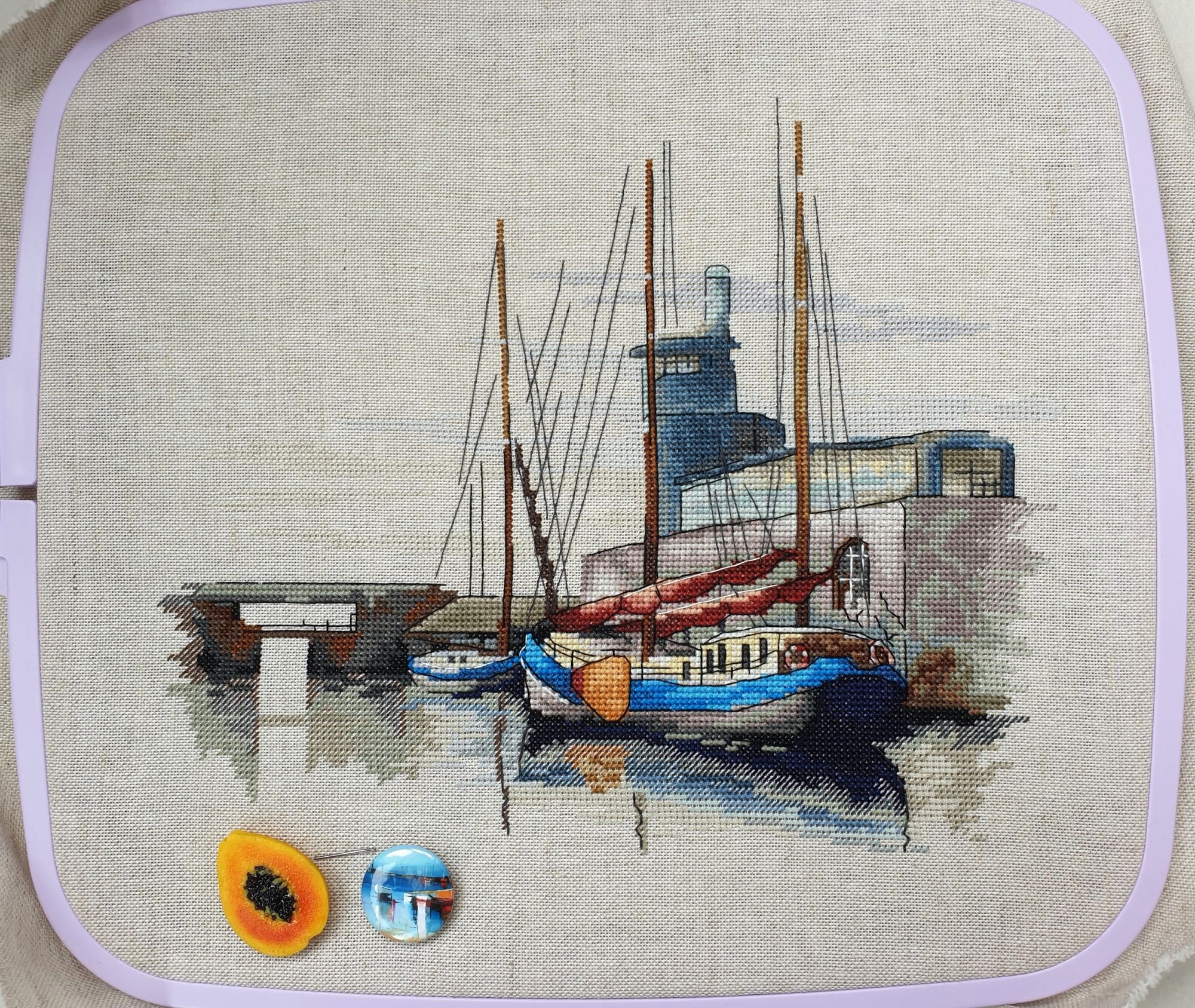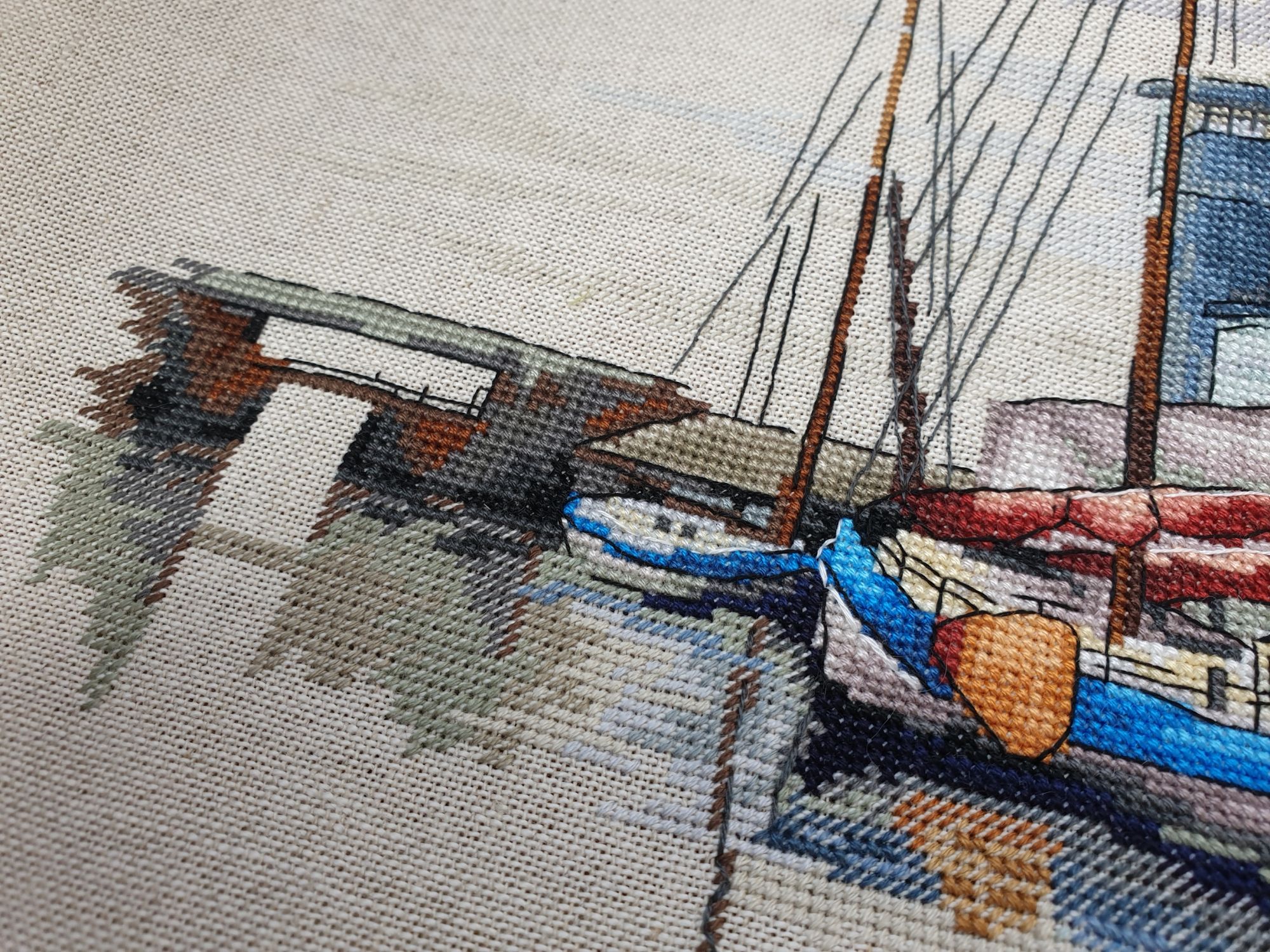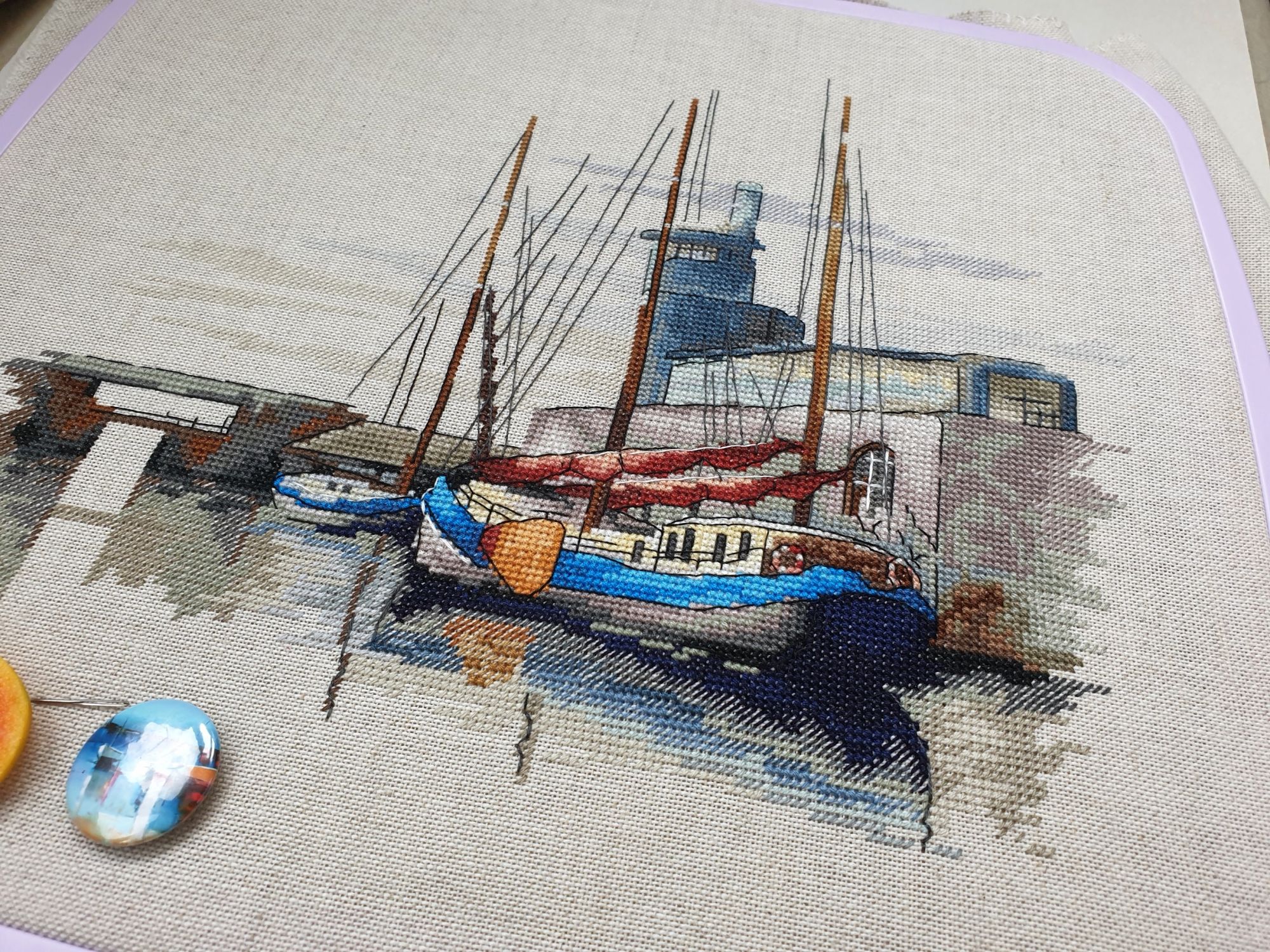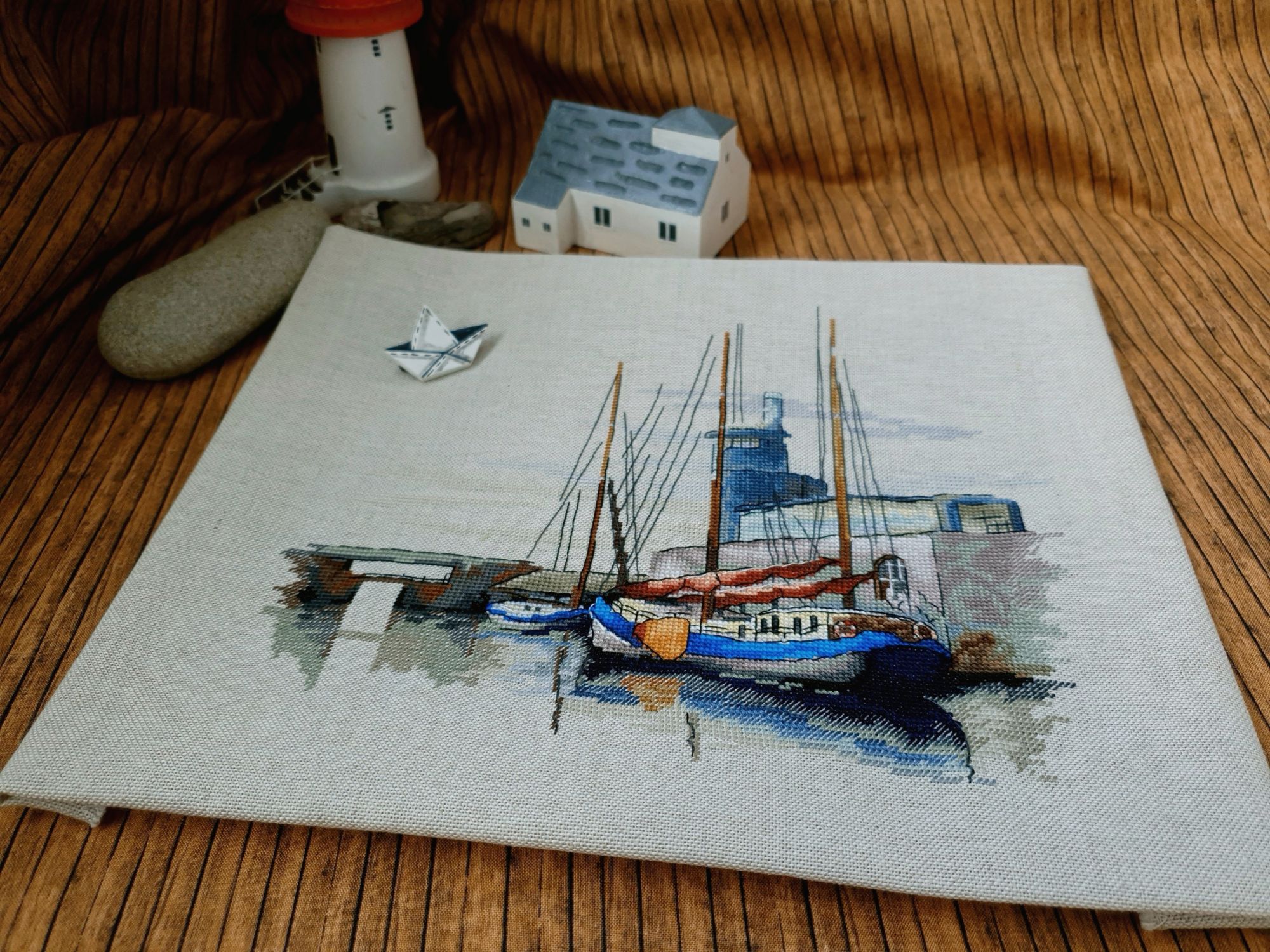 22 июля 2022 Вечер добрый! Наконец-то вышивальный отчет. Получается, что он почти за весь июль и даже немного за конец июня И куда только бежит время?! По традиции, сначала часть невышивальная. В этот раз безо всякой конкретики, просто хроника этого июля: от цветущих болотных ирисов и до ночного порта, котолапок и неожиданного цветущего подарка на подоконнике)) Нам, вышивальщицам, подвластно расширение пространства, мы можем бывать в двух разных местах одновременно. Вот так и я, отправляясь в отпуск в горы, в качестве дорожного процесса взяла миниатюру в освежающе-синей водной гамме и тематике))) Permin 92-9161, 3 boats (этот) - новый процесс и финиш! Миниатюра 14*18 см, да еще и на 14й аиде подошла для вышивания в отпуске в целом, и в машине в частности, идеально. А потому, отпуск начался с первыми крестиками, а закончился с финальными. Мне оставалось только бэк доделать. Ну и решить один мучивший меня вопрос, о котором дальше. Я вообще Пермин уважаю. У них есть свой шарм. И море они, как жители северных морей, чувствуют и передают в своих дизайнах очень точно. Мне близко это настроение. Хотя порой и чуточку не хватает немного "мягкости" переходов. Здесь все было супер, пока я не осознала, что белые участки - это незашитое пространство. В целом мне этот прием не раз попадался и выглядело все норм. Но тут маленький размер, крупная канва и кругом только крест в 2 нити... Я ничего не предпринимала до последнего крестика по схеме. Потому что знаю, как может все изменить один единственный крестик. Но вот пора приступать к бэку, а у меня есть ощущение проплешин. А моя вышивка не должна раздражать, причем именно меня)) Поэтому я вооружилась картой цветов, выбрала самые светлые оттенки в растяжках соответствующих цветов и зашила эти проплешины в 1 нить: полукрестом во "внутренностях лодок" и крестом на остальных участках. Теперь мне все нравится Осталось придумать какое-нибудь классное применение этим лодкам: хочется, чтобы они и впредь со мной путешествовали в виде какого-нибудь полезного аксессуара)) - На этих последних фото хорошо видны "проплешины", по схеме они не зашиваются вовсе. И мой результат: Дальше опять про лодки. Только уже процесс из стареньких) О.Ланкевич, Голландский порт - финиш! Я это сделала! Результат классный, процесс интересный, но завершение далось непросто. Подозреваю, что дело в цветовой гамме: летом, да еще и после такого яркого по цветам отпуска было непросто шить темными и серо-зелеными оттенками. Мешала их с вышивкой корпуса и парусов. Почему то именно сейчас невероятно хотелось закончить этот процесс. Отражения волшебные: как же круто они сделаны. А уж как я тянула снасти на лодках, выгребая среди бесконечно пересекающихся длинных линий. Но я молодец, не отложила и доделала! Горда собой и рада результату. Классный он. Вот правда)) И итоговый фотосет: Чтобы разбавить мир процесс с портом яркими красками, я распаковала еще один маленький летний наборчик. Из недавних совсем. С маяком! И с бисером! Ага, все правильно, мне очень захотелось попробовать новую серию "Бисер и пуговки" от Марьи Искусницы на вкус))) Марья Искусница, 13.003.13, Маяк (этот) - новый процесс и финиш! Миниатюра 14*14 см, 14 аида, нитки, 4 цвета бисера и 2 шармика. Тут есть два нюанса. Во-первых, нитки не разобраны по номерам, они в едином пучке, в а ключе только словесные названия цветов. Я честно призна