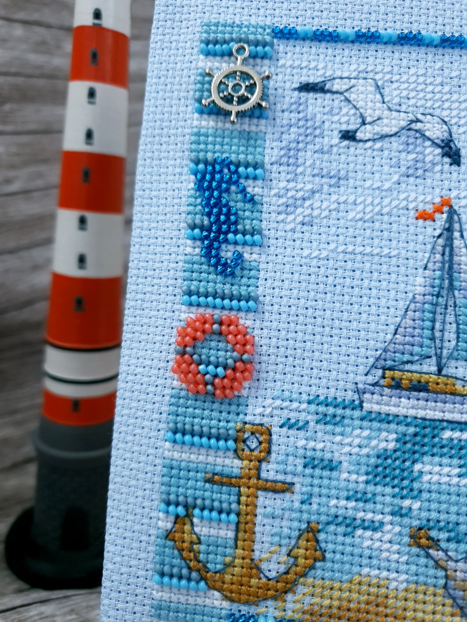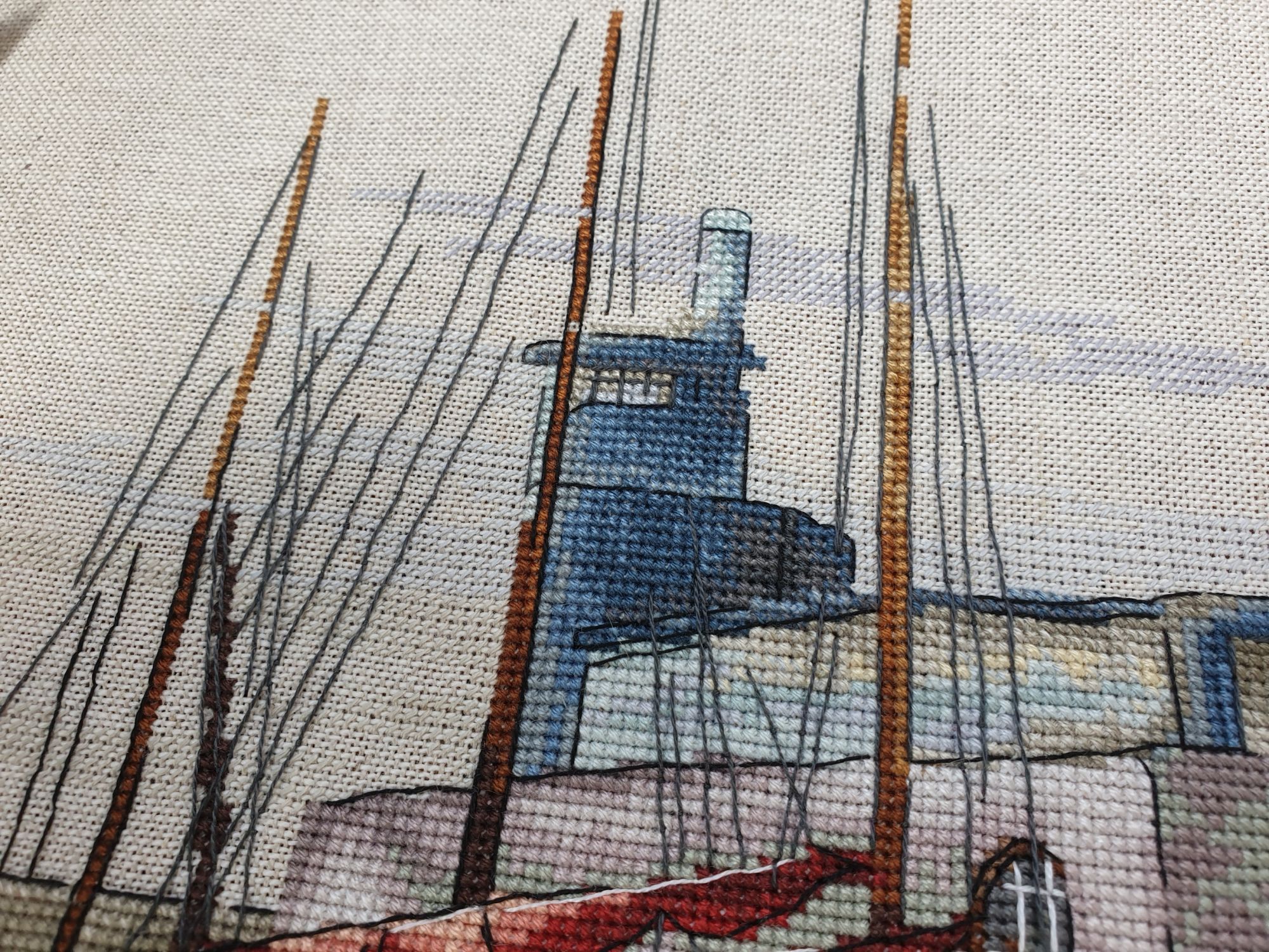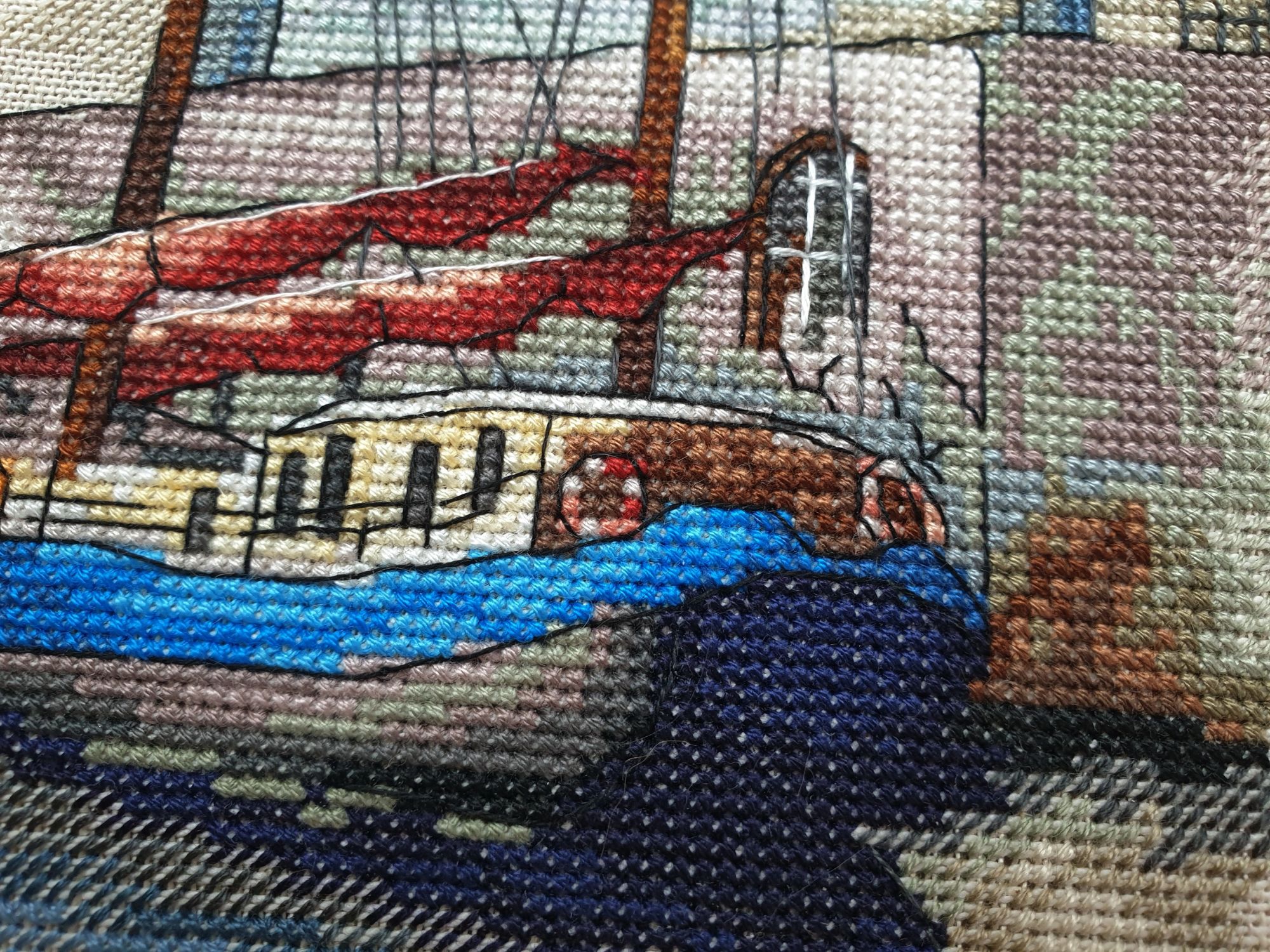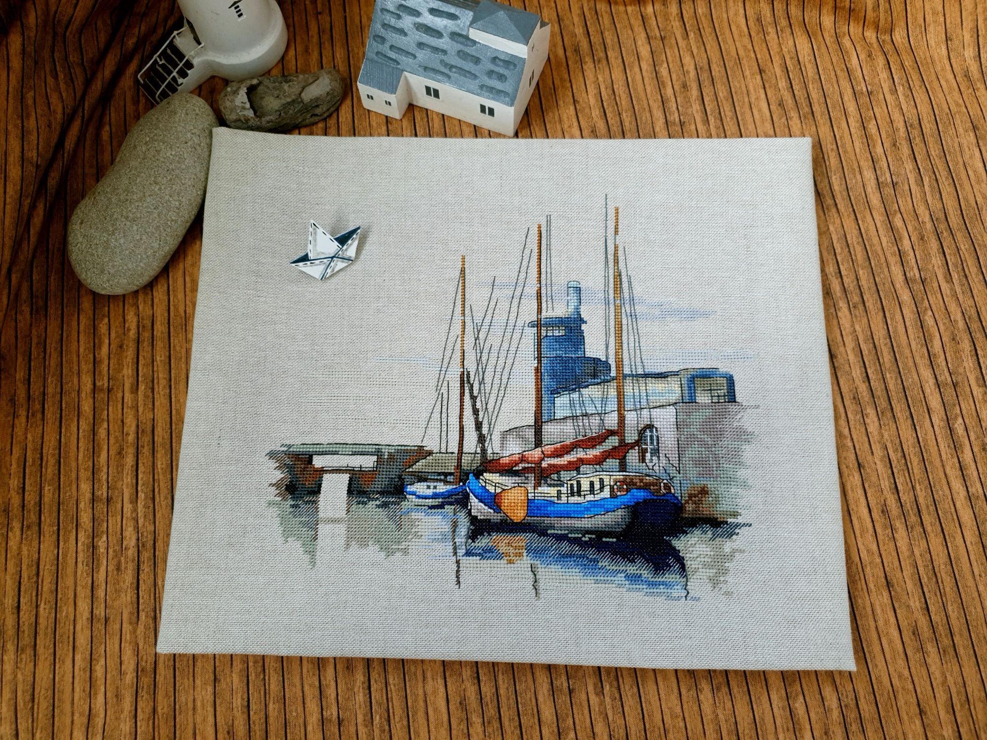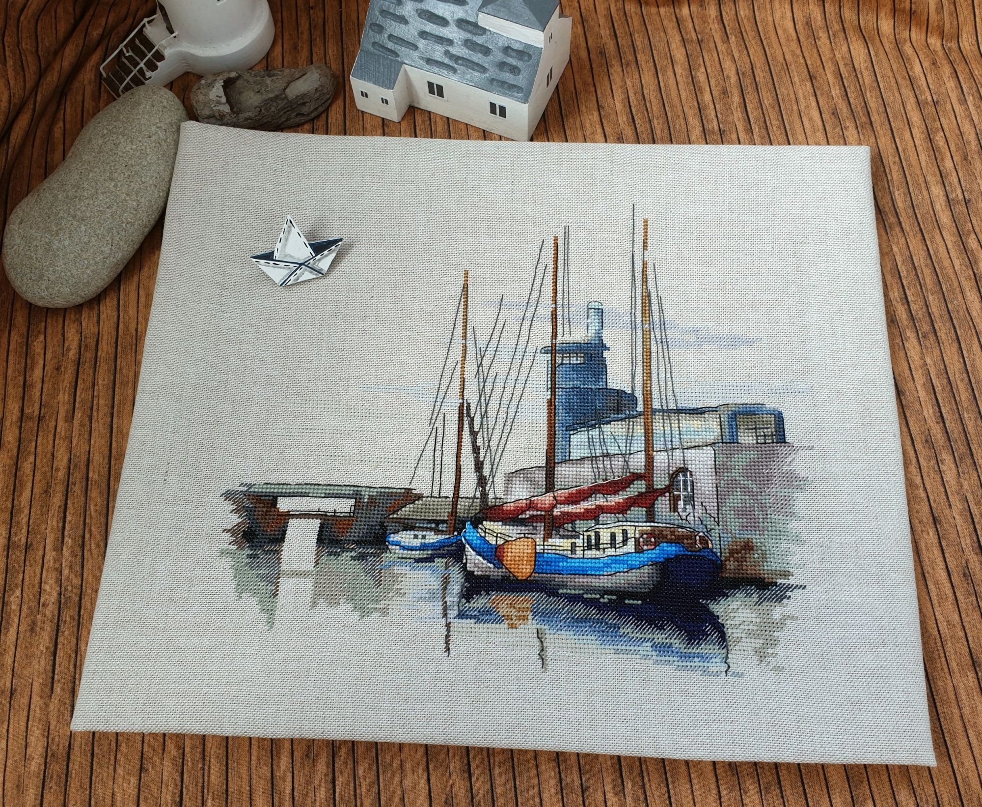 22 июля 2022 Вечер добрый! Наконец-то вышивальный отчет. Получается, что он почти за весь июль и даже немного за конец июня И куда только бежит время?! По традиции, сначала часть невышивальная. В этот раз безо всякой конкретики, просто хроника этого июля: от цветущих болотных ирисов и до ночного порта, котолапок и неожиданного цветущего подарка на подоконнике)) Нам, вышивальщицам, подвластно расширение пространства, мы можем бывать в двух разных местах одновременно. Вот так и я, отправляясь в отпуск в горы, в качестве дорожного процесса взяла миниатюру в освежающе-синей водной гамме и тематике))) Permin 92-9161, 3 boats (этот) - новый процесс и финиш! Миниатюра 14*18 см, да еще и на 14й аиде подошла для вышивания в отпуске в целом, и в машине в частности, идеально. А потому, отпуск начался с первыми крестиками, а закончился с финальными. Мне оставалось только бэк доделать. Ну и решить один мучивший меня вопрос, о котором дальше. Я вообще Пермин уважаю. У них есть свой шарм. И море они, как жители северных морей, чувствуют и передают в своих дизайнах очень точно. Мне близко это настроение. Хотя порой и чуточку не хватает немного "мягкости" переходов. Здесь все было супер, пока я не осознала, что белые участки - это незашитое пространство. В целом мне этот прием не раз попадался и выглядело все норм. Но тут маленький размер, крупная канва и кругом только крест в 2 нити... Я ничего не предпринимала до последнего крестика по схеме. Потому что знаю, как может все изменить один единственный крестик. Но вот пора приступать к бэку, а у меня есть ощущение проплешин. А моя вышивка не должна раздражать, причем именно меня)) Поэтому я вооружилась картой цветов, выбрала самые светлые оттенки в растяжках соответствующих цветов и зашила эти проплешины в 1 нить: полукрестом во "внутренностях лодок" и крестом на остальных участках. Теперь мне все нравится Осталось придумать какое-нибудь классное применение этим лодкам: хочется, чтобы они и впредь со мной путешествовали в виде какого-нибудь полезного аксессуара)) - На этих последних фото хорошо видны "проплешины", по схеме они не зашиваются вовсе. И мой результат: Дальше опять про лодки. Только уже процесс из стареньких) О.Ланкевич, Голландский порт - финиш! Я это сделала! Результат классный, процесс интересный, но завершение далось непросто. Подозреваю, что дело в цветовой гамме: летом, да еще и после такого яркого по цветам отпуска было непросто шить темными и серо-зелеными оттенками. Мешала их с вышивкой корпуса и парусов. Почему то именно сейчас невероятно хотелось закончить этот процесс. Отражения волшебные: как же круто они сделаны. А уж как я тянула снасти на лодках, выгребая среди бесконечно пересекающихся длинных линий. Но я молодец, не отложила и доделала! Горда собой и рада результату. Классный он. Вот правда)) И итоговый фотосет: Чтобы разбавить мир процесс с портом яркими красками, я распаковала еще один маленький летний наборчик. Из недавних совсем. С маяком! И с бисером! Ага, все правильно, мне очень захотелось попробовать новую серию "Бисер и пуговки" от Марьи Искусницы на вкус))) Марья Искусница, 13.003.13, Маяк (этот) - новый процесс и финиш! Миниатюра 14*14 см, 14 аида, нитки, 4 цвета бисера и 2 шармика. Тут есть два нюанса. Во-первых, нитки не разобраны по номерам, они в едином пучке, в а ключе только словесные названия цветов. Я честно призна