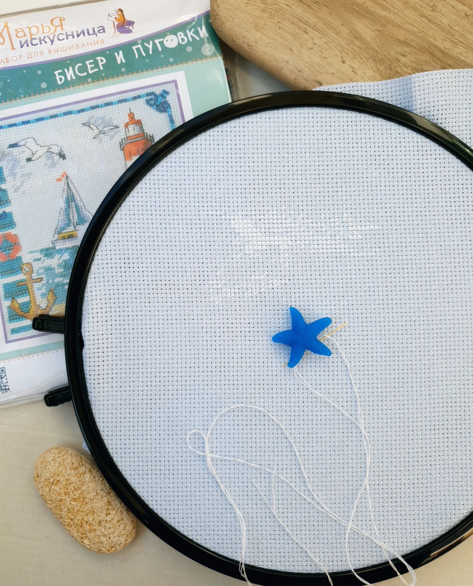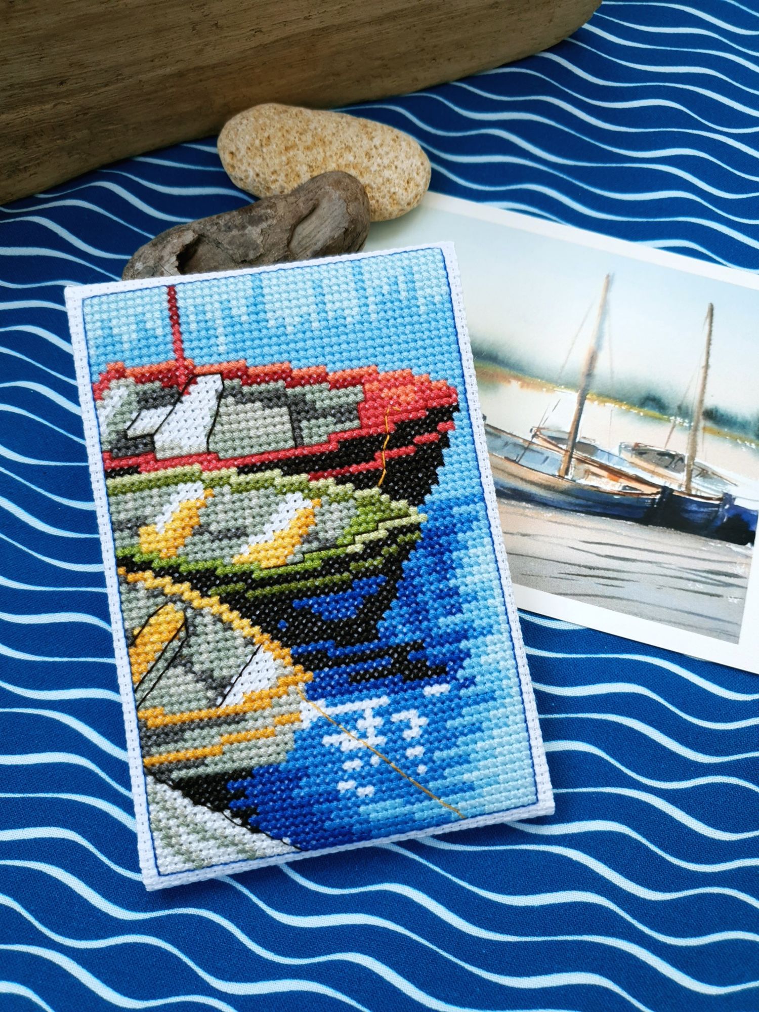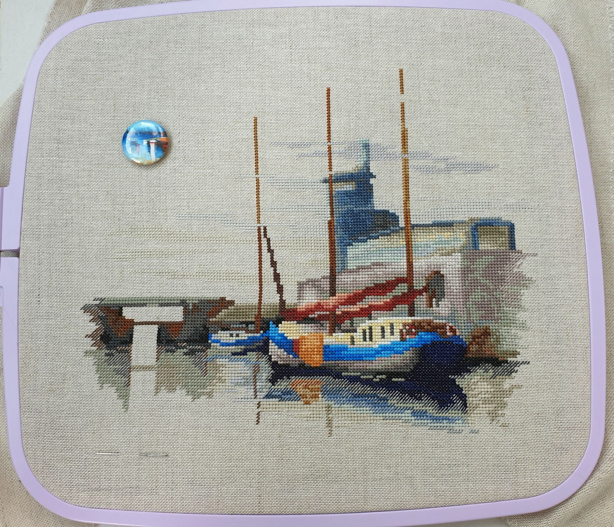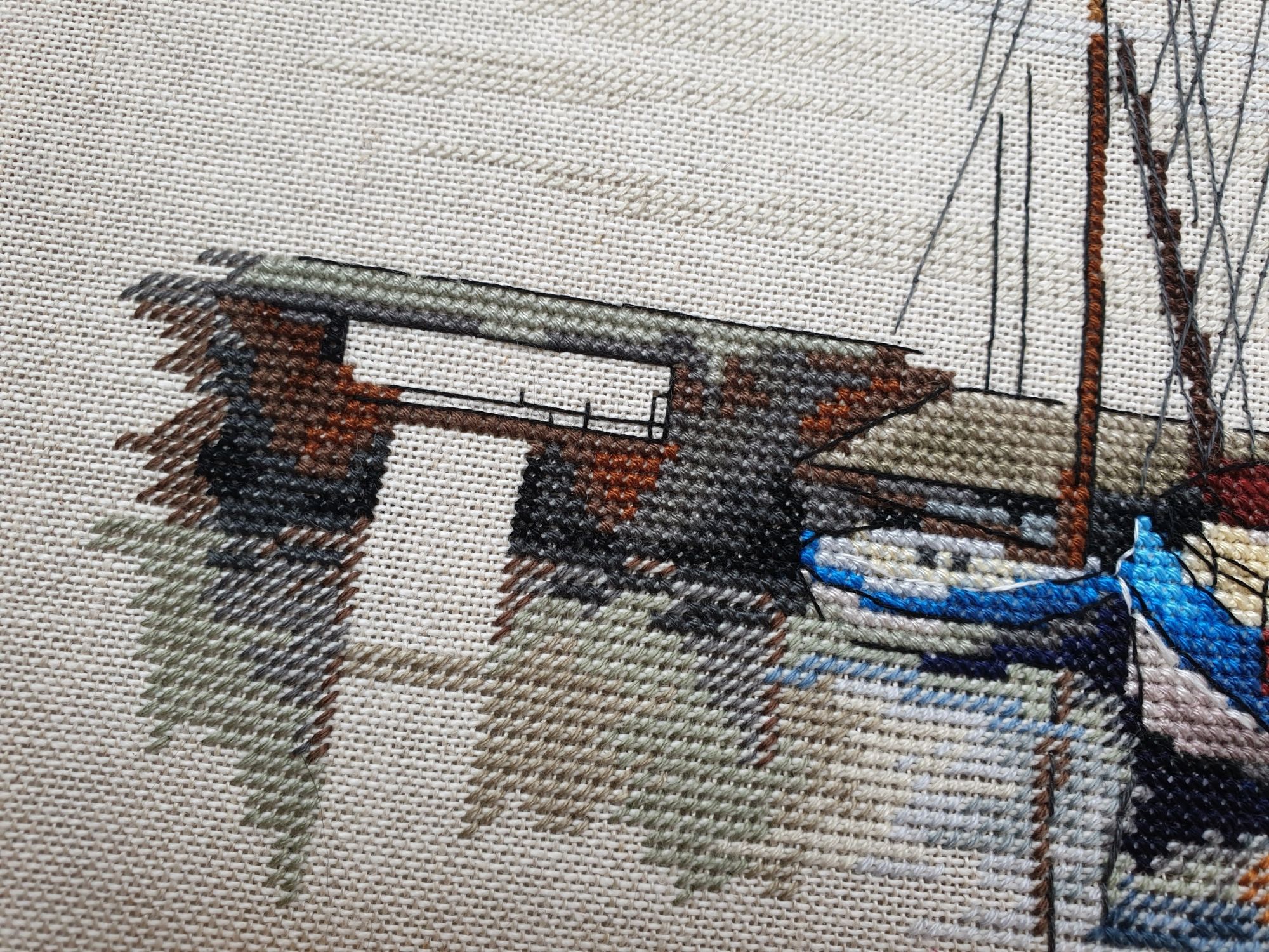 22 июля 2022 Вечер добрый! Наконец-то вышивальный отчет. Получается, что он почти за весь июль и даже немного за конец июня И куда только бежит время?! По традиции, сначала часть невышивальная. В этот раз безо всякой конкретики, просто хроника этого июля: от цветущих болотных ирисов и до ночного порта, котолапок и неожиданного цветущего подарка на подоконнике)) Нам, вышивальщицам, подвластно расширение пространства, мы можем бывать в двух разных местах одновременно. Вот так и я, отправляясь в отпуск в горы, в качестве дорожного процесса взяла миниатюру в освежающе-синей водной гамме и тематике))) Permin 92-9161, 3 boats (этот) - новый процесс и финиш! Миниатюра 14*18 см, да еще и на 14й аиде подошла для вышивания в отпуске в целом, и в машине в частности, идеально. А потому, отпуск начался с первыми крестиками, а закончился с финальными. Мне оставалось только бэк доделать. Ну и решить один мучивший меня вопрос, о котором дальше. Я вообще Пермин уважаю. У них есть свой шарм. И море они, как жители северных морей, чувствуют и передают в своих дизайнах очень точно. Мне близко это настроение. Хотя порой и чуточку не хватает немного "мягкости" переходов. Здесь все было супер, пока я не осознала, что белые участки - это незашитое пространство. В целом мне этот прием не раз попадался и выглядело все норм. Но тут маленький размер, крупная канва и кругом только крест в 2 нити... Я ничего не предпринимала до последнего крестика по схеме. Потому что знаю, как может все изменить один единственный крестик. Но вот пора приступать к бэку, а у меня есть ощущение проплешин. А моя вышивка не должна раздражать, причем именно меня)) Поэтому я вооружилась картой цветов, выбрала самые светлые оттенки в растяжках соответствующих цветов и зашила эти проплешины в 1 нить: полукрестом во "внутренностях лодок" и крестом на остальных участках. Теперь мне все нравится Осталось придумать какое-нибудь классное применение этим лодкам: хочется, чтобы они и впредь со мной путешествовали в виде какого-нибудь полезного аксессуара)) - На этих последних фото хорошо видны "проплешины", по схеме они не зашиваются вовсе. И мой результат: Дальше опять про лодки. Только уже процесс из стареньких) О.Ланкевич, Голландский порт - финиш! Я это сделала! Результат классный, процесс интересный, но завершение далось непросто. Подозреваю, что дело в цветовой гамме: летом, да еще и после такого яркого по цветам отпуска было непросто шить темными и серо-зелеными оттенками. Мешала их с вышивкой корпуса и парусов. Почему то именно сейчас невероятно хотелось закончить этот процесс. Отражения волшебные: как же круто они сделаны. А уж как я тянула снасти на лодках, выгребая среди бесконечно пересекающихся длинных линий. Но я молодец, не отложила и доделала! Горда собой и рада результату. Классный он. Вот правда)) И итоговый фотосет: Чтобы разбавить мир процесс с портом яркими красками, я распаковала еще один маленький летний наборчик. Из недавних совсем. С маяком! И с бисером! Ага, все правильно, мне очень захотелось попробовать новую серию "Бисер и пуговки" от Марьи Искусницы на вкус))) Марья Искусница, 13.003.13, Маяк (этот) - новый процесс и финиш! Миниатюра 14*14 см, 14 аида, нитки, 4 цвета бисера и 2 шармика. Тут есть два нюанса. Во-первых, нитки не разобраны по номерам, они в едином пучке, в а ключе только словесные названия цветов. Я честно призна