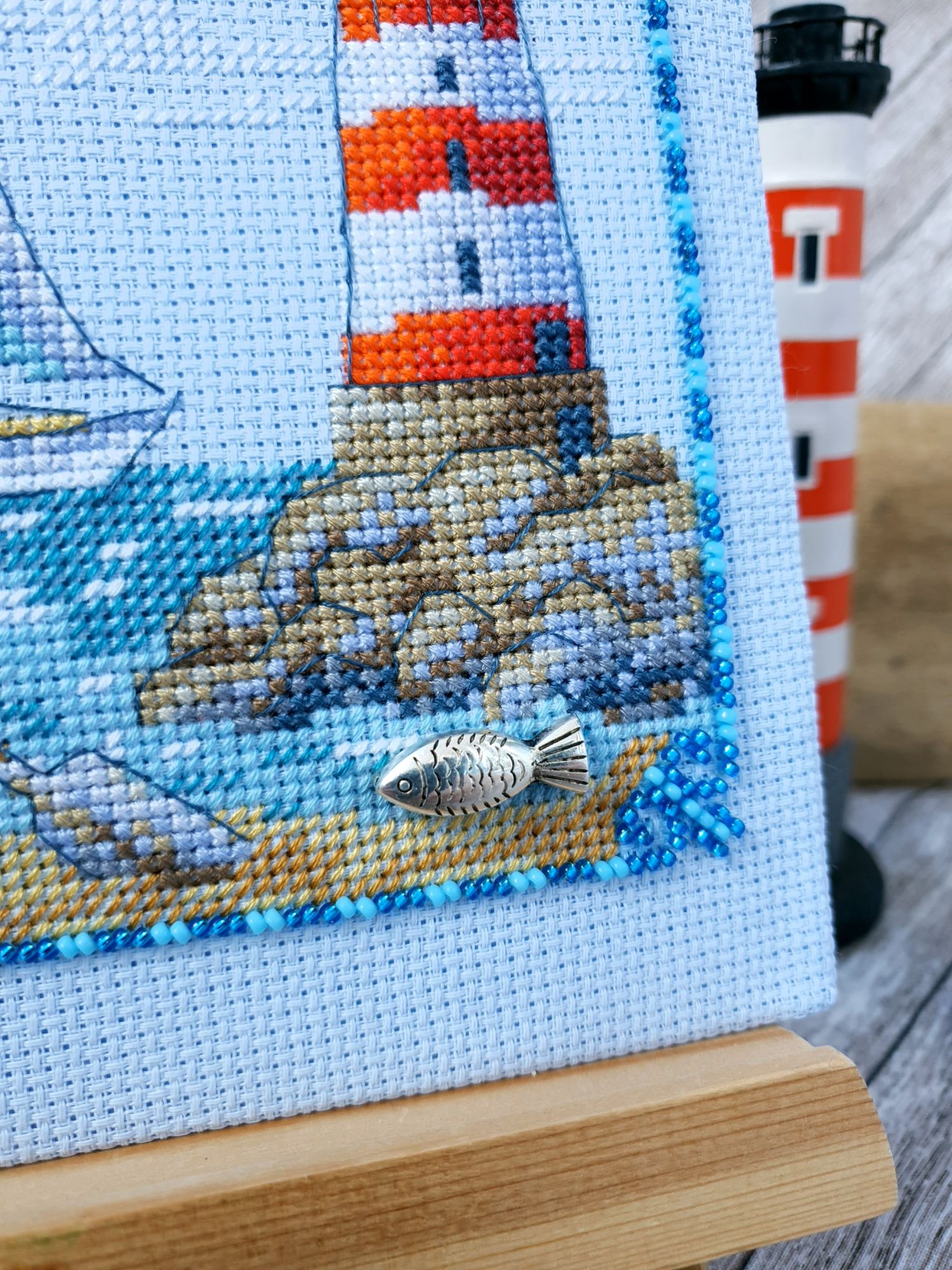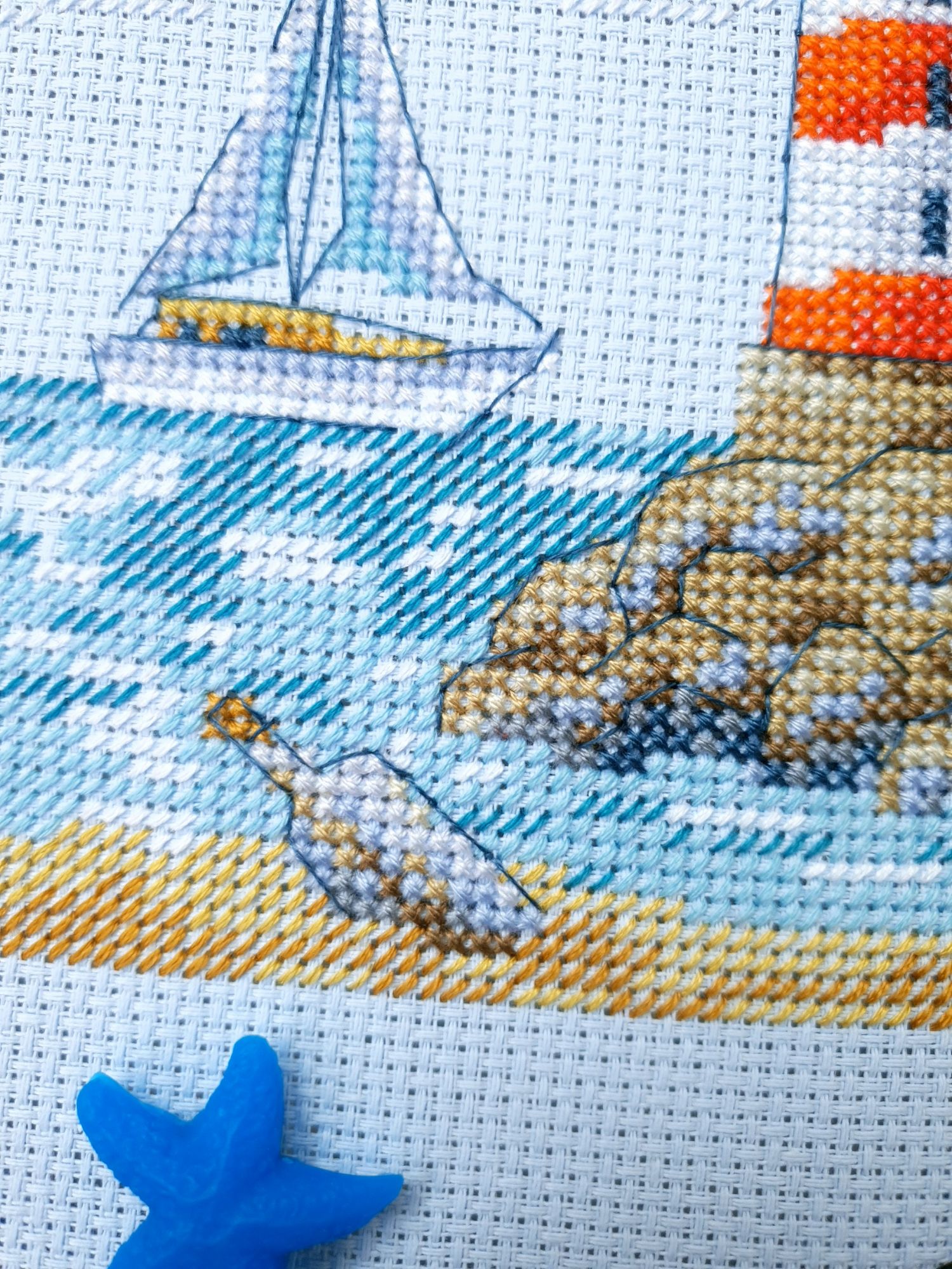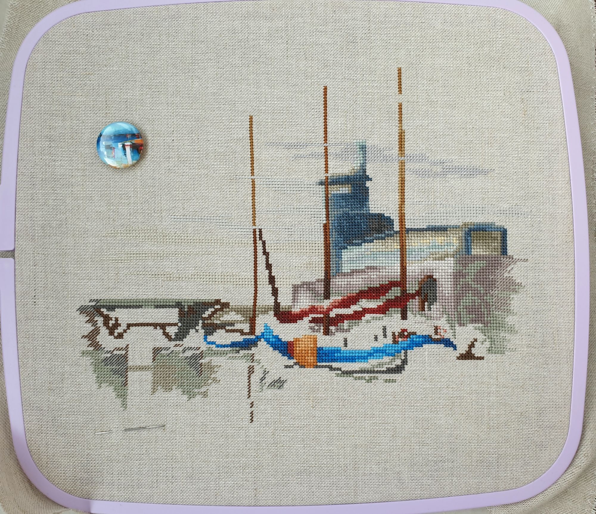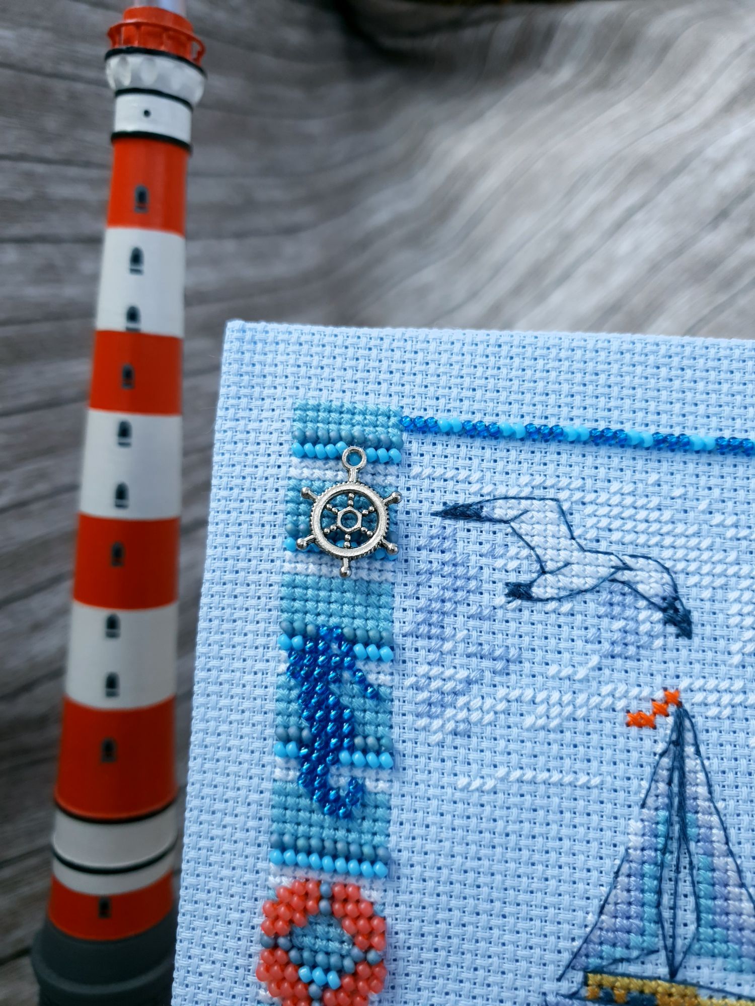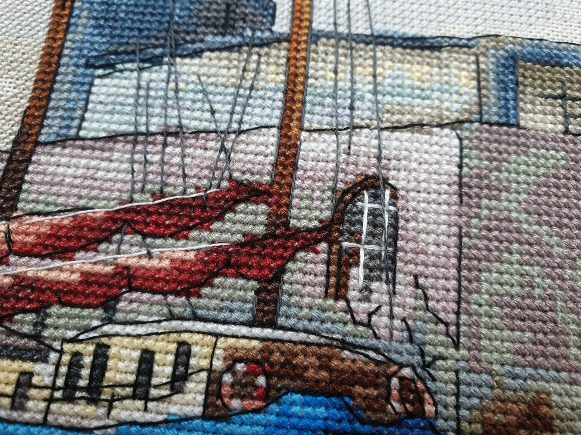 22 июля 2022 Вечер добрый! Наконец-то вышивальный отчет. Получается, что он почти за весь июль и даже немного за конец июня И куда только бежит время?! По традиции, сначала часть невышивальная. В этот раз безо всякой конкретики, просто хроника этого июля: от цветущих болотных ирисов и до ночного порта, котолапок и неожиданного цветущего подарка на подоконнике)) Нам, вышивальщицам, подвластно расширение пространства, мы можем бывать в двух разных местах одновременно. Вот так и я, отправляясь в отпуск в горы, в качестве дорожного процесса взяла миниатюру в освежающе-синей водной гамме и тематике))) Permin 92-9161, 3 boats (этот) - новый процесс и финиш! Миниатюра 14*18 см, да еще и на 14й аиде подошла для вышивания в отпуске в целом, и в машине в частности, идеально. А потому, отпуск начался с первыми крестиками, а закончился с финальными. Мне оставалось только бэк доделать. Ну и решить один мучивший меня вопрос, о котором дальше. Я вообще Пермин уважаю. У них есть свой шарм. И море они, как жители северных морей, чувствуют и передают в своих дизайнах очень точно. Мне близко это настроение. Хотя порой и чуточку не хватает немного "мягкости" переходов. Здесь все было супер, пока я не осознала, что белые участки - это незашитое пространство. В целом мне этот прием не раз попадался и выглядело все норм. Но тут маленький размер, крупная канва и кругом только крест в 2 нити... Я ничего не предпринимала до последнего крестика по схеме. Потому что знаю, как может все изменить один единственный крестик. Но вот пора приступать к бэку, а у меня есть ощущение проплешин. А моя вышивка не должна раздражать, причем именно меня)) Поэтому я вооружилась картой цветов, выбрала самые светлые оттенки в растяжках соответствующих цветов и зашила эти проплешины в 1 нить: полукрестом во "внутренностях лодок" и крестом на остальных участках. Теперь мне все нравится Осталось придумать какое-нибудь классное применение этим лодкам: хочется, чтобы они и впредь со мной путешествовали в виде какого-нибудь полезного аксессуара)) - На этих последних фото хорошо видны "проплешины", по схеме они не зашиваются вовсе. И мой результат: Дальше опять про лодки. Только уже процесс из стареньких) О.Ланкевич, Голландский порт - финиш! Я это сделала! Результат классный, процесс интересный, но завершение далось непросто. Подозреваю, что дело в цветовой гамме: летом, да еще и после такого яркого по цветам отпуска было непросто шить темными и серо-зелеными оттенками. Мешала их с вышивкой корпуса и парусов. Почему то именно сейчас невероятно хотелось закончить этот процесс. Отражения волшебные: как же круто они сделаны. А уж как я тянула снасти на лодках, выгребая среди бесконечно пересекающихся длинных линий. Но я молодец, не отложила и доделала! Горда собой и рада результату. Классный он. Вот правда)) И итоговый фотосет: Чтобы разбавить мир процесс с портом яркими красками, я распаковала еще один маленький летний наборчик. Из недавних совсем. С маяком! И с бисером! Ага, все правильно, мне очень захотелось попробовать новую серию "Бисер и пуговки" от Марьи Искусницы на вкус))) Марья Искусница, 13.003.13, Маяк (этот) - новый процесс и финиш! Миниатюра 14*14 см, 14 аида, нитки, 4 цвета бисера и 2 шармика. Тут есть два нюанса. Во-первых, нитки не разобраны по номерам, они в едином пучке, в а ключе только словесные названия цветов. Я честно призна