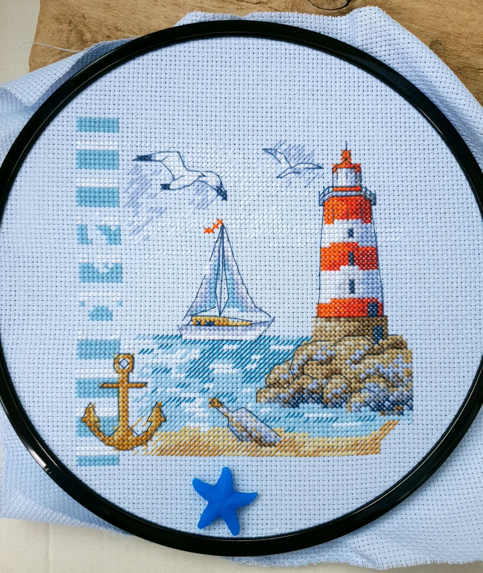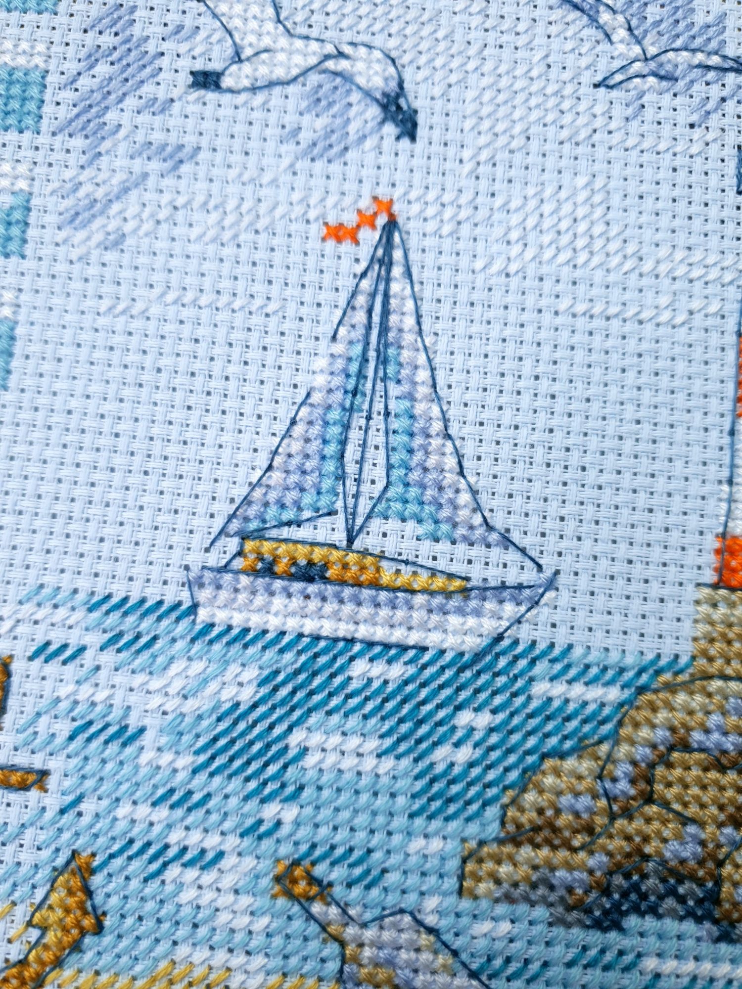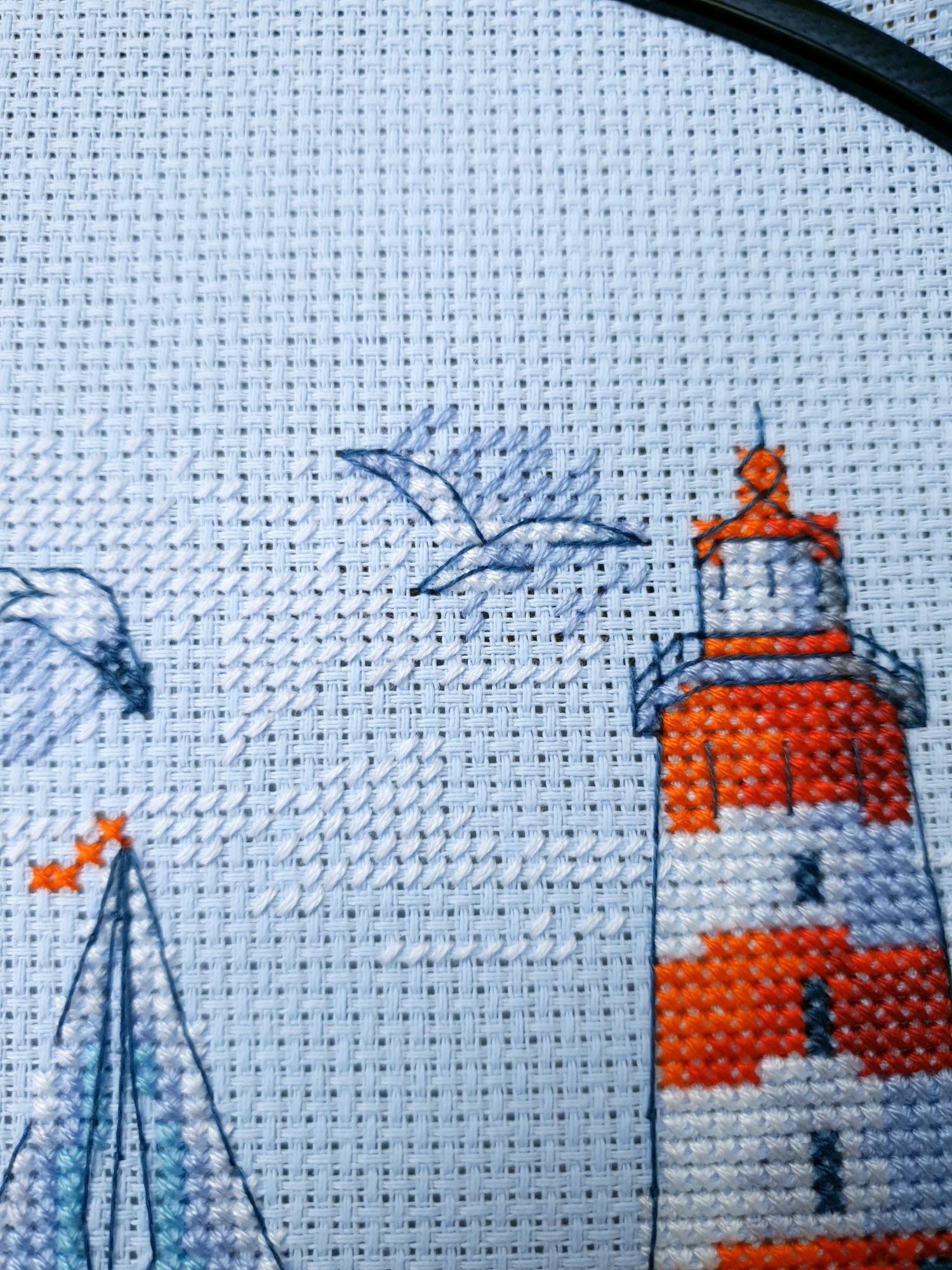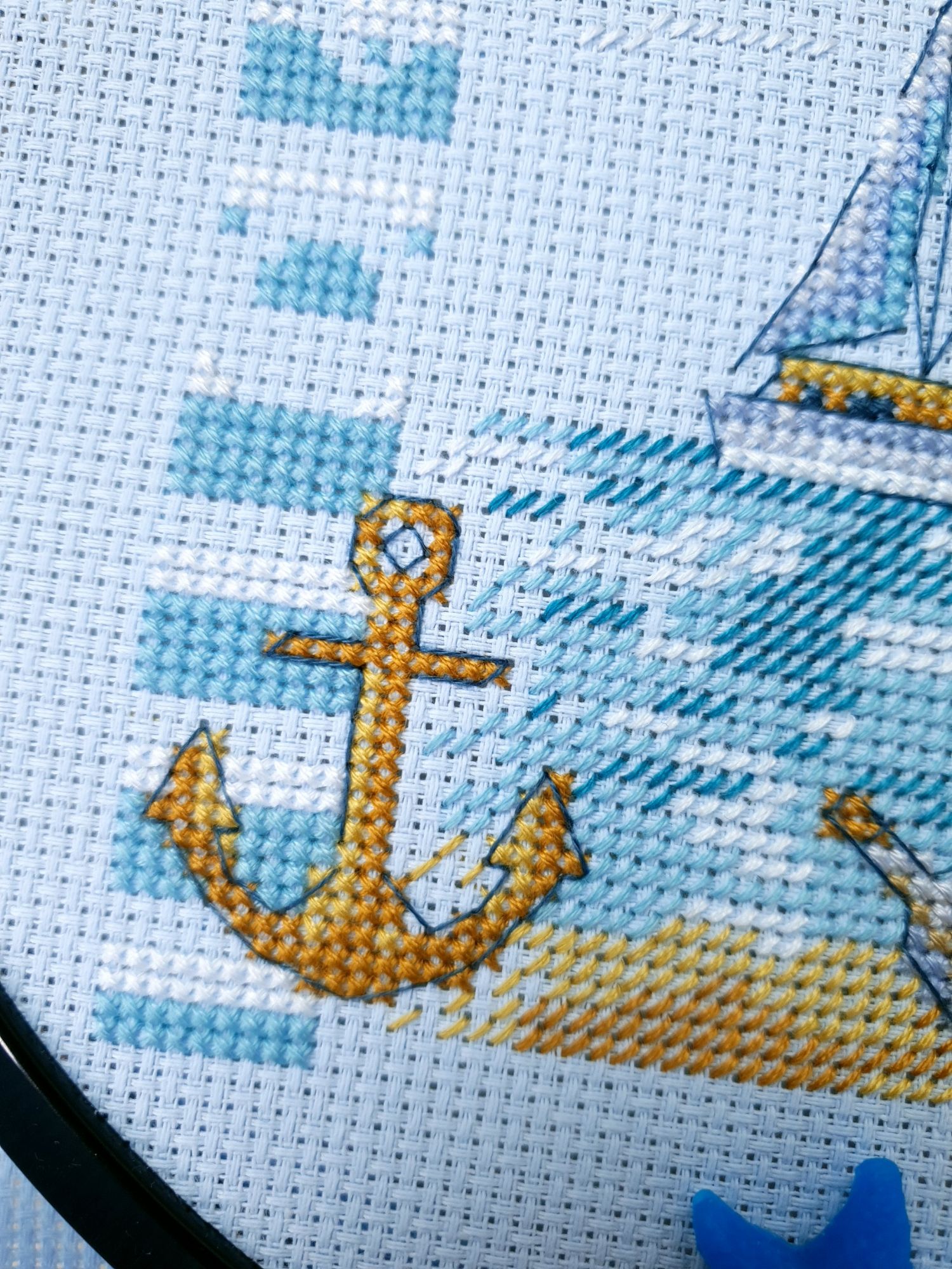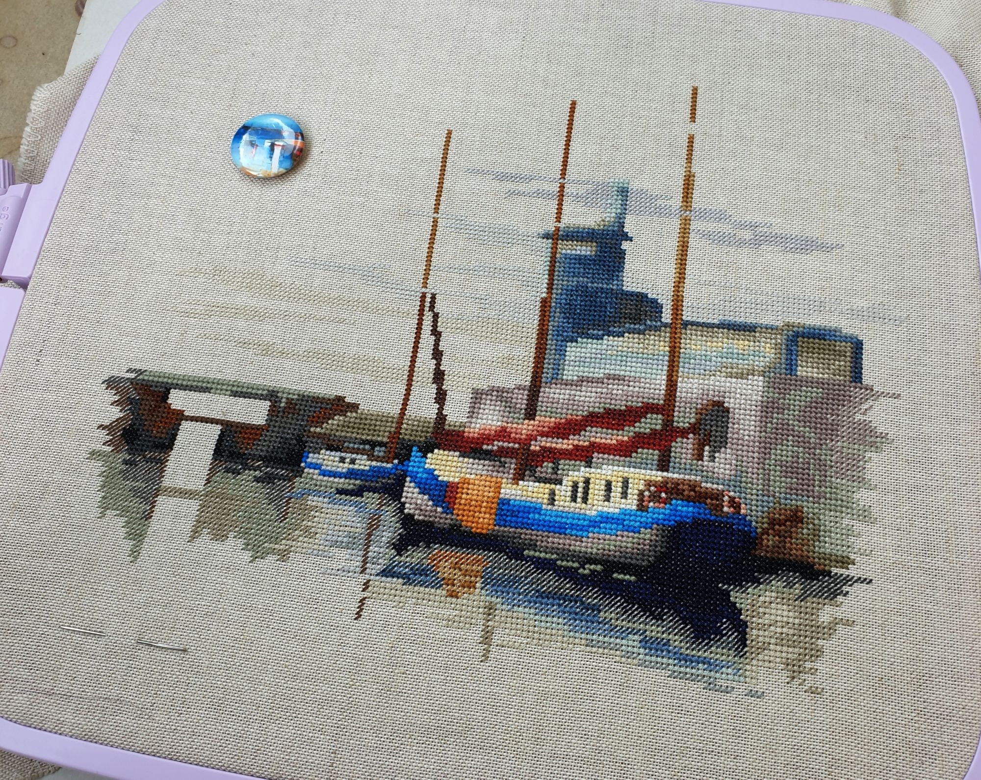 22 июля 2022 Вечер добрый! Наконец-то вышивальный отчет. Получается, что он почти за весь июль и даже немного за конец июня И куда только бежит время?! По традиции, сначала часть невышивальная. В этот раз безо всякой конкретики, просто хроника этого июля: от цветущих болотных ирисов и до ночного порта, котолапок и неожиданного цветущего подарка на подоконнике)) Нам, вышивальщицам, подвластно расширение пространства, мы можем бывать в двух разных местах одновременно. Вот так и я, отправляясь в отпуск в горы, в качестве дорожного процесса взяла миниатюру в освежающе-синей водной гамме и тематике))) Permin 92-9161, 3 boats (этот) - новый процесс и финиш! Миниатюра 14*18 см, да еще и на 14й аиде подошла для вышивания в отпуске в целом, и в машине в частности, идеально. А потому, отпуск начался с первыми крестиками, а закончился с финальными. Мне оставалось только бэк доделать. Ну и решить один мучивший меня вопрос, о котором дальше. Я вообще Пермин уважаю. У них есть свой шарм. И море они, как жители северных морей, чувствуют и передают в своих дизайнах очень точно. Мне близко это настроение. Хотя порой и чуточку не хватает немного "мягкости" переходов. Здесь все было супер, пока я не осознала, что белые участки - это незашитое пространство. В целом мне этот прием не раз попадался и выглядело все норм. Но тут маленький размер, крупная канва и кругом только крест в 2 нити... Я ничего не предпринимала до последнего крестика по схеме. Потому что знаю, как может все изменить один единственный крестик. Но вот пора приступать к бэку, а у меня есть ощущение проплешин. А моя вышивка не должна раздражать, причем именно меня)) Поэтому я вооружилась картой цветов, выбрала самые светлые оттенки в растяжках соответствующих цветов и зашила эти проплешины в 1 нить: полукрестом во "внутренностях лодок" и крестом на остальных участках. Теперь мне все нравится Осталось придумать какое-нибудь классное применение этим лодкам: хочется, чтобы они и впредь со мной путешествовали в виде какого-нибудь полезного аксессуара)) - На этих последних фото хорошо видны "проплешины", по схеме они не зашиваются вовсе. И мой результат: Дальше опять про лодки. Только уже процесс из стареньких) О.Ланкевич, Голландский порт - финиш! Я это сделала! Результат классный, процесс интересный, но завершение далось непросто. Подозреваю, что дело в цветовой гамме: летом, да еще и после такого яркого по цветам отпуска было непросто шить темными и серо-зелеными оттенками. Мешала их с вышивкой корпуса и парусов. Почему то именно сейчас невероятно хотелось закончить этот процесс. Отражения волшебные: как же круто они сделаны. А уж как я тянула снасти на лодках, выгребая среди бесконечно пересекающихся длинных линий. Но я молодец, не отложила и доделала! Горда собой и рада результату. Классный он. Вот правда)) И итоговый фотосет: Чтобы разбавить мир процесс с портом яркими красками, я распаковала еще один маленький летний наборчик. Из недавних совсем. С маяком! И с бисером! Ага, все правильно, мне очень захотелось попробовать новую серию "Бисер и пуговки" от Марьи Искусницы на вкус))) Марья Искусница, 13.003.13, Маяк (этот) - новый процесс и финиш! Миниатюра 14*14 см, 14 аида, нитки, 4 цвета бисера и 2 шармика. Тут есть два нюанса. Во-первых, нитки не разобраны по номерам, они в едином пучке, в а ключе только словесные названия цветов. Я честно призна