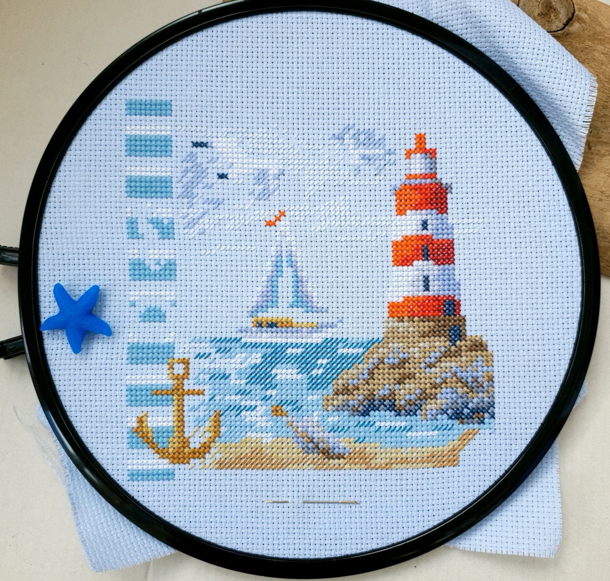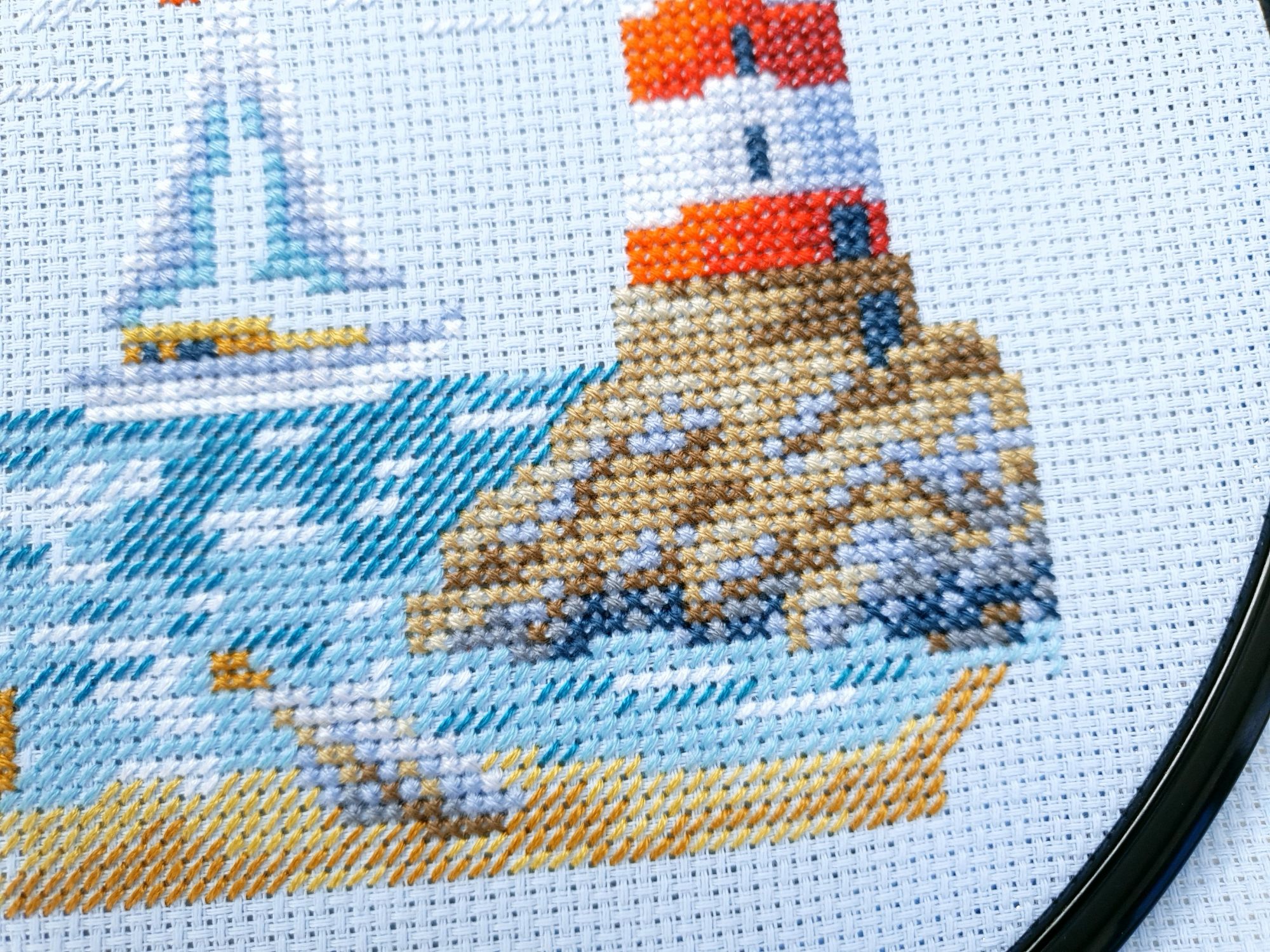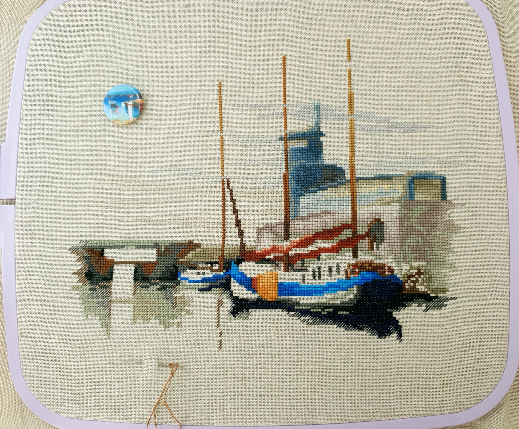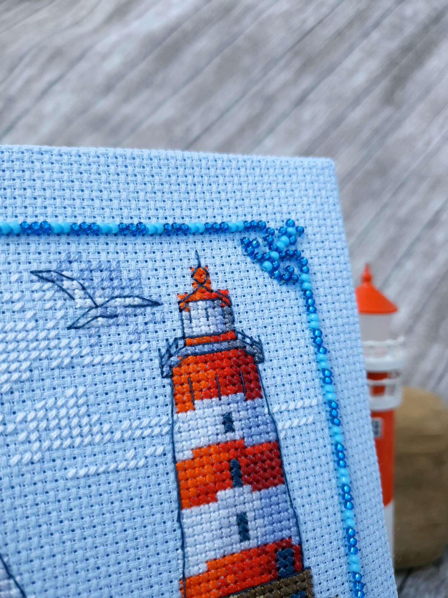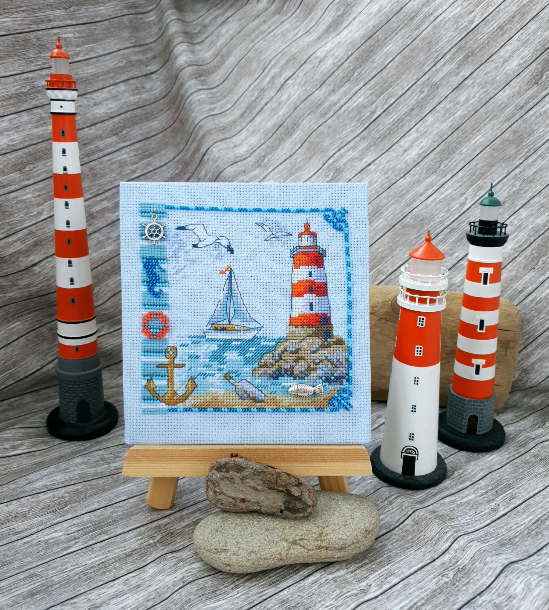 22 июля 2022 Вечер добрый! Наконец-то вышивальный отчет. Получается, что он почти за весь июль и даже немного за конец июня И куда только бежит время?! По традиции, сначала часть невышивальная. В этот раз безо всякой конкретики, просто хроника этого июля: от цветущих болотных ирисов и до ночного порта, котолапок и неожиданного цветущего подарка на подоконнике)) Нам, вышивальщицам, подвластно расширение пространства, мы можем бывать в двух разных местах одновременно. Вот так и я, отправляясь в отпуск в горы, в качестве дорожного процесса взяла миниатюру в освежающе-синей водной гамме и тематике))) Permin 92-9161, 3 boats (этот) - новый процесс и финиш! Миниатюра 14*18 см, да еще и на 14й аиде подошла для вышивания в отпуске в целом, и в машине в частности, идеально. А потому, отпуск начался с первыми крестиками, а закончился с финальными. Мне оставалось только бэк доделать. Ну и решить один мучивший меня вопрос, о котором дальше. Я вообще Пермин уважаю. У них есть свой шарм. И море они, как жители северных морей, чувствуют и передают в своих дизайнах очень точно. Мне близко это настроение. Хотя порой и чуточку не хватает немного "мягкости" переходов. Здесь все было супер, пока я не осознала, что белые участки - это незашитое пространство. В целом мне этот прием не раз попадался и выглядело все норм. Но тут маленький размер, крупная канва и кругом только крест в 2 нити... Я ничего не предпринимала до последнего крестика по схеме. Потому что знаю, как может все изменить один единственный крестик. Но вот пора приступать к бэку, а у меня есть ощущение проплешин. А моя вышивка не должна раздражать, причем именно меня)) Поэтому я вооружилась картой цветов, выбрала самые светлые оттенки в растяжках соответствующих цветов и зашила эти проплешины в 1 нить: полукрестом во "внутренностях лодок" и крестом на остальных участках. Теперь мне все нравится Осталось придумать какое-нибудь классное применение этим лодкам: хочется, чтобы они и впредь со мной путешествовали в виде какого-нибудь полезного аксессуара)) - На этих последних фото хорошо видны "проплешины", по схеме они не зашиваются вовсе. И мой результат: Дальше опять про лодки. Только уже процесс из стареньких) О.Ланкевич, Голландский порт - финиш! Я это сделала! Результат классный, процесс интересный, но завершение далось непросто. Подозреваю, что дело в цветовой гамме: летом, да еще и после такого яркого по цветам отпуска было непросто шить темными и серо-зелеными оттенками. Мешала их с вышивкой корпуса и парусов. Почему то именно сейчас невероятно хотелось закончить этот процесс. Отражения волшебные: как же круто они сделаны. А уж как я тянула снасти на лодках, выгребая среди бесконечно пересекающихся длинных линий. Но я молодец, не отложила и доделала! Горда собой и рада результату. Классный он. Вот правда)) И итоговый фотосет: Чтобы разбавить мир процесс с портом яркими красками, я распаковала еще один маленький летний наборчик. Из недавних совсем. С маяком! И с бисером! Ага, все правильно, мне очень захотелось попробовать новую серию "Бисер и пуговки" от Марьи Искусницы на вкус))) Марья Искусница, 13.003.13, Маяк (этот) - новый процесс и финиш! Миниатюра 14*14 см, 14 аида, нитки, 4 цвета бисера и 2 шармика. Тут есть два нюанса. Во-первых, нитки не разобраны по номерам, они в едином пучке, в а ключе только словесные названия цветов. Я честно призна