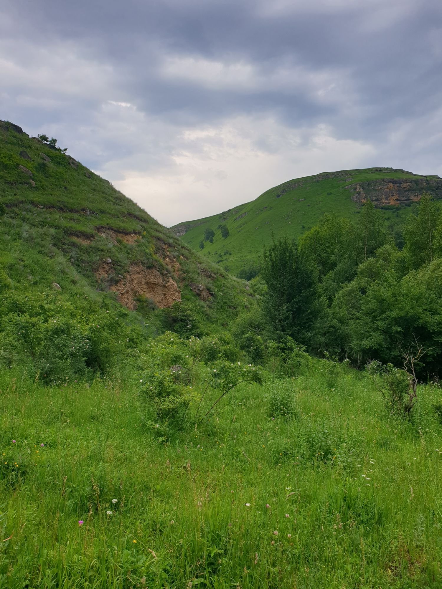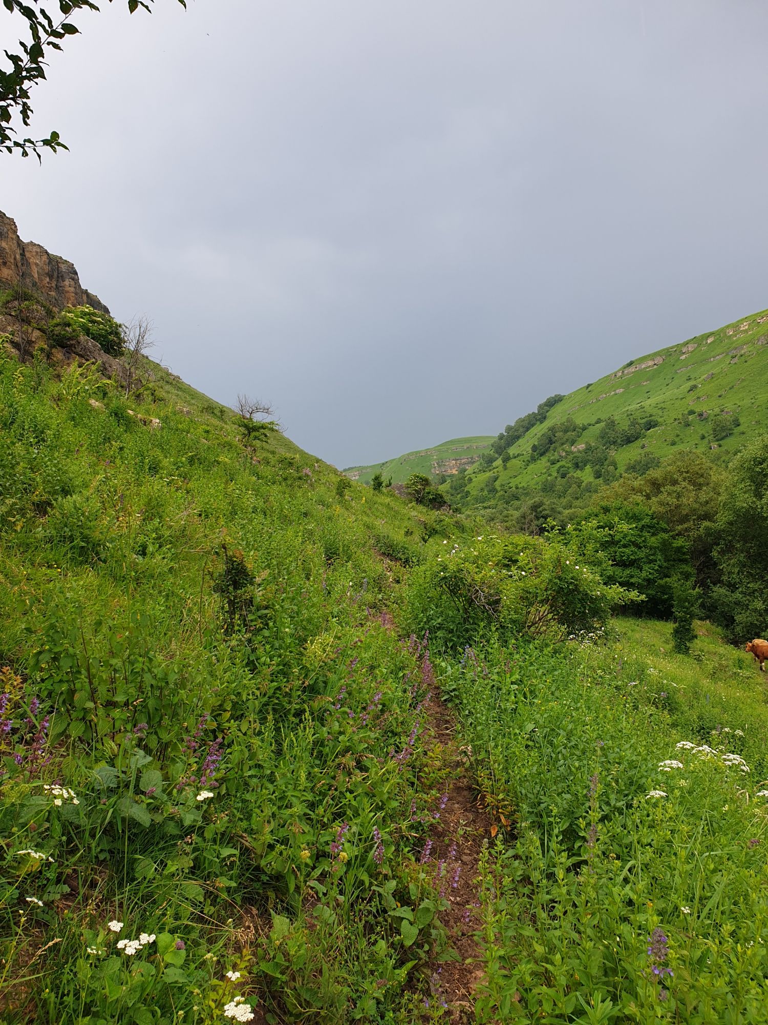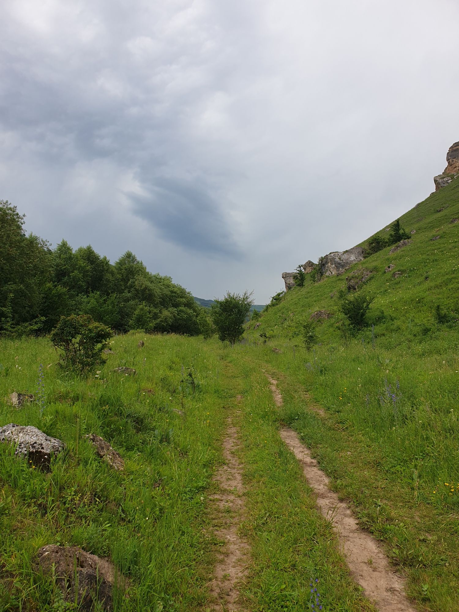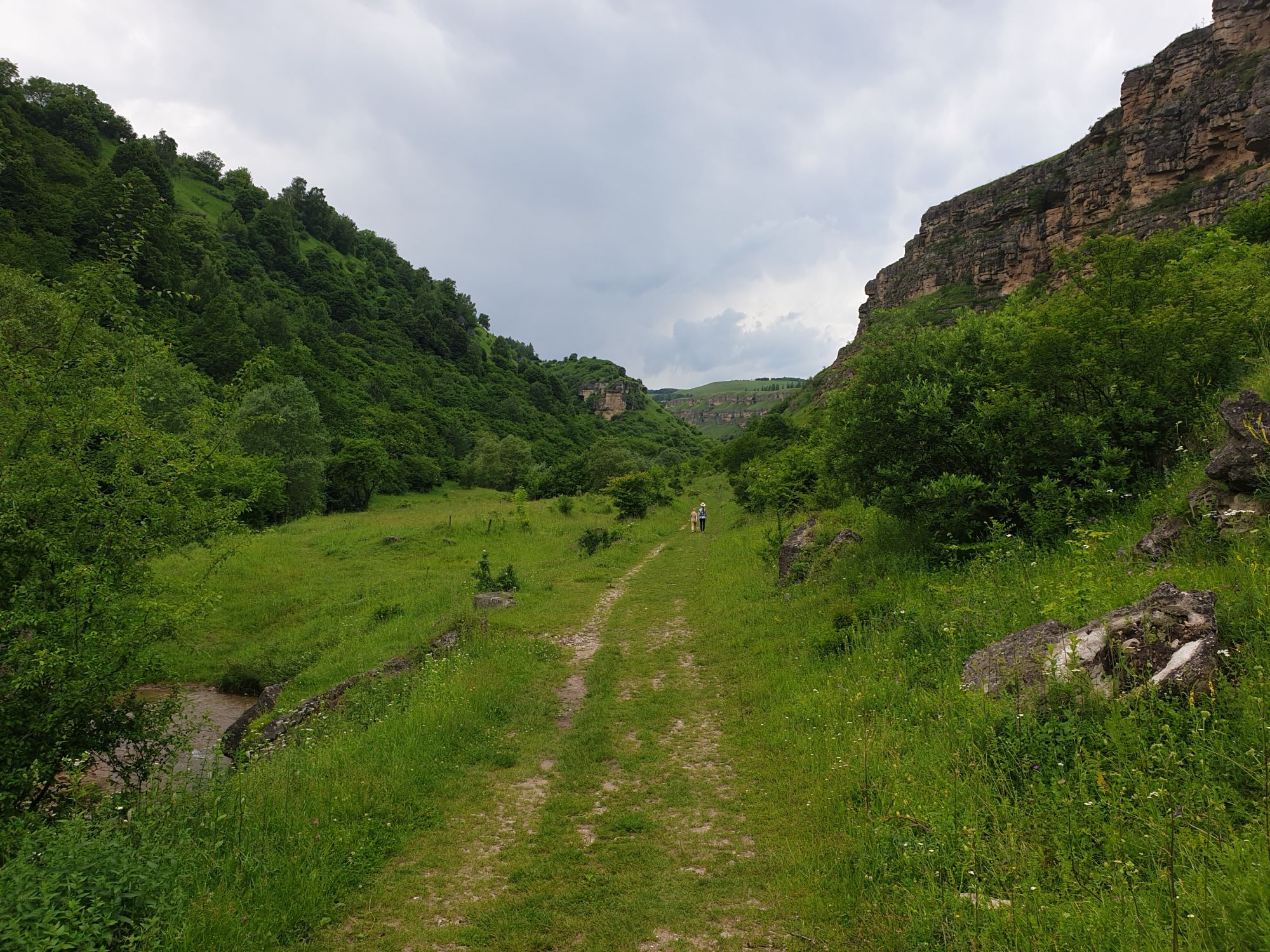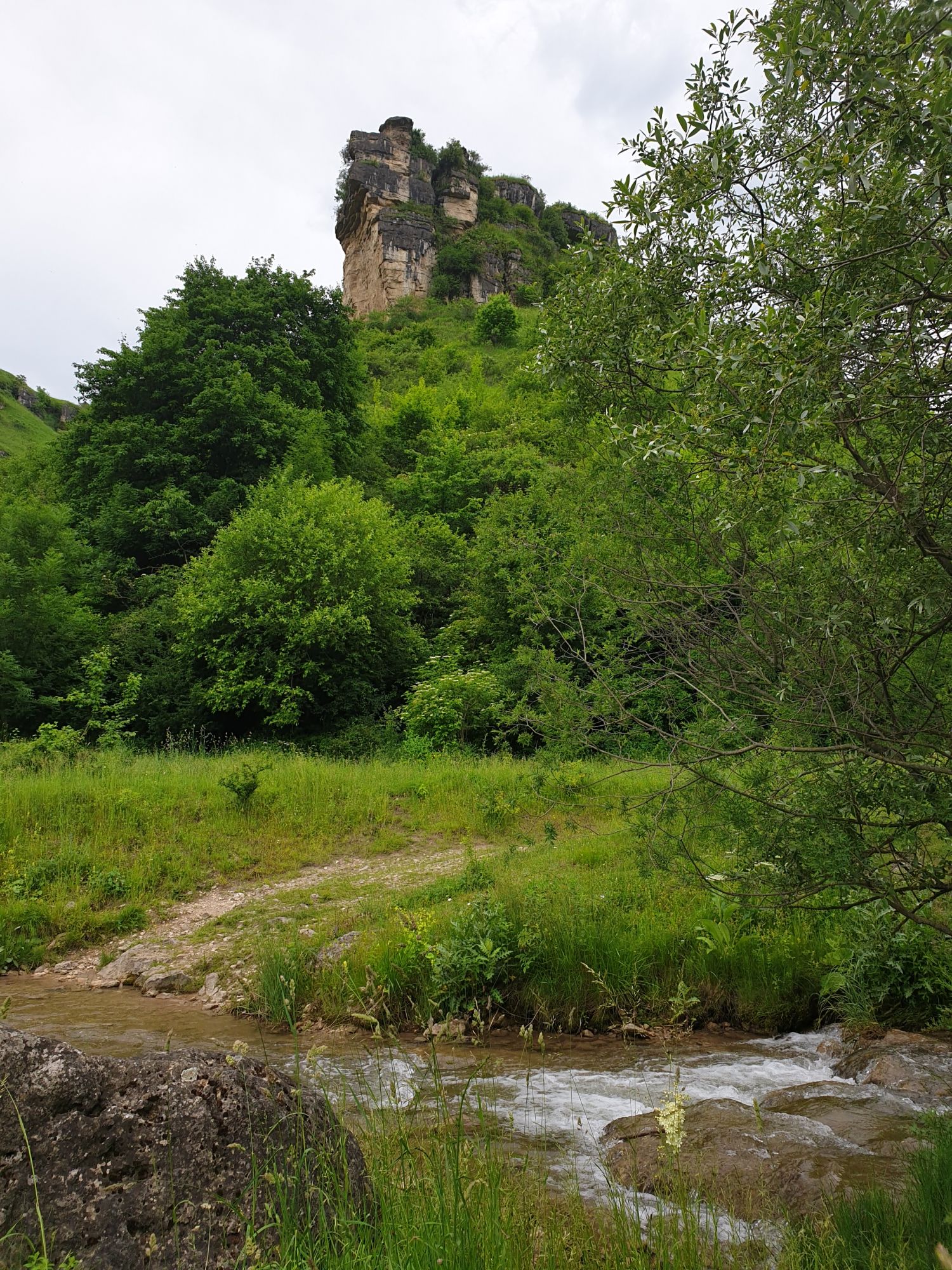 18 июля 2022 Вылазка первая. Березовское ущелье. Место очень красивое. И совсем-совсем близко, машина останется сегодня отдыхать. Одно но: обещали очень жаркий день, а спрятаться от солнца там почти негде. Но мы после Домбая злые и очень упертые. Решаем идти, а там как карта ляжет. До входа в ущелье стараемся выбирать тенистые дорожки и улочки. И вот оно, ущелье. Оно особенно тем, что довольно узкое и скалы здесь практически сразу начинают подниматься отвесно вверх на приличную высоту. Здесь шумит речка Березовка, здесь зелень и цветущий шиповник, здесь какое-то сумасшедшее число "скальных лиц": ветер и вода здесь особенно успешно потрудились. А еще петляющая тропинка, которая постоянно выводит к броду, коих здесь десятки - ущелье действительно узкое и отвесное. И живут орлы... И все это практически сразу, как заходишь в ущелье. Миновав небольшую жилую часть в самом начале ущелья, мы немножко побродили по ледяной воде, чтобы остудиться и настроиться, а потом пошли вперед... Но что удивляло и немного настораживало: вдалеке впереди небо не было таким уж солнечным, а предвещало совсем иные природные катаклизмы. Сначала мы с удовольствием избавились от рубашек, защищавших от солнца, потому что оно скрылось за тучками, потом перестали изнывать от жары и бодренько и с удовольствием пошли вперед, любуясь пейзажами и не забывая регулярно разуваться, чтобы в очередной раз перейти реку)) И только настойчивый гром немного нарушал идиллию В какой-то момент дождь начался. Точнее он из приятной прохладной водяной пыли стал дождиком, от которого мы предпочли укрыться под деревьями и спрятать технику и документы понадежнее)) Заодно тут же перекусили и отдохнули. А на противоположном берегу тем временем мирно паслись коровы: в КЧР это вообще норма, они по всем ущельям свободно гуляют. А мы, судя по карте и плохо работающему здесь GPS, как раз подходили к теоретической границе между Ставропольем и Карачаево-Черкессией))) Тут перед нами встала дилемма. С одной стороны дождь и прогноз неутешительный: затягивало и грохотало все сильнее. А с другой стороны я очень хотела прогуляться по ущелью подальше. И это было принципиально: мы в первую поездку здесь уже гуляли, но тогда прошли совсем немного, т.к. был уже вечер. Сейчас мы уже были прилично дальше, но... но мы же, напоминаю, были прилично злые после Домбая и решительно хотели все исправить... Я металась между здравым смыслом и желанием идти дальше. Не буду описывать все перепетии, но видно такое было у меня выражение лица, что муж принимает решение идти дальше. Что мы теряем в сущности?! Промокнем? Ну и ладно, все равно тепло, - была его аргументация. И я ему очень за то решение благодарна, я бы на здравый смысл повелась)))) В общем, мы отправились дальше, переждав сильный заряд дождя. Дальше фотографии будут чуток замыленные, потому что мелкий дождик не переставал почти все время. Но он практически не доставлял неудобств, лишь избавлял от жары и заставлял периодически прятать камеру. Мы дошли чуть дальше смотровой площадки, что нависает над ущельем у села Элькуш. Помимо прочего нам попалась черепушка, живописно надетая на огромный камень, несколько ржавеющих остовов машин в том месте, где над ущельем село - печальное напоминание о том, почему не нужно подъезжать к краю обрывов, особенно в горах и в плохую погоду, заросли так