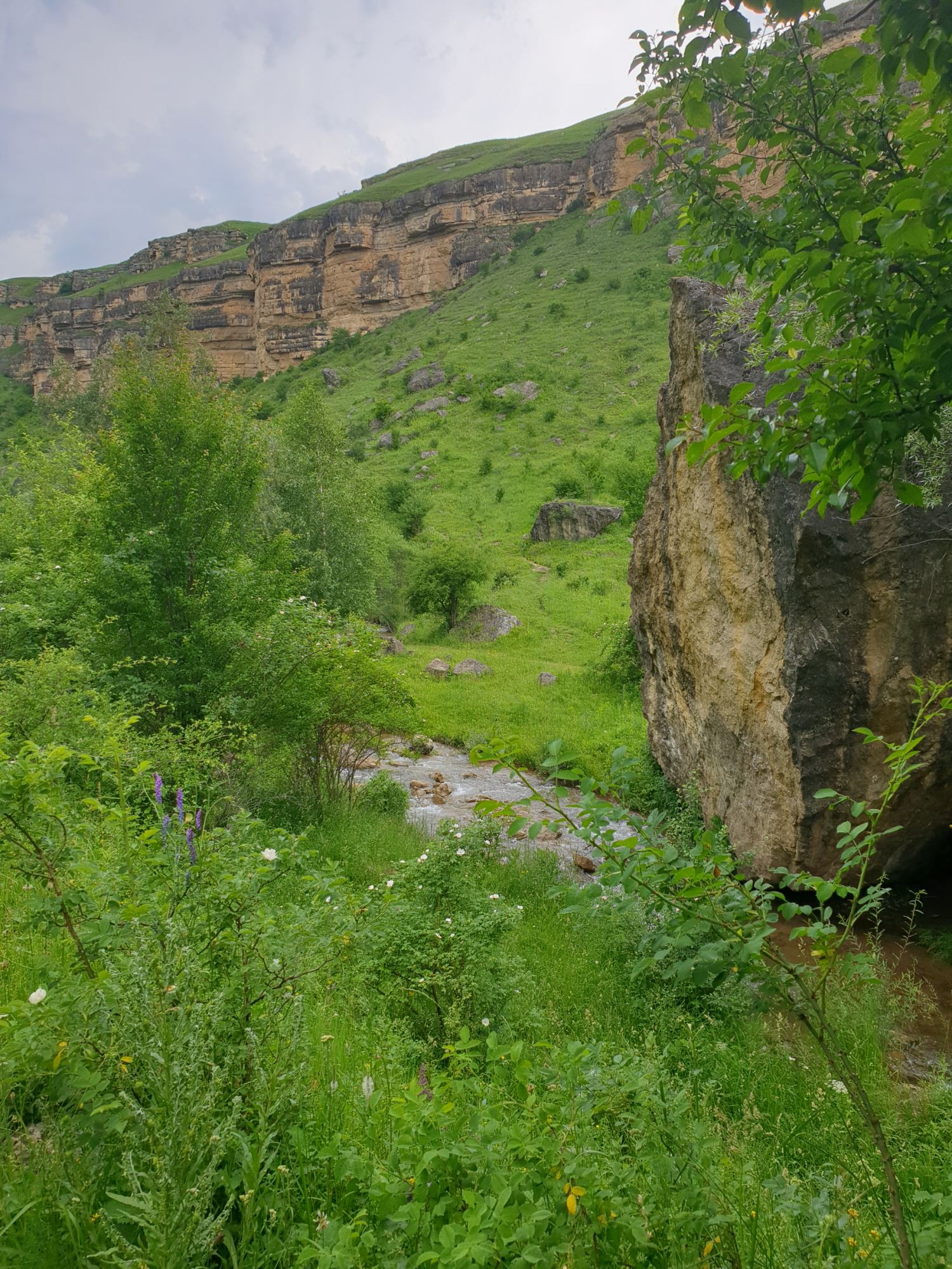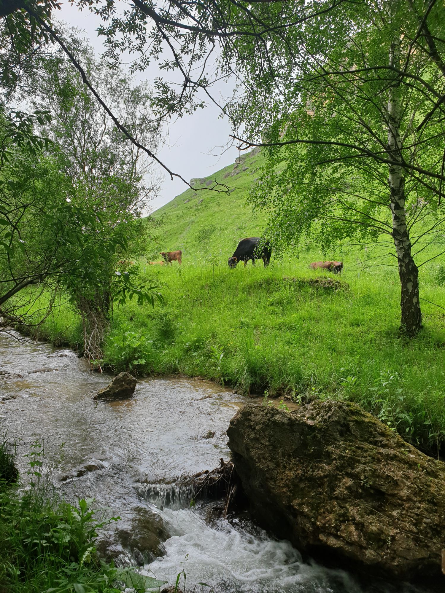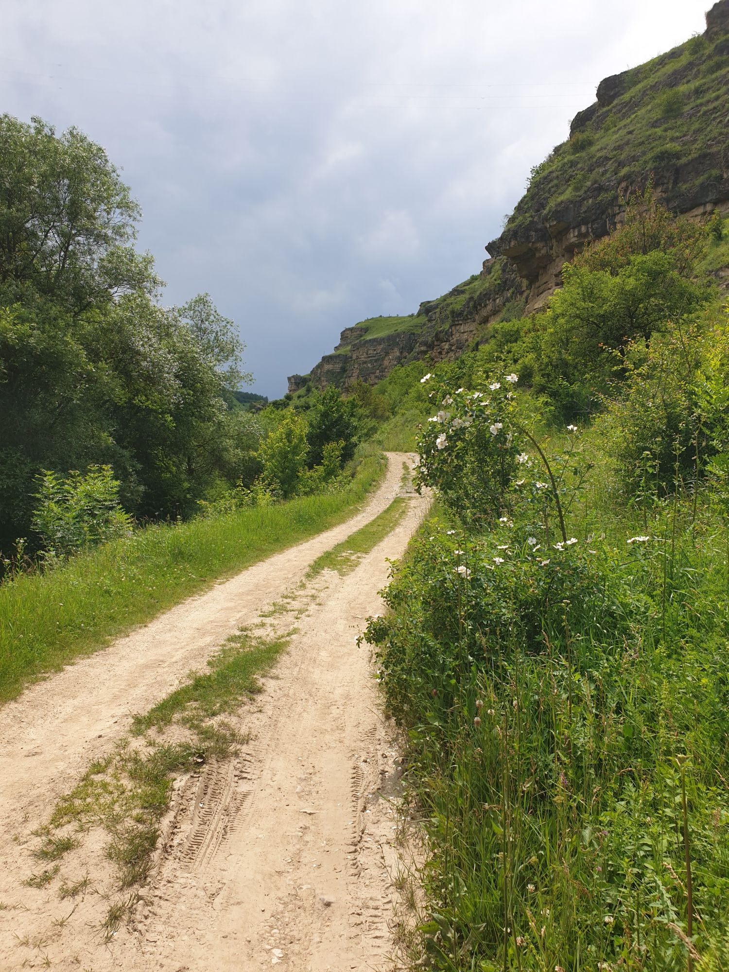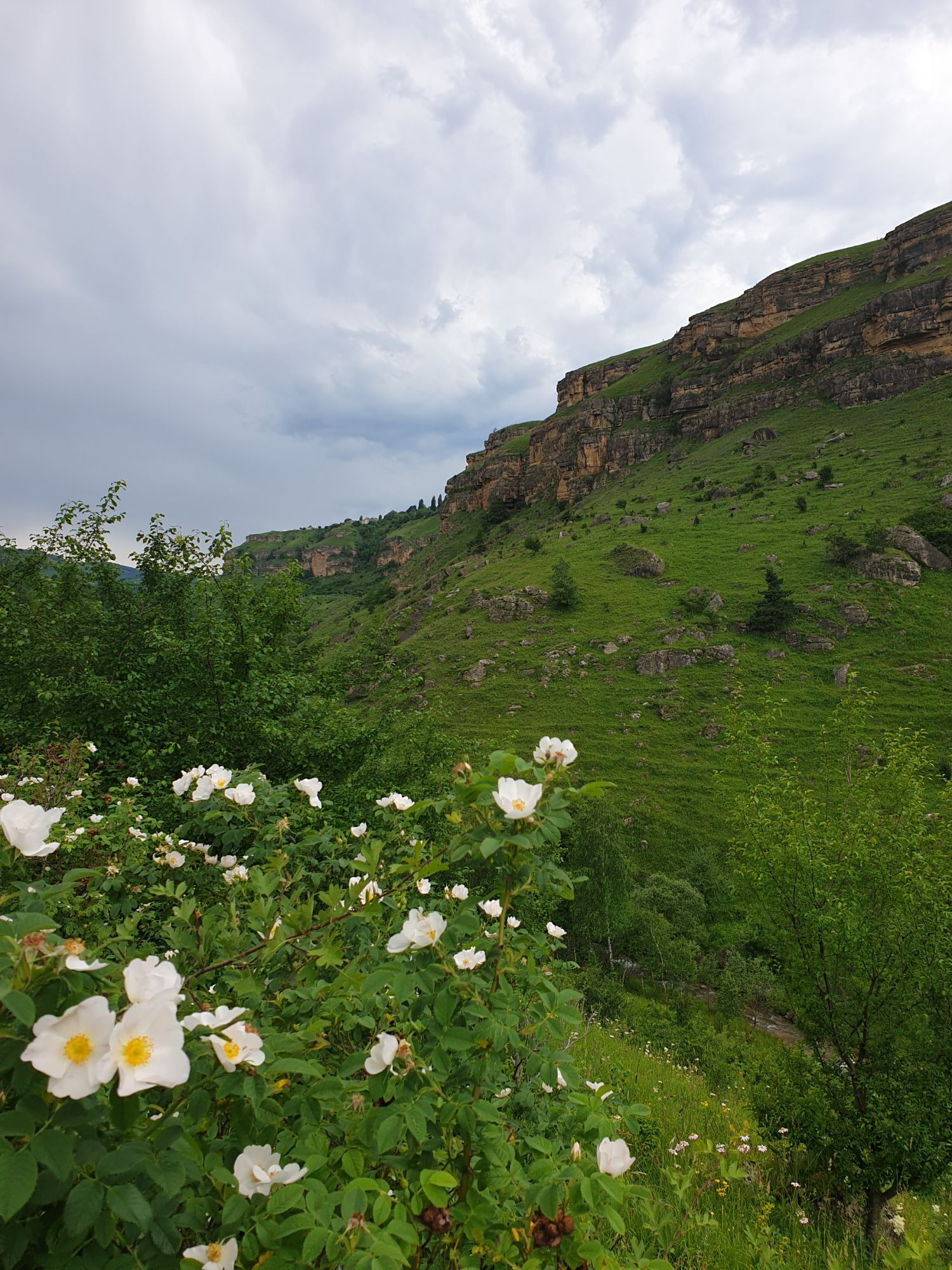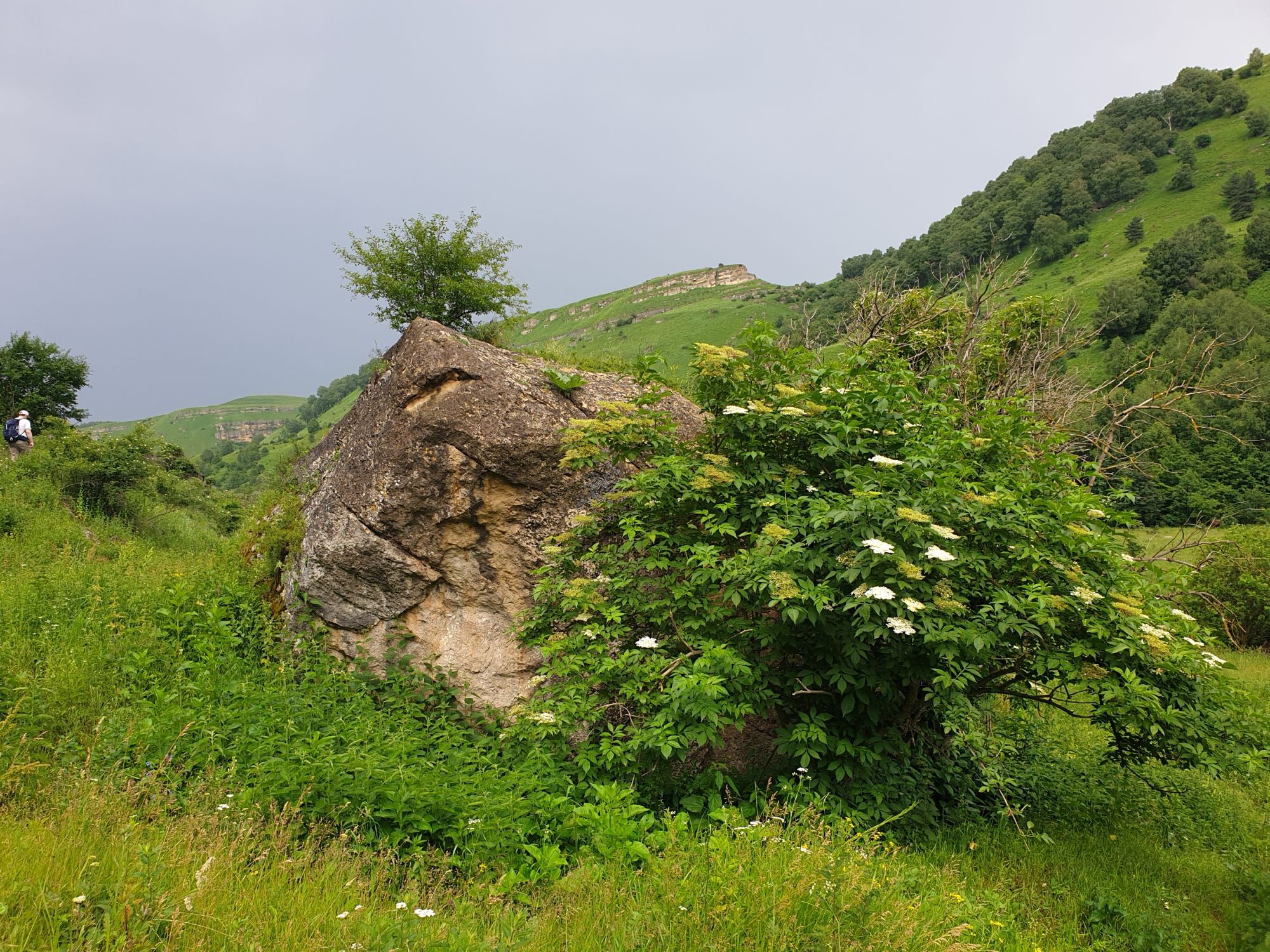 18 июля 2022 Вылазка первая. Березовское ущелье. Место очень красивое. И совсем-совсем близко, машина останется сегодня отдыхать. Одно но: обещали очень жаркий день, а спрятаться от солнца там почти негде. Но мы после Домбая злые и очень упертые. Решаем идти, а там как карта ляжет. До входа в ущелье стараемся выбирать тенистые дорожки и улочки. И вот оно, ущелье. Оно особенно тем, что довольно узкое и скалы здесь практически сразу начинают подниматься отвесно вверх на приличную высоту. Здесь шумит речка Березовка, здесь зелень и цветущий шиповник, здесь какое-то сумасшедшее число "скальных лиц": ветер и вода здесь особенно успешно потрудились. А еще петляющая тропинка, которая постоянно выводит к броду, коих здесь десятки - ущелье действительно узкое и отвесное. И живут орлы... И все это практически сразу, как заходишь в ущелье. Миновав небольшую жилую часть в самом начале ущелья, мы немножко побродили по ледяной воде, чтобы остудиться и настроиться, а потом пошли вперед... Но что удивляло и немного настораживало: вдалеке впереди небо не было таким уж солнечным, а предвещало совсем иные природные катаклизмы. Сначала мы с удовольствием избавились от рубашек, защищавших от солнца, потому что оно скрылось за тучками, потом перестали изнывать от жары и бодренько и с удовольствием пошли вперед, любуясь пейзажами и не забывая регулярно разуваться, чтобы в очередной раз перейти реку)) И только настойчивый гром немного нарушал идиллию В какой-то момент дождь начался. Точнее он из приятной прохладной водяной пыли стал дождиком, от которого мы предпочли укрыться под деревьями и спрятать технику и документы понадежнее)) Заодно тут же перекусили и отдохнули. А на противоположном берегу тем временем мирно паслись коровы: в КЧР это вообще норма, они по всем ущельям свободно гуляют. А мы, судя по карте и плохо работающему здесь GPS, как раз подходили к теоретической границе между Ставропольем и Карачаево-Черкессией))) Тут перед нами встала дилемма. С одной стороны дождь и прогноз неутешительный: затягивало и грохотало все сильнее. А с другой стороны я очень хотела прогуляться по ущелью подальше. И это было принципиально: мы в первую поездку здесь уже гуляли, но тогда прошли совсем немного, т.к. был уже вечер. Сейчас мы уже были прилично дальше, но... но мы же, напоминаю, были прилично злые после Домбая и решительно хотели все исправить... Я металась между здравым смыслом и желанием идти дальше. Не буду описывать все перепетии, но видно такое было у меня выражение лица, что муж принимает решение идти дальше. Что мы теряем в сущности?! Промокнем? Ну и ладно, все равно тепло, - была его аргументация. И я ему очень за то решение благодарна, я бы на здравый смысл повелась)))) В общем, мы отправились дальше, переждав сильный заряд дождя. Дальше фотографии будут чуток замыленные, потому что мелкий дождик не переставал почти все время. Но он практически не доставлял неудобств, лишь избавлял от жары и заставлял периодически прятать камеру. Мы дошли чуть дальше смотровой площадки, что нависает над ущельем у села Элькуш. Помимо прочего нам попалась черепушка, живописно надетая на огромный камень, несколько ржавеющих остовов машин в том месте, где над ущельем село - печальное напоминание о том, почему не нужно подъезжать к краю обрывов, особенно в горах и в плохую погоду, заросли так