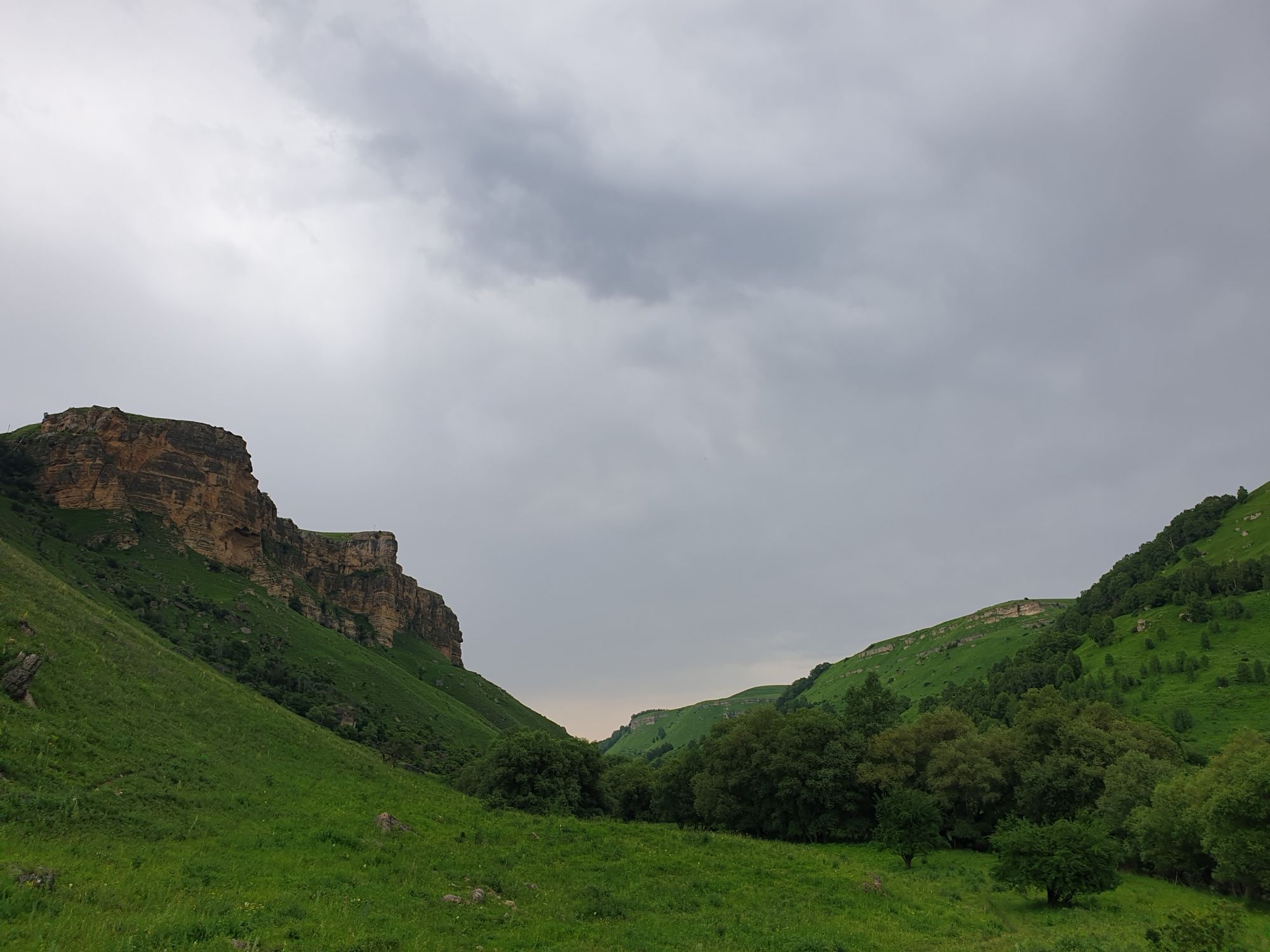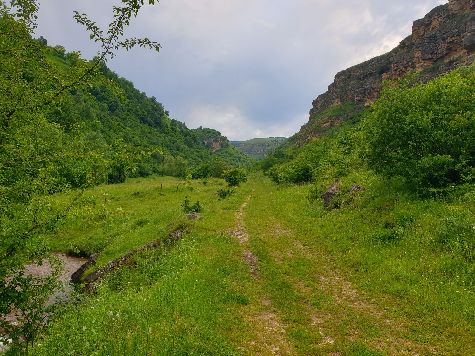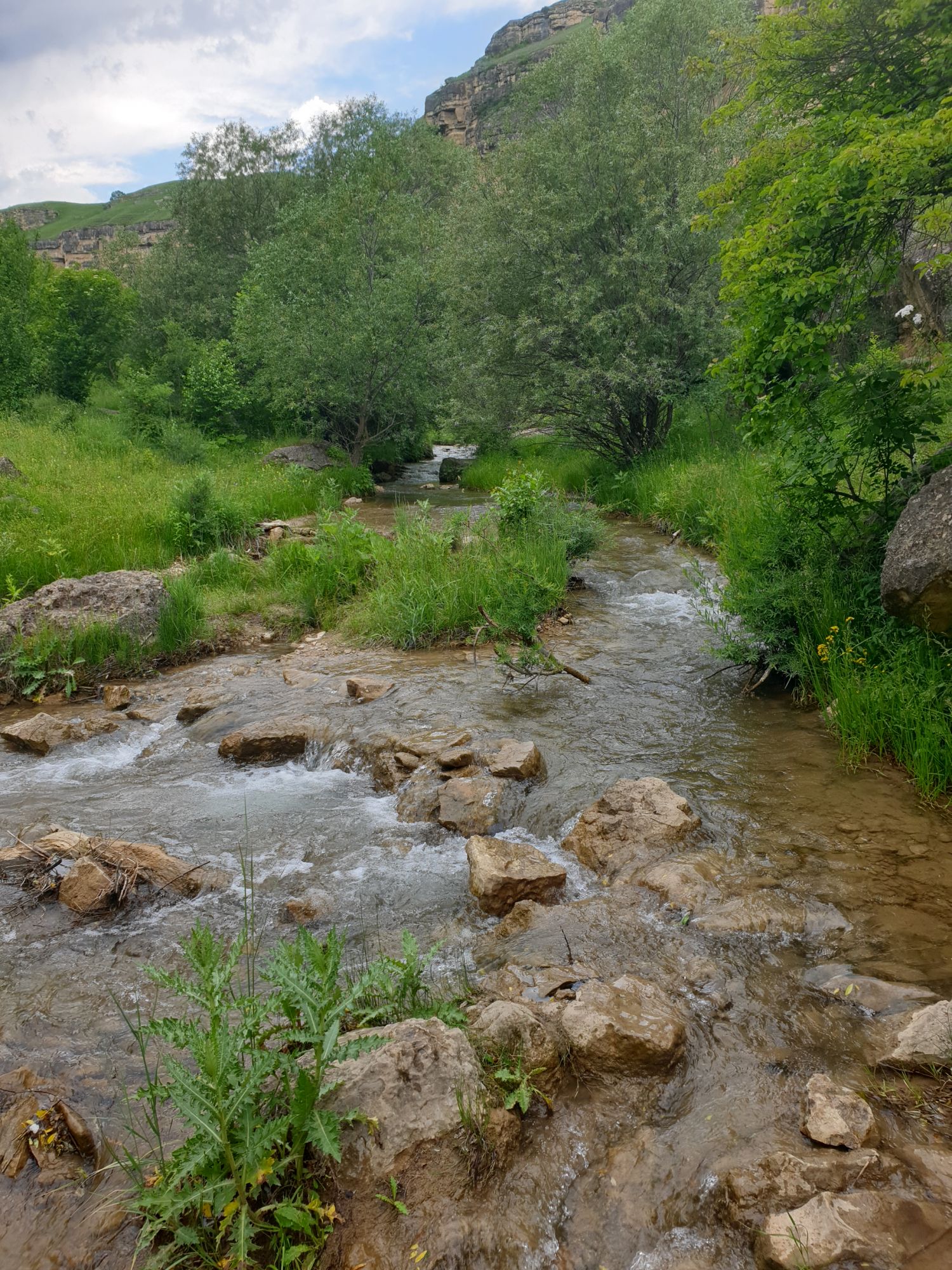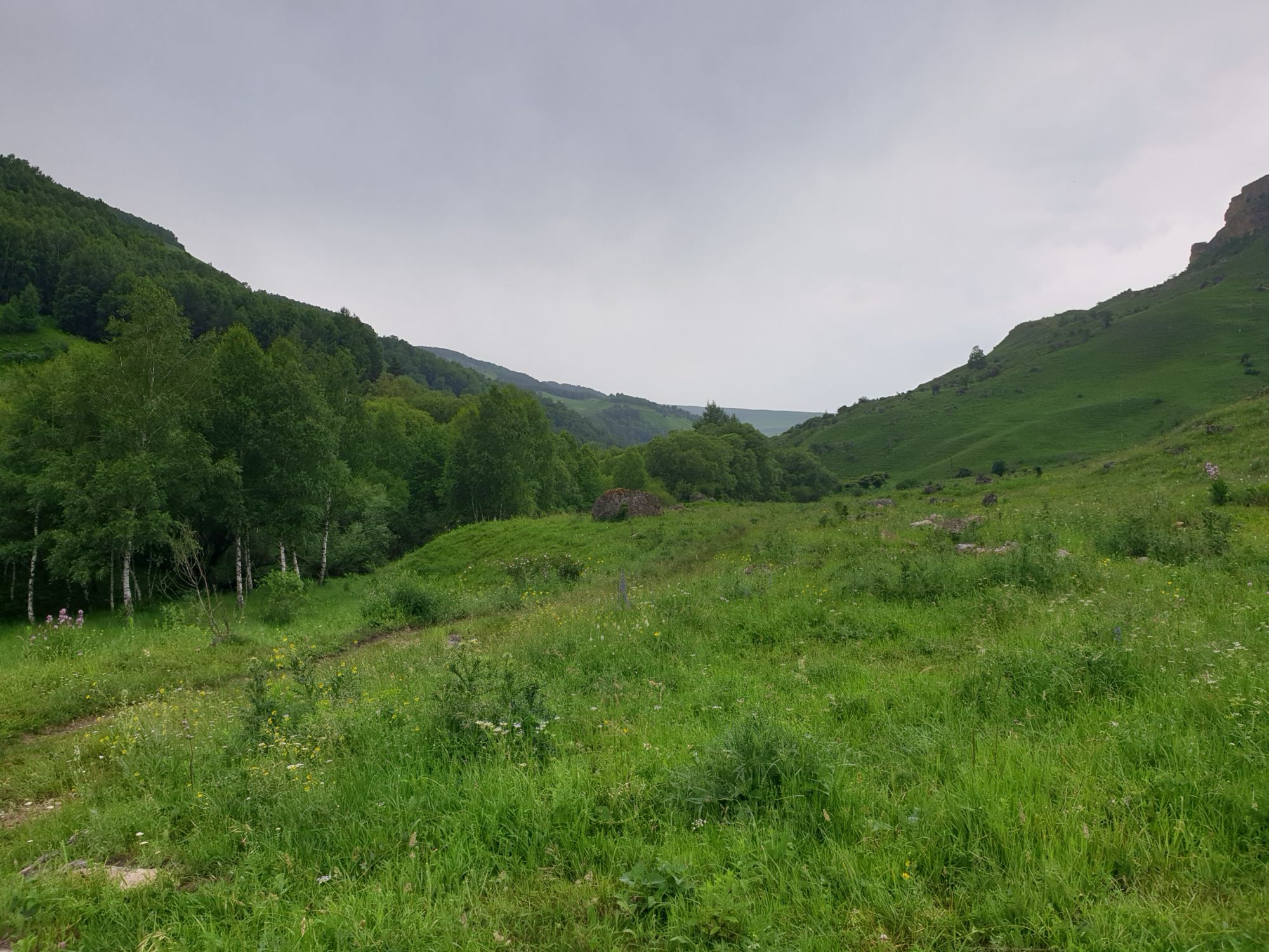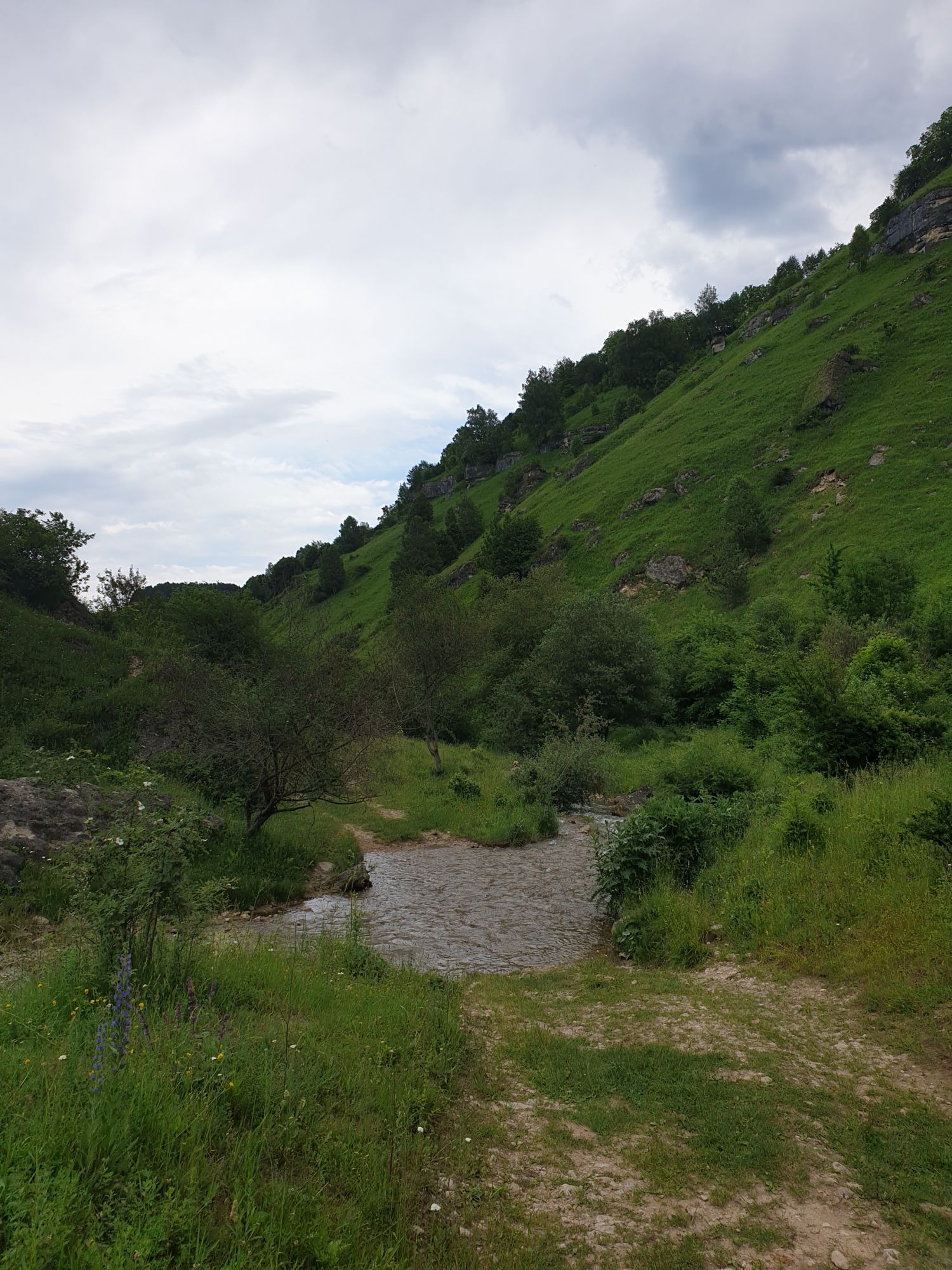 18 июля 2022 Вылазка первая. Березовское ущелье. Место очень красивое. И совсем-совсем близко, машина останется сегодня отдыхать. Одно но: обещали очень жаркий день, а спрятаться от солнца там почти негде. Но мы после Домбая злые и очень упертые. Решаем идти, а там как карта ляжет. До входа в ущелье стараемся выбирать тенистые дорожки и улочки. И вот оно, ущелье. Оно особенно тем, что довольно узкое и скалы здесь практически сразу начинают подниматься отвесно вверх на приличную высоту. Здесь шумит речка Березовка, здесь зелень и цветущий шиповник, здесь какое-то сумасшедшее число "скальных лиц": ветер и вода здесь особенно успешно потрудились. А еще петляющая тропинка, которая постоянно выводит к броду, коих здесь десятки - ущелье действительно узкое и отвесное. И живут орлы... И все это практически сразу, как заходишь в ущелье. Миновав небольшую жилую часть в самом начале ущелья, мы немножко побродили по ледяной воде, чтобы остудиться и настроиться, а потом пошли вперед... Но что удивляло и немного настораживало: вдалеке впереди небо не было таким уж солнечным, а предвещало совсем иные природные катаклизмы. Сначала мы с удовольствием избавились от рубашек, защищавших от солнца, потому что оно скрылось за тучками, потом перестали изнывать от жары и бодренько и с удовольствием пошли вперед, любуясь пейзажами и не забывая регулярно разуваться, чтобы в очередной раз перейти реку)) И только настойчивый гром немного нарушал идиллию В какой-то момент дождь начался. Точнее он из приятной прохладной водяной пыли стал дождиком, от которого мы предпочли укрыться под деревьями и спрятать технику и документы понадежнее)) Заодно тут же перекусили и отдохнули. А на противоположном берегу тем временем мирно паслись коровы: в КЧР это вообще норма, они по всем ущельям свободно гуляют. А мы, судя по карте и плохо работающему здесь GPS, как раз подходили к теоретической границе между Ставропольем и Карачаево-Черкессией))) Тут перед нами встала дилемма. С одной стороны дождь и прогноз неутешительный: затягивало и грохотало все сильнее. А с другой стороны я очень хотела прогуляться по ущелью подальше. И это было принципиально: мы в первую поездку здесь уже гуляли, но тогда прошли совсем немного, т.к. был уже вечер. Сейчас мы уже были прилично дальше, но... но мы же, напоминаю, были прилично злые после Домбая и решительно хотели все исправить... Я металась между здравым смыслом и желанием идти дальше. Не буду описывать все перепетии, но видно такое было у меня выражение лица, что муж принимает решение идти дальше. Что мы теряем в сущности?! Промокнем? Ну и ладно, все равно тепло, - была его аргументация. И я ему очень за то решение благодарна, я бы на здравый смысл повелась)))) В общем, мы отправились дальше, переждав сильный заряд дождя. Дальше фотографии будут чуток замыленные, потому что мелкий дождик не переставал почти все время. Но он практически не доставлял неудобств, лишь избавлял от жары и заставлял периодически прятать камеру. Мы дошли чуть дальше смотровой площадки, что нависает над ущельем у села Элькуш. Помимо прочего нам попалась черепушка, живописно надетая на огромный камень, несколько ржавеющих остовов машин в том месте, где над ущельем село - печальное напоминание о том, почему не нужно подъезжать к краю обрывов, особенно в горах и в плохую погоду, заросли так