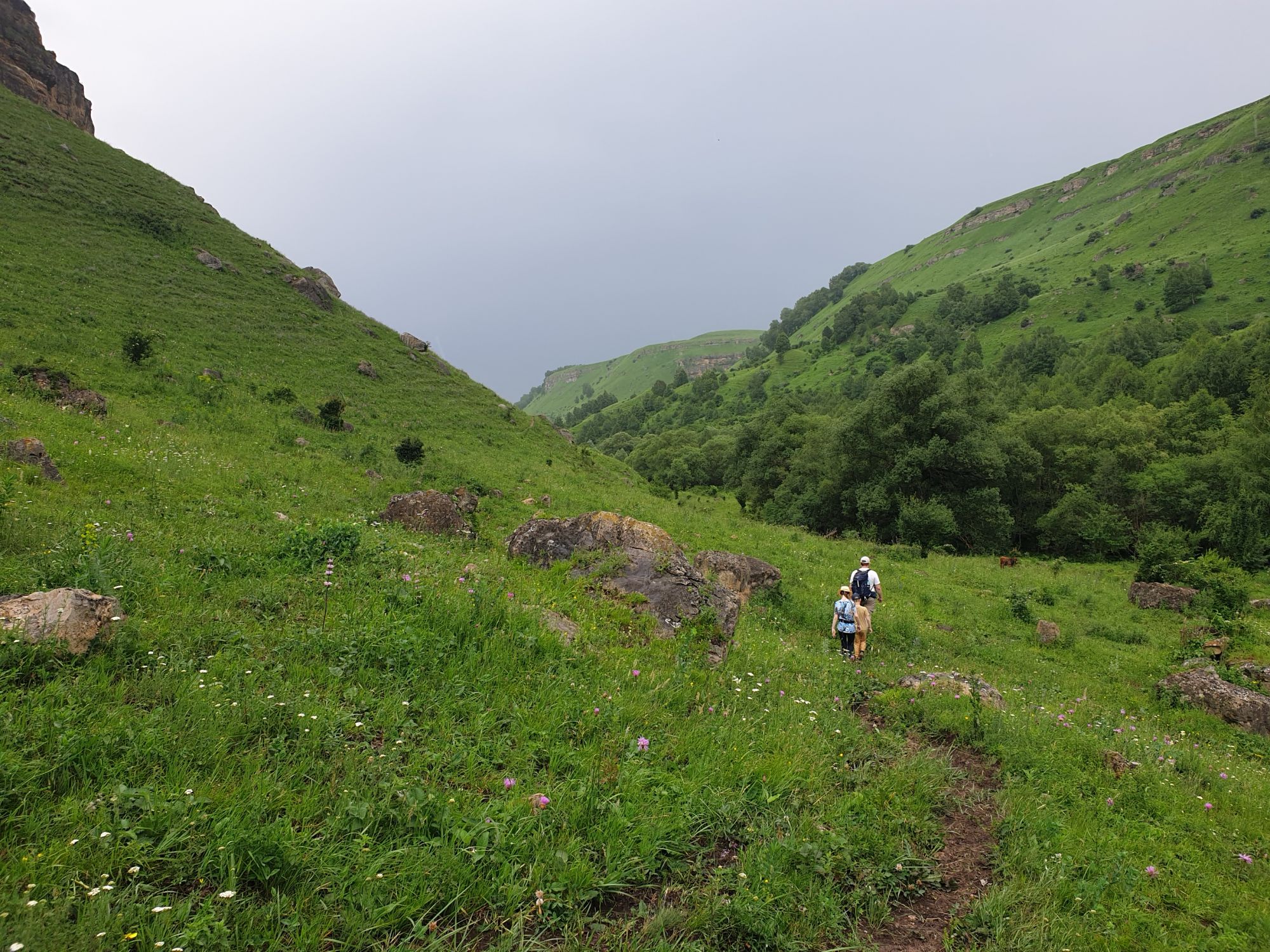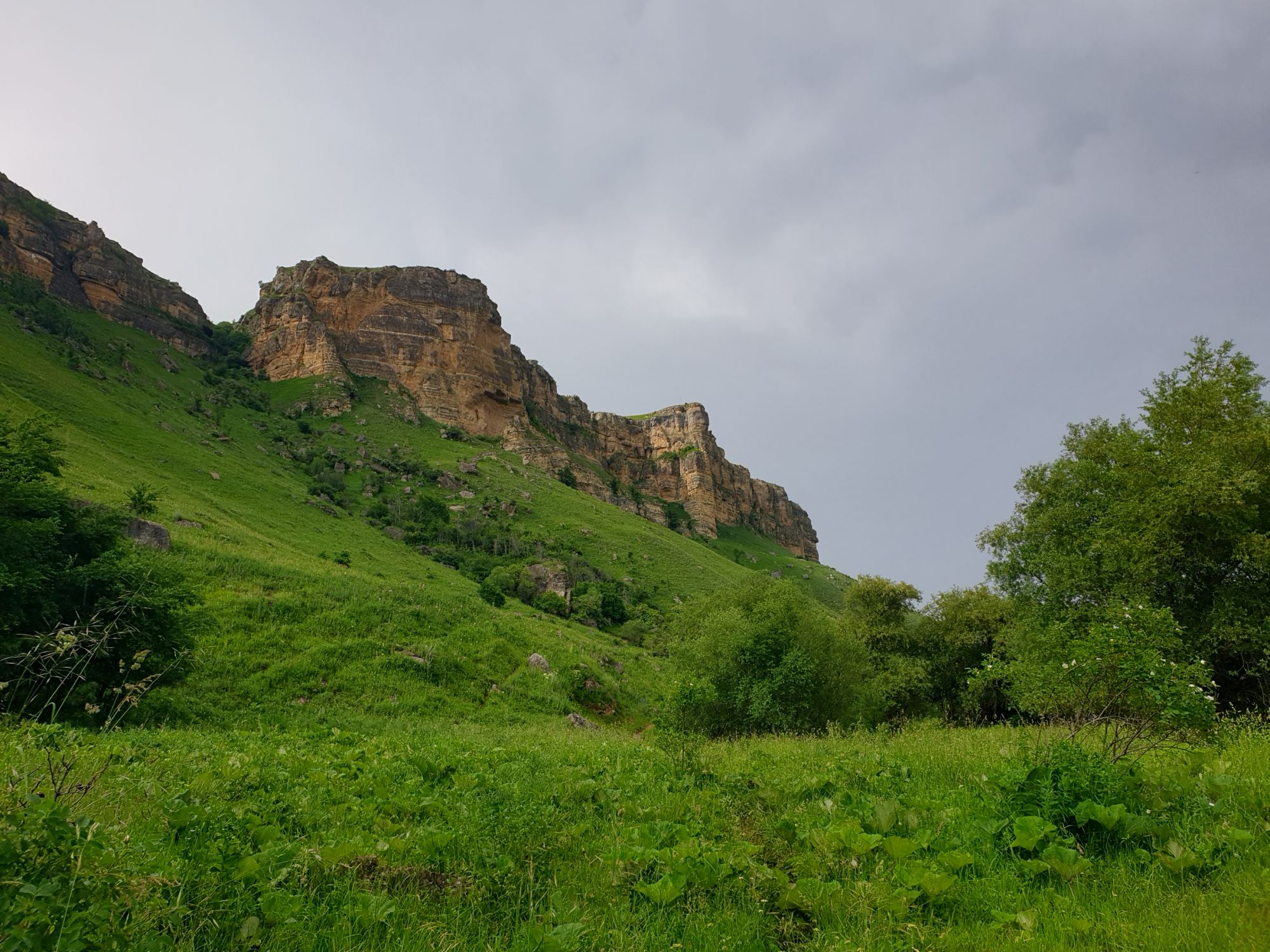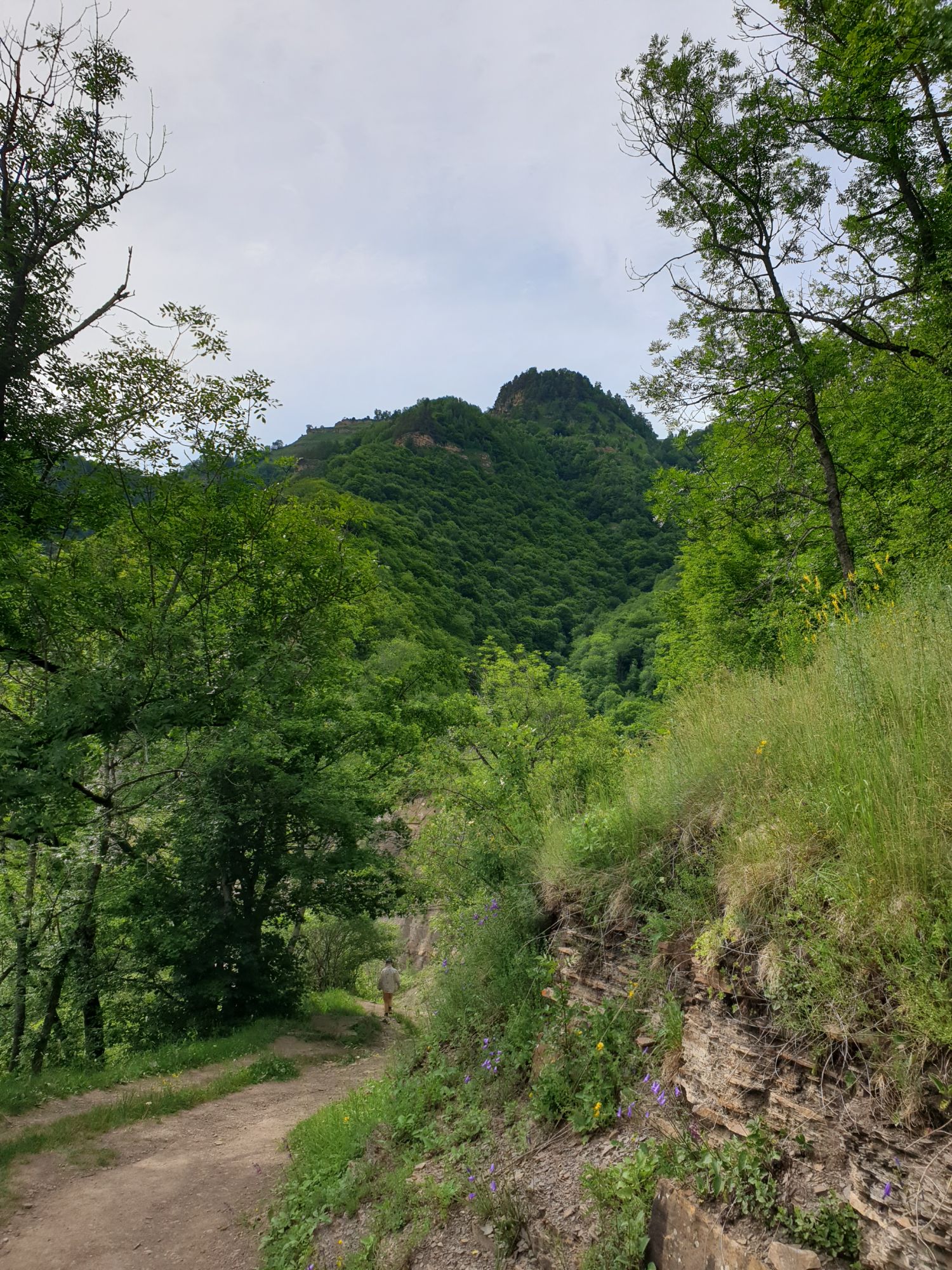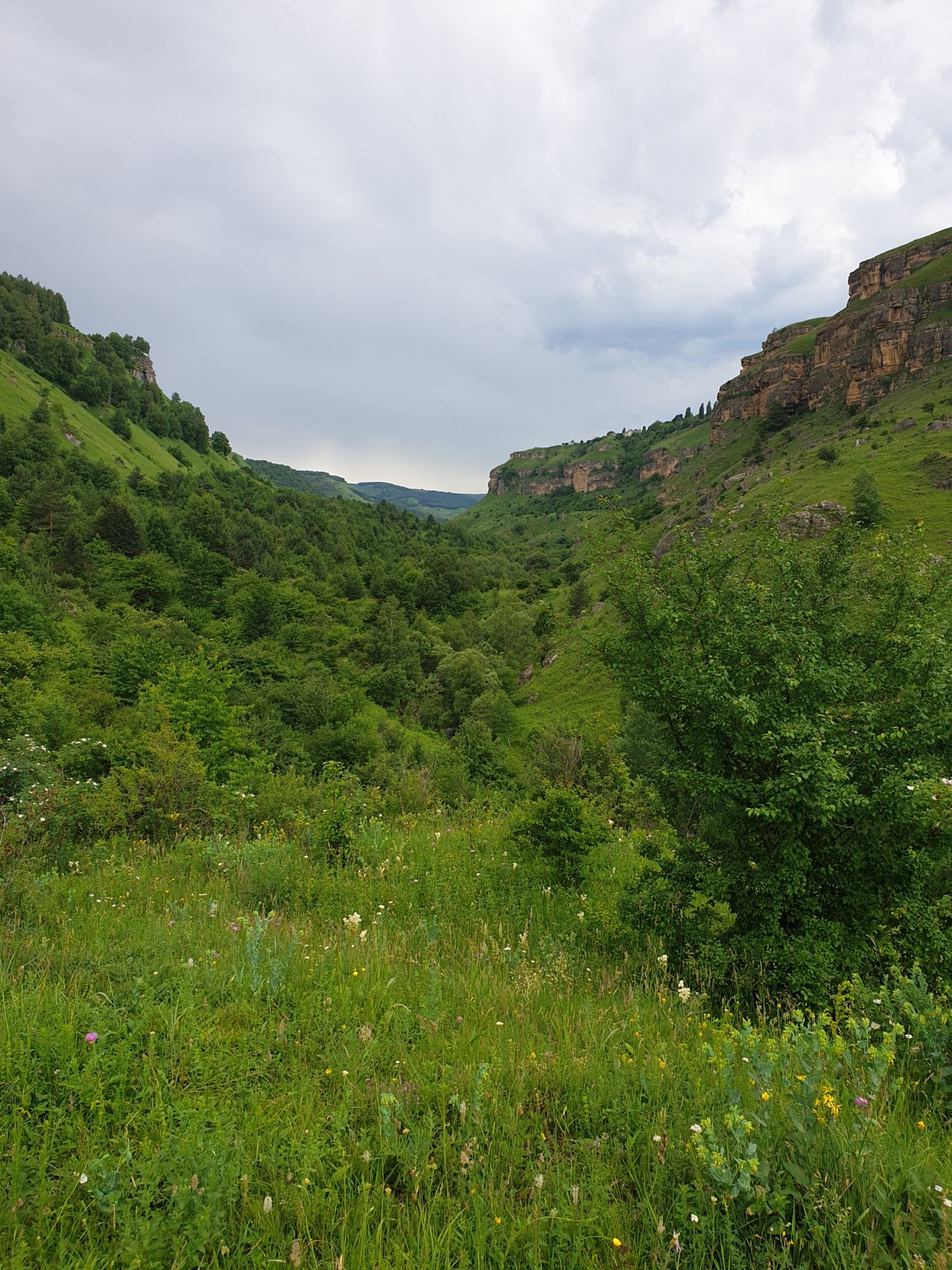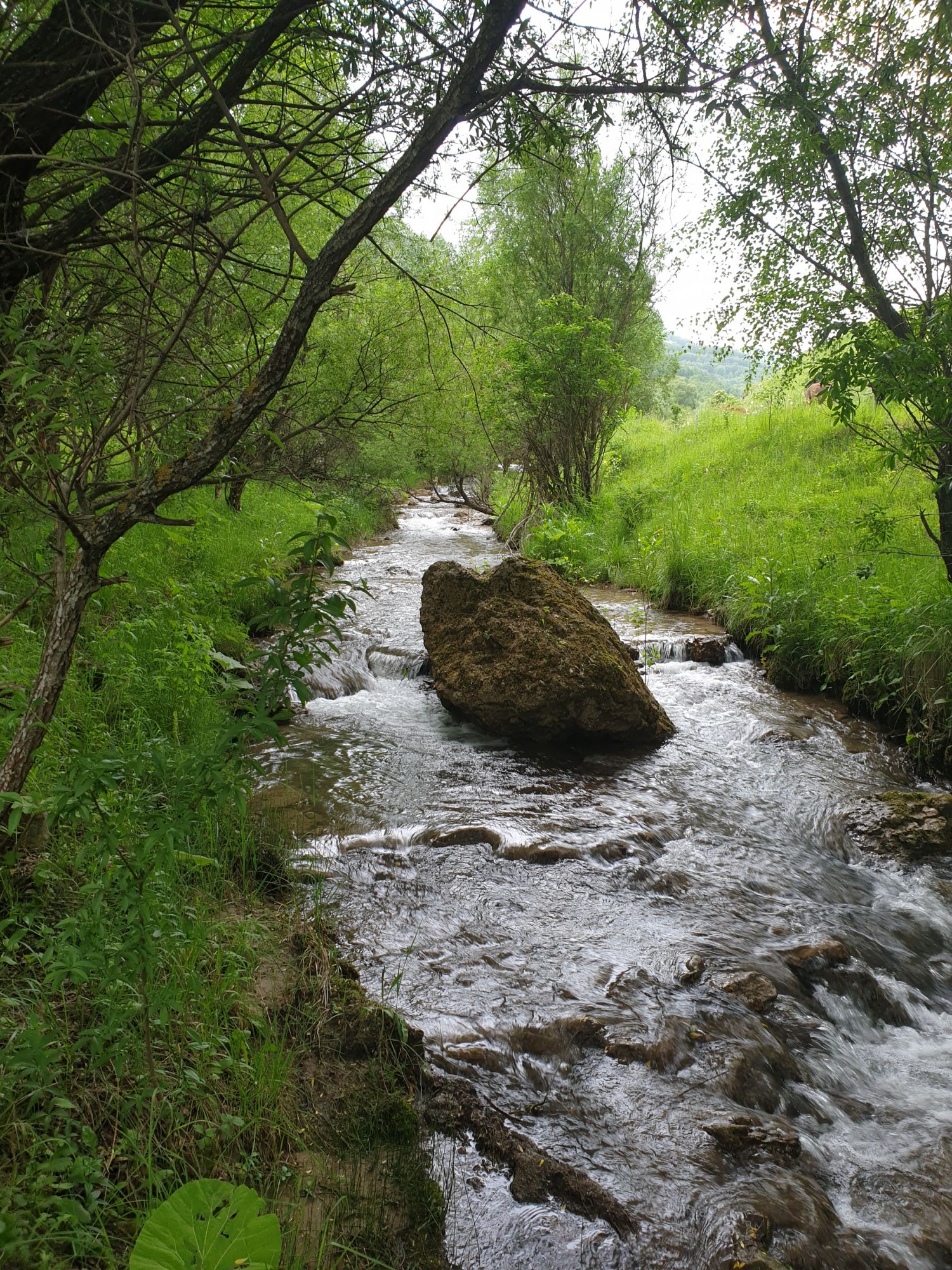 18 июля 2022 Вылазка первая. Березовское ущелье. Место очень красивое. И совсем-совсем близко, машина останется сегодня отдыхать. Одно но: обещали очень жаркий день, а спрятаться от солнца там почти негде. Но мы после Домбая злые и очень упертые. Решаем идти, а там как карта ляжет. До входа в ущелье стараемся выбирать тенистые дорожки и улочки. И вот оно, ущелье. Оно особенно тем, что довольно узкое и скалы здесь практически сразу начинают подниматься отвесно вверх на приличную высоту. Здесь шумит речка Березовка, здесь зелень и цветущий шиповник, здесь какое-то сумасшедшее число "скальных лиц": ветер и вода здесь особенно успешно потрудились. А еще петляющая тропинка, которая постоянно выводит к броду, коих здесь десятки - ущелье действительно узкое и отвесное. И живут орлы... И все это практически сразу, как заходишь в ущелье. Миновав небольшую жилую часть в самом начале ущелья, мы немножко побродили по ледяной воде, чтобы остудиться и настроиться, а потом пошли вперед... Но что удивляло и немного настораживало: вдалеке впереди небо не было таким уж солнечным, а предвещало совсем иные природные катаклизмы. Сначала мы с удовольствием избавились от рубашек, защищавших от солнца, потому что оно скрылось за тучками, потом перестали изнывать от жары и бодренько и с удовольствием пошли вперед, любуясь пейзажами и не забывая регулярно разуваться, чтобы в очередной раз перейти реку)) И только настойчивый гром немного нарушал идиллию В какой-то момент дождь начался. Точнее он из приятной прохладной водяной пыли стал дождиком, от которого мы предпочли укрыться под деревьями и спрятать технику и документы понадежнее)) Заодно тут же перекусили и отдохнули. А на противоположном берегу тем временем мирно паслись коровы: в КЧР это вообще норма, они по всем ущельям свободно гуляют. А мы, судя по карте и плохо работающему здесь GPS, как раз подходили к теоретической границе между Ставропольем и Карачаево-Черкессией))) Тут перед нами встала дилемма. С одной стороны дождь и прогноз неутешительный: затягивало и грохотало все сильнее. А с другой стороны я очень хотела прогуляться по ущелью подальше. И это было принципиально: мы в первую поездку здесь уже гуляли, но тогда прошли совсем немного, т.к. был уже вечер. Сейчас мы уже были прилично дальше, но... но мы же, напоминаю, были прилично злые после Домбая и решительно хотели все исправить... Я металась между здравым смыслом и желанием идти дальше. Не буду описывать все перепетии, но видно такое было у меня выражение лица, что муж принимает решение идти дальше. Что мы теряем в сущности?! Промокнем? Ну и ладно, все равно тепло, - была его аргументация. И я ему очень за то решение благодарна, я бы на здравый смысл повелась)))) В общем, мы отправились дальше, переждав сильный заряд дождя. Дальше фотографии будут чуток замыленные, потому что мелкий дождик не переставал почти все время. Но он практически не доставлял неудобств, лишь избавлял от жары и заставлял периодически прятать камеру. Мы дошли чуть дальше смотровой площадки, что нависает над ущельем у села Элькуш. Помимо прочего нам попалась черепушка, живописно надетая на огромный камень, несколько ржавеющих остовов машин в том месте, где над ущельем село - печальное напоминание о том, почему не нужно подъезжать к краю обрывов, особенно в горах и в плохую погоду, заросли так