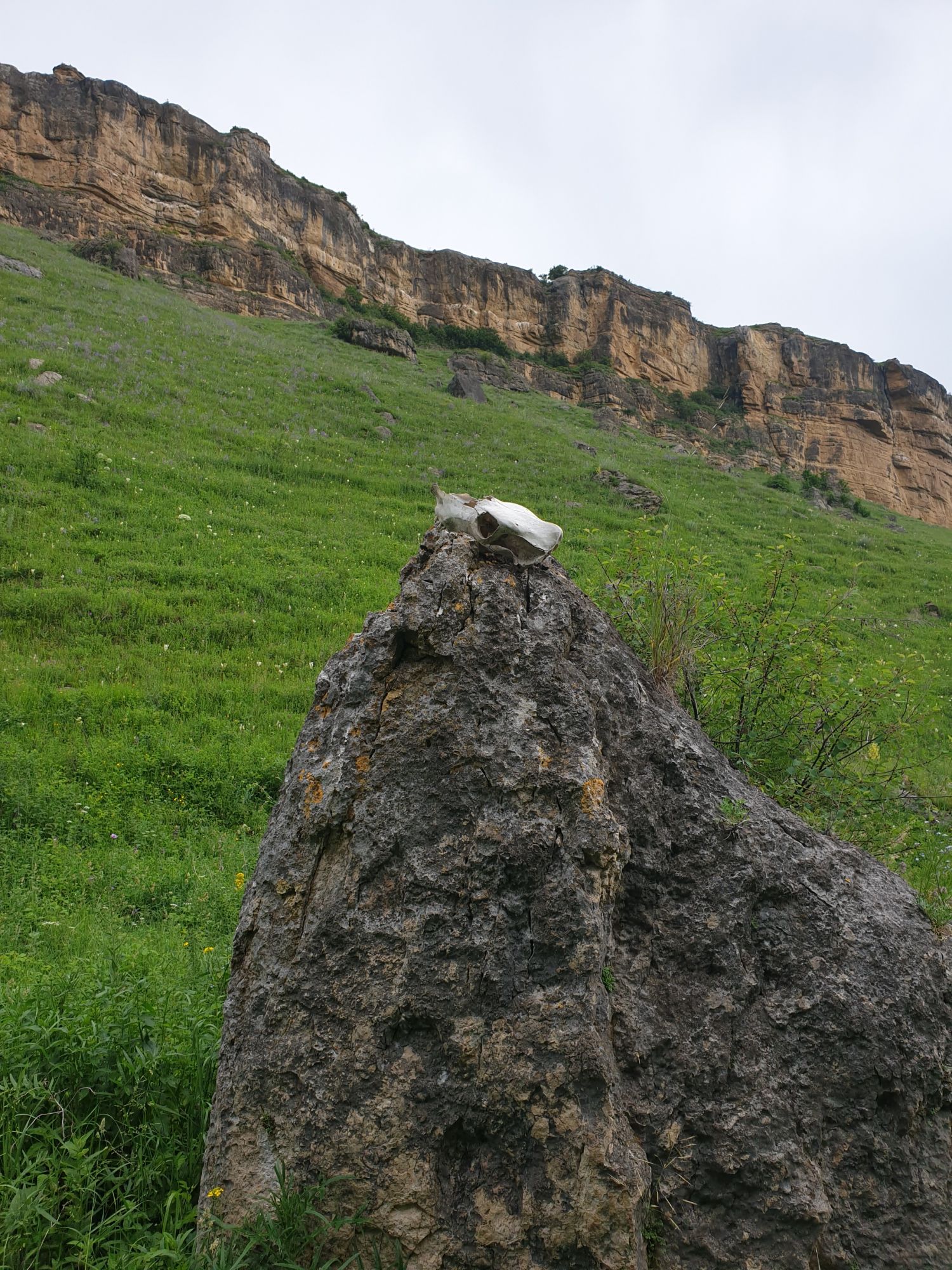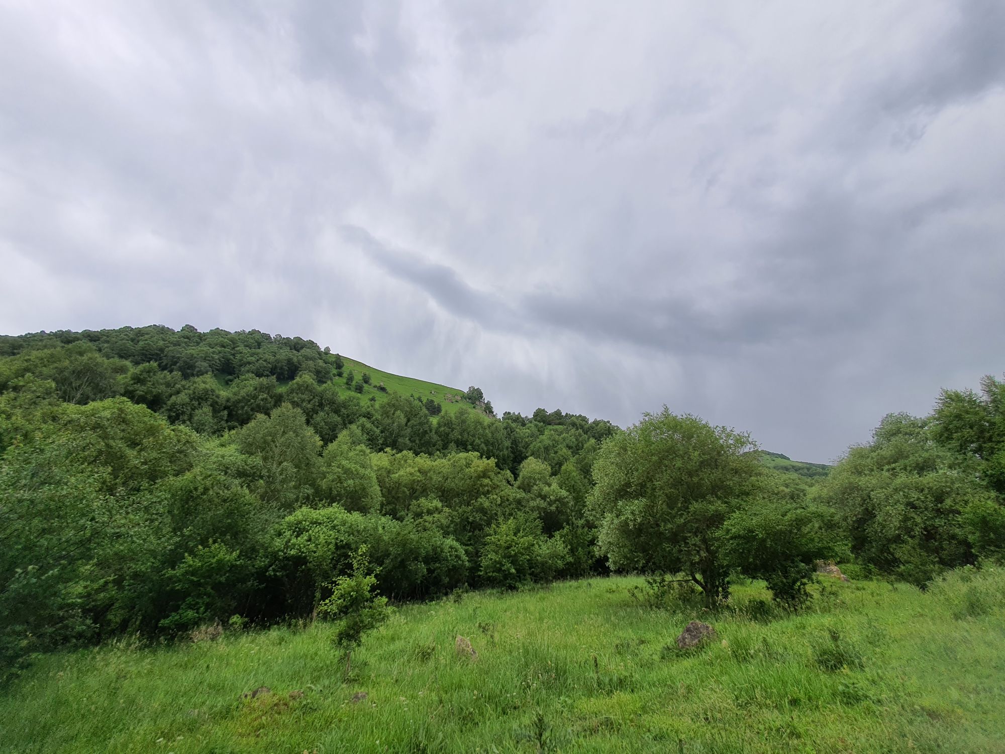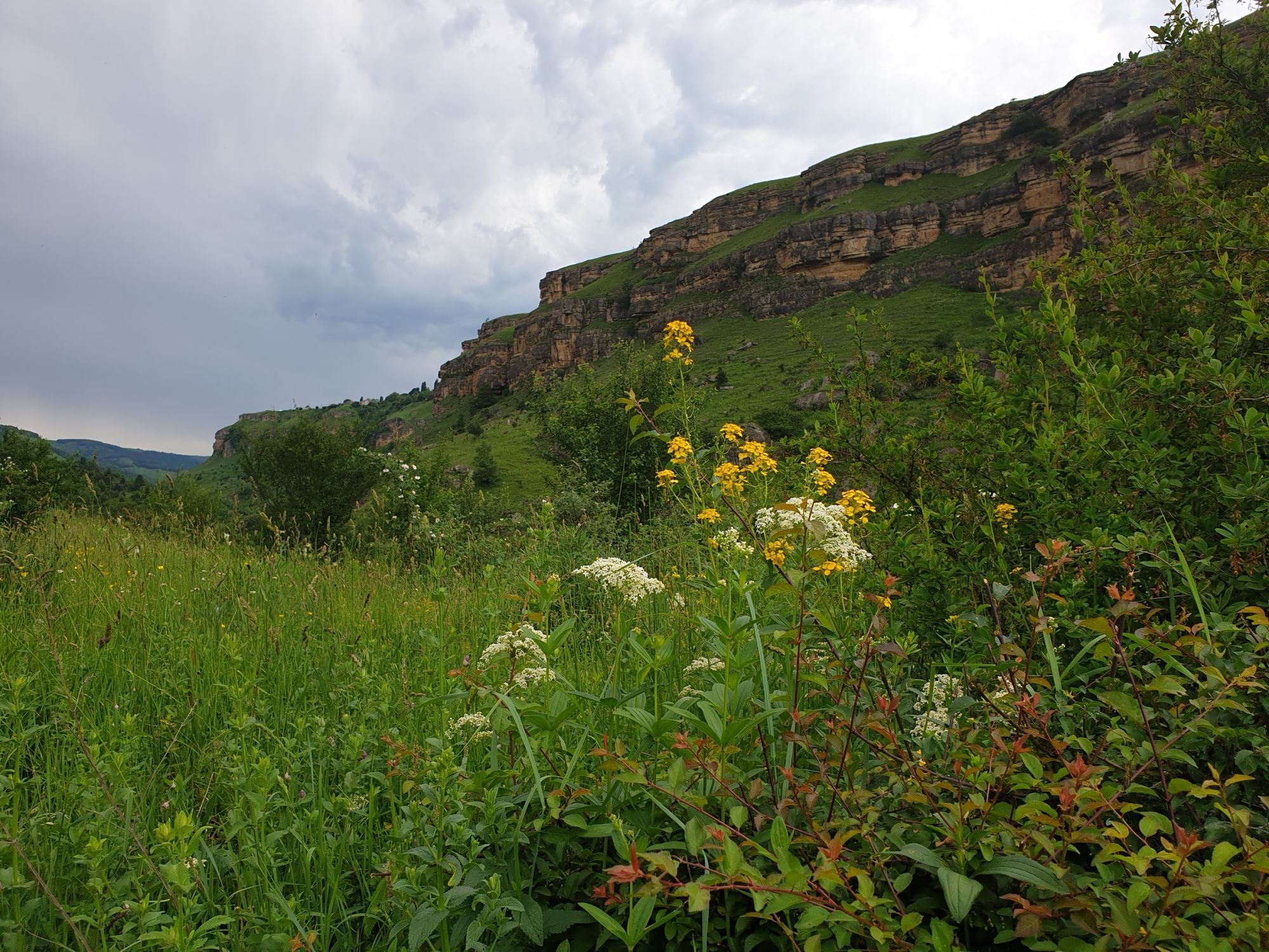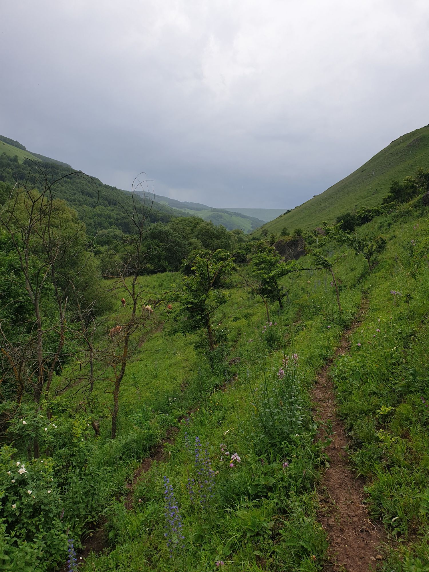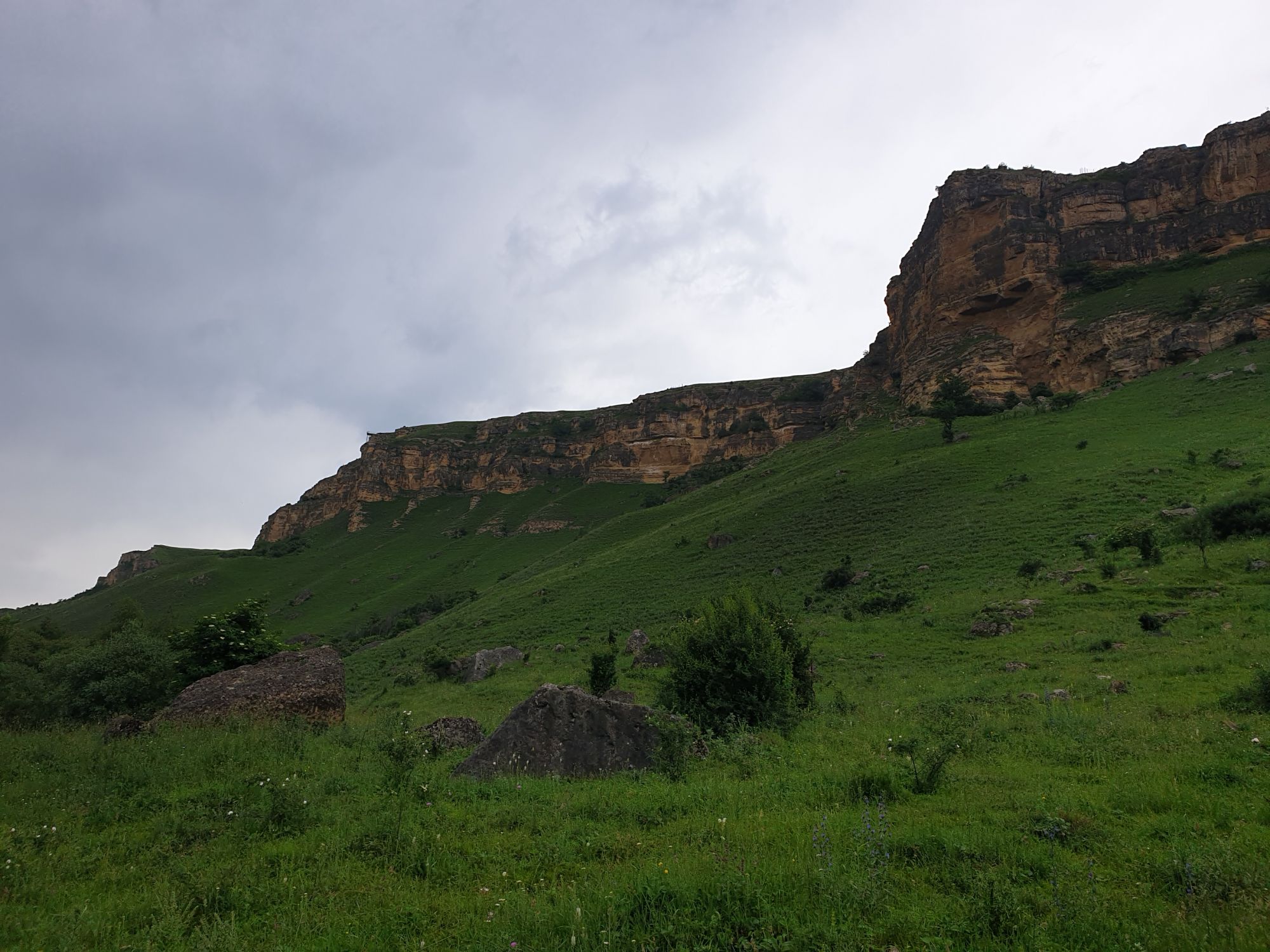 18 июля 2022 Вылазка первая. Березовское ущелье. Место очень красивое. И совсем-совсем близко, машина останется сегодня отдыхать. Одно но: обещали очень жаркий день, а спрятаться от солнца там почти негде. Но мы после Домбая злые и очень упертые. Решаем идти, а там как карта ляжет. До входа в ущелье стараемся выбирать тенистые дорожки и улочки. И вот оно, ущелье. Оно особенно тем, что довольно узкое и скалы здесь практически сразу начинают подниматься отвесно вверх на приличную высоту. Здесь шумит речка Березовка, здесь зелень и цветущий шиповник, здесь какое-то сумасшедшее число "скальных лиц": ветер и вода здесь особенно успешно потрудились. А еще петляющая тропинка, которая постоянно выводит к броду, коих здесь десятки - ущелье действительно узкое и отвесное. И живут орлы... И все это практически сразу, как заходишь в ущелье. Миновав небольшую жилую часть в самом начале ущелья, мы немножко побродили по ледяной воде, чтобы остудиться и настроиться, а потом пошли вперед... Но что удивляло и немного настораживало: вдалеке впереди небо не было таким уж солнечным, а предвещало совсем иные природные катаклизмы. Сначала мы с удовольствием избавились от рубашек, защищавших от солнца, потому что оно скрылось за тучками, потом перестали изнывать от жары и бодренько и с удовольствием пошли вперед, любуясь пейзажами и не забывая регулярно разуваться, чтобы в очередной раз перейти реку)) И только настойчивый гром немного нарушал идиллию В какой-то момент дождь начался. Точнее он из приятной прохладной водяной пыли стал дождиком, от которого мы предпочли укрыться под деревьями и спрятать технику и документы понадежнее)) Заодно тут же перекусили и отдохнули. А на противоположном берегу тем временем мирно паслись коровы: в КЧР это вообще норма, они по всем ущельям свободно гуляют. А мы, судя по карте и плохо работающему здесь GPS, как раз подходили к теоретической границе между Ставропольем и Карачаево-Черкессией))) Тут перед нами встала дилемма. С одной стороны дождь и прогноз неутешительный: затягивало и грохотало все сильнее. А с другой стороны я очень хотела прогуляться по ущелью подальше. И это было принципиально: мы в первую поездку здесь уже гуляли, но тогда прошли совсем немного, т.к. был уже вечер. Сейчас мы уже были прилично дальше, но... но мы же, напоминаю, были прилично злые после Домбая и решительно хотели все исправить... Я металась между здравым смыслом и желанием идти дальше. Не буду описывать все перепетии, но видно такое было у меня выражение лица, что муж принимает решение идти дальше. Что мы теряем в сущности?! Промокнем? Ну и ладно, все равно тепло, - была его аргументация. И я ему очень за то решение благодарна, я бы на здравый смысл повелась)))) В общем, мы отправились дальше, переждав сильный заряд дождя. Дальше фотографии будут чуток замыленные, потому что мелкий дождик не переставал почти все время. Но он практически не доставлял неудобств, лишь избавлял от жары и заставлял периодически прятать камеру. Мы дошли чуть дальше смотровой площадки, что нависает над ущельем у села Элькуш. Помимо прочего нам попалась черепушка, живописно надетая на огромный камень, несколько ржавеющих остовов машин в том месте, где над ущельем село - печальное напоминание о том, почему не нужно подъезжать к краю обрывов, особенно в горах и в плохую погоду, заросли так