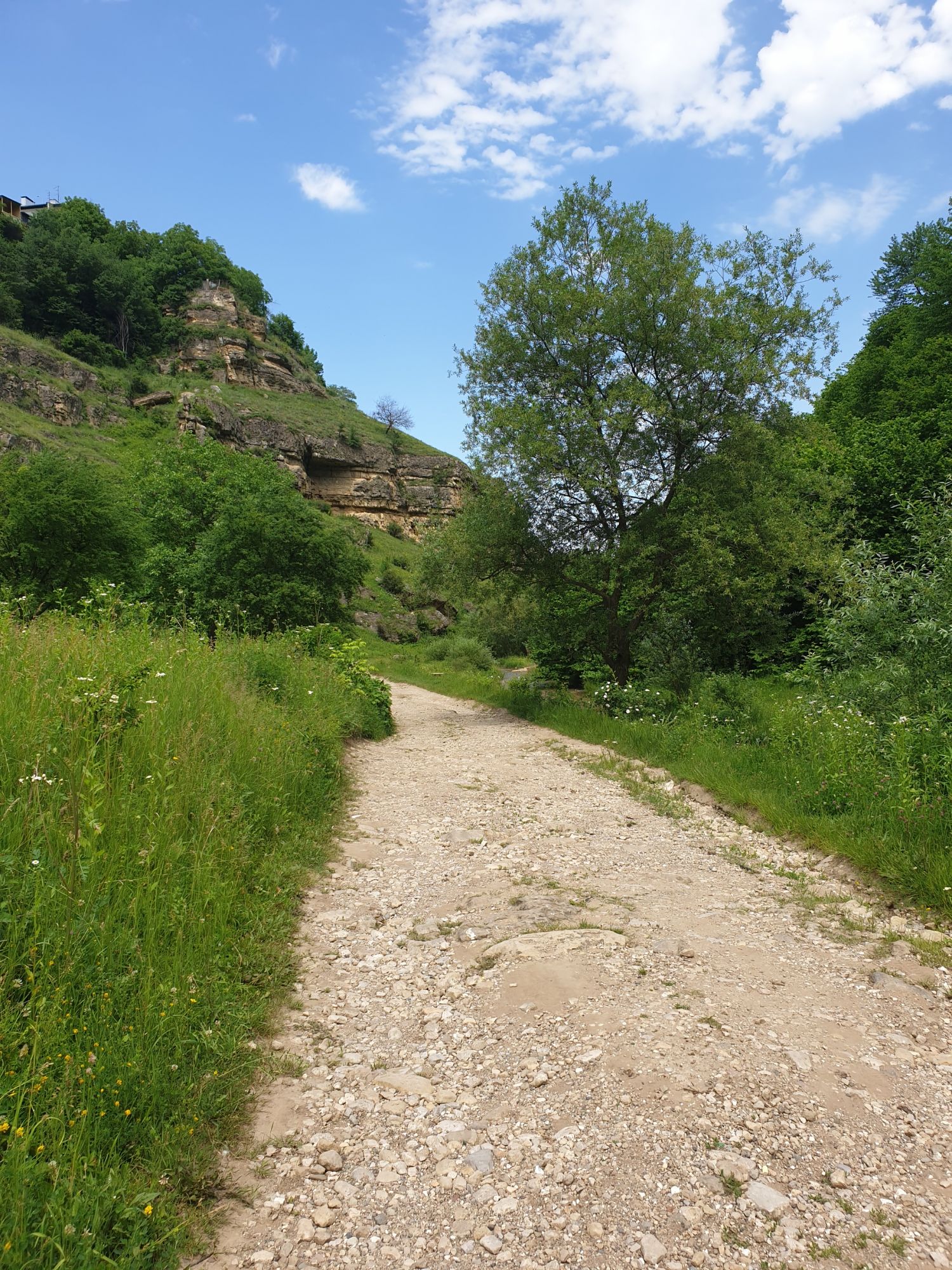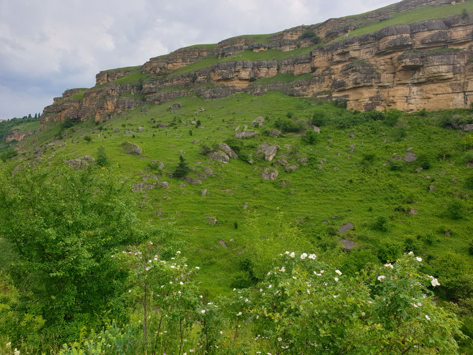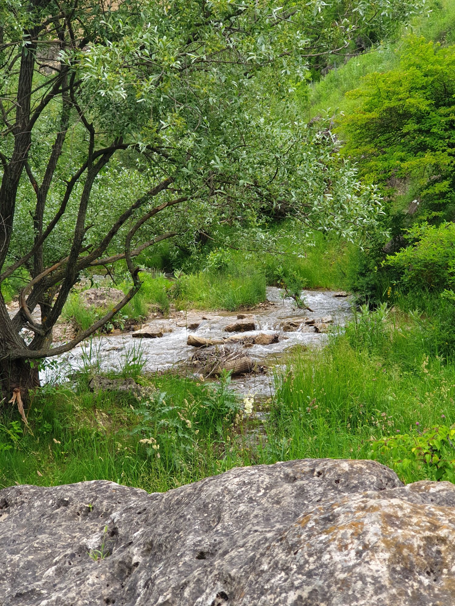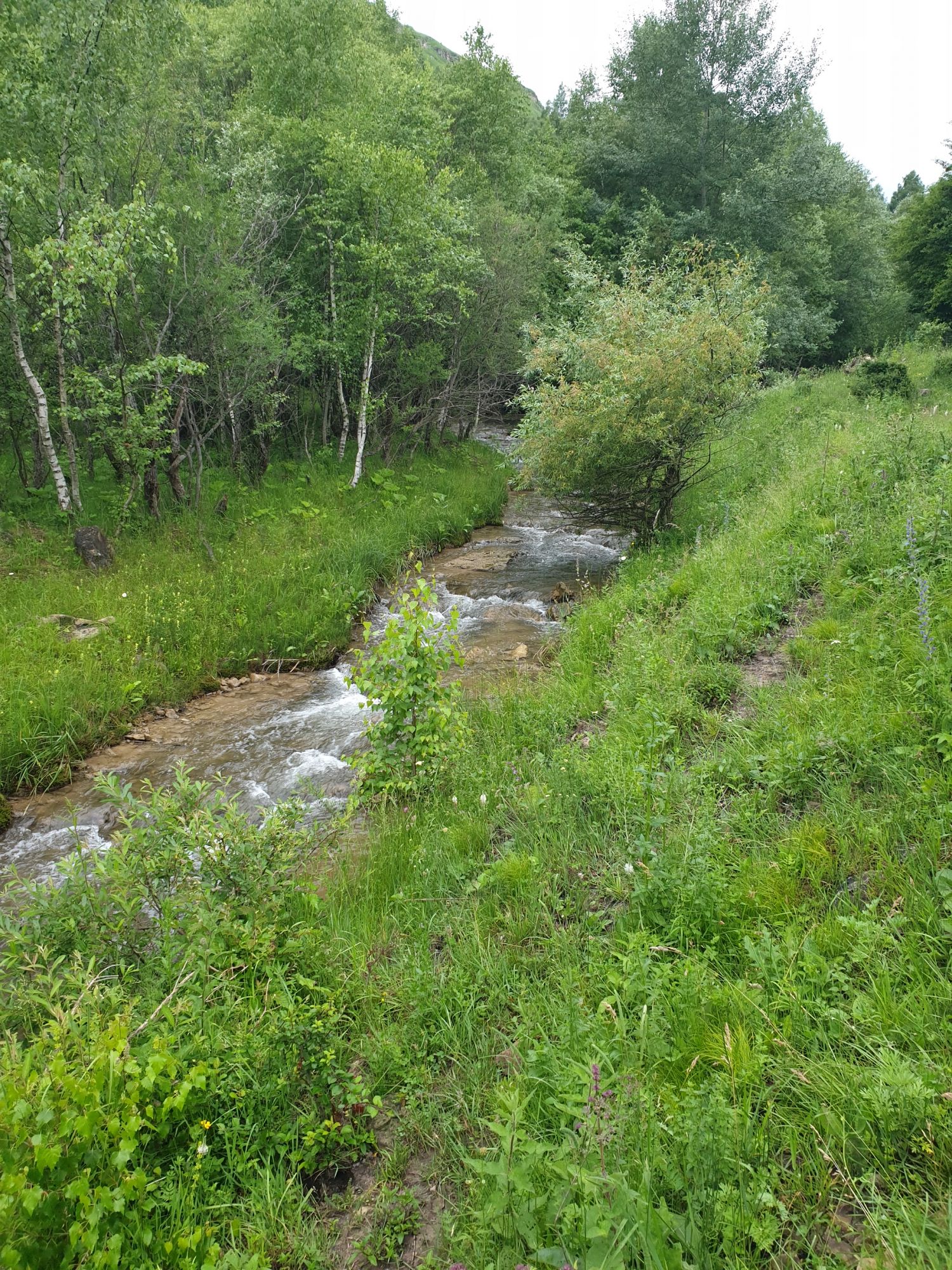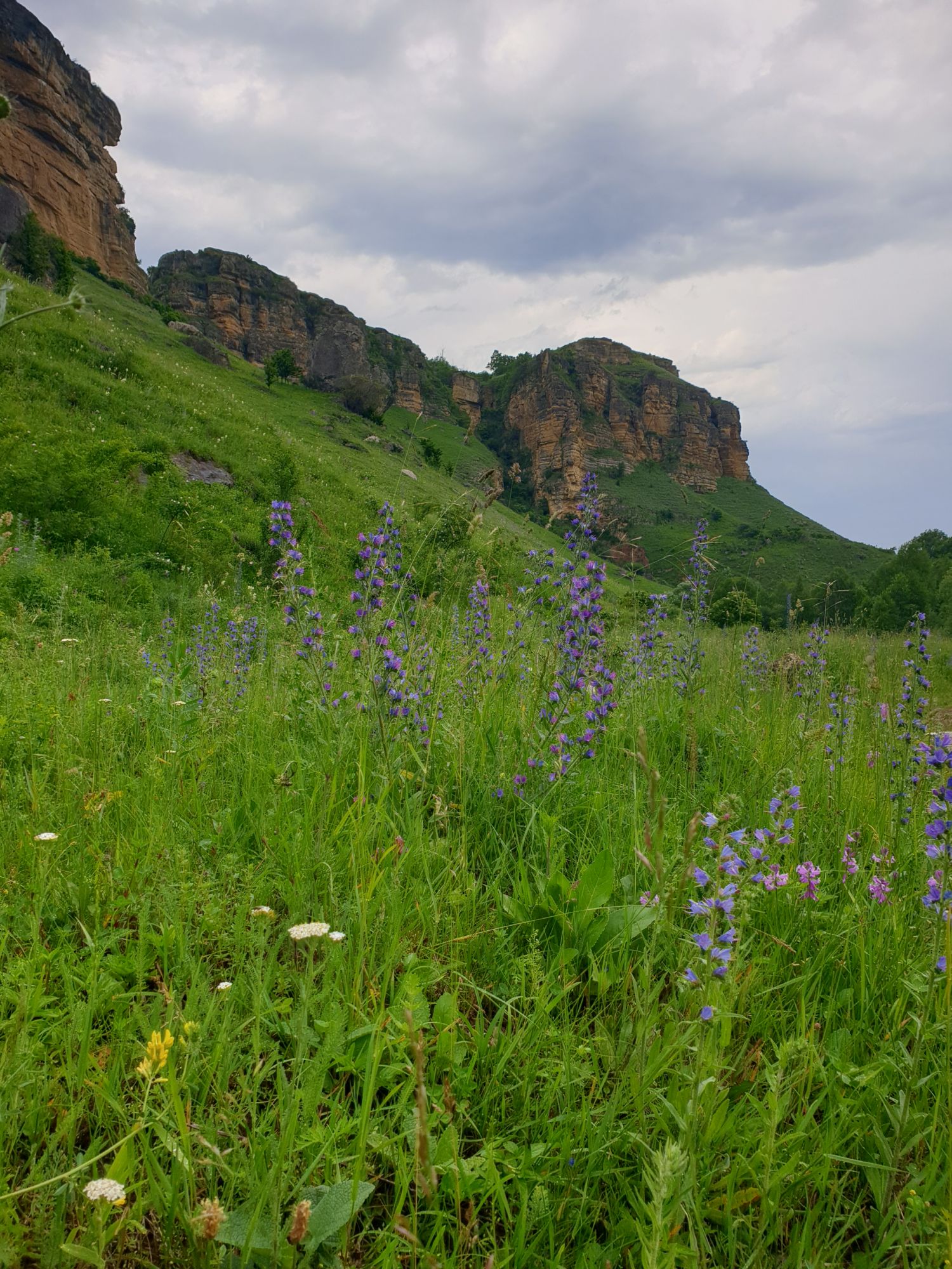 18 июля 2022 Вылазка первая. Березовское ущелье. Место очень красивое. И совсем-совсем близко, машина останется сегодня отдыхать. Одно но: обещали очень жаркий день, а спрятаться от солнца там почти негде. Но мы после Домбая злые и очень упертые. Решаем идти, а там как карта ляжет. До входа в ущелье стараемся выбирать тенистые дорожки и улочки. И вот оно, ущелье. Оно особенно тем, что довольно узкое и скалы здесь практически сразу начинают подниматься отвесно вверх на приличную высоту. Здесь шумит речка Березовка, здесь зелень и цветущий шиповник, здесь какое-то сумасшедшее число "скальных лиц": ветер и вода здесь особенно успешно потрудились. А еще петляющая тропинка, которая постоянно выводит к броду, коих здесь десятки - ущелье действительно узкое и отвесное. И живут орлы... И все это практически сразу, как заходишь в ущелье. Миновав небольшую жилую часть в самом начале ущелья, мы немножко побродили по ледяной воде, чтобы остудиться и настроиться, а потом пошли вперед... Но что удивляло и немного настораживало: вдалеке впереди небо не было таким уж солнечным, а предвещало совсем иные природные катаклизмы. Сначала мы с удовольствием избавились от рубашек, защищавших от солнца, потому что оно скрылось за тучками, потом перестали изнывать от жары и бодренько и с удовольствием пошли вперед, любуясь пейзажами и не забывая регулярно разуваться, чтобы в очередной раз перейти реку)) И только настойчивый гром немного нарушал идиллию В какой-то момент дождь начался. Точнее он из приятной прохладной водяной пыли стал дождиком, от которого мы предпочли укрыться под деревьями и спрятать технику и документы понадежнее)) Заодно тут же перекусили и отдохнули. А на противоположном берегу тем временем мирно паслись коровы: в КЧР это вообще норма, они по всем ущельям свободно гуляют. А мы, судя по карте и плохо работающему здесь GPS, как раз подходили к теоретической границе между Ставропольем и Карачаево-Черкессией))) Тут перед нами встала дилемма. С одной стороны дождь и прогноз неутешительный: затягивало и грохотало все сильнее. А с другой стороны я очень хотела прогуляться по ущелью подальше. И это было принципиально: мы в первую поездку здесь уже гуляли, но тогда прошли совсем немного, т.к. был уже вечер. Сейчас мы уже были прилично дальше, но... но мы же, напоминаю, были прилично злые после Домбая и решительно хотели все исправить... Я металась между здравым смыслом и желанием идти дальше. Не буду описывать все перепетии, но видно такое было у меня выражение лица, что муж принимает решение идти дальше. Что мы теряем в сущности?! Промокнем? Ну и ладно, все равно тепло, - была его аргументация. И я ему очень за то решение благодарна, я бы на здравый смысл повелась)))) В общем, мы отправились дальше, переждав сильный заряд дождя. Дальше фотографии будут чуток замыленные, потому что мелкий дождик не переставал почти все время. Но он практически не доставлял неудобств, лишь избавлял от жары и заставлял периодически прятать камеру. Мы дошли чуть дальше смотровой площадки, что нависает над ущельем у села Элькуш. Помимо прочего нам попалась черепушка, живописно надетая на огромный камень, несколько ржавеющих остовов машин в том месте, где над ущельем село - печальное напоминание о том, почему не нужно подъезжать к краю обрывов, особенно в горах и в плохую погоду, заросли так