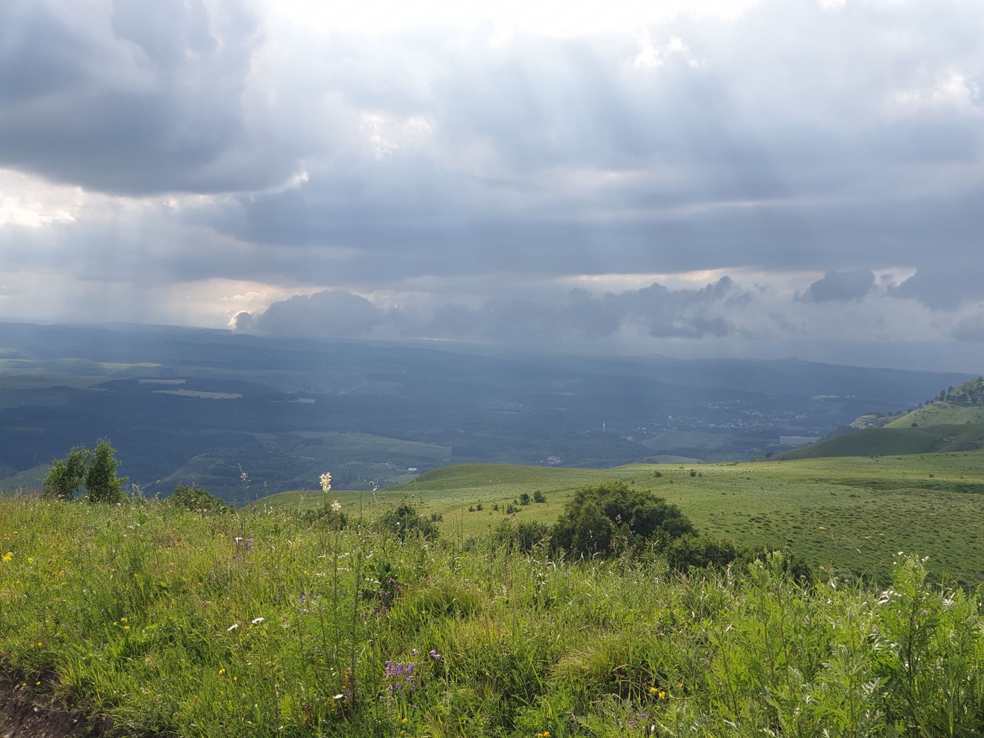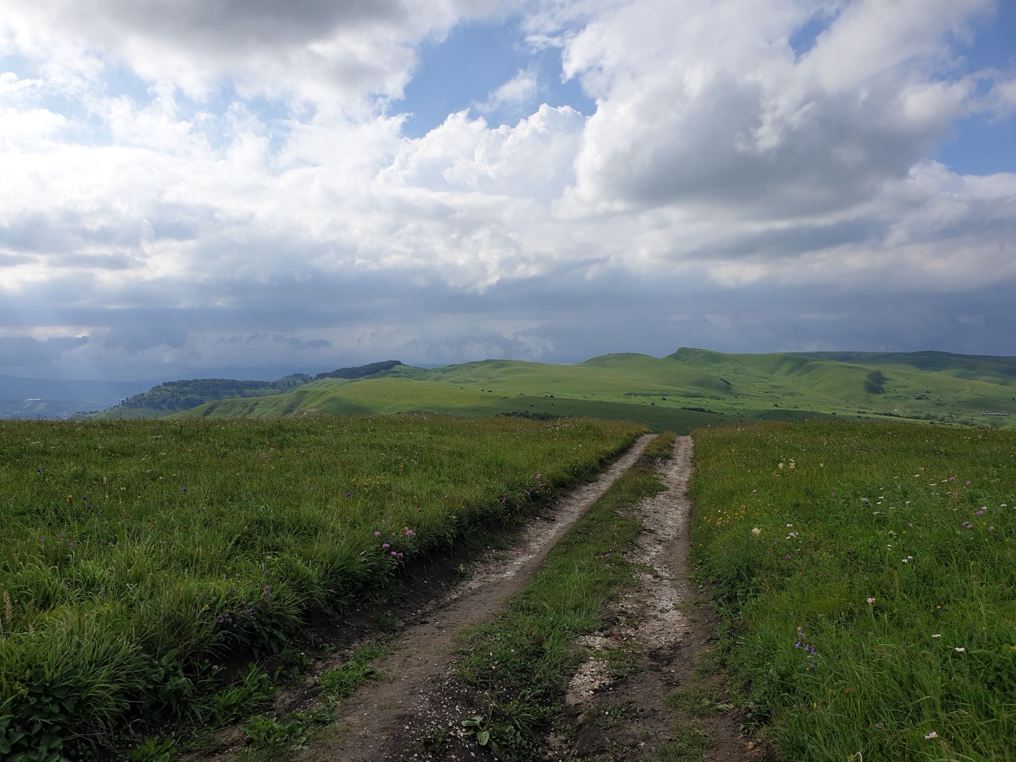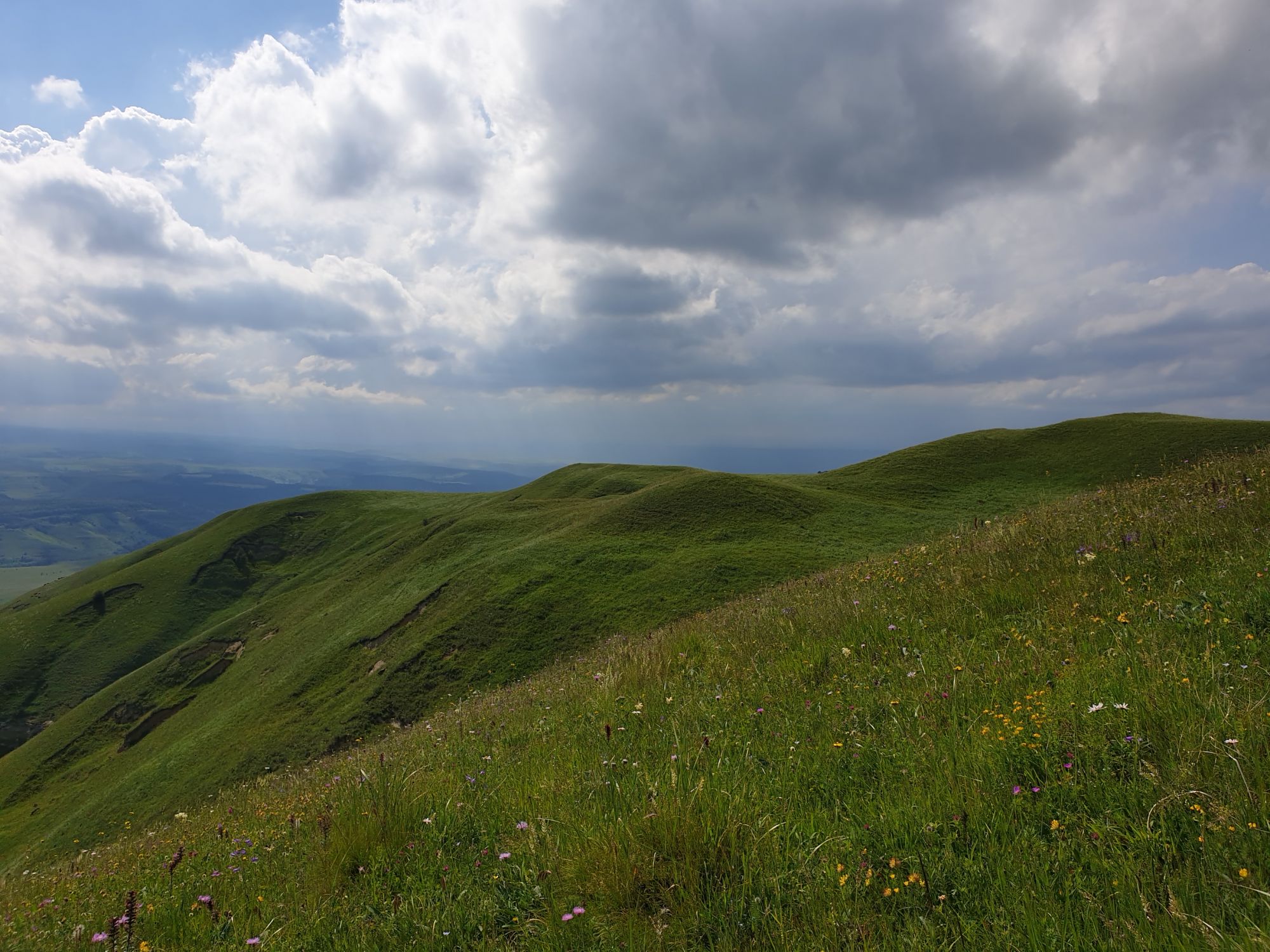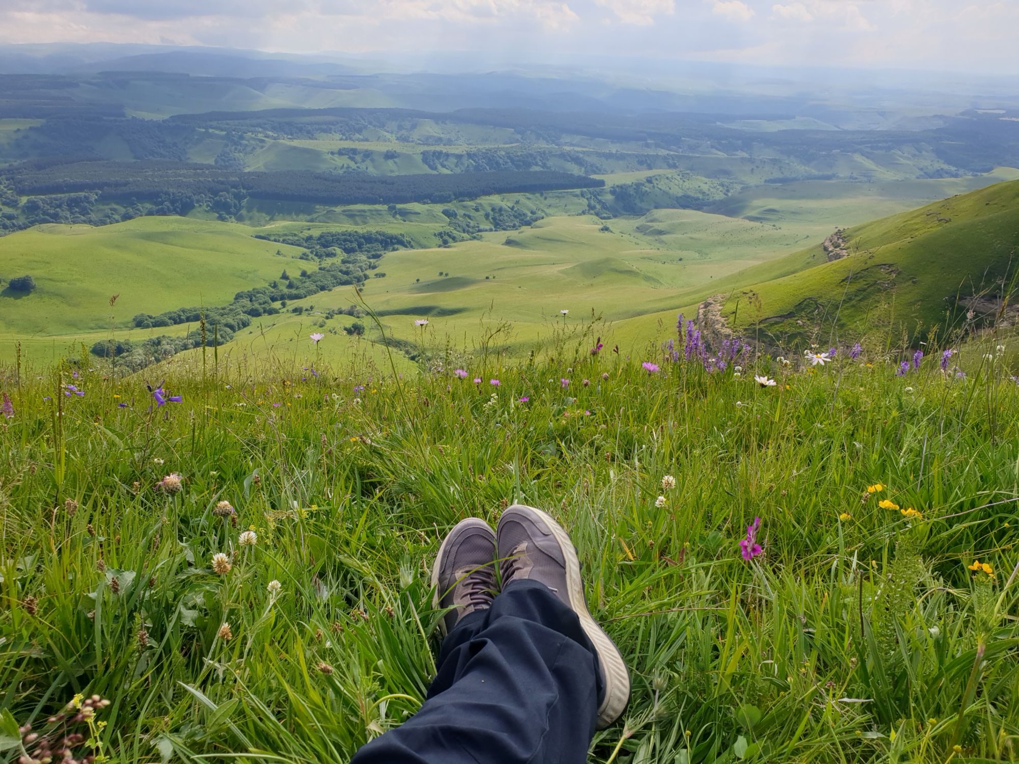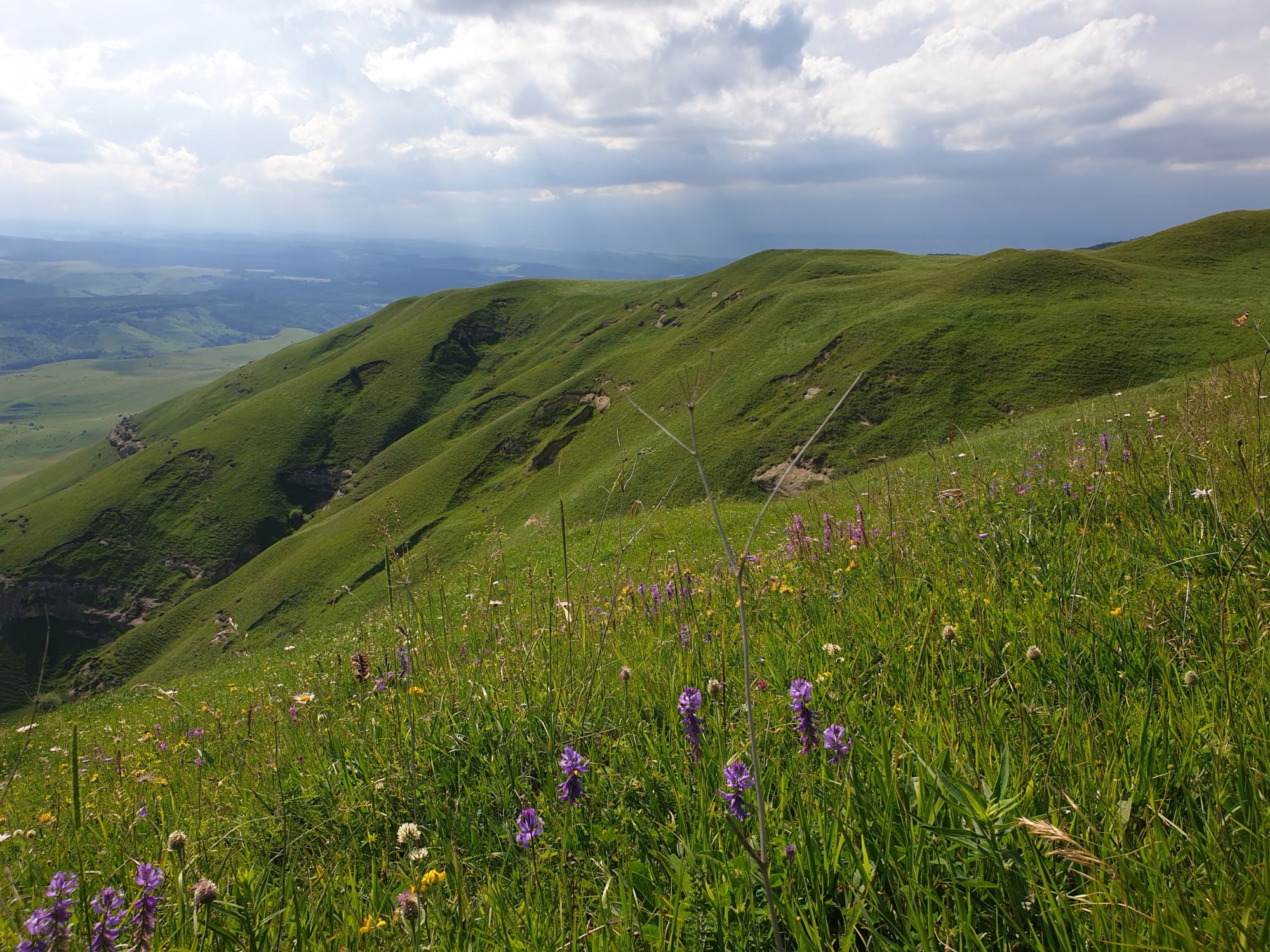 18 июля 2022 Вылазка вторая. Прогулка к Малому Джиналу. Это уже из Кисловодского парка. Гора повыше Малого седла и чуточку пониже Большого (1379м над уровнем моря, если не ошибаюсь). Но подальше от парка и города. Собственно вообще не понятно, к чему она ближе: к Пятигорску, Ессентукам или Кисловодску, но из Кисловодска дорога понятная, не особенно сложная и красивая. Да и мы в Кисловодске))) А еще, по отзывам, оттуда Эльбрус виден едва ли не от самого подножия! Нет, мы не надеялись увидеть Эльбрус, ибо облака, тучи и все тот же прогноз погоды. Но пройти новыми дорогами и немного дальше - почему бы и нет! Тем более это было в тот самый день, когда сорвалась поездка в Джилы-су. Мы поднялись до Малого седла той же дорогой, что и в первый раз. И в это раз подъем дался намного проще: организм таки действительно включился и заработал! Лён изумительно смотрится в горах! А тени от облаков на зеленых склонах сегодня были особенно интересными. Мы на минуточку заглянули на смотровую Малого седла и отправились дальше, мимо того лесочка, где в прошлый раз гуляли и нашли дикую лилию. Я думала, что "до новых мест" почти не буду фотографировать, но как бы не так! Взгляд моментально зацепился за "новые цветочки" : несколько дней назад они еще не цвели, мы тут все травки изучили Яндекс определил как одну из разновидностей дикого клематиса (ломоноса), но я в вопрос не углублялась, точно сказать не могу. А дальше, оставив слева дорогу на Большое седло, мы отправились к новым приключениям. Дорогу было не потерять, она тут одна и подозреваю, что по ней и на внедорожниках ездят, особенно к местам летнего выгона скота, поэтому оставалось только подниматься и спускаться, спускаться и подниматься, преодолевая одну горку за другой. И крутить головой на 360 градусов, конечно. Потому что виды тут невообразимые! В какой-то момент, обернувшись назад, мы увидели лишь макушку Большого седла, на которое с неделю назад забирались. И тот самый лес на соседней с Малым седлом горке. А потом, уже ближе к концу путешествия слева вдалеке открылся вид на пятиглавый Бештау. А слева неизменные зеленые просторы в направление Главного Кавказского хребта. По прямой до него рукой подать, но облака сегодня укрыли горизонт весьма надежно. И они же сделали фотографии особенно живыми и разнообразными) Вокруг цвели луга и это вызывало такой неизъяснимый восторг в душе! Бескрайний густой ковер из цветов, таких трогательных, ярких и нежных одновременно. Я уже старалсь сдерживаться и не снимать каждый цветок (иначе бы никуда не дошли) Но несколько "интересностей" пропустить не могла. Подальше и повыше стали довольно регулярно попадаться орхидеи: А вот этот нежный и миниатюрный красавец удивил. Яндекс определил его как дикий гладиолус! Представляете?! И я склонна ему верить (листья тоже сходятся) . Росточка в этом малыше см 20! Ну и из прочего немного: Преодолев очередной большой подъем мы увидели перед собой завораживающую картину, какую-то бескрайнюю во все стороны. Особенно густая трава и цветы, особенно живописный Бештау как завершение пейзажа с цветущим альпийским лугом, особенно бесконечное и живое море внизу слева и до горизонта... Захотелось остановить момент и погрузиться в него с головой. Запечатлеть его в памяти, в голове, поставить этот вид в рамку на самое видное место в мыслях и благодарить, благодарить,