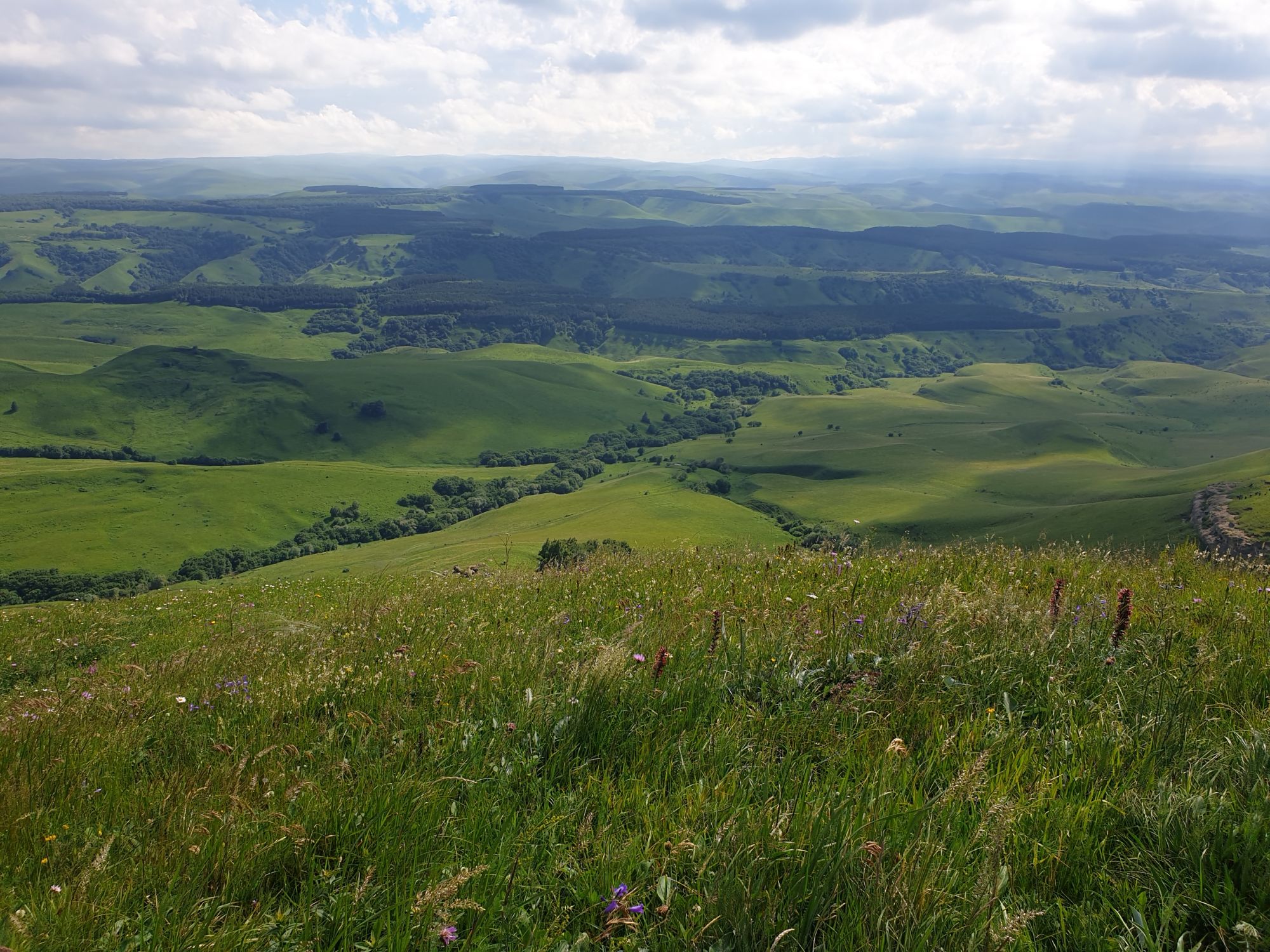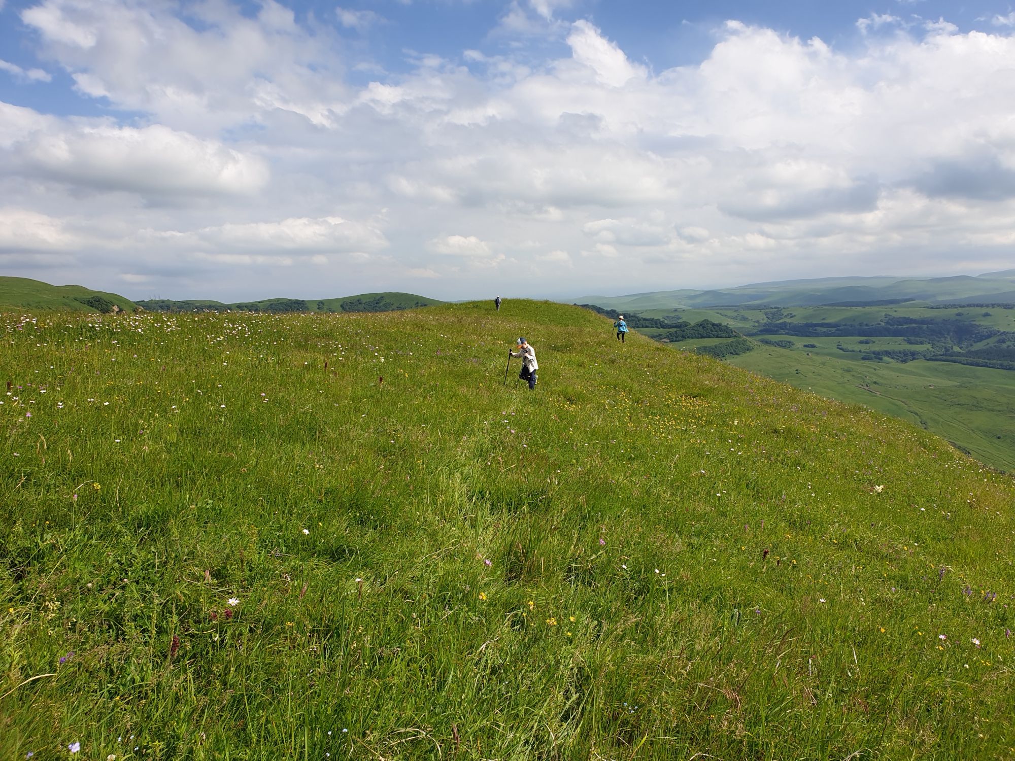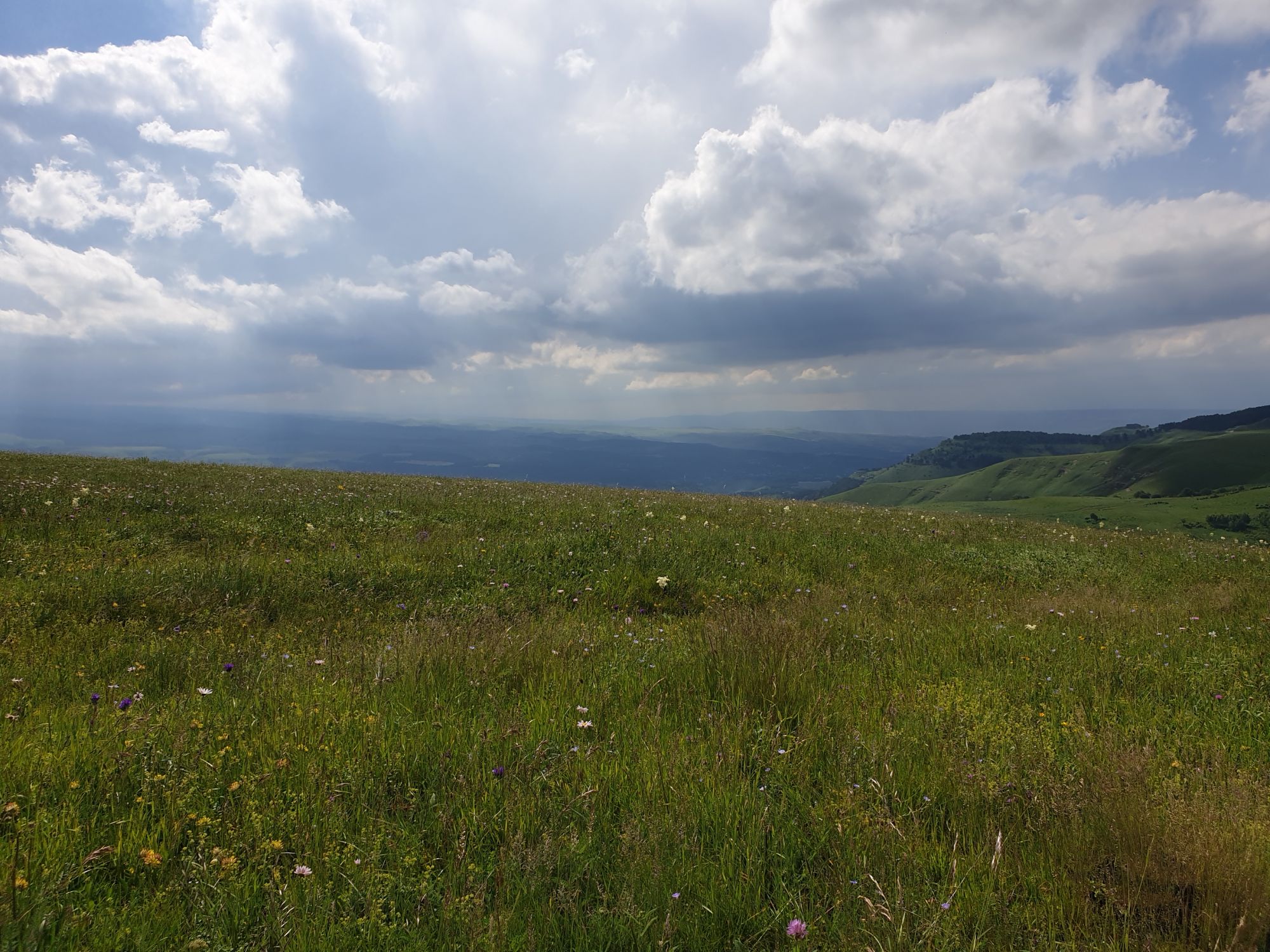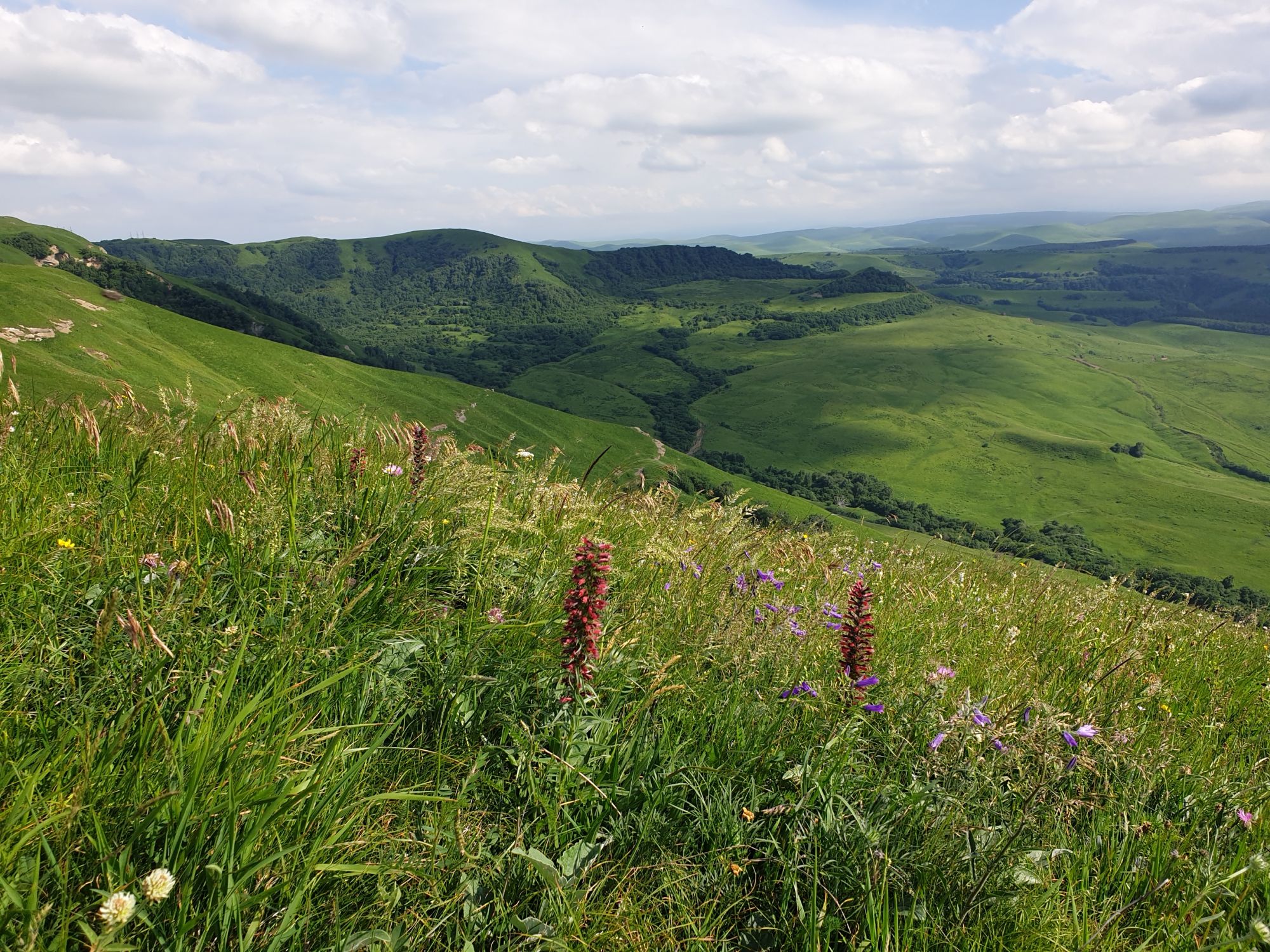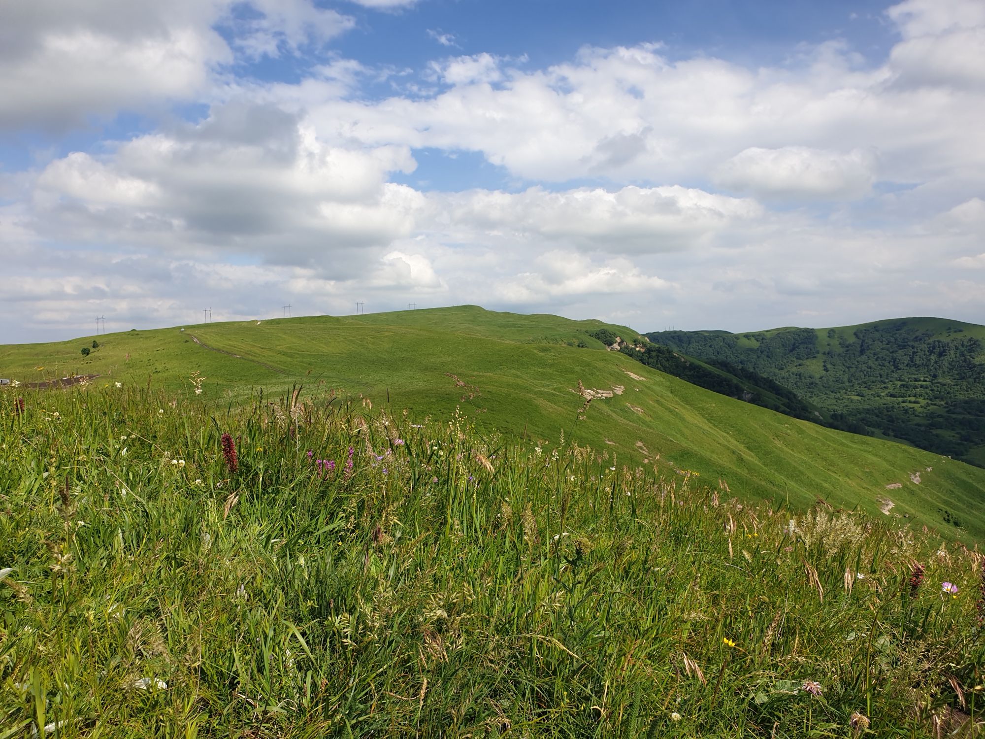 18 июля 2022 Вылазка вторая. Прогулка к Малому Джиналу. Это уже из Кисловодского парка. Гора повыше Малого седла и чуточку пониже Большого (1379м над уровнем моря, если не ошибаюсь). Но подальше от парка и города. Собственно вообще не понятно, к чему она ближе: к Пятигорску, Ессентукам или Кисловодску, но из Кисловодска дорога понятная, не особенно сложная и красивая. Да и мы в Кисловодске))) А еще, по отзывам, оттуда Эльбрус виден едва ли не от самого подножия! Нет, мы не надеялись увидеть Эльбрус, ибо облака, тучи и все тот же прогноз погоды. Но пройти новыми дорогами и немного дальше - почему бы и нет! Тем более это было в тот самый день, когда сорвалась поездка в Джилы-су. Мы поднялись до Малого седла той же дорогой, что и в первый раз. И в это раз подъем дался намного проще: организм таки действительно включился и заработал! Лён изумительно смотрится в горах! А тени от облаков на зеленых склонах сегодня были особенно интересными. Мы на минуточку заглянули на смотровую Малого седла и отправились дальше, мимо того лесочка, где в прошлый раз гуляли и нашли дикую лилию. Я думала, что "до новых мест" почти не буду фотографировать, но как бы не так! Взгляд моментально зацепился за "новые цветочки" : несколько дней назад они еще не цвели, мы тут все травки изучили Яндекс определил как одну из разновидностей дикого клематиса (ломоноса), но я в вопрос не углублялась, точно сказать не могу. А дальше, оставив слева дорогу на Большое седло, мы отправились к новым приключениям. Дорогу было не потерять, она тут одна и подозреваю, что по ней и на внедорожниках ездят, особенно к местам летнего выгона скота, поэтому оставалось только подниматься и спускаться, спускаться и подниматься, преодолевая одну горку за другой. И крутить головой на 360 градусов, конечно. Потому что виды тут невообразимые! В какой-то момент, обернувшись назад, мы увидели лишь макушку Большого седла, на которое с неделю назад забирались. И тот самый лес на соседней с Малым седлом горке. А потом, уже ближе к концу путешествия слева вдалеке открылся вид на пятиглавый Бештау. А слева неизменные зеленые просторы в направление Главного Кавказского хребта. По прямой до него рукой подать, но облака сегодня укрыли горизонт весьма надежно. И они же сделали фотографии особенно живыми и разнообразными) Вокруг цвели луга и это вызывало такой неизъяснимый восторг в душе! Бескрайний густой ковер из цветов, таких трогательных, ярких и нежных одновременно. Я уже старалсь сдерживаться и не снимать каждый цветок (иначе бы никуда не дошли) Но несколько "интересностей" пропустить не могла. Подальше и повыше стали довольно регулярно попадаться орхидеи: А вот этот нежный и миниатюрный красавец удивил. Яндекс определил его как дикий гладиолус! Представляете?! И я склонна ему верить (листья тоже сходятся) . Росточка в этом малыше см 20! Ну и из прочего немного: Преодолев очередной большой подъем мы увидели перед собой завораживающую картину, какую-то бескрайнюю во все стороны. Особенно густая трава и цветы, особенно живописный Бештау как завершение пейзажа с цветущим альпийским лугом, особенно бесконечное и живое море внизу слева и до горизонта... Захотелось остановить момент и погрузиться в него с головой. Запечатлеть его в памяти, в голове, поставить этот вид в рамку на самое видное место в мыслях и благодарить, благодарить,