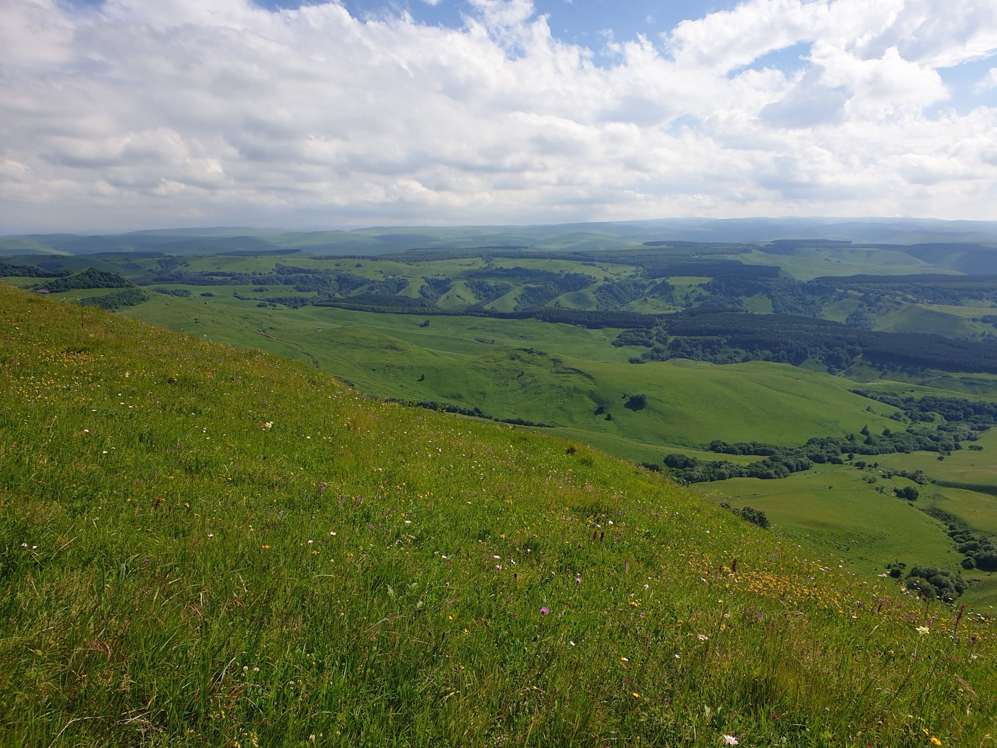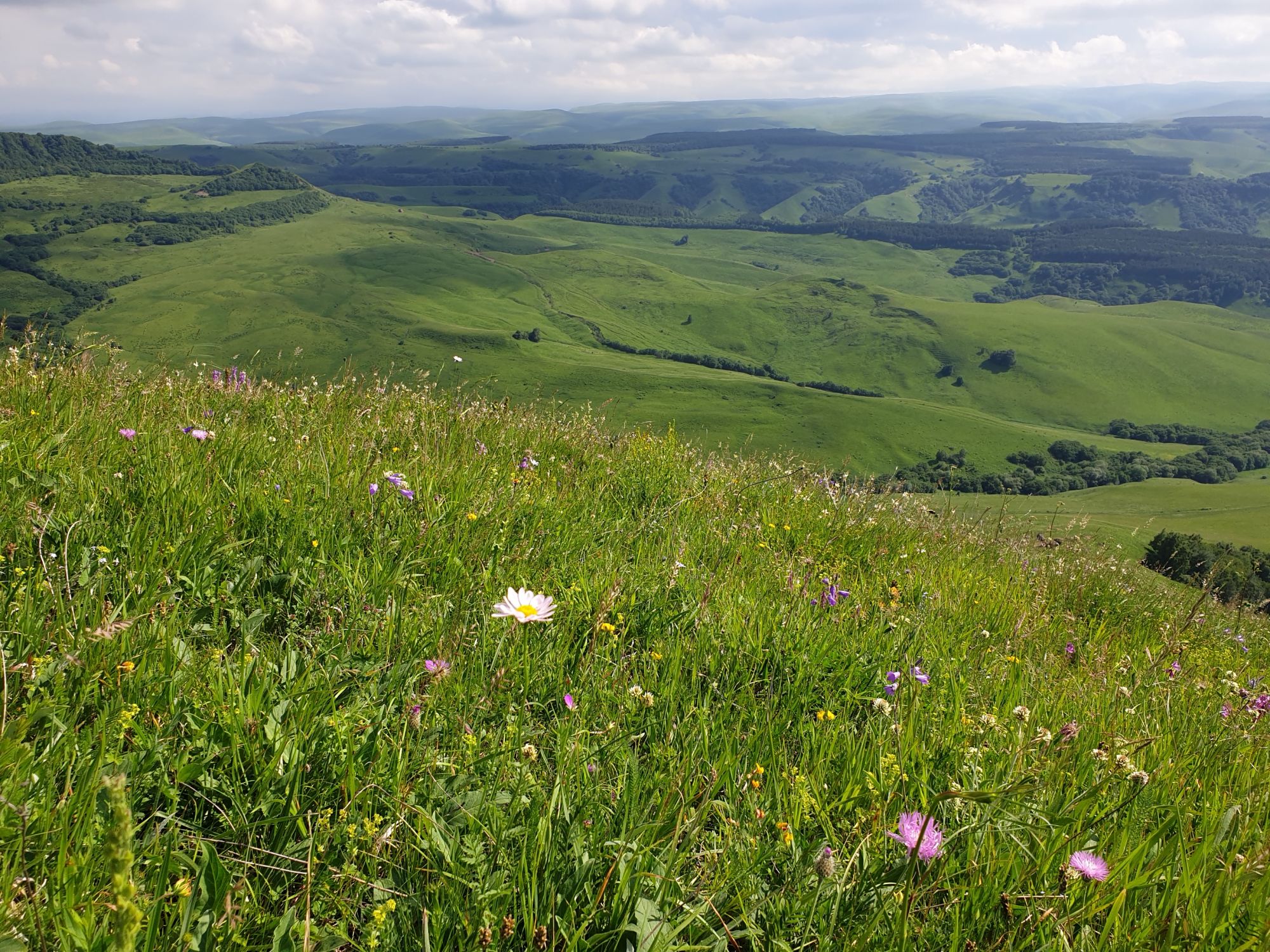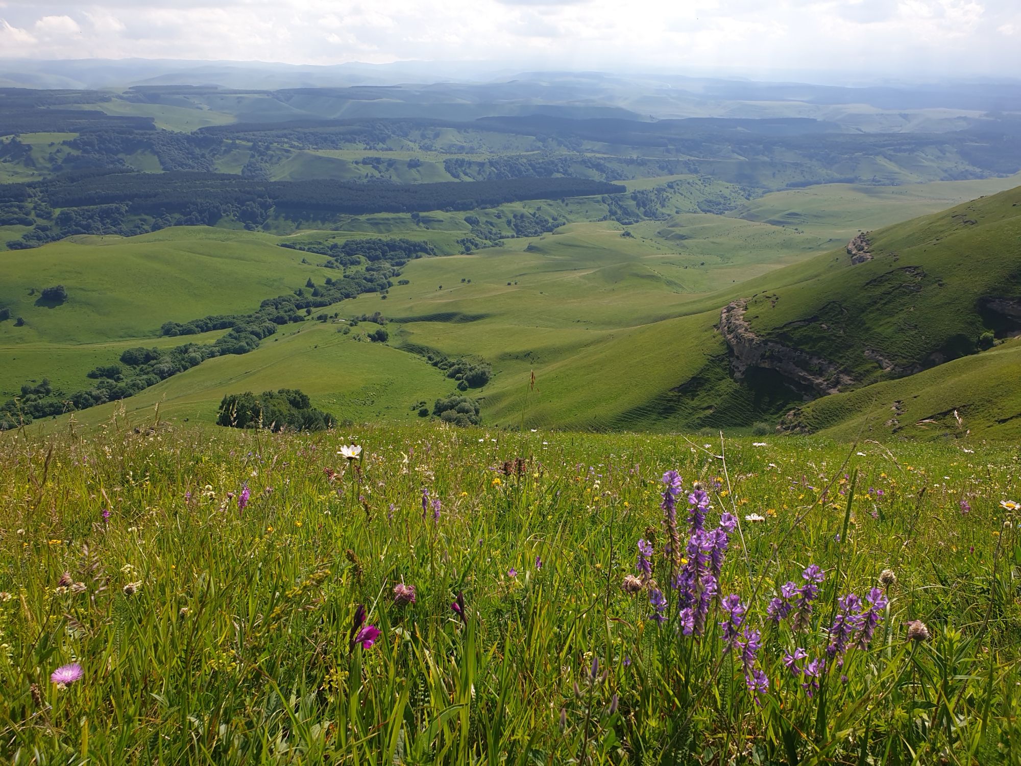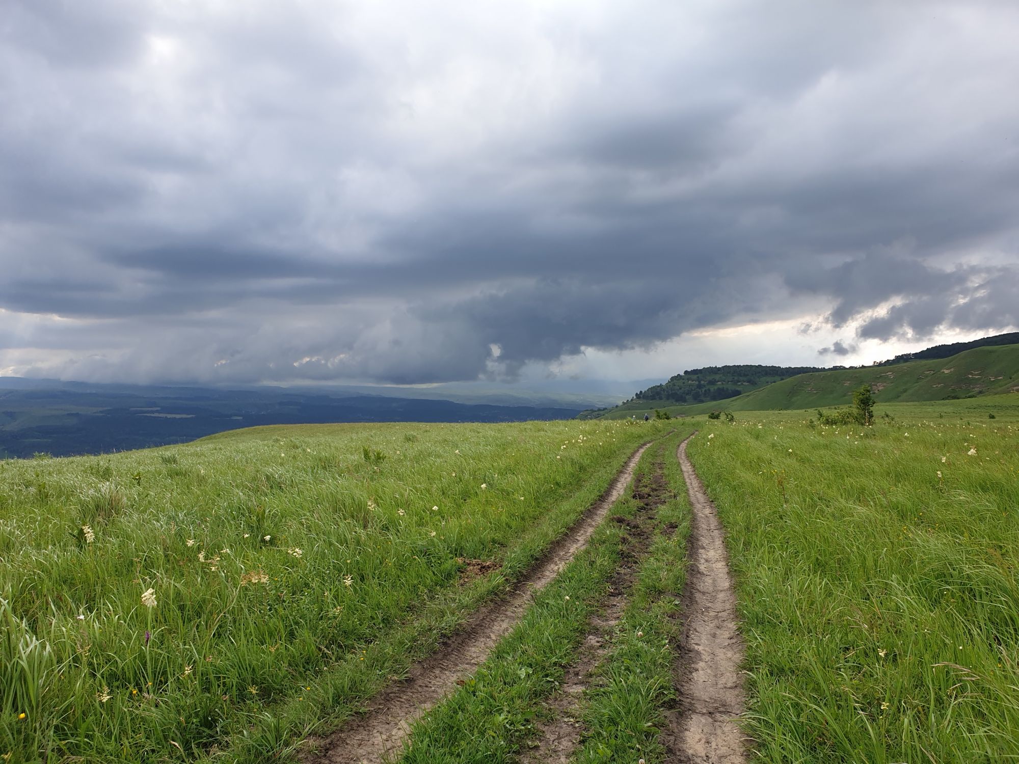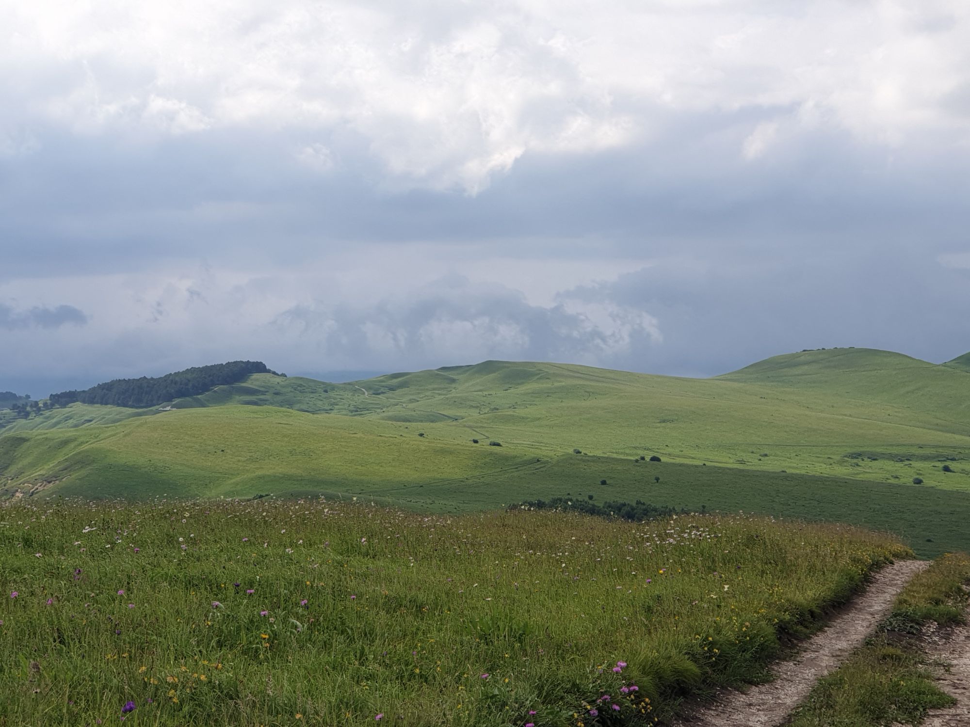 18 июля 2022 Вылазка вторая. Прогулка к Малому Джиналу. Это уже из Кисловодского парка. Гора повыше Малого седла и чуточку пониже Большого (1379м над уровнем моря, если не ошибаюсь). Но подальше от парка и города. Собственно вообще не понятно, к чему она ближе: к Пятигорску, Ессентукам или Кисловодску, но из Кисловодска дорога понятная, не особенно сложная и красивая. Да и мы в Кисловодске))) А еще, по отзывам, оттуда Эльбрус виден едва ли не от самого подножия! Нет, мы не надеялись увидеть Эльбрус, ибо облака, тучи и все тот же прогноз погоды. Но пройти новыми дорогами и немного дальше - почему бы и нет! Тем более это было в тот самый день, когда сорвалась поездка в Джилы-су. Мы поднялись до Малого седла той же дорогой, что и в первый раз. И в это раз подъем дался намного проще: организм таки действительно включился и заработал! Лён изумительно смотрится в горах! А тени от облаков на зеленых склонах сегодня были особенно интересными. Мы на минуточку заглянули на смотровую Малого седла и отправились дальше, мимо того лесочка, где в прошлый раз гуляли и нашли дикую лилию. Я думала, что "до новых мест" почти не буду фотографировать, но как бы не так! Взгляд моментально зацепился за "новые цветочки" : несколько дней назад они еще не цвели, мы тут все травки изучили Яндекс определил как одну из разновидностей дикого клематиса (ломоноса), но я в вопрос не углублялась, точно сказать не могу. А дальше, оставив слева дорогу на Большое седло, мы отправились к новым приключениям. Дорогу было не потерять, она тут одна и подозреваю, что по ней и на внедорожниках ездят, особенно к местам летнего выгона скота, поэтому оставалось только подниматься и спускаться, спускаться и подниматься, преодолевая одну горку за другой. И крутить головой на 360 градусов, конечно. Потому что виды тут невообразимые! В какой-то момент, обернувшись назад, мы увидели лишь макушку Большого седла, на которое с неделю назад забирались. И тот самый лес на соседней с Малым седлом горке. А потом, уже ближе к концу путешествия слева вдалеке открылся вид на пятиглавый Бештау. А слева неизменные зеленые просторы в направление Главного Кавказского хребта. По прямой до него рукой подать, но облака сегодня укрыли горизонт весьма надежно. И они же сделали фотографии особенно живыми и разнообразными) Вокруг цвели луга и это вызывало такой неизъяснимый восторг в душе! Бескрайний густой ковер из цветов, таких трогательных, ярких и нежных одновременно. Я уже старалсь сдерживаться и не снимать каждый цветок (иначе бы никуда не дошли) Но несколько "интересностей" пропустить не могла. Подальше и повыше стали довольно регулярно попадаться орхидеи: А вот этот нежный и миниатюрный красавец удивил. Яндекс определил его как дикий гладиолус! Представляете?! И я склонна ему верить (листья тоже сходятся) . Росточка в этом малыше см 20! Ну и из прочего немного: Преодолев очередной большой подъем мы увидели перед собой завораживающую картину, какую-то бескрайнюю во все стороны. Особенно густая трава и цветы, особенно живописный Бештау как завершение пейзажа с цветущим альпийским лугом, особенно бесконечное и живое море внизу слева и до горизонта... Захотелось остановить момент и погрузиться в него с головой. Запечатлеть его в памяти, в голове, поставить этот вид в рамку на самое видное место в мыслях и благодарить, благодарить,