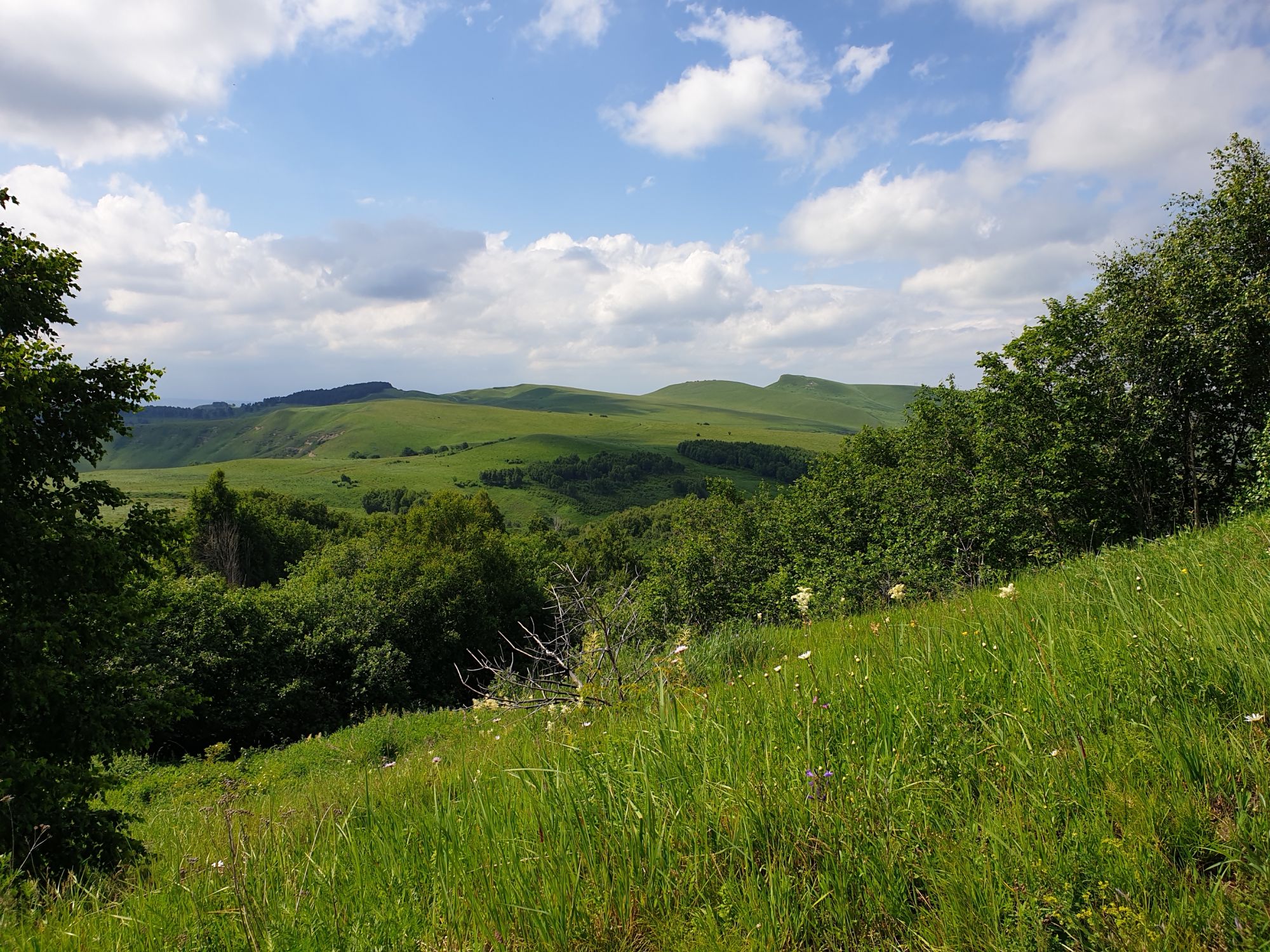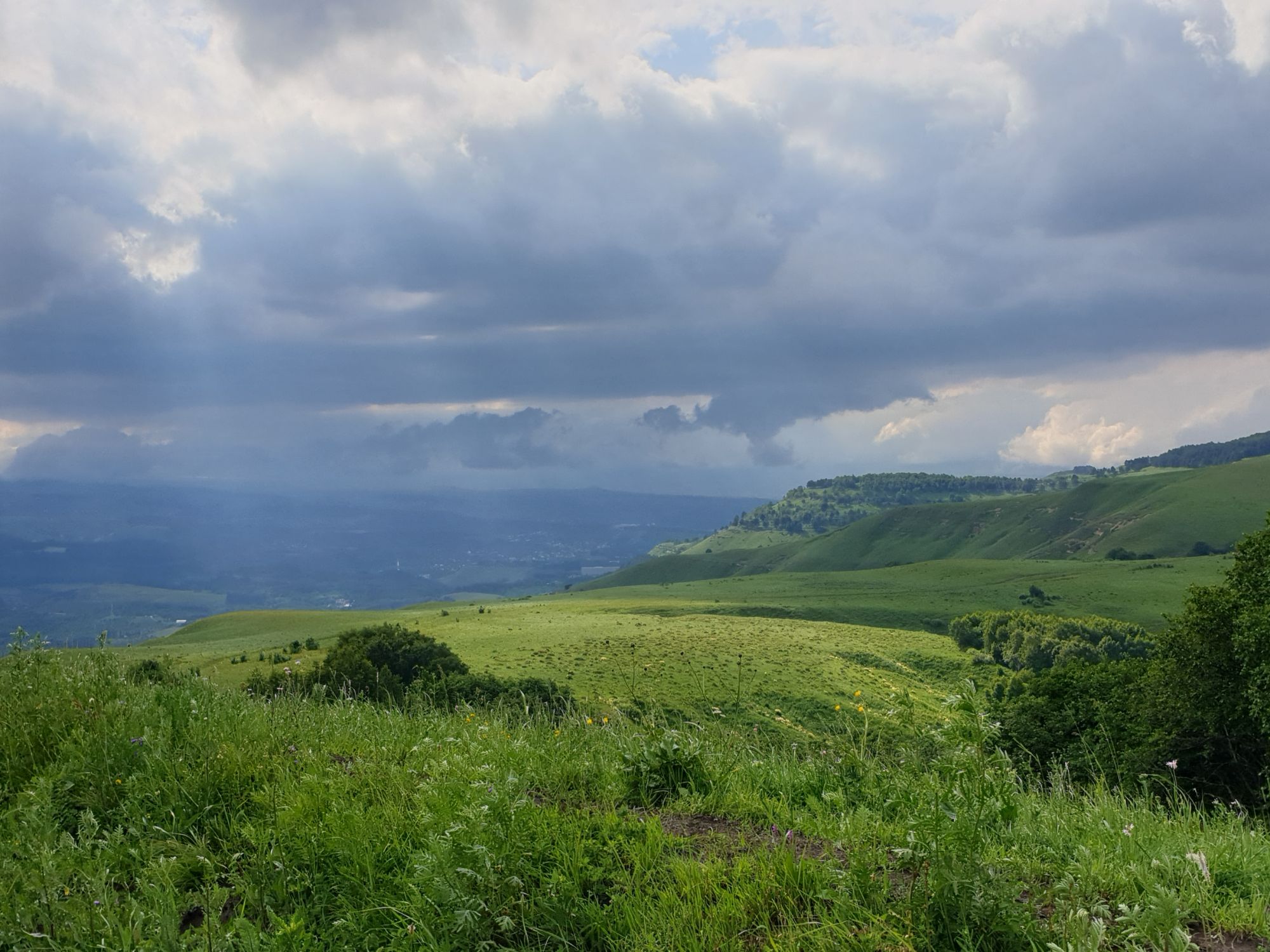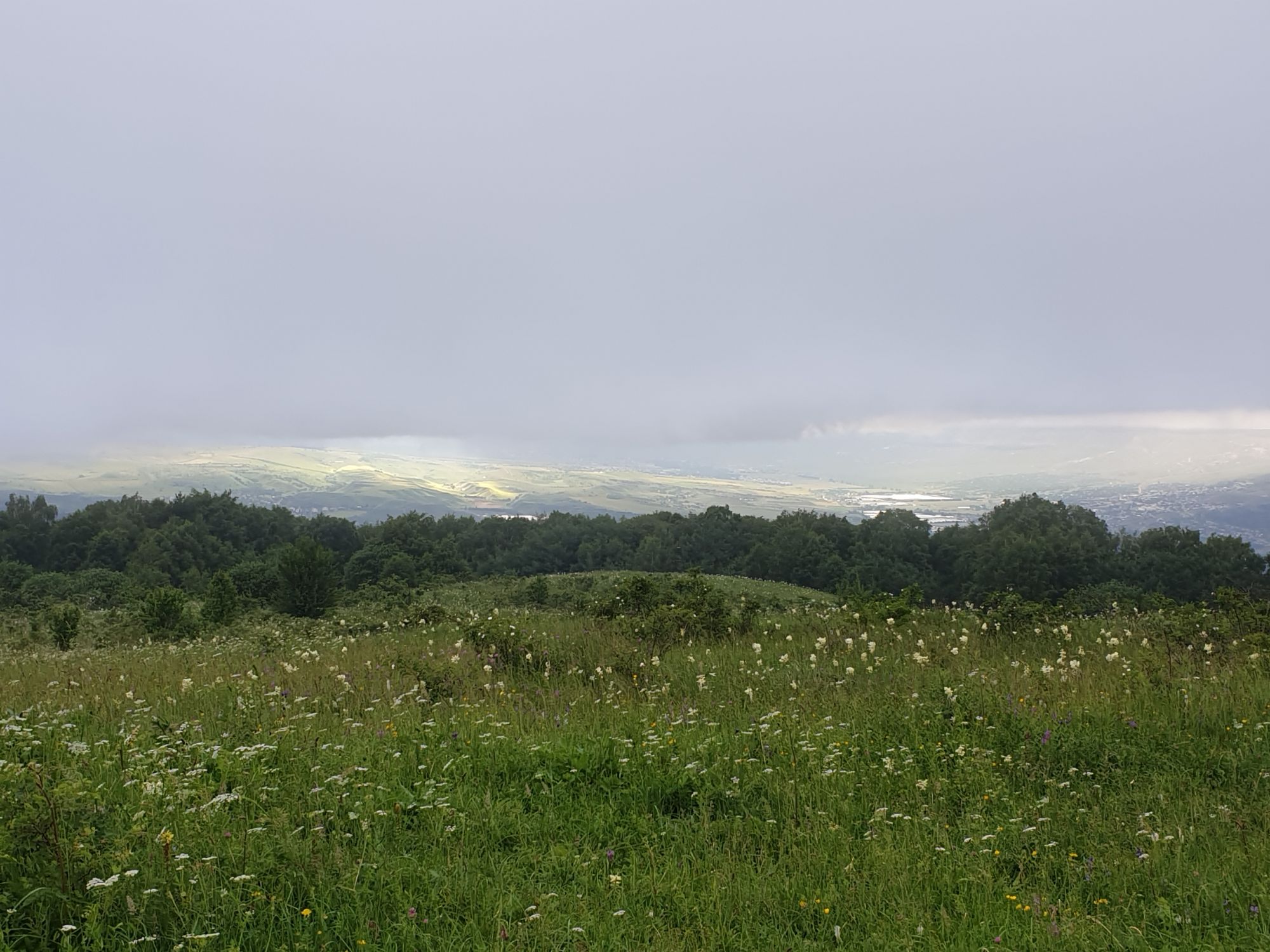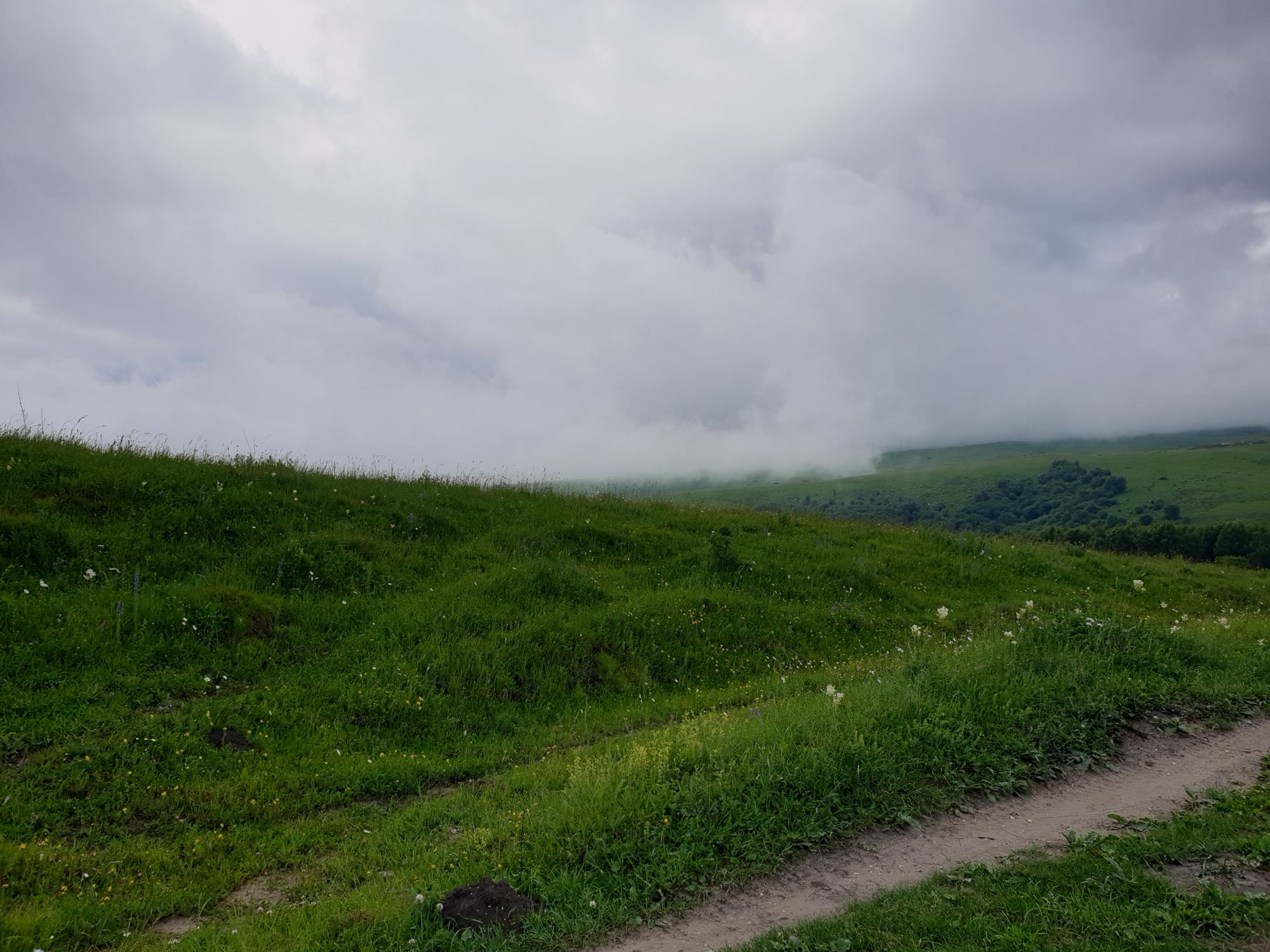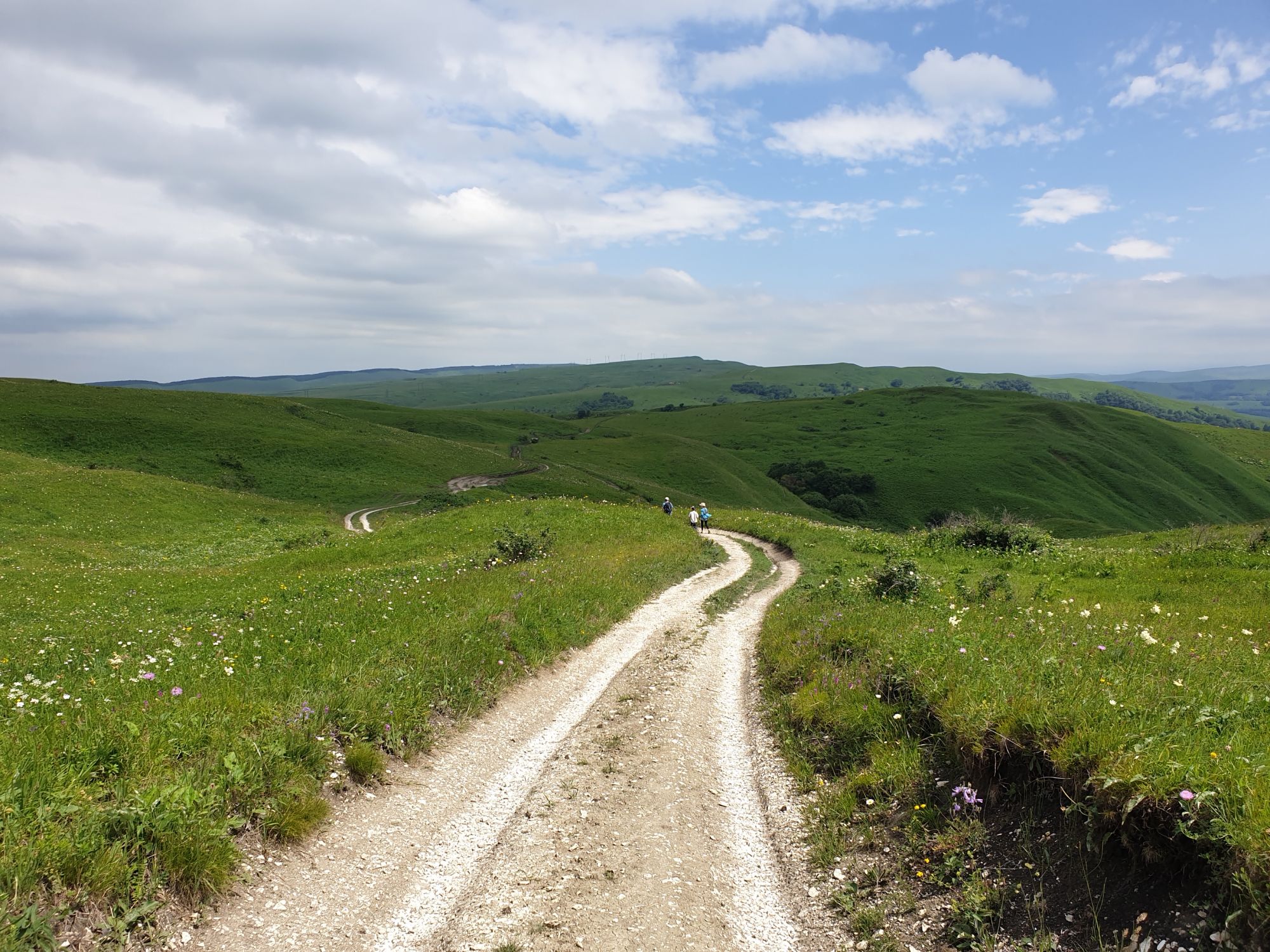 18 июля 2022 Вылазка вторая. Прогулка к Малому Джиналу. Это уже из Кисловодского парка. Гора повыше Малого седла и чуточку пониже Большого (1379м над уровнем моря, если не ошибаюсь). Но подальше от парка и города. Собственно вообще не понятно, к чему она ближе: к Пятигорску, Ессентукам или Кисловодску, но из Кисловодска дорога понятная, не особенно сложная и красивая. Да и мы в Кисловодске))) А еще, по отзывам, оттуда Эльбрус виден едва ли не от самого подножия! Нет, мы не надеялись увидеть Эльбрус, ибо облака, тучи и все тот же прогноз погоды. Но пройти новыми дорогами и немного дальше - почему бы и нет! Тем более это было в тот самый день, когда сорвалась поездка в Джилы-су. Мы поднялись до Малого седла той же дорогой, что и в первый раз. И в это раз подъем дался намного проще: организм таки действительно включился и заработал! Лён изумительно смотрится в горах! А тени от облаков на зеленых склонах сегодня были особенно интересными. Мы на минуточку заглянули на смотровую Малого седла и отправились дальше, мимо того лесочка, где в прошлый раз гуляли и нашли дикую лилию. Я думала, что "до новых мест" почти не буду фотографировать, но как бы не так! Взгляд моментально зацепился за "новые цветочки" : несколько дней назад они еще не цвели, мы тут все травки изучили Яндекс определил как одну из разновидностей дикого клематиса (ломоноса), но я в вопрос не углублялась, точно сказать не могу. А дальше, оставив слева дорогу на Большое седло, мы отправились к новым приключениям. Дорогу было не потерять, она тут одна и подозреваю, что по ней и на внедорожниках ездят, особенно к местам летнего выгона скота, поэтому оставалось только подниматься и спускаться, спускаться и подниматься, преодолевая одну горку за другой. И крутить головой на 360 градусов, конечно. Потому что виды тут невообразимые! В какой-то момент, обернувшись назад, мы увидели лишь макушку Большого седла, на которое с неделю назад забирались. И тот самый лес на соседней с Малым седлом горке. А потом, уже ближе к концу путешествия слева вдалеке открылся вид на пятиглавый Бештау. А слева неизменные зеленые просторы в направление Главного Кавказского хребта. По прямой до него рукой подать, но облака сегодня укрыли горизонт весьма надежно. И они же сделали фотографии особенно живыми и разнообразными) Вокруг цвели луга и это вызывало такой неизъяснимый восторг в душе! Бескрайний густой ковер из цветов, таких трогательных, ярких и нежных одновременно. Я уже старалсь сдерживаться и не снимать каждый цветок (иначе бы никуда не дошли) Но несколько "интересностей" пропустить не могла. Подальше и повыше стали довольно регулярно попадаться орхидеи: А вот этот нежный и миниатюрный красавец удивил. Яндекс определил его как дикий гладиолус! Представляете?! И я склонна ему верить (листья тоже сходятся) . Росточка в этом малыше см 20! Ну и из прочего немного: Преодолев очередной большой подъем мы увидели перед собой завораживающую картину, какую-то бескрайнюю во все стороны. Особенно густая трава и цветы, особенно живописный Бештау как завершение пейзажа с цветущим альпийским лугом, особенно бесконечное и живое море внизу слева и до горизонта... Захотелось остановить момент и погрузиться в него с головой. Запечатлеть его в памяти, в голове, поставить этот вид в рамку на самое видное место в мыслях и благодарить, благодарить,