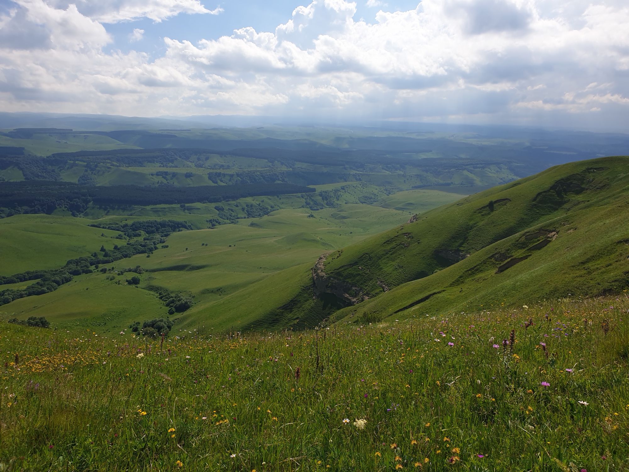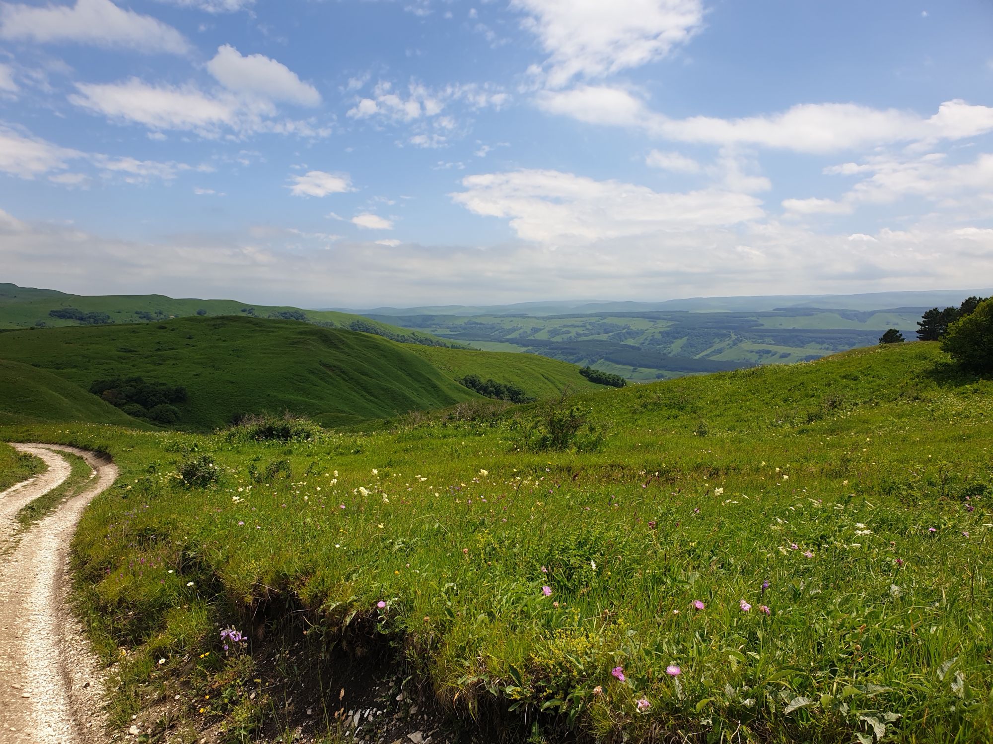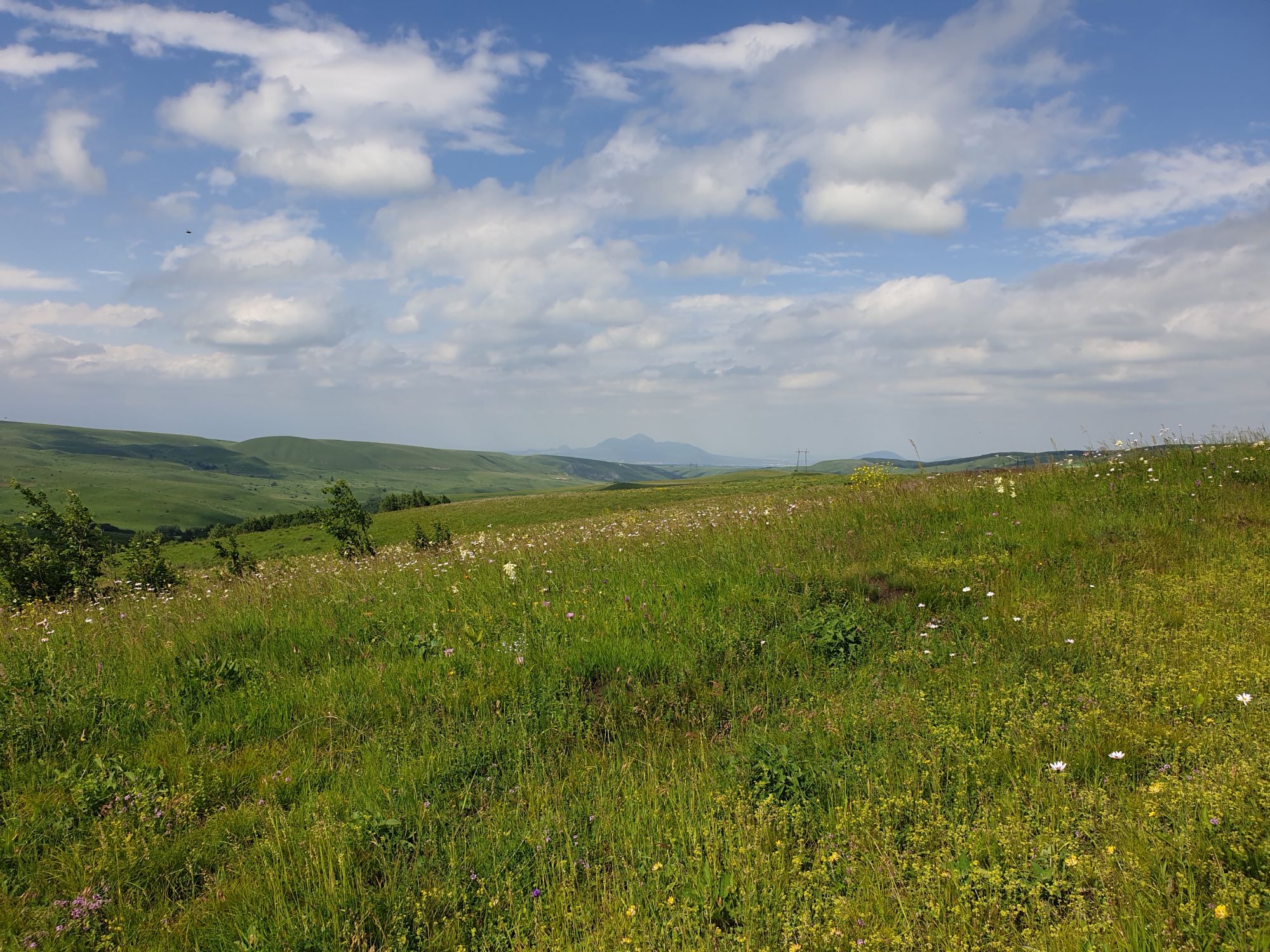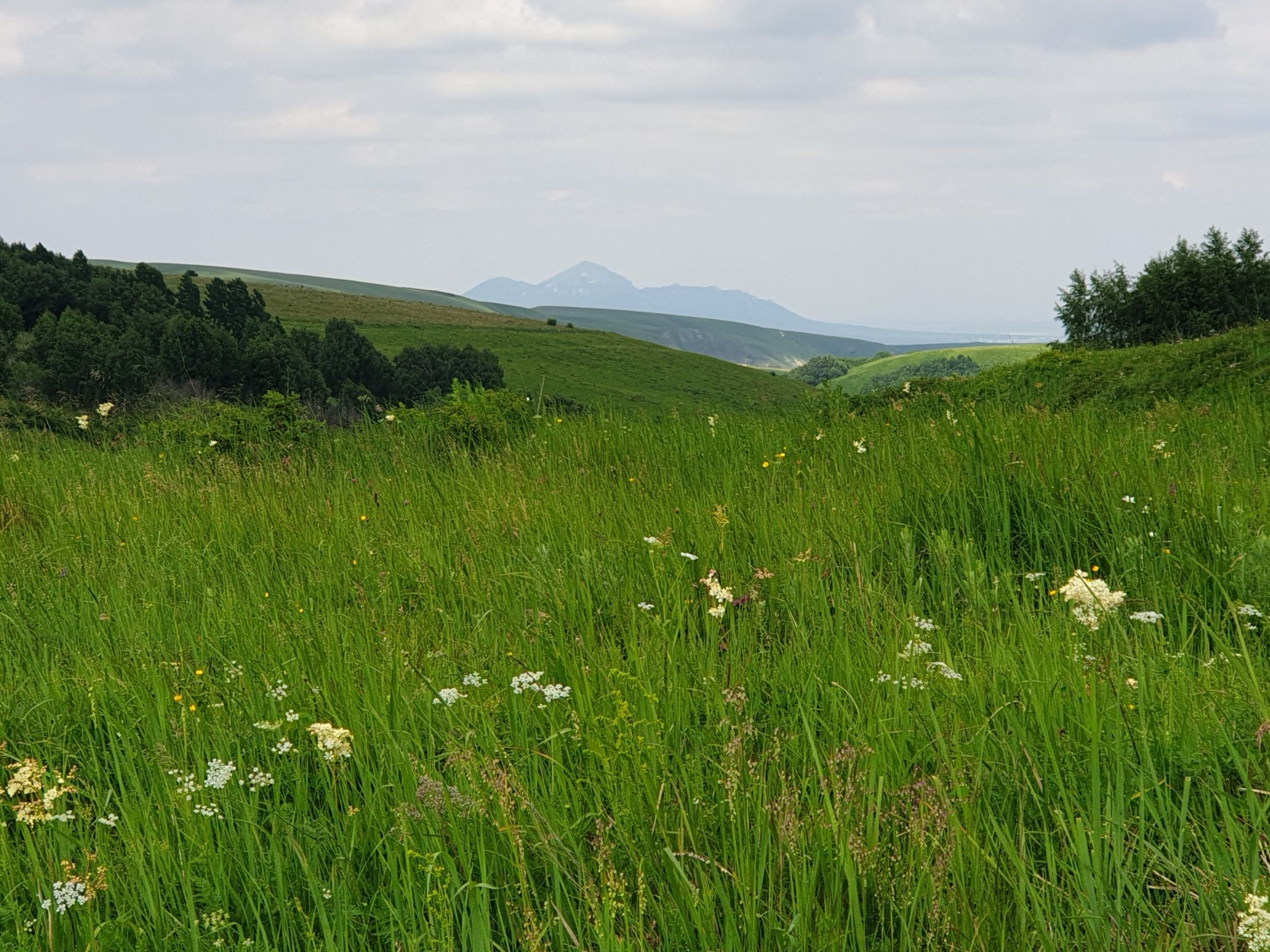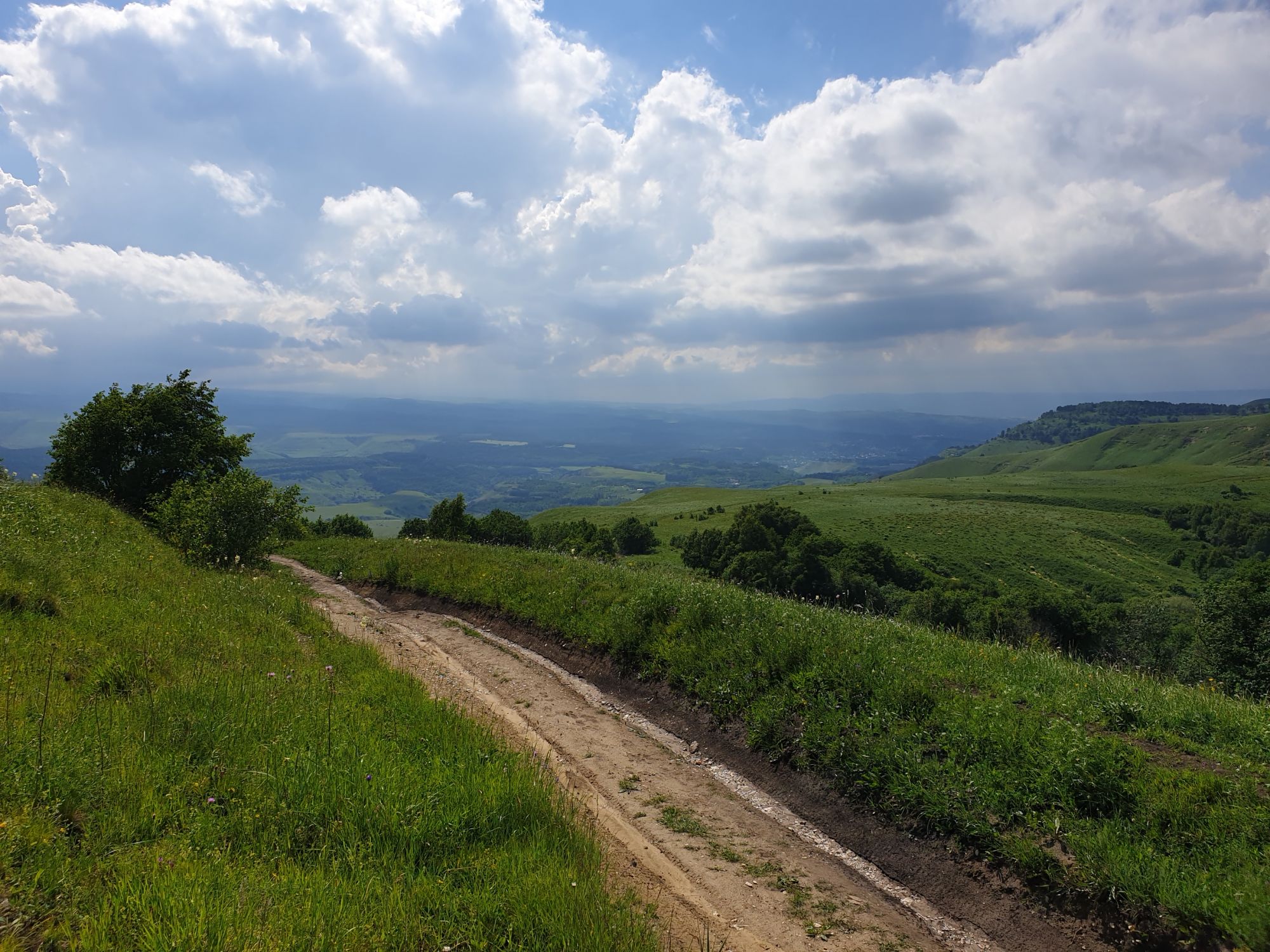 18 июля 2022 Вылазка вторая. Прогулка к Малому Джиналу. Это уже из Кисловодского парка. Гора повыше Малого седла и чуточку пониже Большого (1379м над уровнем моря, если не ошибаюсь). Но подальше от парка и города. Собственно вообще не понятно, к чему она ближе: к Пятигорску, Ессентукам или Кисловодску, но из Кисловодска дорога понятная, не особенно сложная и красивая. Да и мы в Кисловодске))) А еще, по отзывам, оттуда Эльбрус виден едва ли не от самого подножия! Нет, мы не надеялись увидеть Эльбрус, ибо облака, тучи и все тот же прогноз погоды. Но пройти новыми дорогами и немного дальше - почему бы и нет! Тем более это было в тот самый день, когда сорвалась поездка в Джилы-су. Мы поднялись до Малого седла той же дорогой, что и в первый раз. И в это раз подъем дался намного проще: организм таки действительно включился и заработал! Лён изумительно смотрится в горах! А тени от облаков на зеленых склонах сегодня были особенно интересными. Мы на минуточку заглянули на смотровую Малого седла и отправились дальше, мимо того лесочка, где в прошлый раз гуляли и нашли дикую лилию. Я думала, что "до новых мест" почти не буду фотографировать, но как бы не так! Взгляд моментально зацепился за "новые цветочки" : несколько дней назад они еще не цвели, мы тут все травки изучили Яндекс определил как одну из разновидностей дикого клематиса (ломоноса), но я в вопрос не углублялась, точно сказать не могу. А дальше, оставив слева дорогу на Большое седло, мы отправились к новым приключениям. Дорогу было не потерять, она тут одна и подозреваю, что по ней и на внедорожниках ездят, особенно к местам летнего выгона скота, поэтому оставалось только подниматься и спускаться, спускаться и подниматься, преодолевая одну горку за другой. И крутить головой на 360 градусов, конечно. Потому что виды тут невообразимые! В какой-то момент, обернувшись назад, мы увидели лишь макушку Большого седла, на которое с неделю назад забирались. И тот самый лес на соседней с Малым седлом горке. А потом, уже ближе к концу путешествия слева вдалеке открылся вид на пятиглавый Бештау. А слева неизменные зеленые просторы в направление Главного Кавказского хребта. По прямой до него рукой подать, но облака сегодня укрыли горизонт весьма надежно. И они же сделали фотографии особенно живыми и разнообразными) Вокруг цвели луга и это вызывало такой неизъяснимый восторг в душе! Бескрайний густой ковер из цветов, таких трогательных, ярких и нежных одновременно. Я уже старалсь сдерживаться и не снимать каждый цветок (иначе бы никуда не дошли) Но несколько "интересностей" пропустить не могла. Подальше и повыше стали довольно регулярно попадаться орхидеи: А вот этот нежный и миниатюрный красавец удивил. Яндекс определил его как дикий гладиолус! Представляете?! И я склонна ему верить (листья тоже сходятся) . Росточка в этом малыше см 20! Ну и из прочего немного: Преодолев очередной большой подъем мы увидели перед собой завораживающую картину, какую-то бескрайнюю во все стороны. Особенно густая трава и цветы, особенно живописный Бештау как завершение пейзажа с цветущим альпийским лугом, особенно бесконечное и живое море внизу слева и до горизонта... Захотелось остановить момент и погрузиться в него с головой. Запечатлеть его в памяти, в голове, поставить этот вид в рамку на самое видное место в мыслях и благодарить, благодарить,