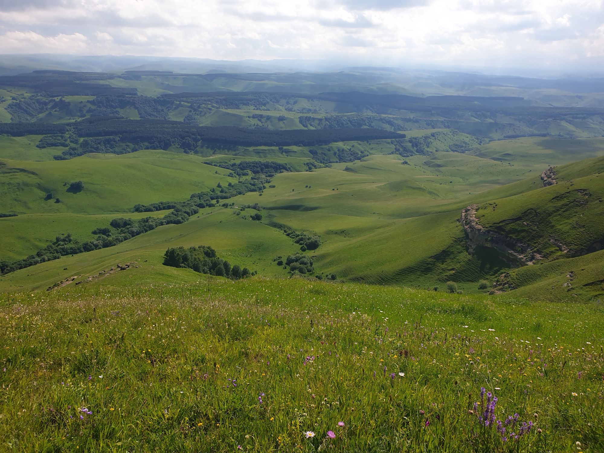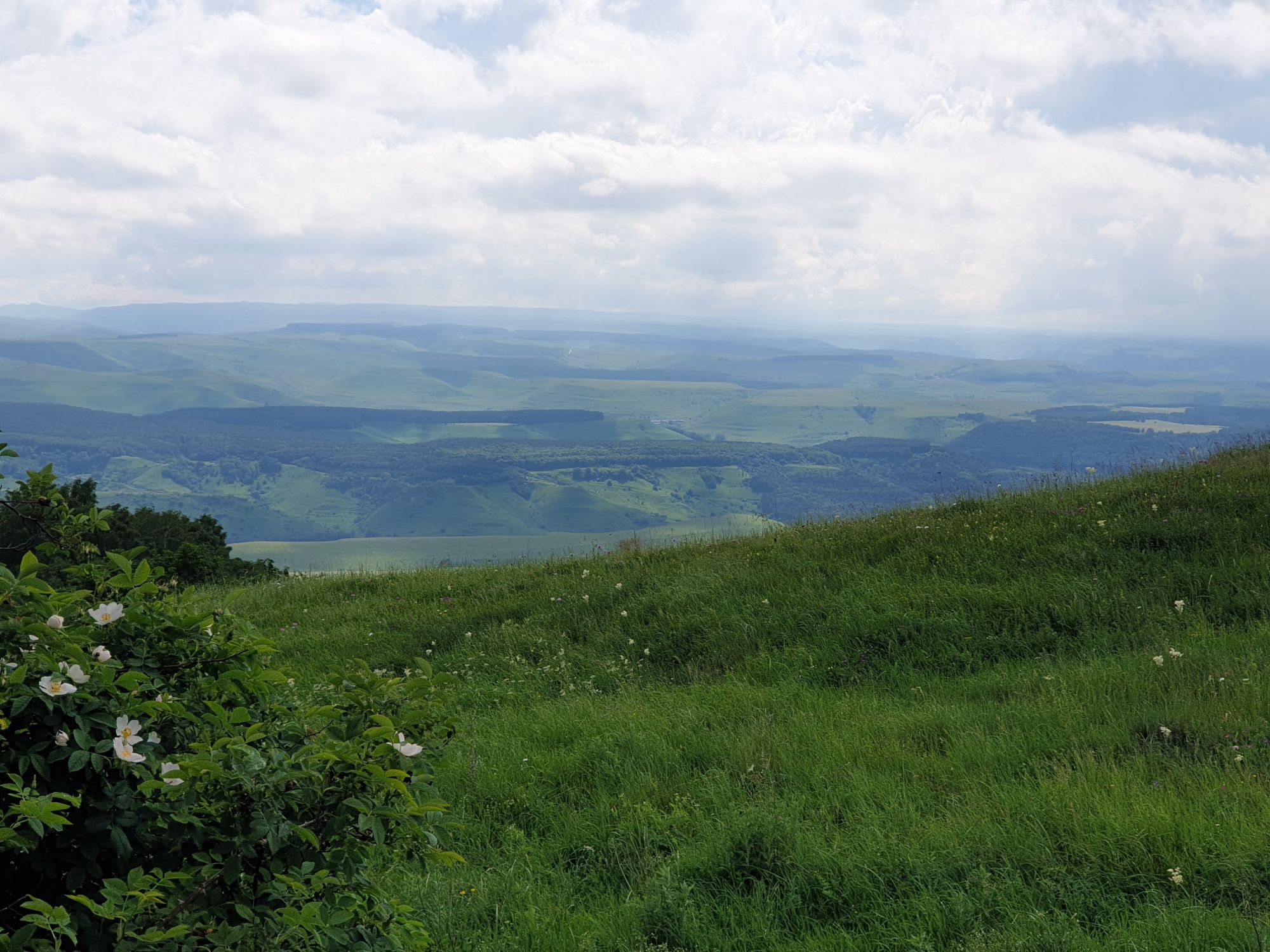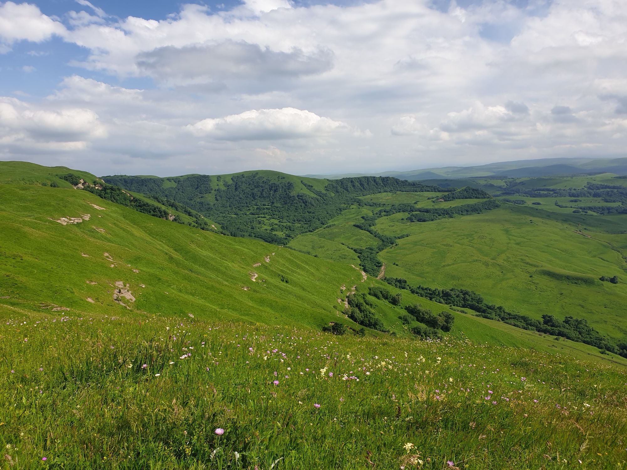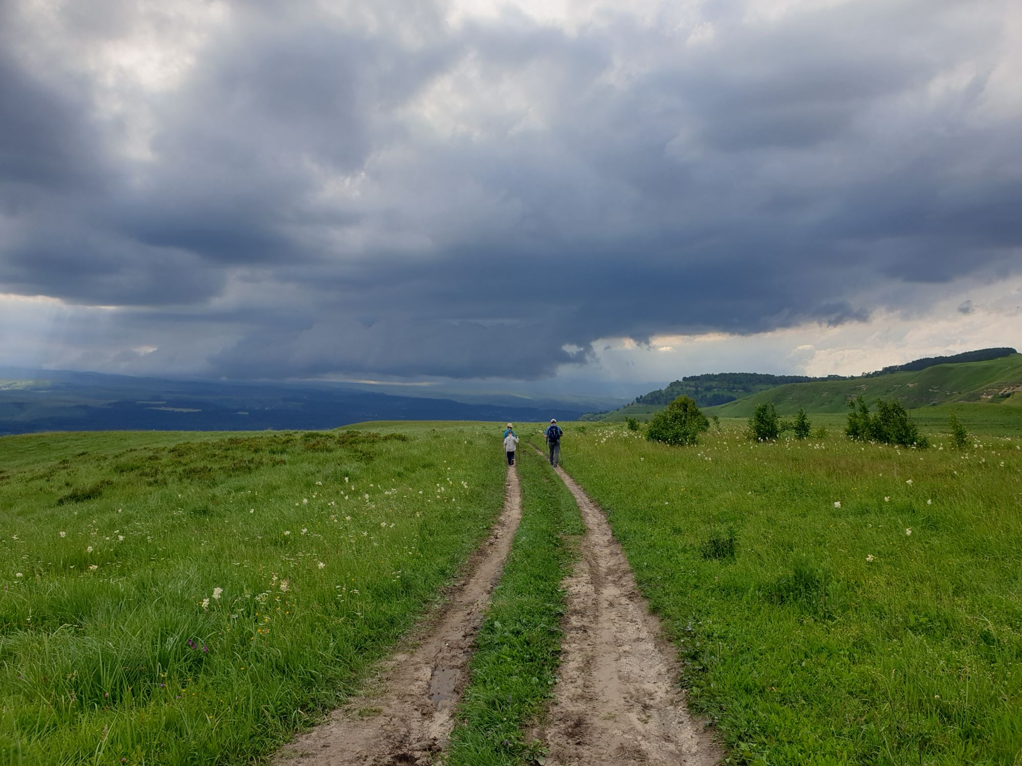 18 июля 2022 Вылазка вторая. Прогулка к Малому Джиналу. Это уже из Кисловодского парка. Гора повыше Малого седла и чуточку пониже Большого (1379м над уровнем моря, если не ошибаюсь). Но подальше от парка и города. Собственно вообще не понятно, к чему она ближе: к Пятигорску, Ессентукам или Кисловодску, но из Кисловодска дорога понятная, не особенно сложная и красивая. Да и мы в Кисловодске))) А еще, по отзывам, оттуда Эльбрус виден едва ли не от самого подножия! Нет, мы не надеялись увидеть Эльбрус, ибо облака, тучи и все тот же прогноз погоды. Но пройти новыми дорогами и немного дальше - почему бы и нет! Тем более это было в тот самый день, когда сорвалась поездка в Джилы-су. Мы поднялись до Малого седла той же дорогой, что и в первый раз. И в это раз подъем дался намного проще: организм таки действительно включился и заработал! Лён изумительно смотрится в горах! А тени от облаков на зеленых склонах сегодня были особенно интересными. Мы на минуточку заглянули на смотровую Малого седла и отправились дальше, мимо того лесочка, где в прошлый раз гуляли и нашли дикую лилию. Я думала, что "до новых мест" почти не буду фотографировать, но как бы не так! Взгляд моментально зацепился за "новые цветочки" : несколько дней назад они еще не цвели, мы тут все травки изучили Яндекс определил как одну из разновидностей дикого клематиса (ломоноса), но я в вопрос не углублялась, точно сказать не могу. А дальше, оставив слева дорогу на Большое седло, мы отправились к новым приключениям. Дорогу было не потерять, она тут одна и подозреваю, что по ней и на внедорожниках ездят, особенно к местам летнего выгона скота, поэтому оставалось только подниматься и спускаться, спускаться и подниматься, преодолевая одну горку за другой. И крутить головой на 360 градусов, конечно. Потому что виды тут невообразимые! В какой-то момент, обернувшись назад, мы увидели лишь макушку Большого седла, на которое с неделю назад забирались. И тот самый лес на соседней с Малым седлом горке. А потом, уже ближе к концу путешествия слева вдалеке открылся вид на пятиглавый Бештау. А слева неизменные зеленые просторы в направление Главного Кавказского хребта. По прямой до него рукой подать, но облака сегодня укрыли горизонт весьма надежно. И они же сделали фотографии особенно живыми и разнообразными) Вокруг цвели луга и это вызывало такой неизъяснимый восторг в душе! Бескрайний густой ковер из цветов, таких трогательных, ярких и нежных одновременно. Я уже старалсь сдерживаться и не снимать каждый цветок (иначе бы никуда не дошли) Но несколько "интересностей" пропустить не могла. Подальше и повыше стали довольно регулярно попадаться орхидеи: А вот этот нежный и миниатюрный красавец удивил. Яндекс определил его как дикий гладиолус! Представляете?! И я склонна ему верить (листья тоже сходятся) . Росточка в этом малыше см 20! Ну и из прочего немного: Преодолев очередной большой подъем мы увидели перед собой завораживающую картину, какую-то бескрайнюю во все стороны. Особенно густая трава и цветы, особенно живописный Бештау как завершение пейзажа с цветущим альпийским лугом, особенно бесконечное и живое море внизу слева и до горизонта... Захотелось остановить момент и погрузиться в него с головой. Запечатлеть его в памяти, в голове, поставить этот вид в рамку на самое видное место в мыслях и благодарить, благодарить,