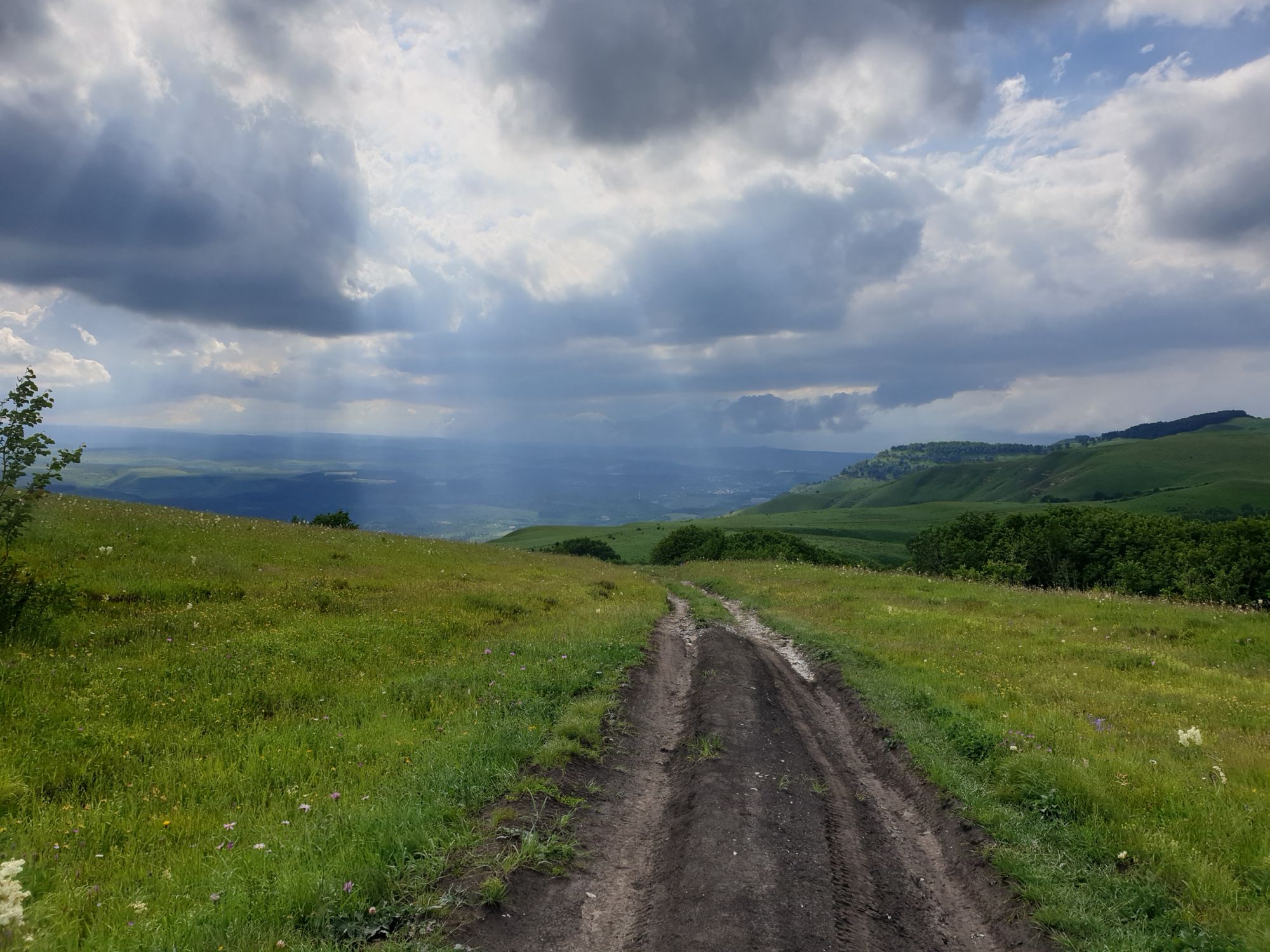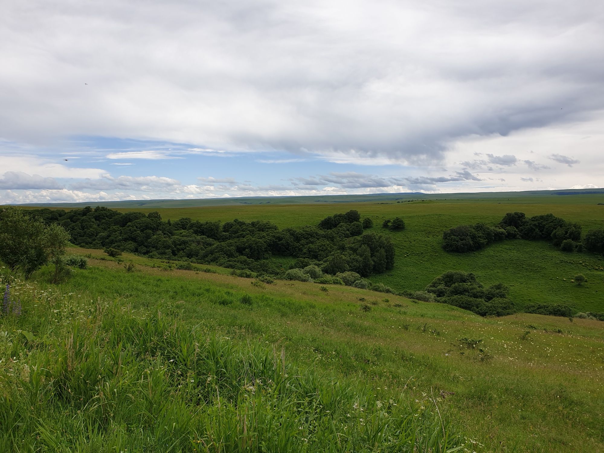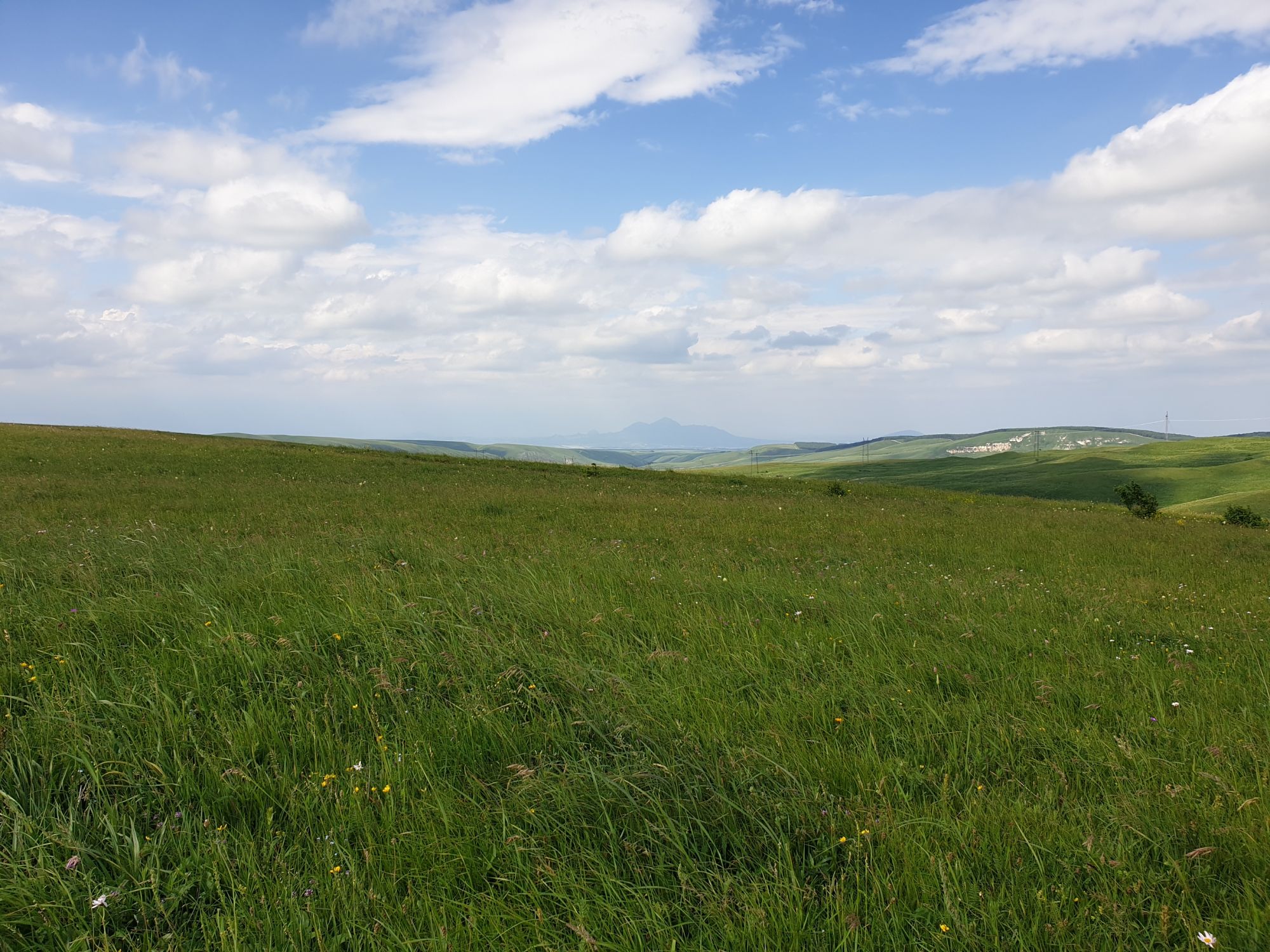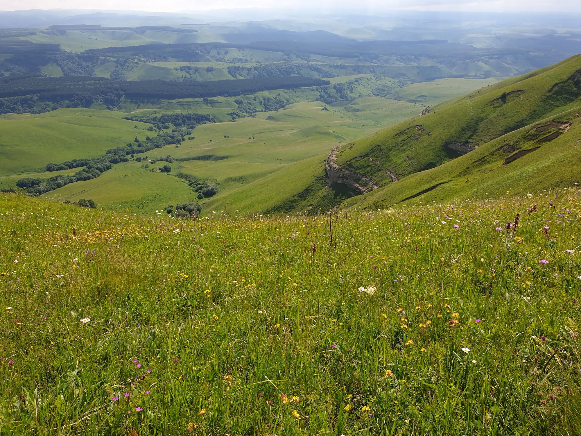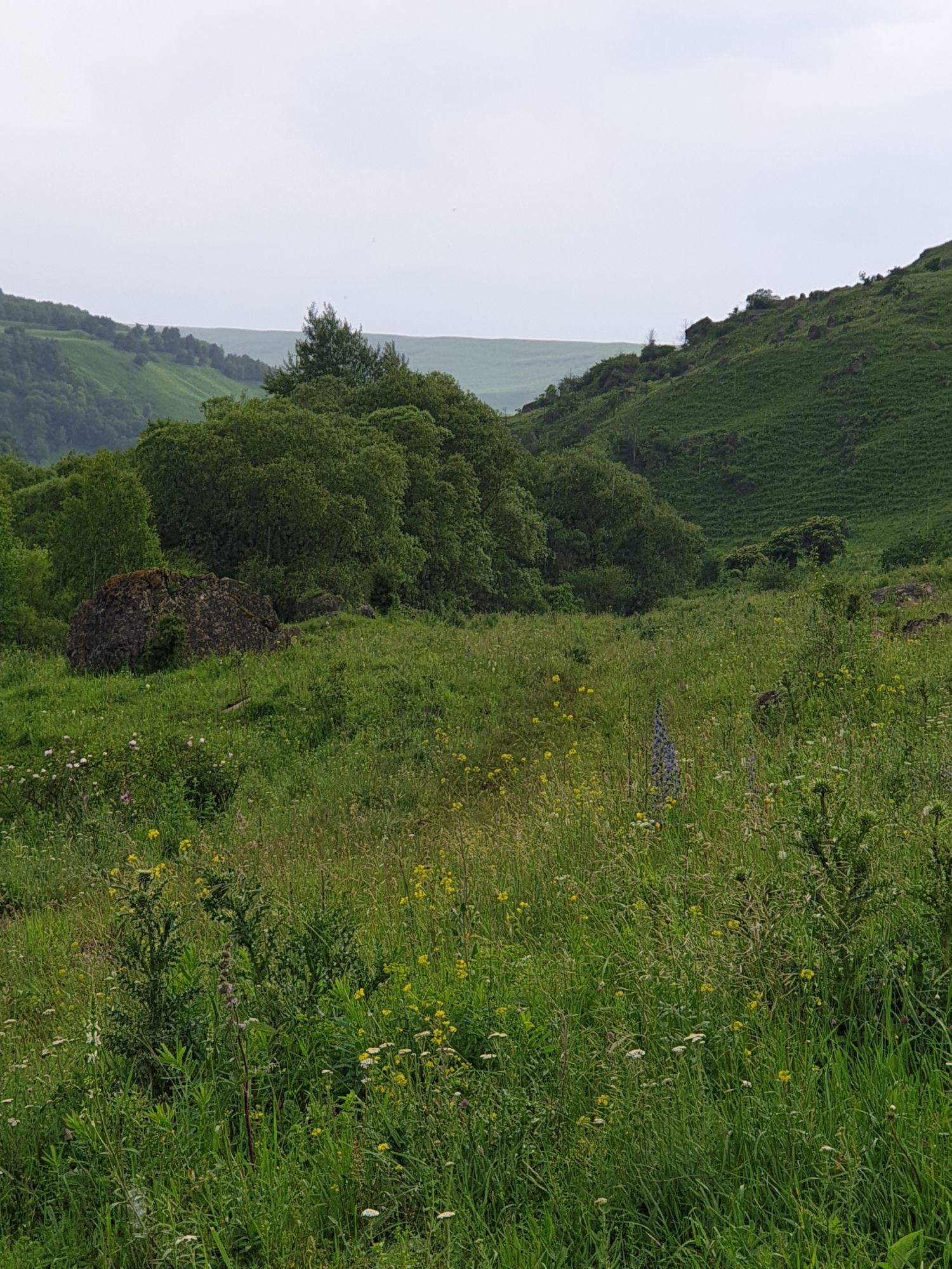 18 июля 2022 Вылазка вторая. Прогулка к Малому Джиналу. Это уже из Кисловодского парка. Гора повыше Малого седла и чуточку пониже Большого (1379м над уровнем моря, если не ошибаюсь). Но подальше от парка и города. Собственно вообще не понятно, к чему она ближе: к Пятигорску, Ессентукам или Кисловодску, но из Кисловодска дорога понятная, не особенно сложная и красивая. Да и мы в Кисловодске))) А еще, по отзывам, оттуда Эльбрус виден едва ли не от самого подножия! Нет, мы не надеялись увидеть Эльбрус, ибо облака, тучи и все тот же прогноз погоды. Но пройти новыми дорогами и немного дальше - почему бы и нет! Тем более это было в тот самый день, когда сорвалась поездка в Джилы-су. Мы поднялись до Малого седла той же дорогой, что и в первый раз. И в это раз подъем дался намного проще: организм таки действительно включился и заработал! Лён изумительно смотрится в горах! А тени от облаков на зеленых склонах сегодня были особенно интересными. Мы на минуточку заглянули на смотровую Малого седла и отправились дальше, мимо того лесочка, где в прошлый раз гуляли и нашли дикую лилию. Я думала, что "до новых мест" почти не буду фотографировать, но как бы не так! Взгляд моментально зацепился за "новые цветочки" : несколько дней назад они еще не цвели, мы тут все травки изучили Яндекс определил как одну из разновидностей дикого клематиса (ломоноса), но я в вопрос не углублялась, точно сказать не могу. А дальше, оставив слева дорогу на Большое седло, мы отправились к новым приключениям. Дорогу было не потерять, она тут одна и подозреваю, что по ней и на внедорожниках ездят, особенно к местам летнего выгона скота, поэтому оставалось только подниматься и спускаться, спускаться и подниматься, преодолевая одну горку за другой. И крутить головой на 360 градусов, конечно. Потому что виды тут невообразимые! В какой-то момент, обернувшись назад, мы увидели лишь макушку Большого седла, на которое с неделю назад забирались. И тот самый лес на соседней с Малым седлом горке. А потом, уже ближе к концу путешествия слева вдалеке открылся вид на пятиглавый Бештау. А слева неизменные зеленые просторы в направление Главного Кавказского хребта. По прямой до него рукой подать, но облака сегодня укрыли горизонт весьма надежно. И они же сделали фотографии особенно живыми и разнообразными) Вокруг цвели луга и это вызывало такой неизъяснимый восторг в душе! Бескрайний густой ковер из цветов, таких трогательных, ярких и нежных одновременно. Я уже старалсь сдерживаться и не снимать каждый цветок (иначе бы никуда не дошли) Но несколько "интересностей" пропустить не могла. Подальше и повыше стали довольно регулярно попадаться орхидеи: А вот этот нежный и миниатюрный красавец удивил. Яндекс определил его как дикий гладиолус! Представляете?! И я склонна ему верить (листья тоже сходятся) . Росточка в этом малыше см 20! Ну и из прочего немного: Преодолев очередной большой подъем мы увидели перед собой завораживающую картину, какую-то бескрайнюю во все стороны. Особенно густая трава и цветы, особенно живописный Бештау как завершение пейзажа с цветущим альпийским лугом, особенно бесконечное и живое море внизу слева и до горизонта... Захотелось остановить момент и погрузиться в него с головой. Запечатлеть его в памяти, в голове, поставить этот вид в рамку на самое видное место в мыслях и благодарить, благодарить,