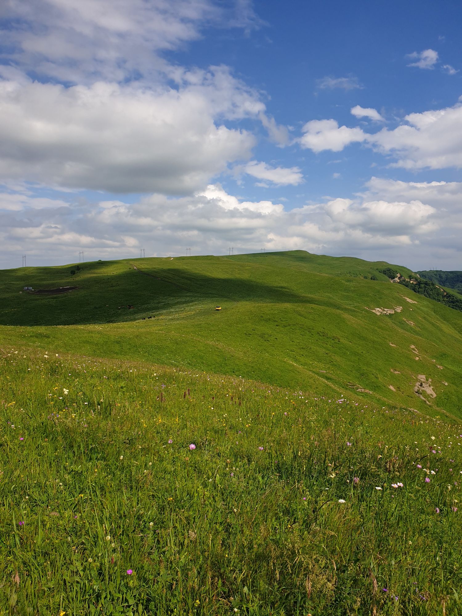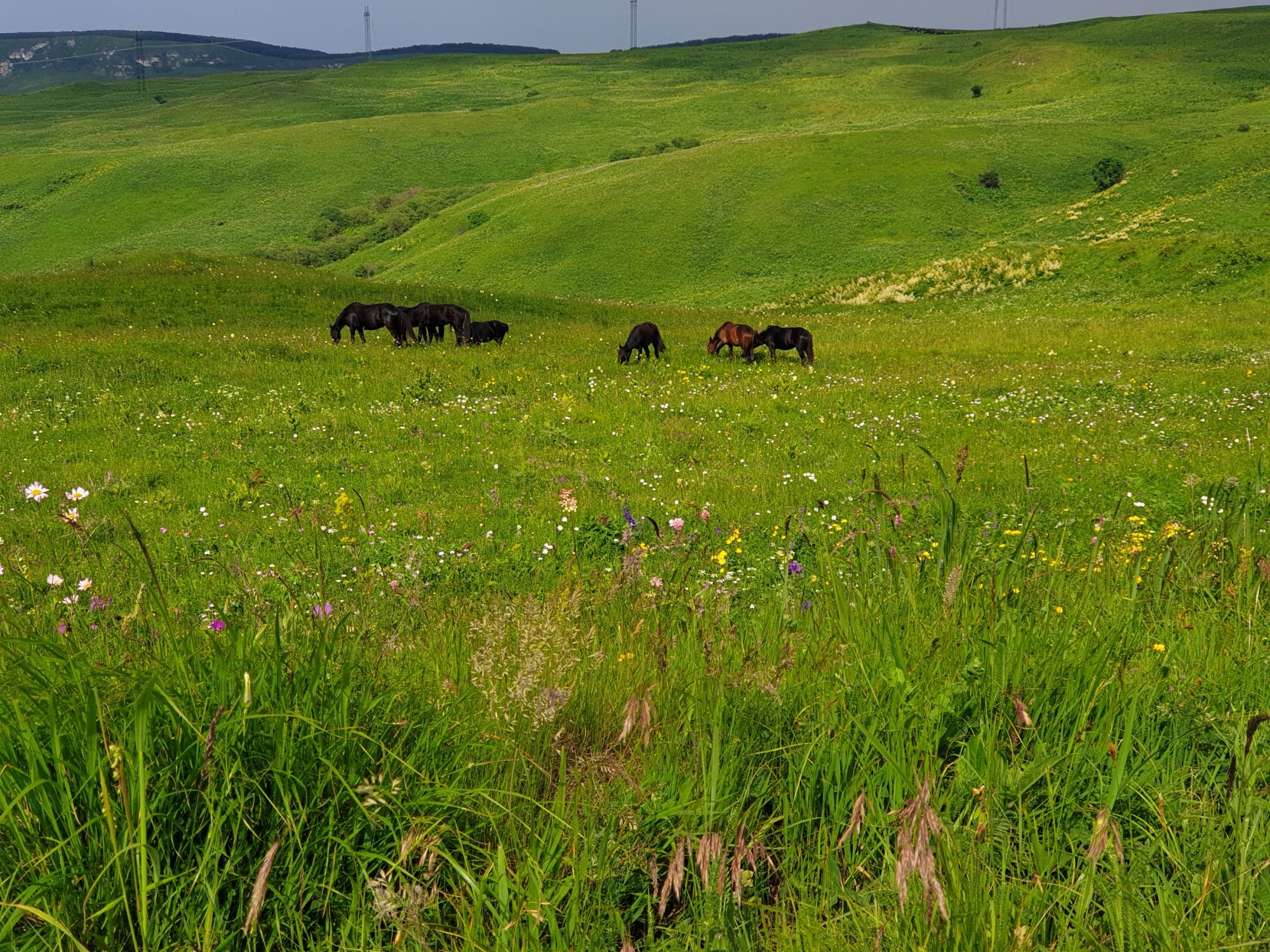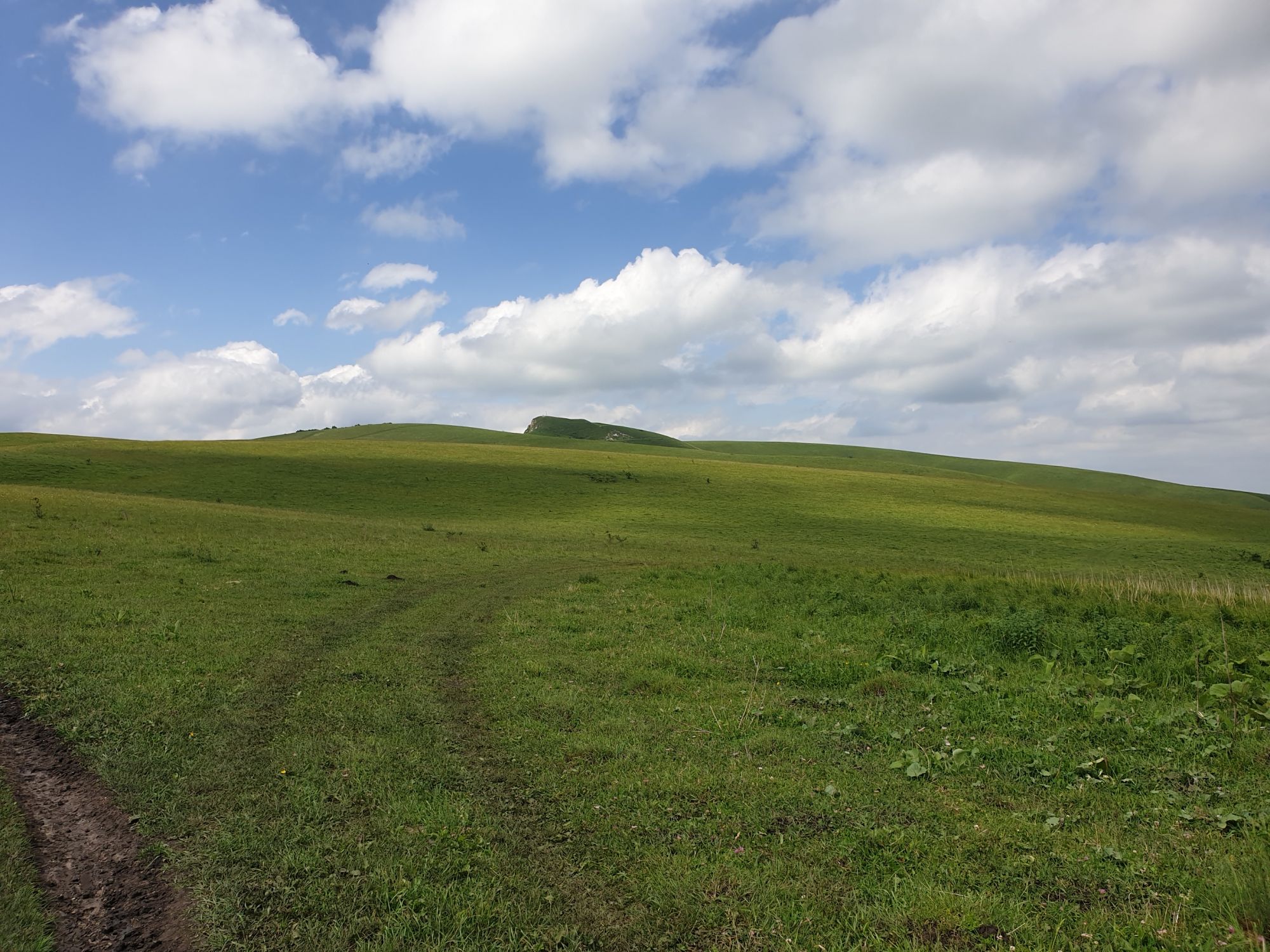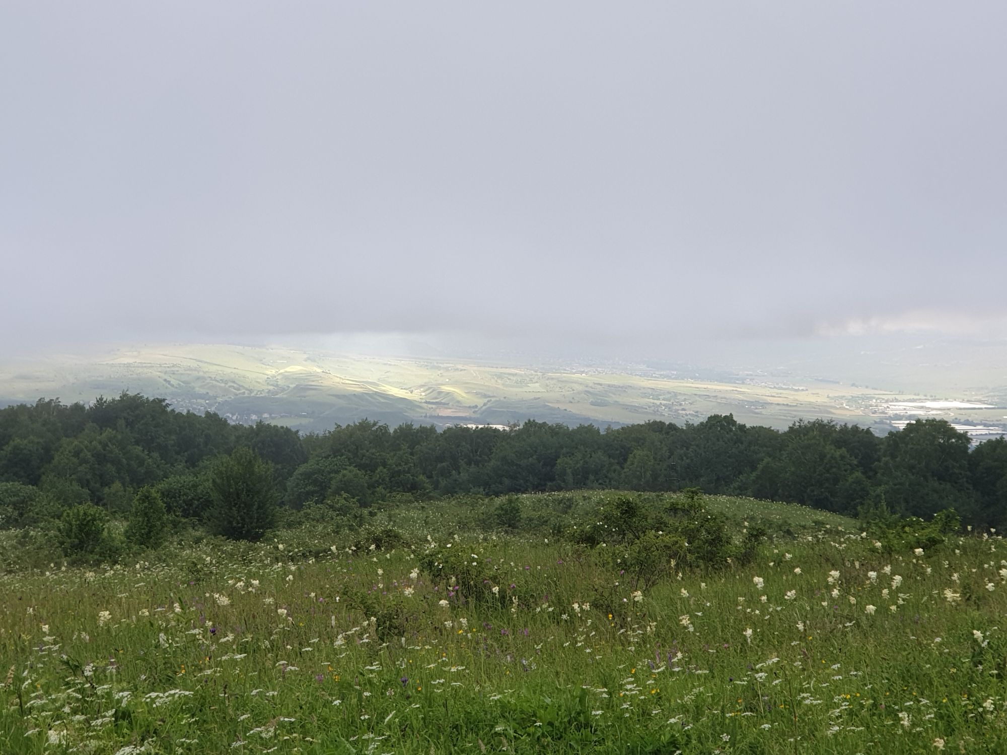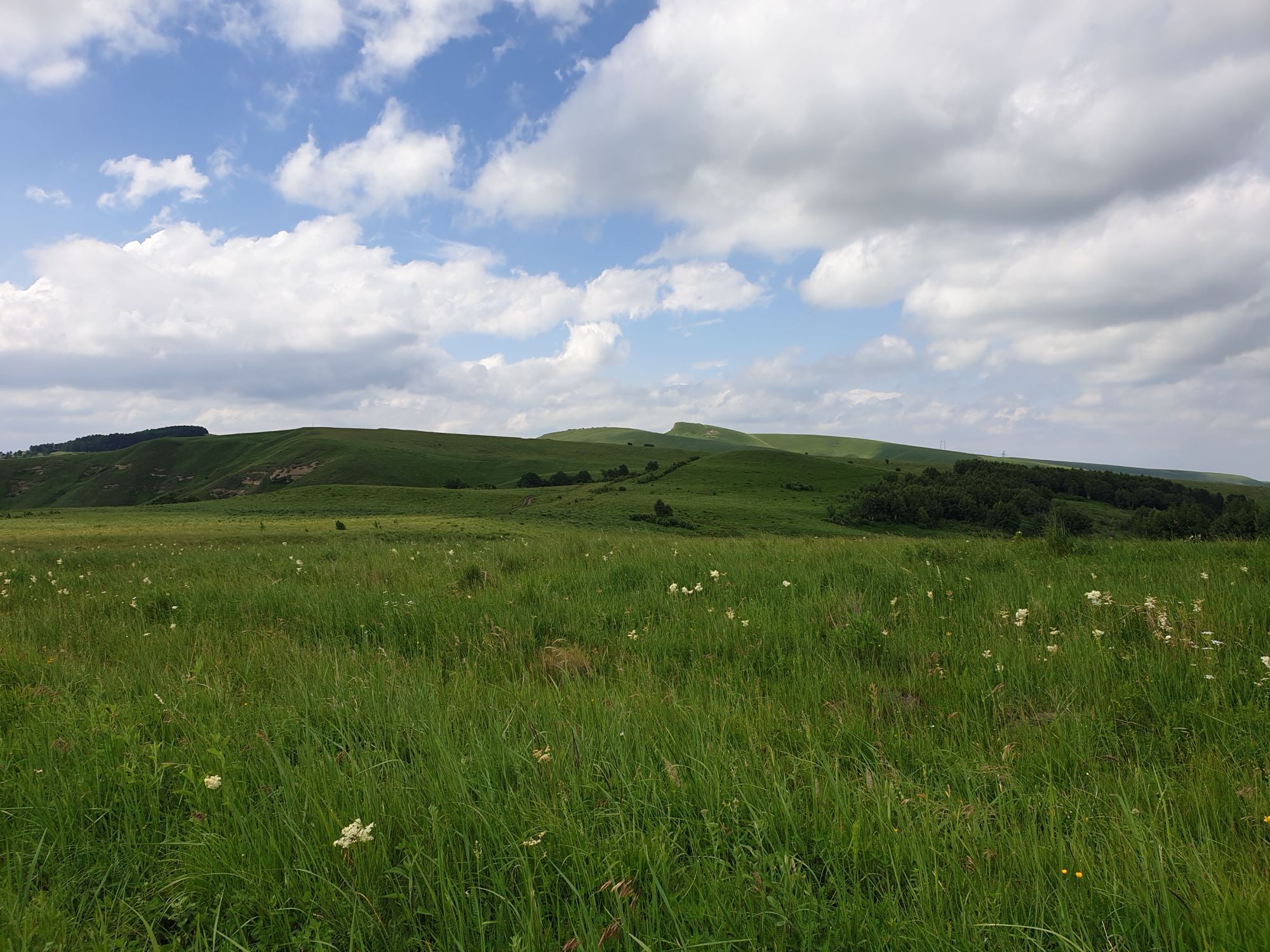 18 июля 2022 Вылазка вторая. Прогулка к Малому Джиналу. Это уже из Кисловодского парка. Гора повыше Малого седла и чуточку пониже Большого (1379м над уровнем моря, если не ошибаюсь). Но подальше от парка и города. Собственно вообще не понятно, к чему она ближе: к Пятигорску, Ессентукам или Кисловодску, но из Кисловодска дорога понятная, не особенно сложная и красивая. Да и мы в Кисловодске))) А еще, по отзывам, оттуда Эльбрус виден едва ли не от самого подножия! Нет, мы не надеялись увидеть Эльбрус, ибо облака, тучи и все тот же прогноз погоды. Но пройти новыми дорогами и немного дальше - почему бы и нет! Тем более это было в тот самый день, когда сорвалась поездка в Джилы-су. Мы поднялись до Малого седла той же дорогой, что и в первый раз. И в это раз подъем дался намного проще: организм таки действительно включился и заработал! Лён изумительно смотрится в горах! А тени от облаков на зеленых склонах сегодня были особенно интересными. Мы на минуточку заглянули на смотровую Малого седла и отправились дальше, мимо того лесочка, где в прошлый раз гуляли и нашли дикую лилию. Я думала, что "до новых мест" почти не буду фотографировать, но как бы не так! Взгляд моментально зацепился за "новые цветочки" : несколько дней назад они еще не цвели, мы тут все травки изучили Яндекс определил как одну из разновидностей дикого клематиса (ломоноса), но я в вопрос не углублялась, точно сказать не могу. А дальше, оставив слева дорогу на Большое седло, мы отправились к новым приключениям. Дорогу было не потерять, она тут одна и подозреваю, что по ней и на внедорожниках ездят, особенно к местам летнего выгона скота, поэтому оставалось только подниматься и спускаться, спускаться и подниматься, преодолевая одну горку за другой. И крутить головой на 360 градусов, конечно. Потому что виды тут невообразимые! В какой-то момент, обернувшись назад, мы увидели лишь макушку Большого седла, на которое с неделю назад забирались. И тот самый лес на соседней с Малым седлом горке. А потом, уже ближе к концу путешествия слева вдалеке открылся вид на пятиглавый Бештау. А слева неизменные зеленые просторы в направление Главного Кавказского хребта. По прямой до него рукой подать, но облака сегодня укрыли горизонт весьма надежно. И они же сделали фотографии особенно живыми и разнообразными) Вокруг цвели луга и это вызывало такой неизъяснимый восторг в душе! Бескрайний густой ковер из цветов, таких трогательных, ярких и нежных одновременно. Я уже старалсь сдерживаться и не снимать каждый цветок (иначе бы никуда не дошли) Но несколько "интересностей" пропустить не могла. Подальше и повыше стали довольно регулярно попадаться орхидеи: А вот этот нежный и миниатюрный красавец удивил. Яндекс определил его как дикий гладиолус! Представляете?! И я склонна ему верить (листья тоже сходятся) . Росточка в этом малыше см 20! Ну и из прочего немного: Преодолев очередной большой подъем мы увидели перед собой завораживающую картину, какую-то бескрайнюю во все стороны. Особенно густая трава и цветы, особенно живописный Бештау как завершение пейзажа с цветущим альпийским лугом, особенно бесконечное и живое море внизу слева и до горизонта... Захотелось остановить момент и погрузиться в него с головой. Запечатлеть его в памяти, в голове, поставить этот вид в рамку на самое видное место в мыслях и благодарить, благодарить,