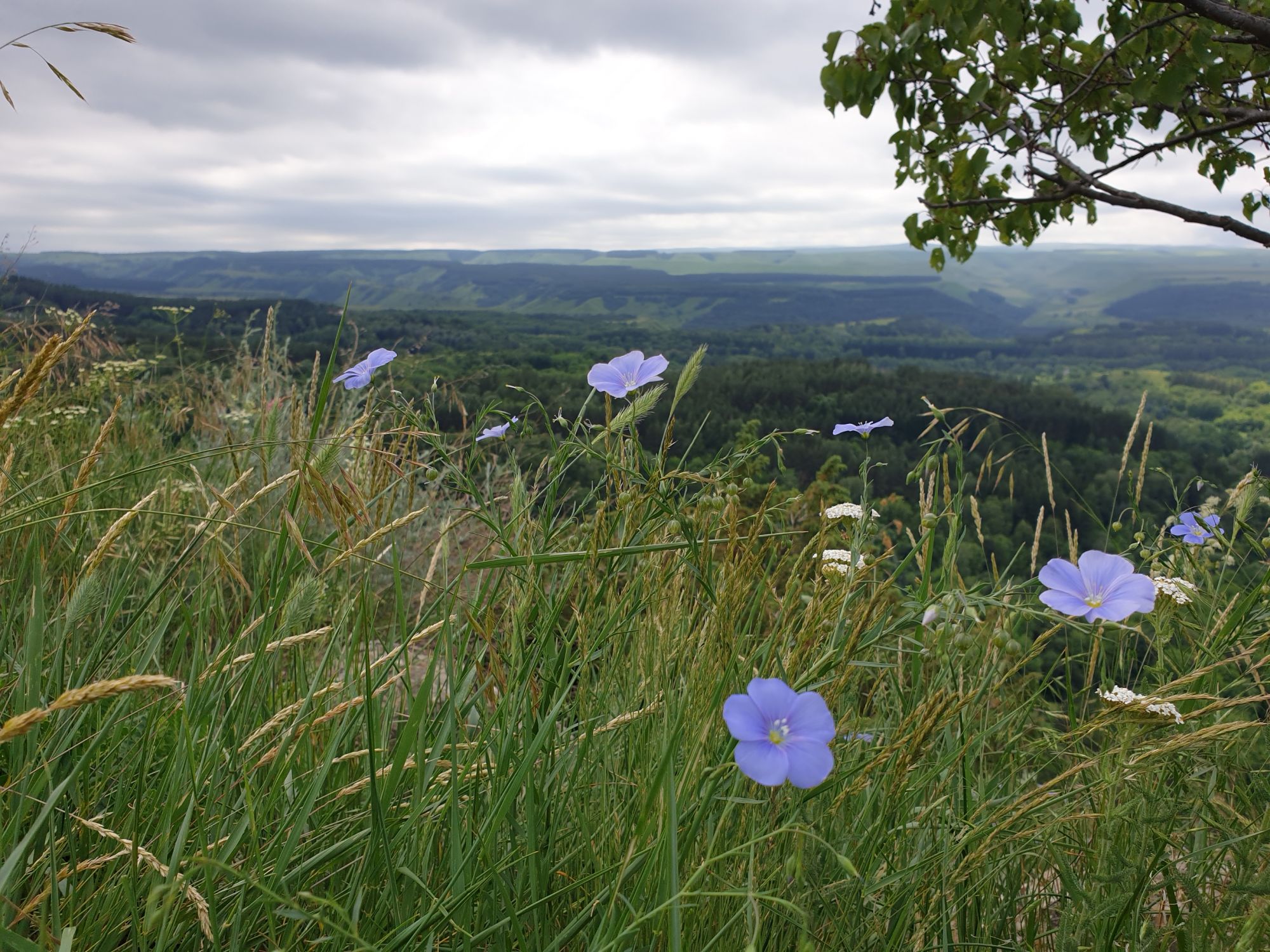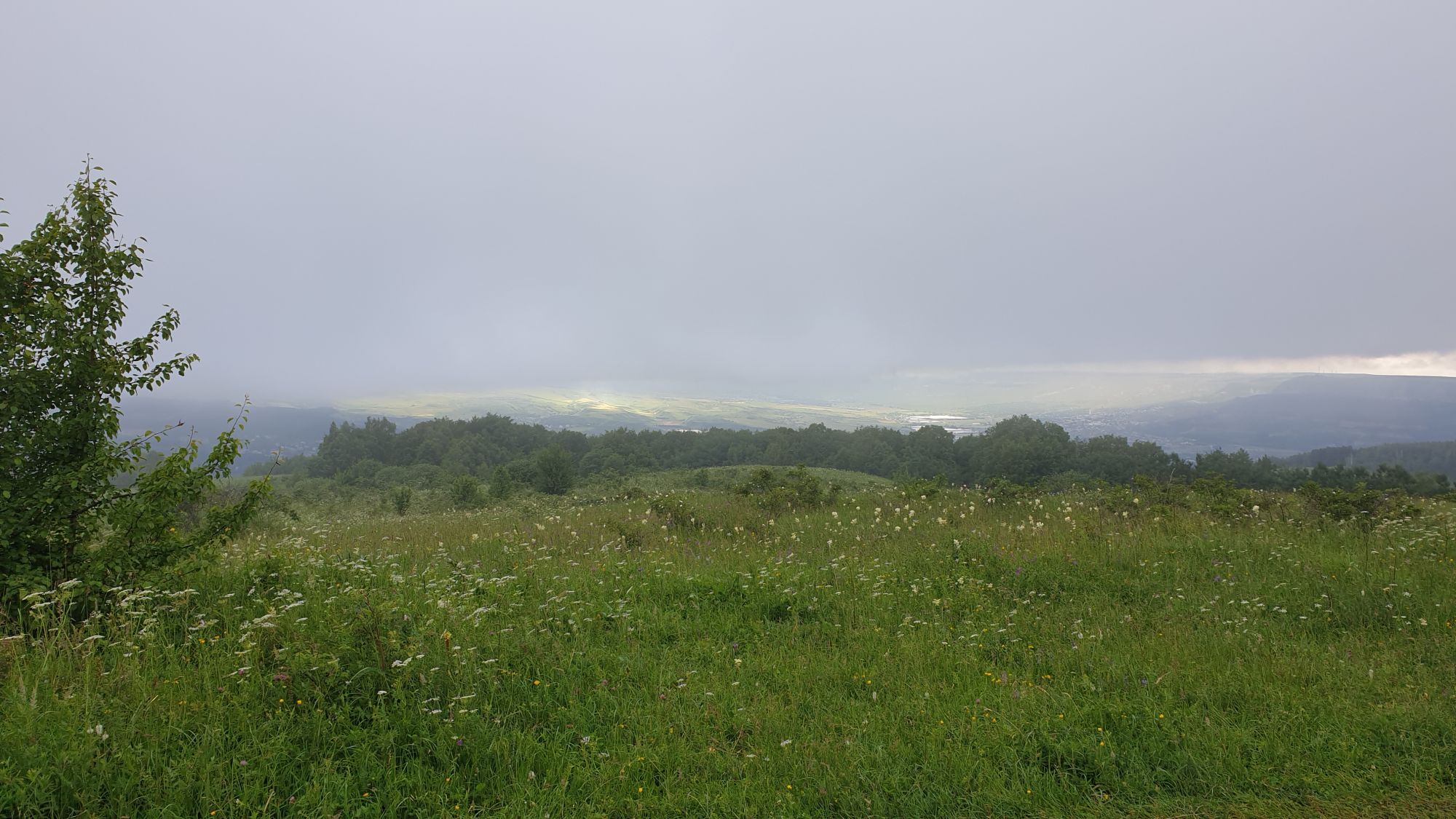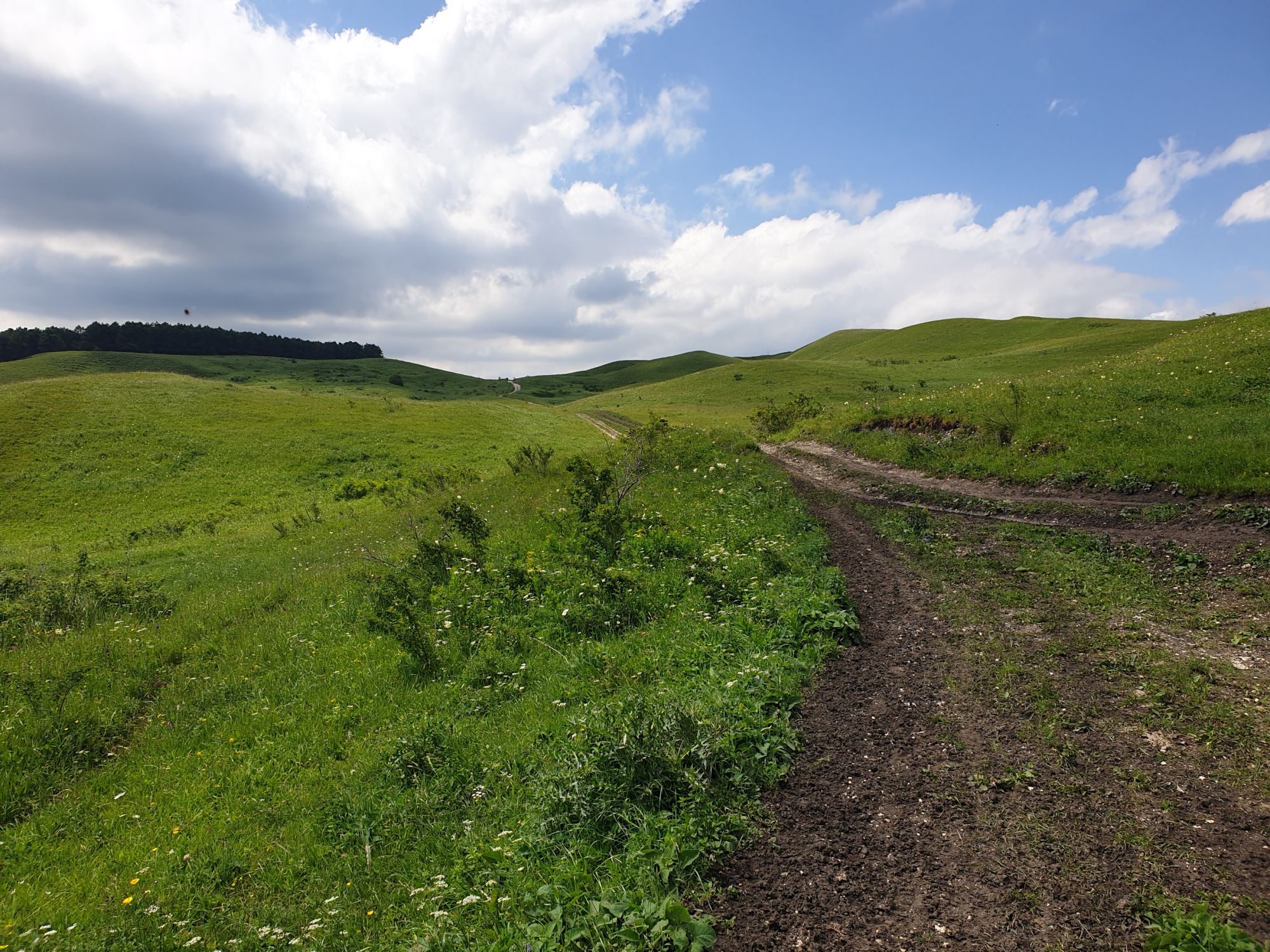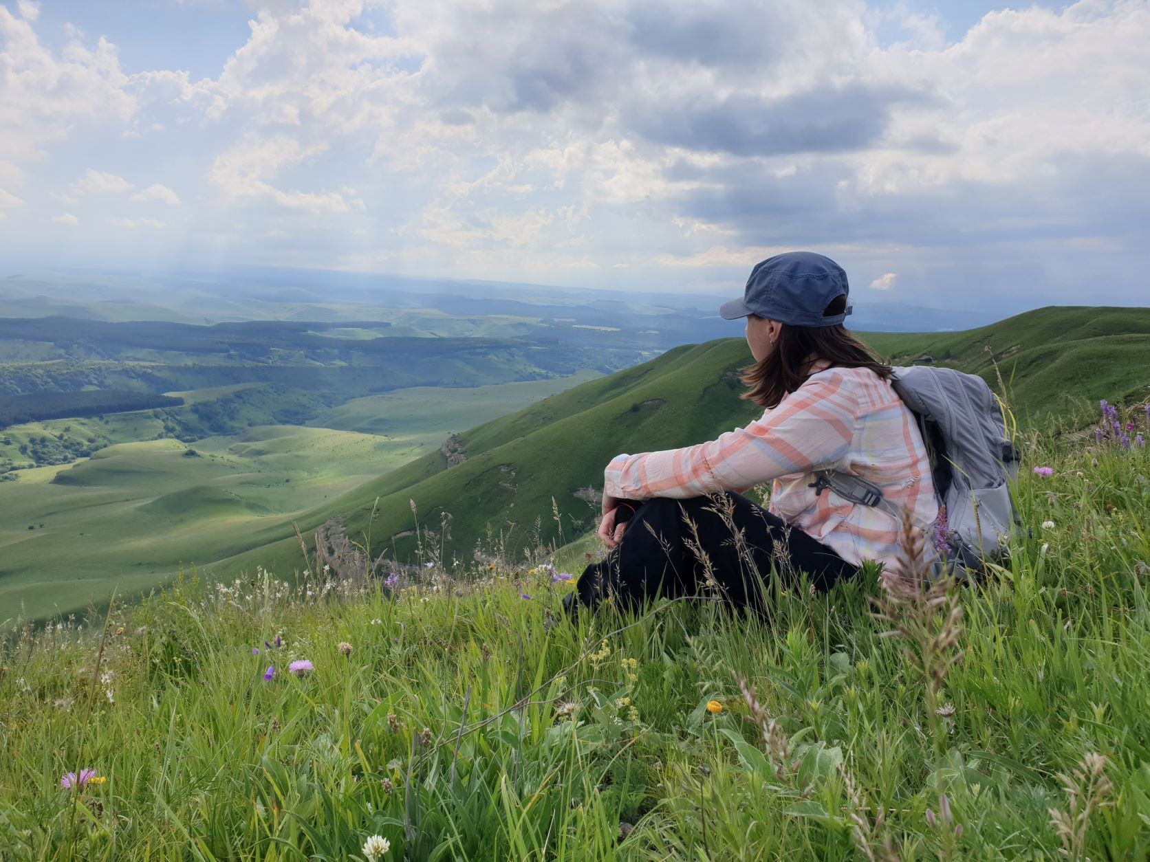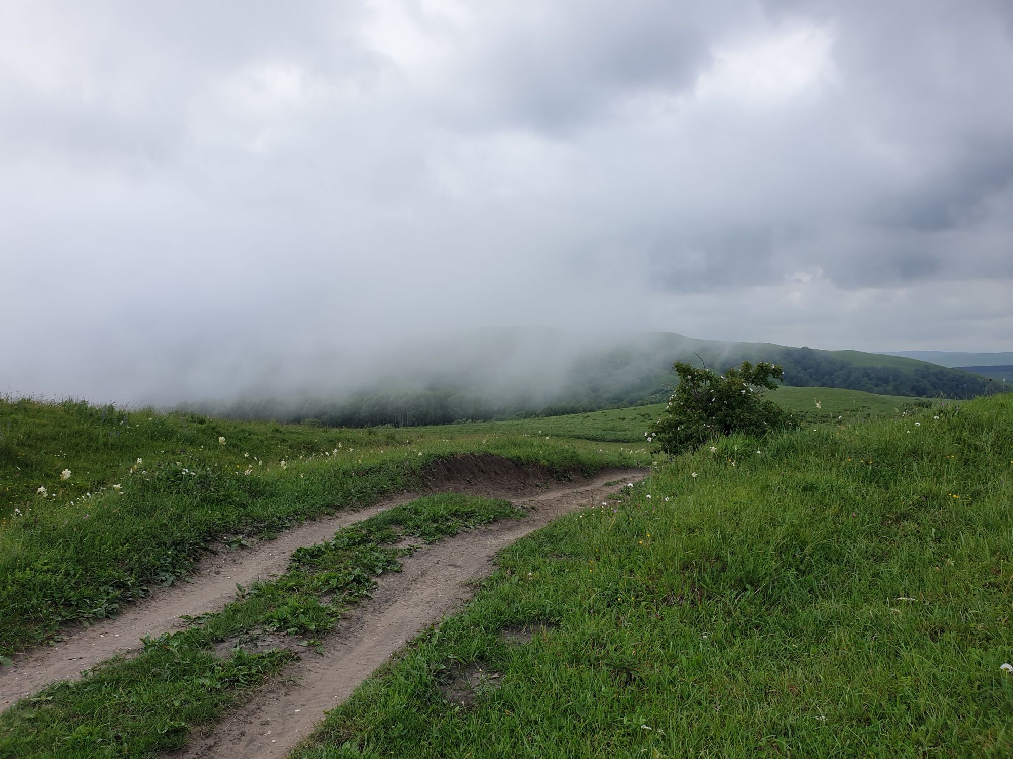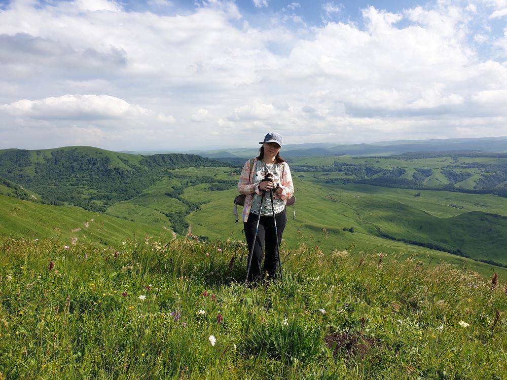 18 июля 2022 Вылазка вторая. Прогулка к Малому Джиналу. Это уже из Кисловодского парка. Гора повыше Малого седла и чуточку пониже Большого (1379м над уровнем моря, если не ошибаюсь). Но подальше от парка и города. Собственно вообще не понятно, к чему она ближе: к Пятигорску, Ессентукам или Кисловодску, но из Кисловодска дорога понятная, не особенно сложная и красивая. Да и мы в Кисловодске))) А еще, по отзывам, оттуда Эльбрус виден едва ли не от самого подножия! Нет, мы не надеялись увидеть Эльбрус, ибо облака, тучи и все тот же прогноз погоды. Но пройти новыми дорогами и немного дальше - почему бы и нет! Тем более это было в тот самый день, когда сорвалась поездка в Джилы-су. Мы поднялись до Малого седла той же дорогой, что и в первый раз. И в это раз подъем дался намного проще: организм таки действительно включился и заработал! Лён изумительно смотрится в горах! А тени от облаков на зеленых склонах сегодня были особенно интересными. Мы на минуточку заглянули на смотровую Малого седла и отправились дальше, мимо того лесочка, где в прошлый раз гуляли и нашли дикую лилию. Я думала, что "до новых мест" почти не буду фотографировать, но как бы не так! Взгляд моментально зацепился за "новые цветочки" : несколько дней назад они еще не цвели, мы тут все травки изучили Яндекс определил как одну из разновидностей дикого клематиса (ломоноса), но я в вопрос не углублялась, точно сказать не могу. А дальше, оставив слева дорогу на Большое седло, мы отправились к новым приключениям. Дорогу было не потерять, она тут одна и подозреваю, что по ней и на внедорожниках ездят, особенно к местам летнего выгона скота, поэтому оставалось только подниматься и спускаться, спускаться и подниматься, преодолевая одну горку за другой. И крутить головой на 360 градусов, конечно. Потому что виды тут невообразимые! В какой-то момент, обернувшись назад, мы увидели лишь макушку Большого седла, на которое с неделю назад забирались. И тот самый лес на соседней с Малым седлом горке. А потом, уже ближе к концу путешествия слева вдалеке открылся вид на пятиглавый Бештау. А слева неизменные зеленые просторы в направление Главного Кавказского хребта. По прямой до него рукой подать, но облака сегодня укрыли горизонт весьма надежно. И они же сделали фотографии особенно живыми и разнообразными) Вокруг цвели луга и это вызывало такой неизъяснимый восторг в душе! Бескрайний густой ковер из цветов, таких трогательных, ярких и нежных одновременно. Я уже старалсь сдерживаться и не снимать каждый цветок (иначе бы никуда не дошли) Но несколько "интересностей" пропустить не могла. Подальше и повыше стали довольно регулярно попадаться орхидеи: А вот этот нежный и миниатюрный красавец удивил. Яндекс определил его как дикий гладиолус! Представляете?! И я склонна ему верить (листья тоже сходятся) . Росточка в этом малыше см 20! Ну и из прочего немного: Преодолев очередной большой подъем мы увидели перед собой завораживающую картину, какую-то бескрайнюю во все стороны. Особенно густая трава и цветы, особенно живописный Бештау как завершение пейзажа с цветущим альпийским лугом, особенно бесконечное и живое море внизу слева и до горизонта... Захотелось остановить момент и погрузиться в него с головой. Запечатлеть его в памяти, в голове, поставить этот вид в рамку на самое видное место в мыслях и благодарить, благодарить,